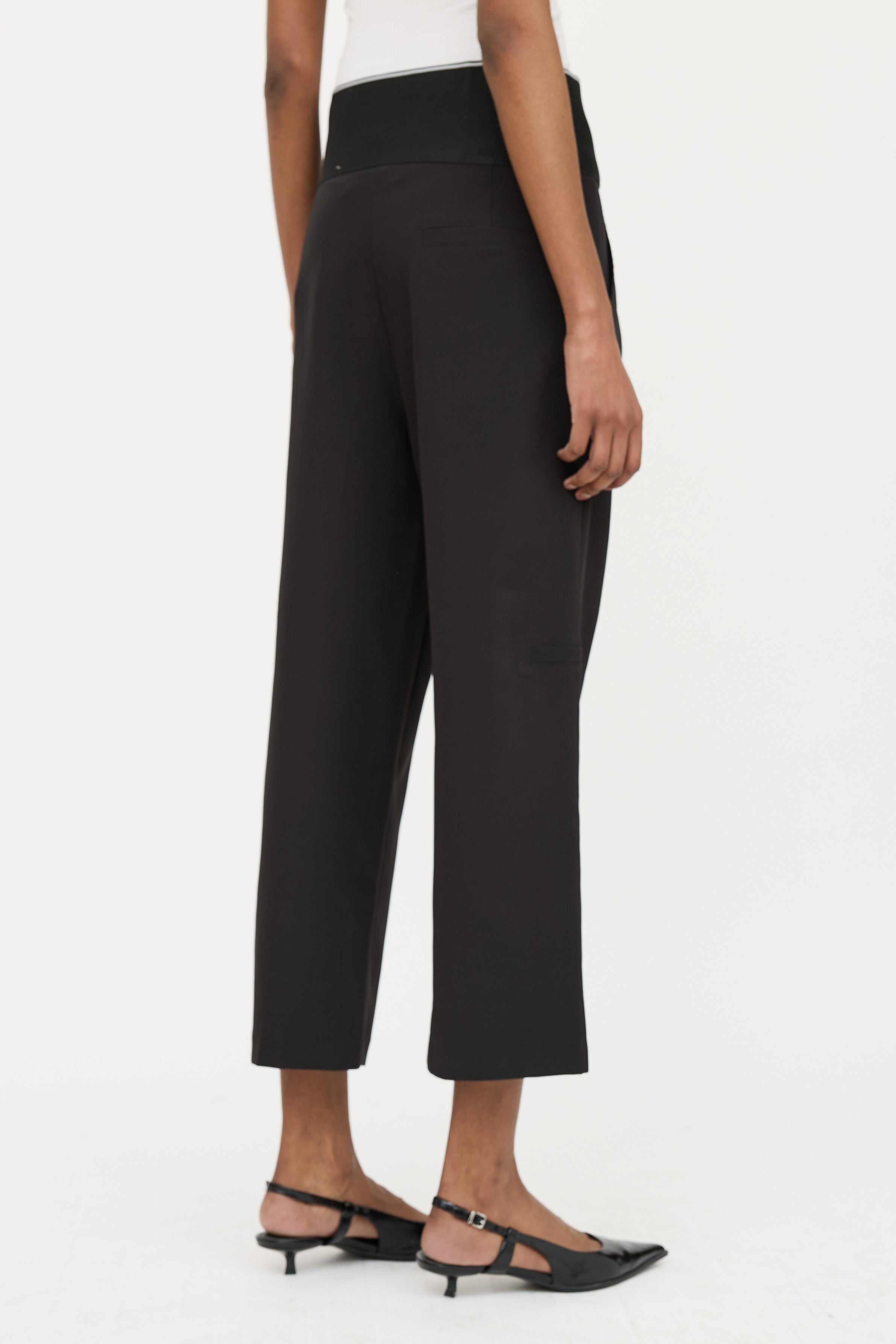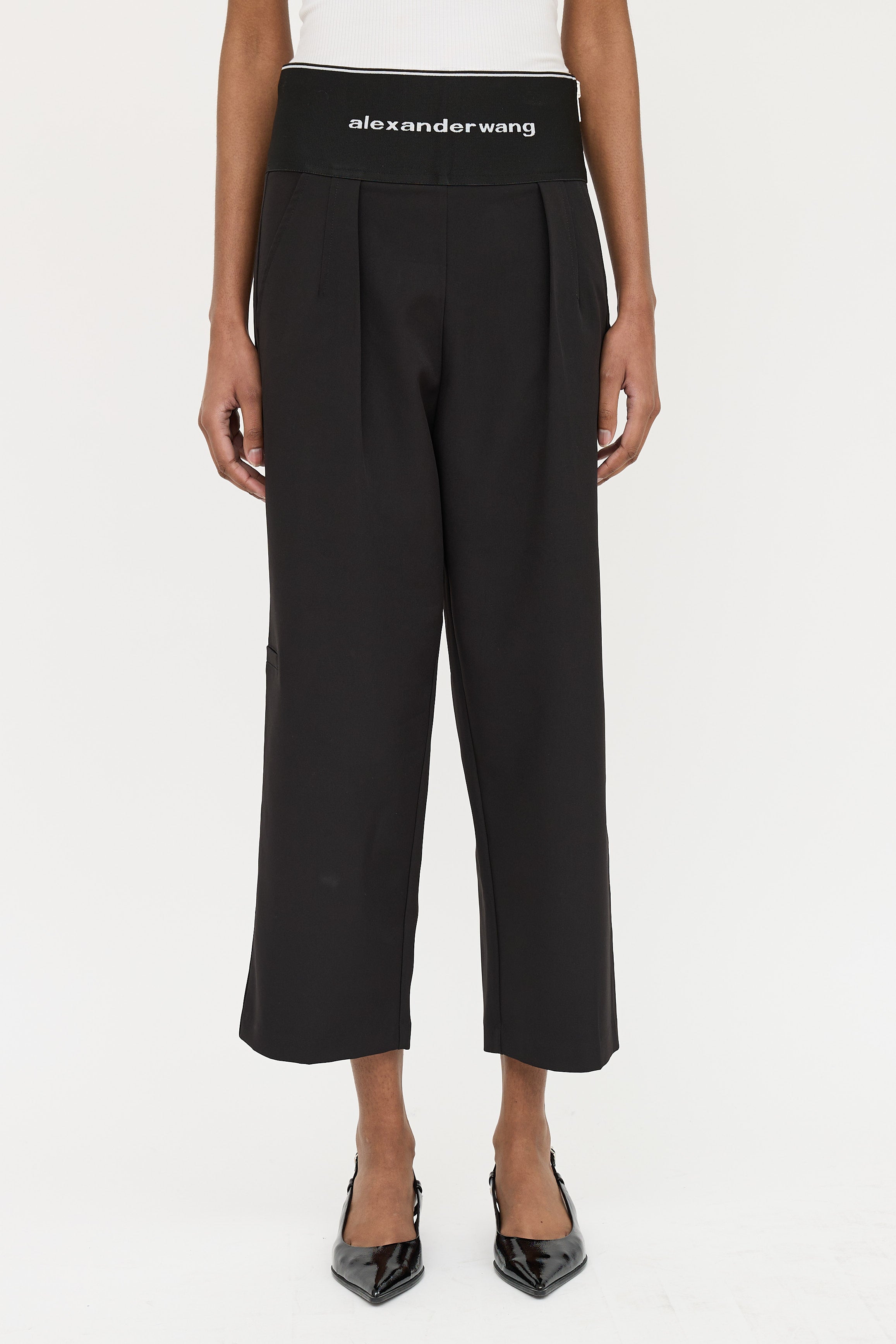 Pre-owned Alexander Wang black pants featuring elastic logo waist band, two slip pockets and pleating at front, one stitched pocket at knee, one slip pocket at back and zip closure at side.