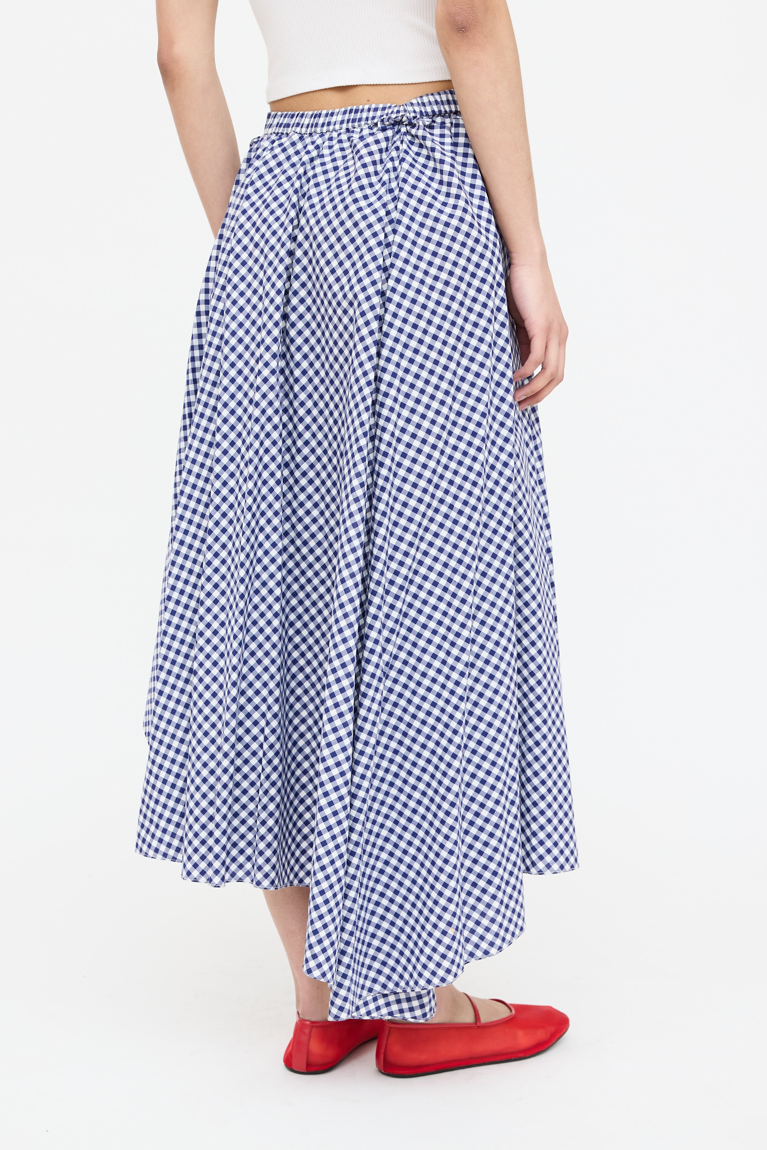 Pre-owned Caroline Constas blue gingham skirt featuring asymmetrical high low hemline, elastic waistband and ruffle trim.