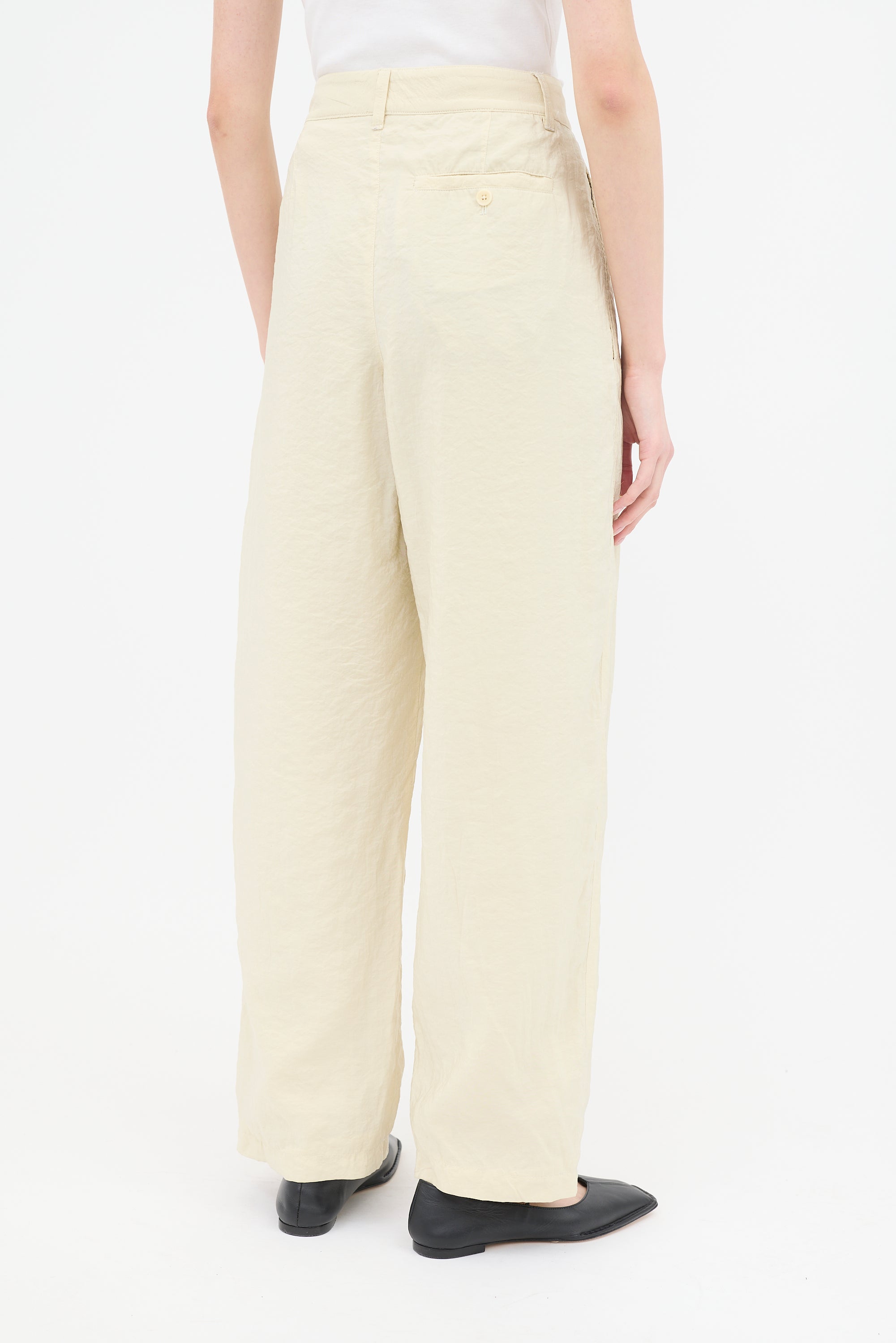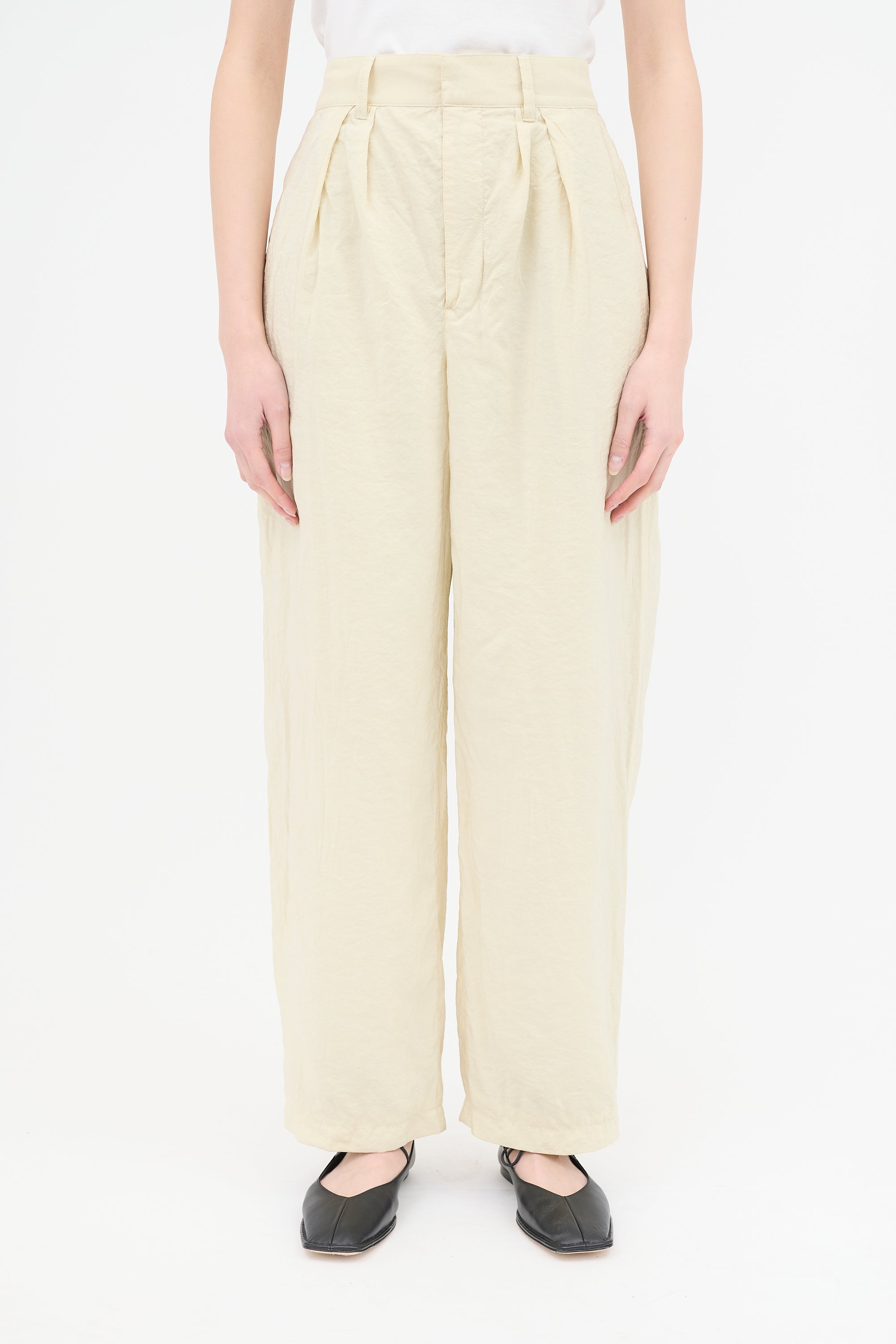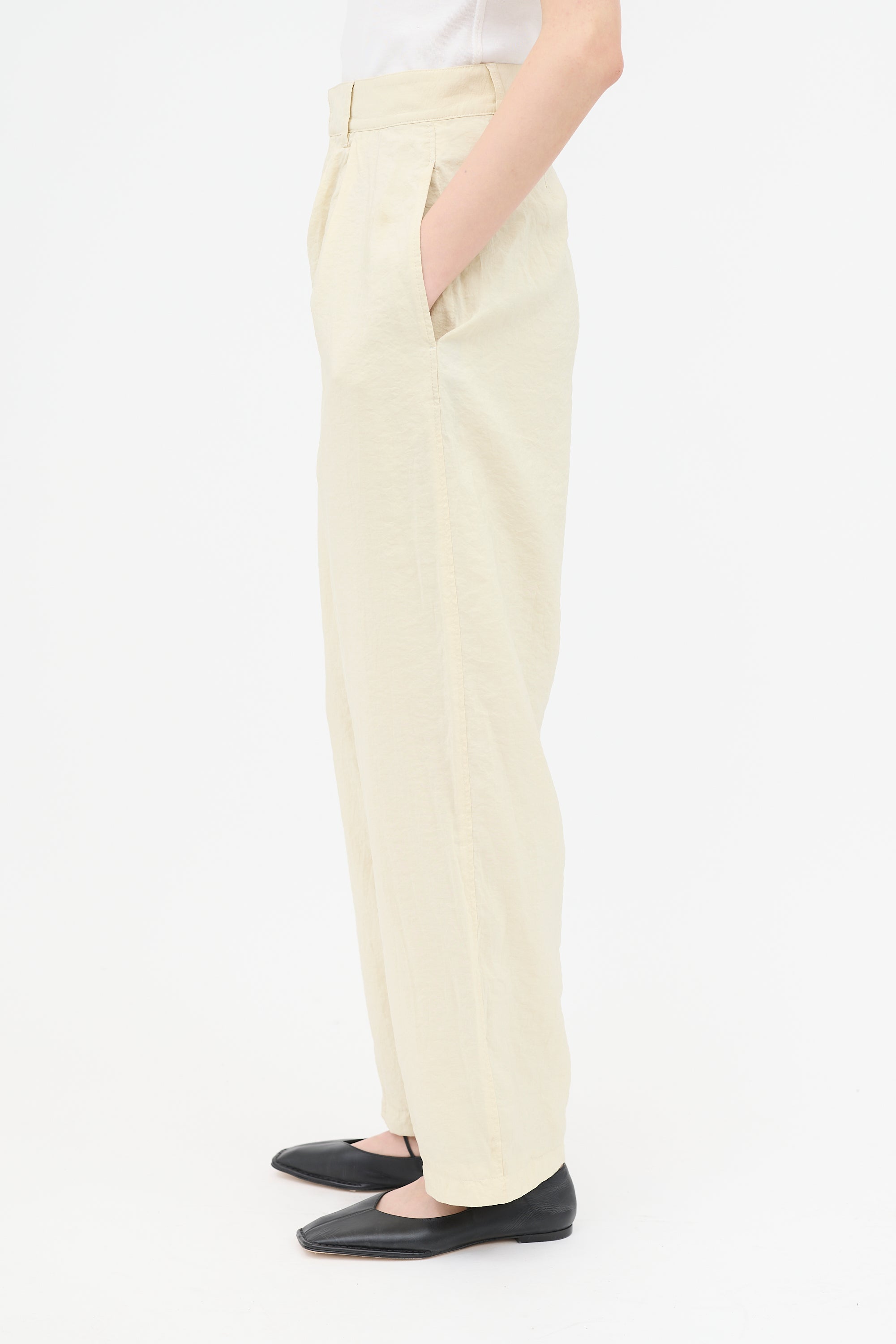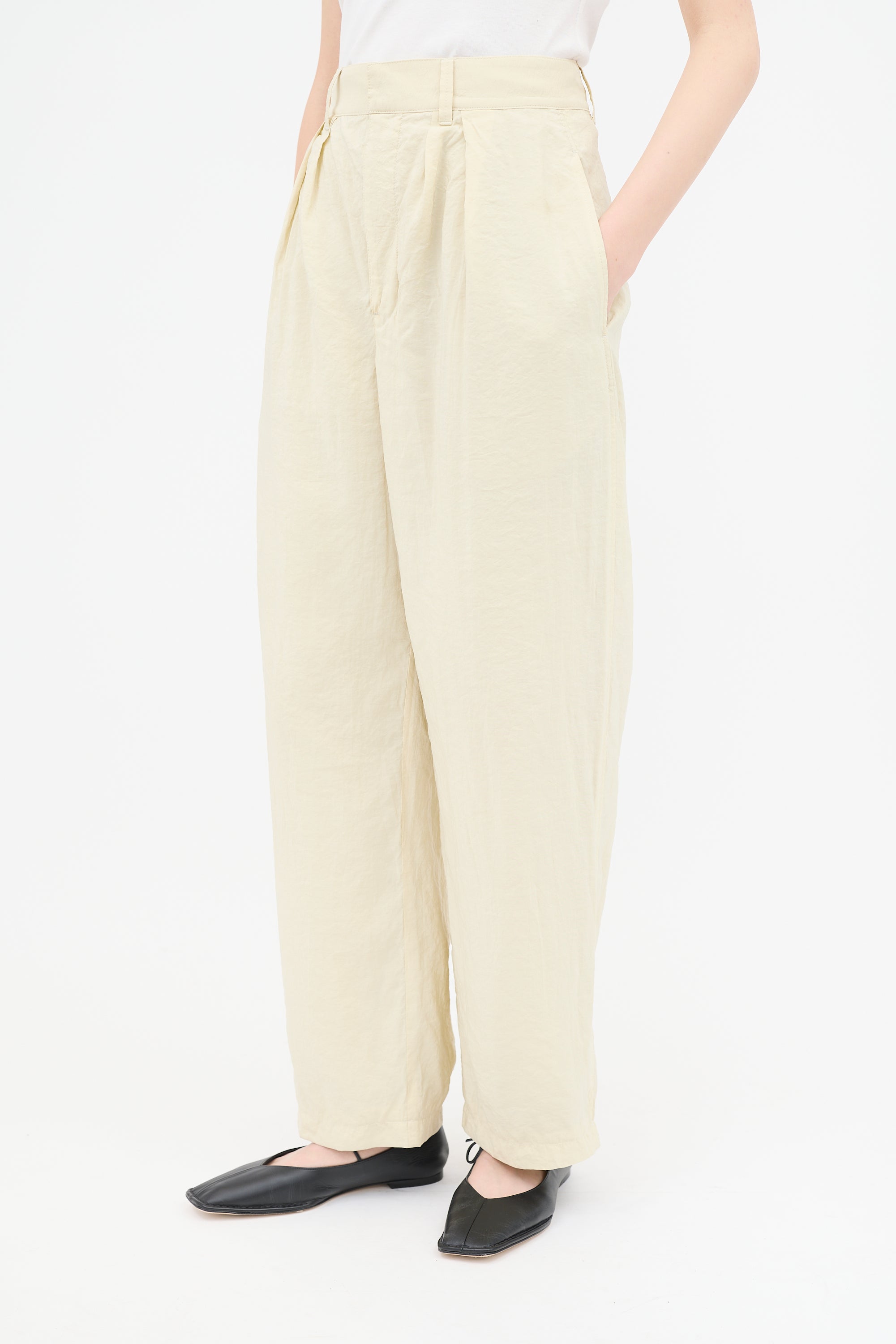 Pre-owned Lemaire yellow crinkled trousers featuring high waist, front pleats, dropped seat, tapered leg, three pocket styling, and zip fly. Lined.