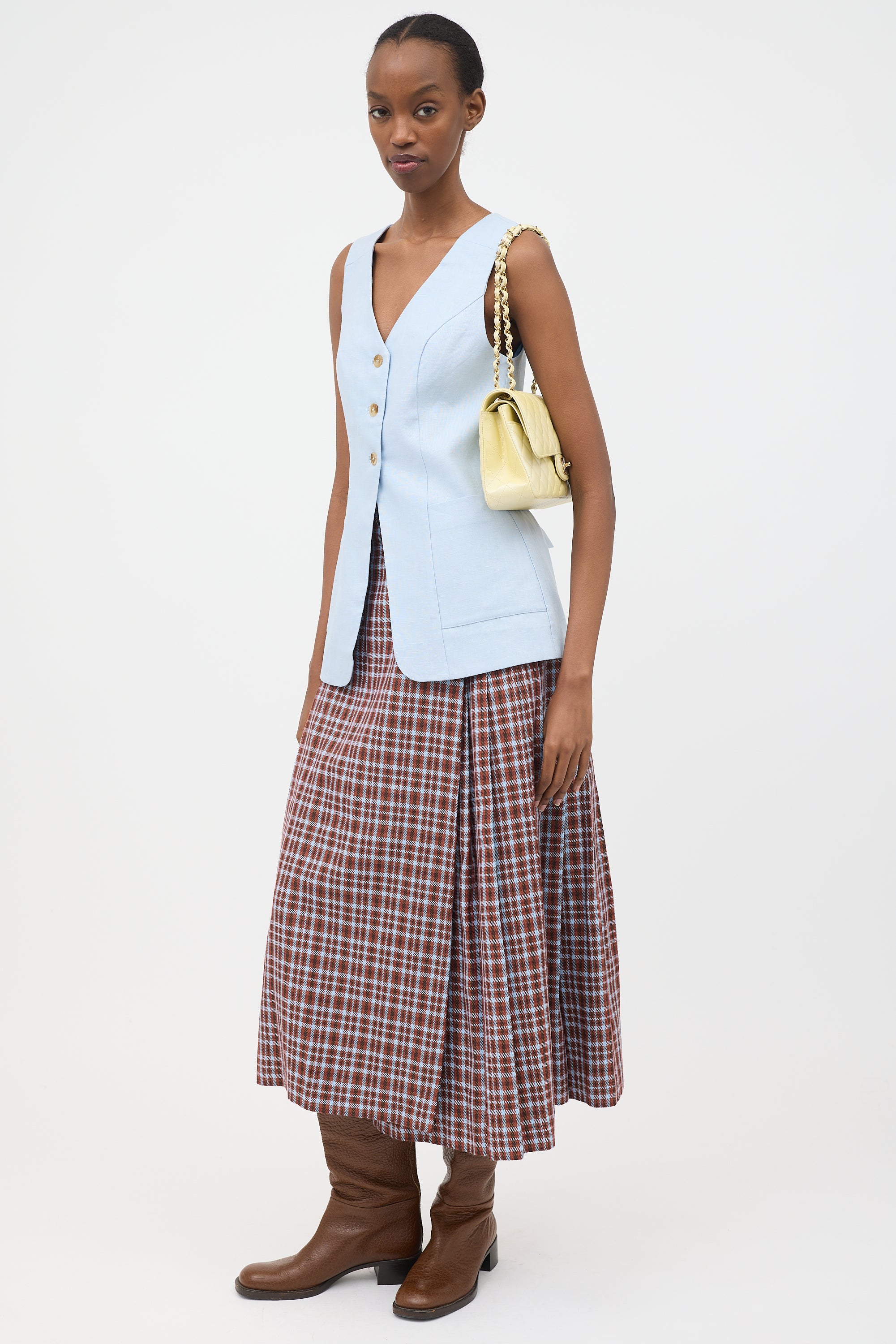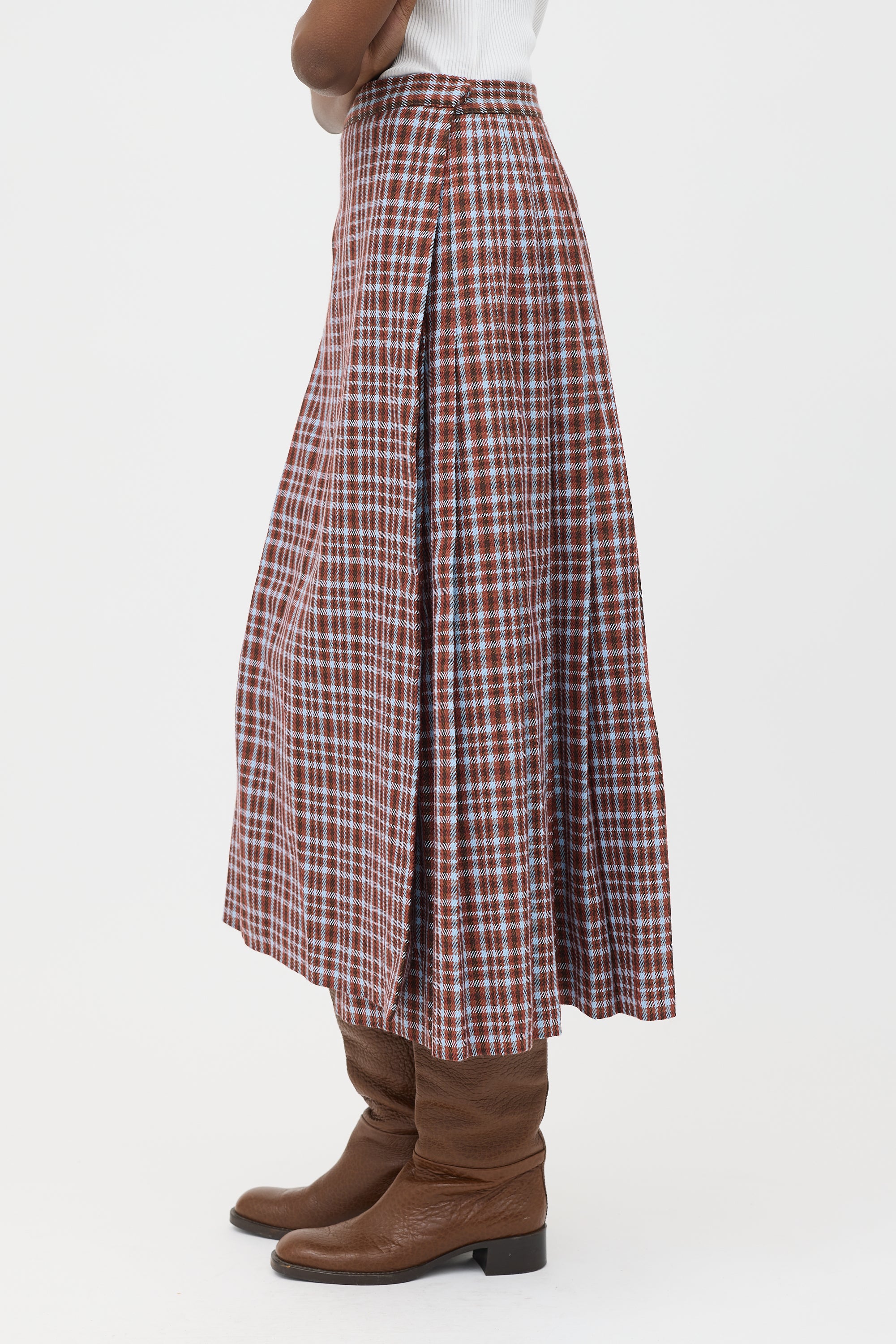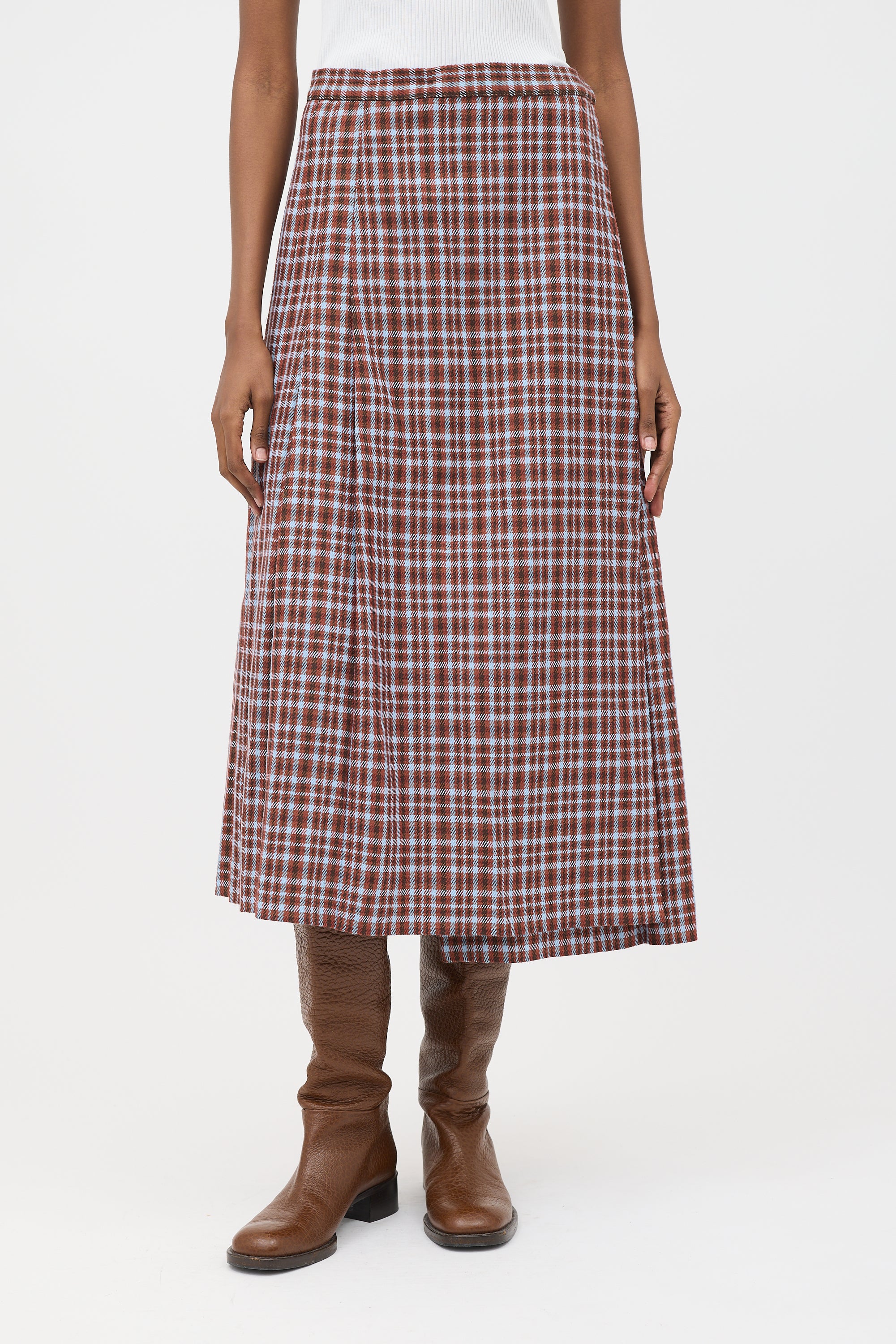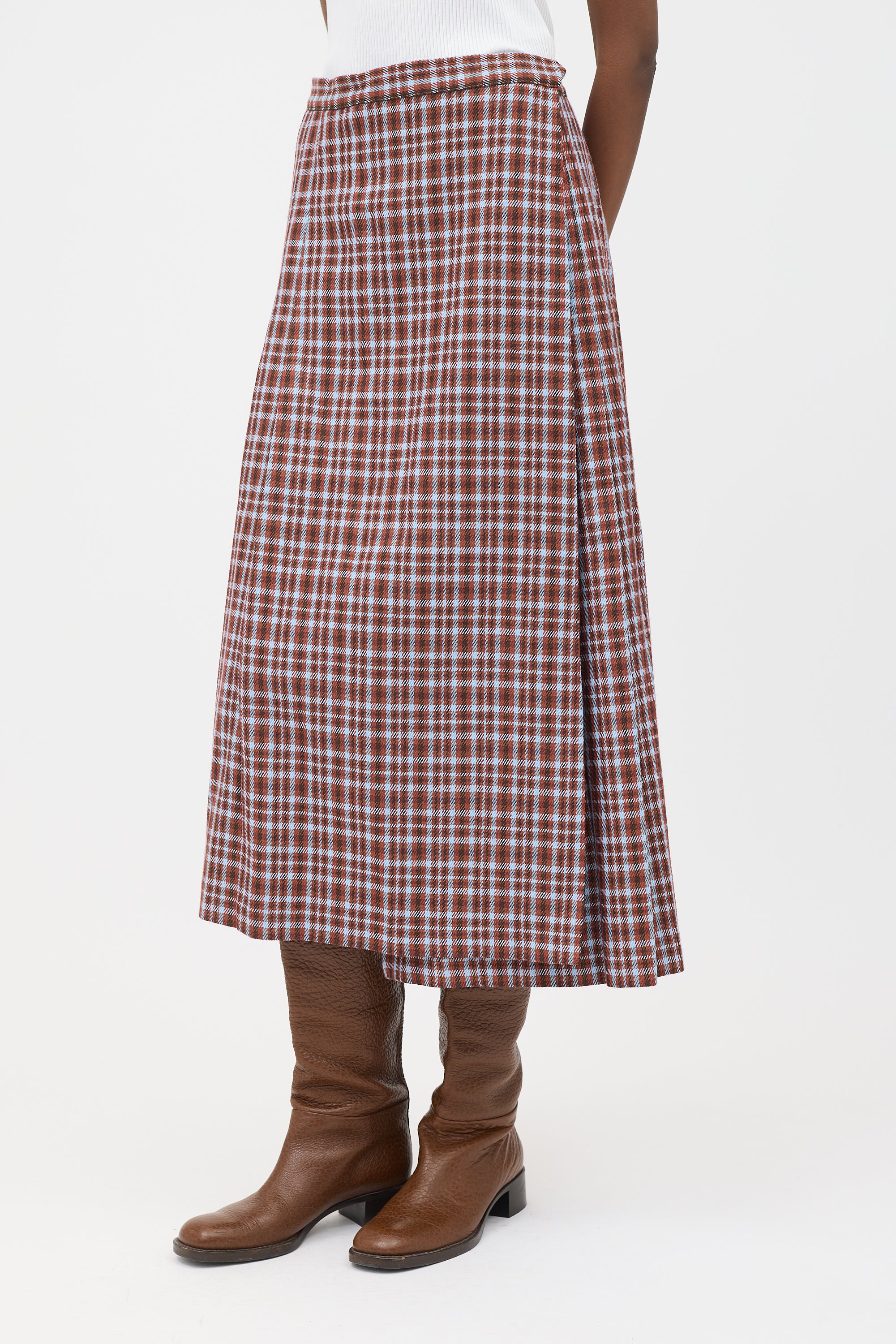 Pre-owned Maryam Nassir Zadeh orange and light blue Umbra midi skirt featuring plaid pattern, wrap front, and knife pleats.