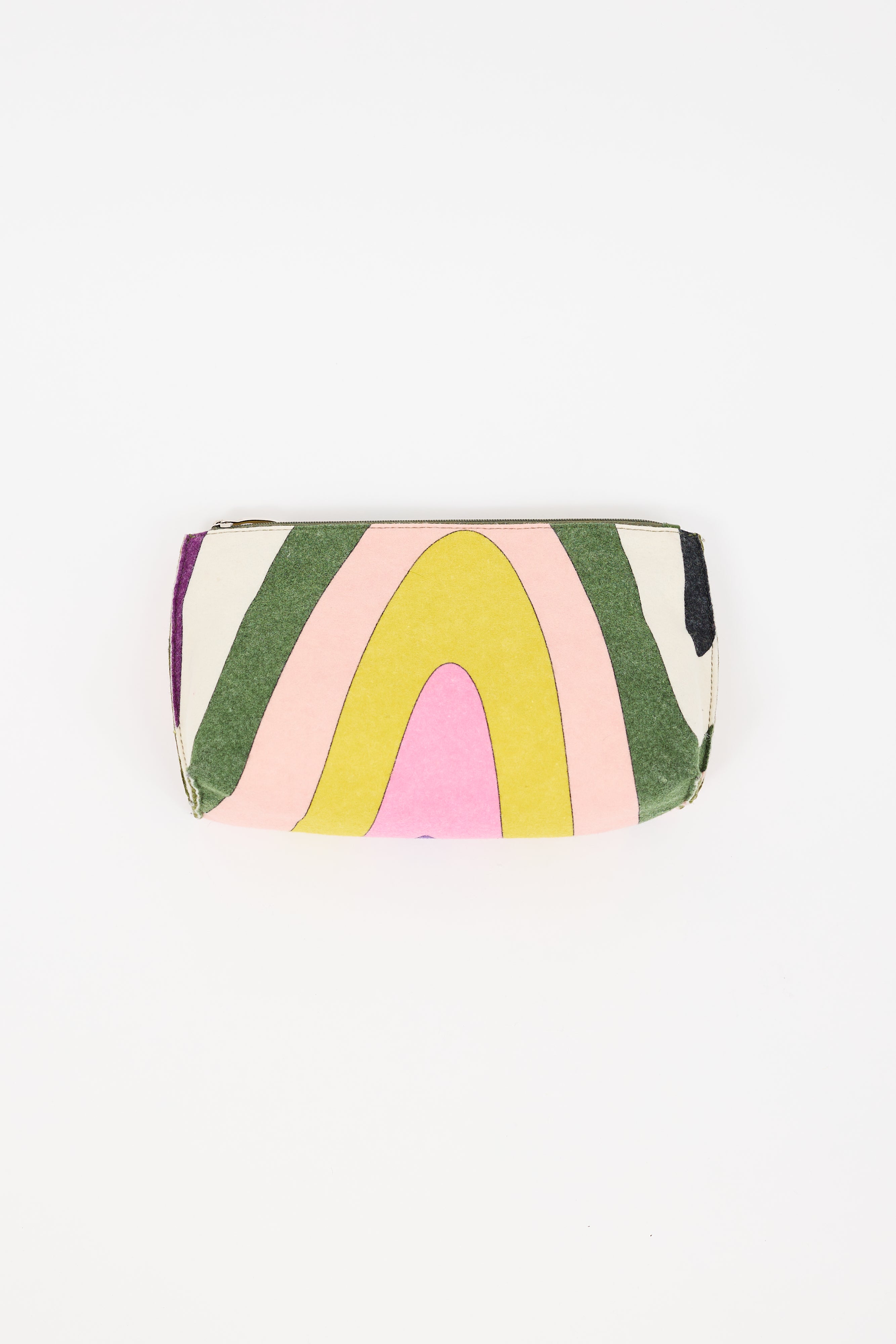 Pre-owned Emilio Pucci multicolored felt pouch featuring abstract pattern, zip closure at top, dark green lining, and one card slot inside.