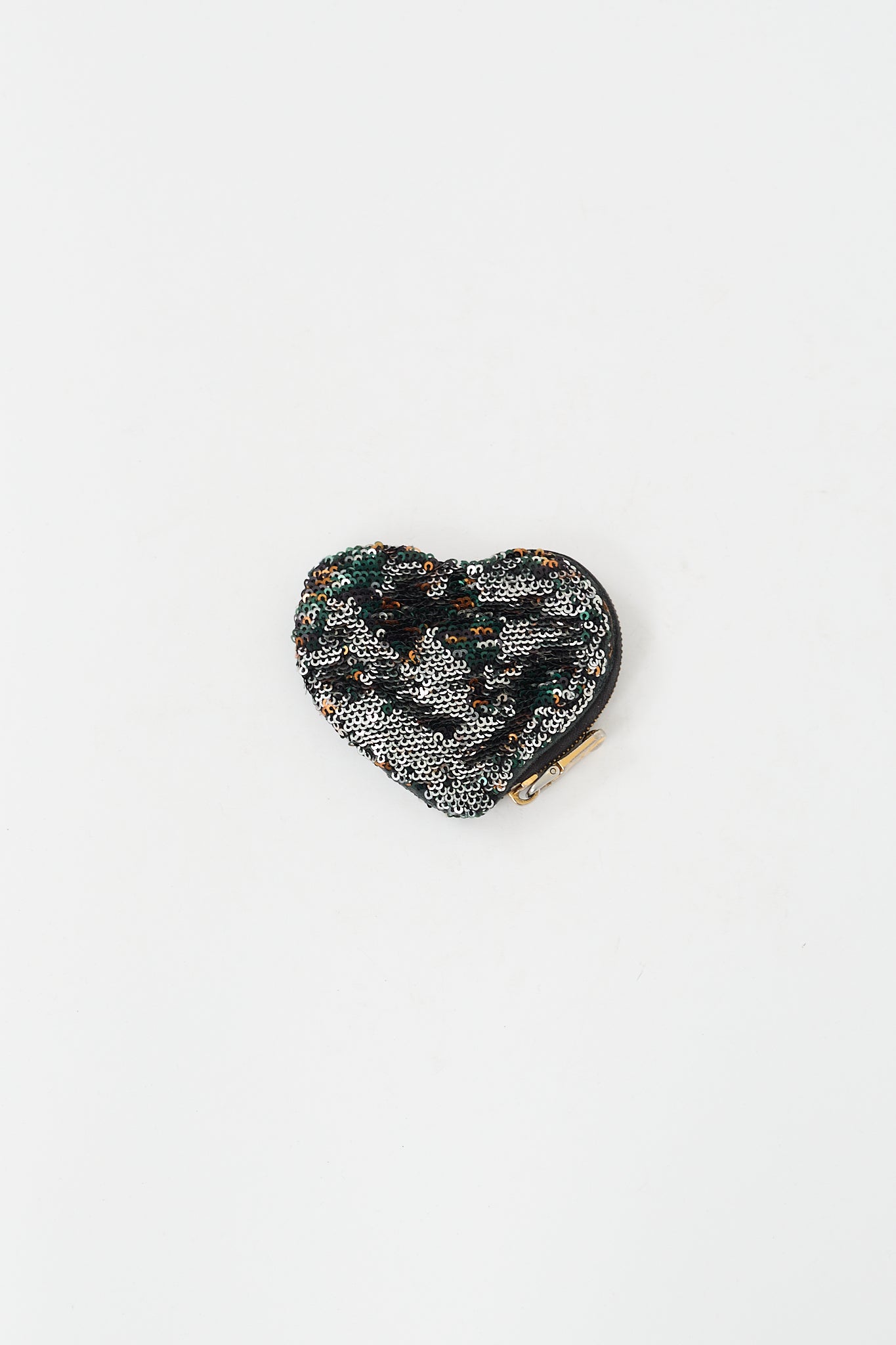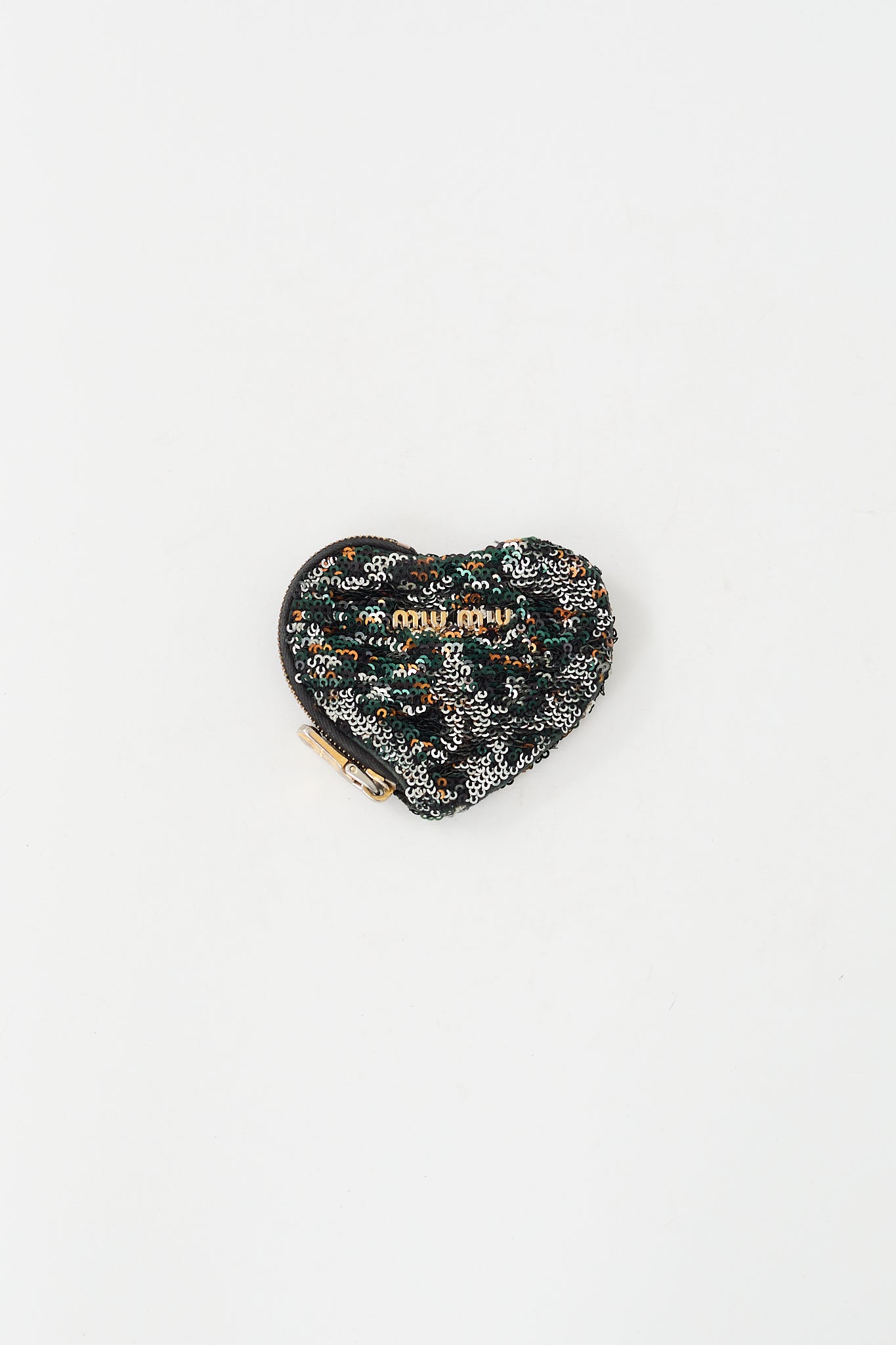 Pre-owned Miu Miu black and multicolour sequin heart coin pouch featuring gold tone logo hardware at front and half zip closure.