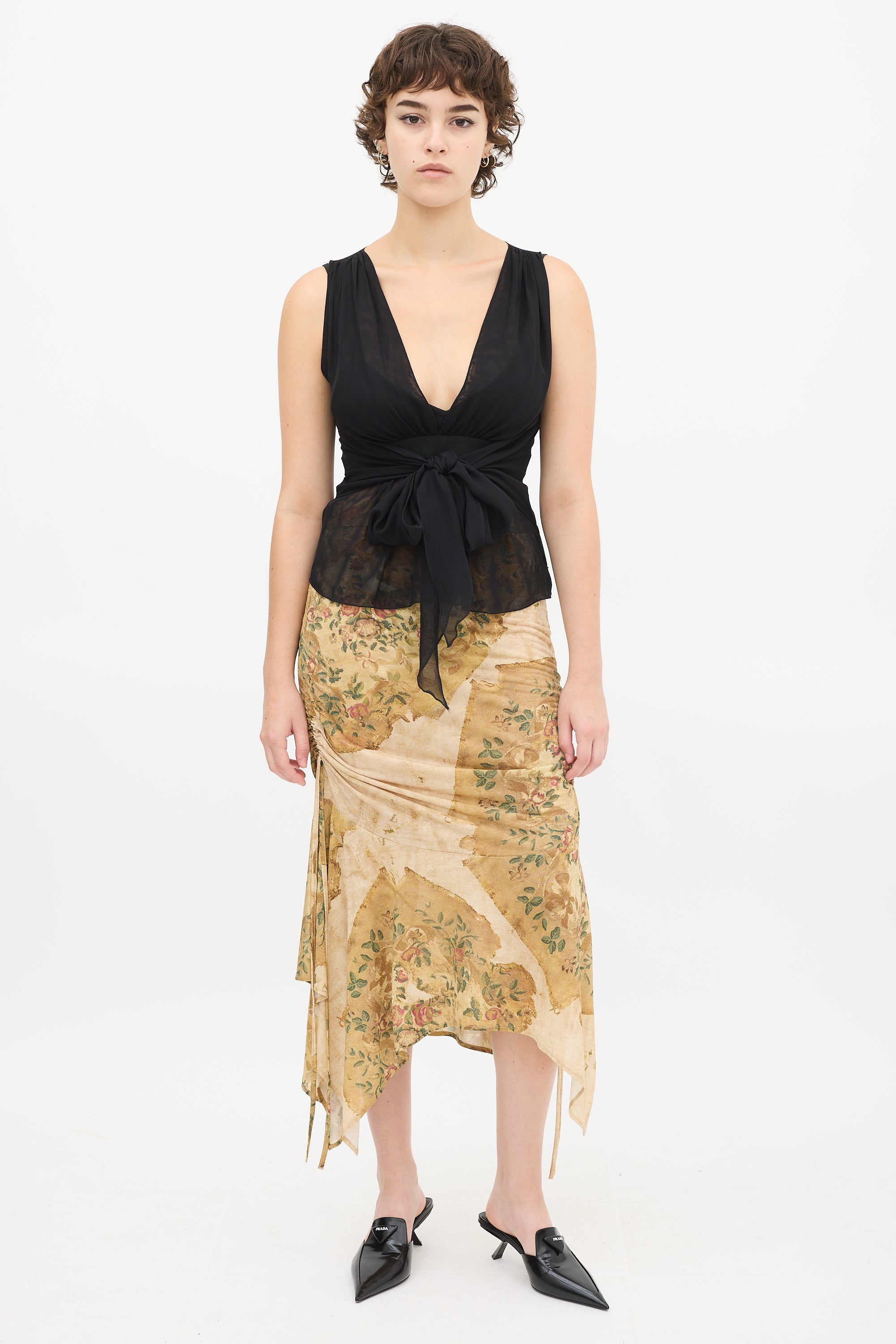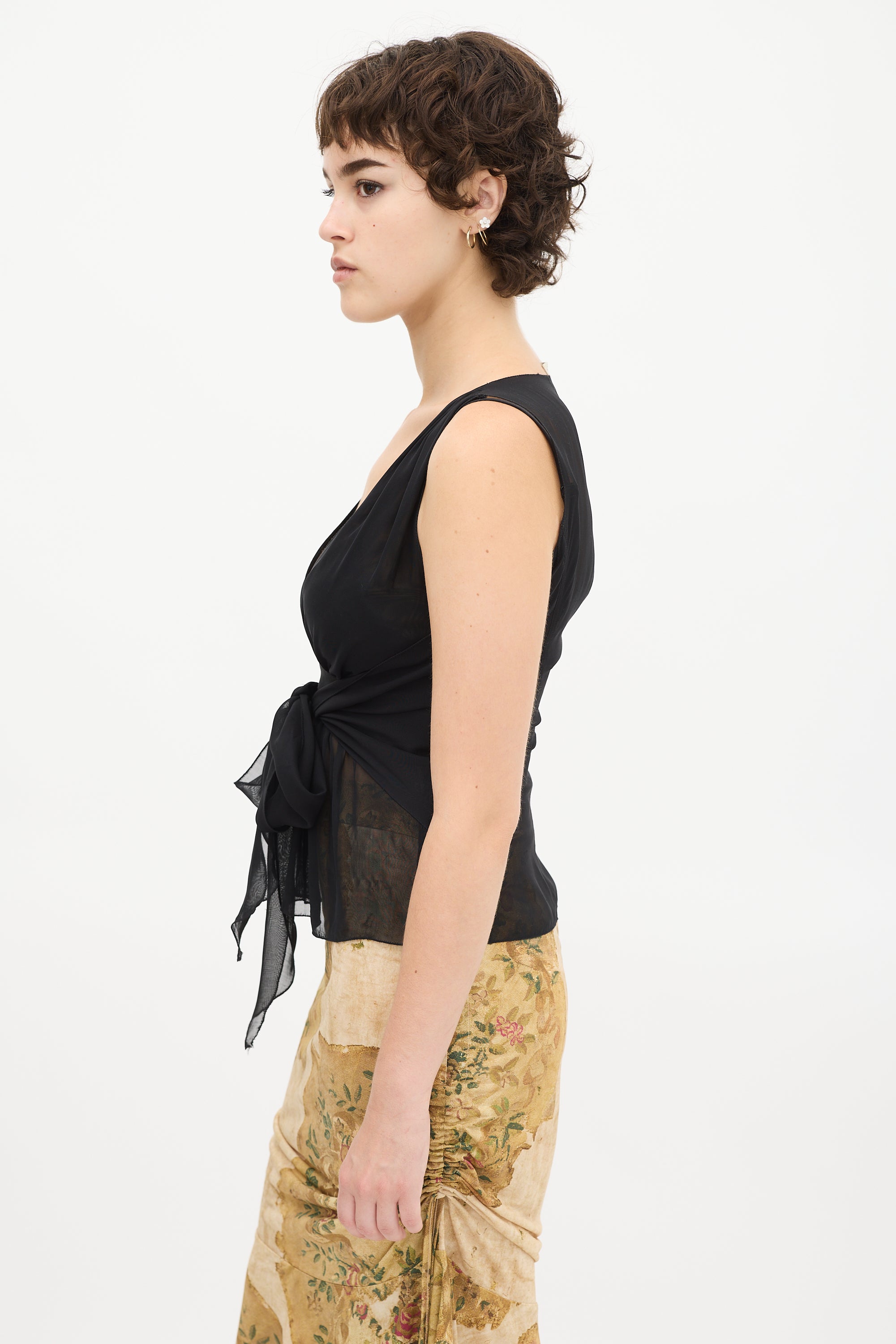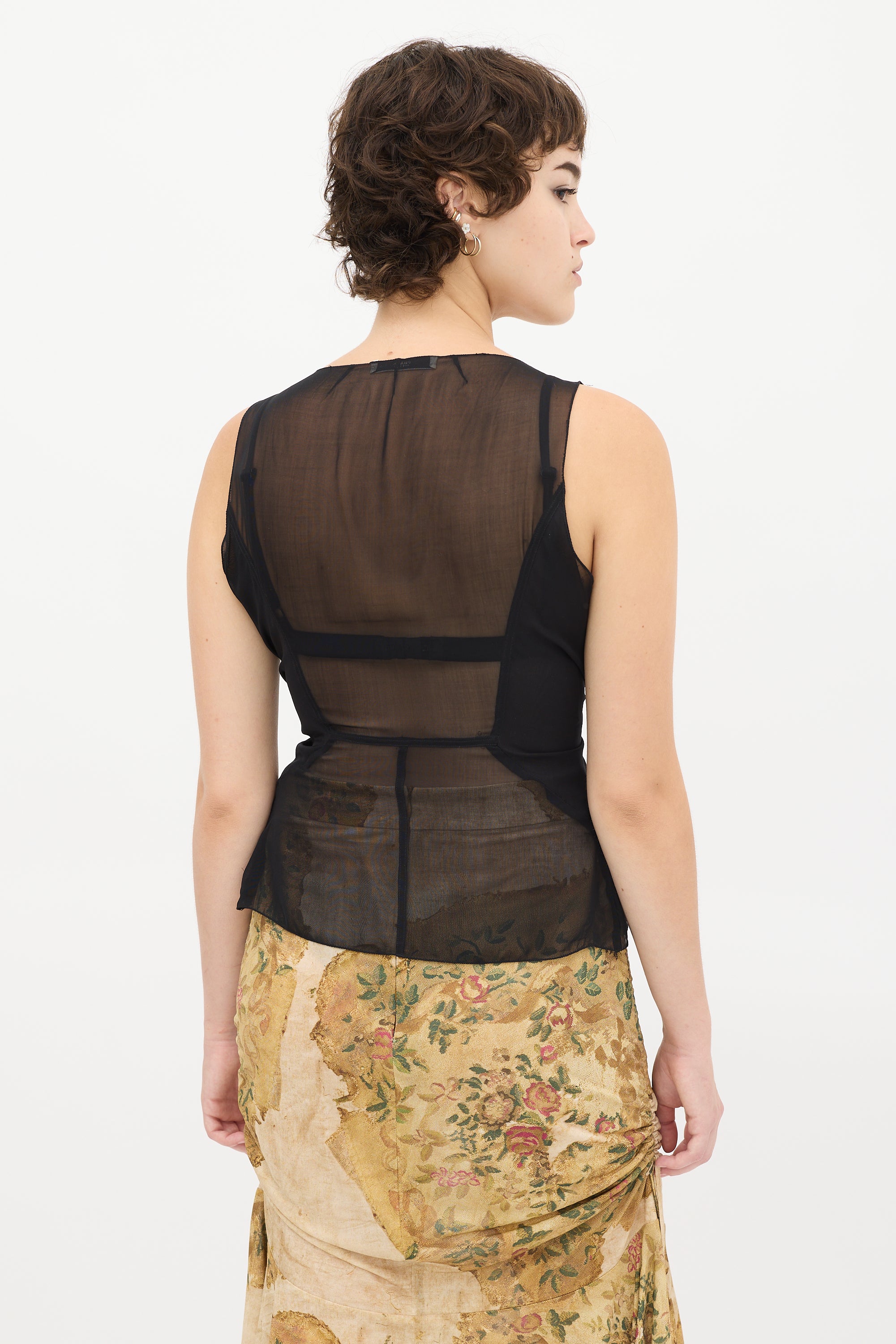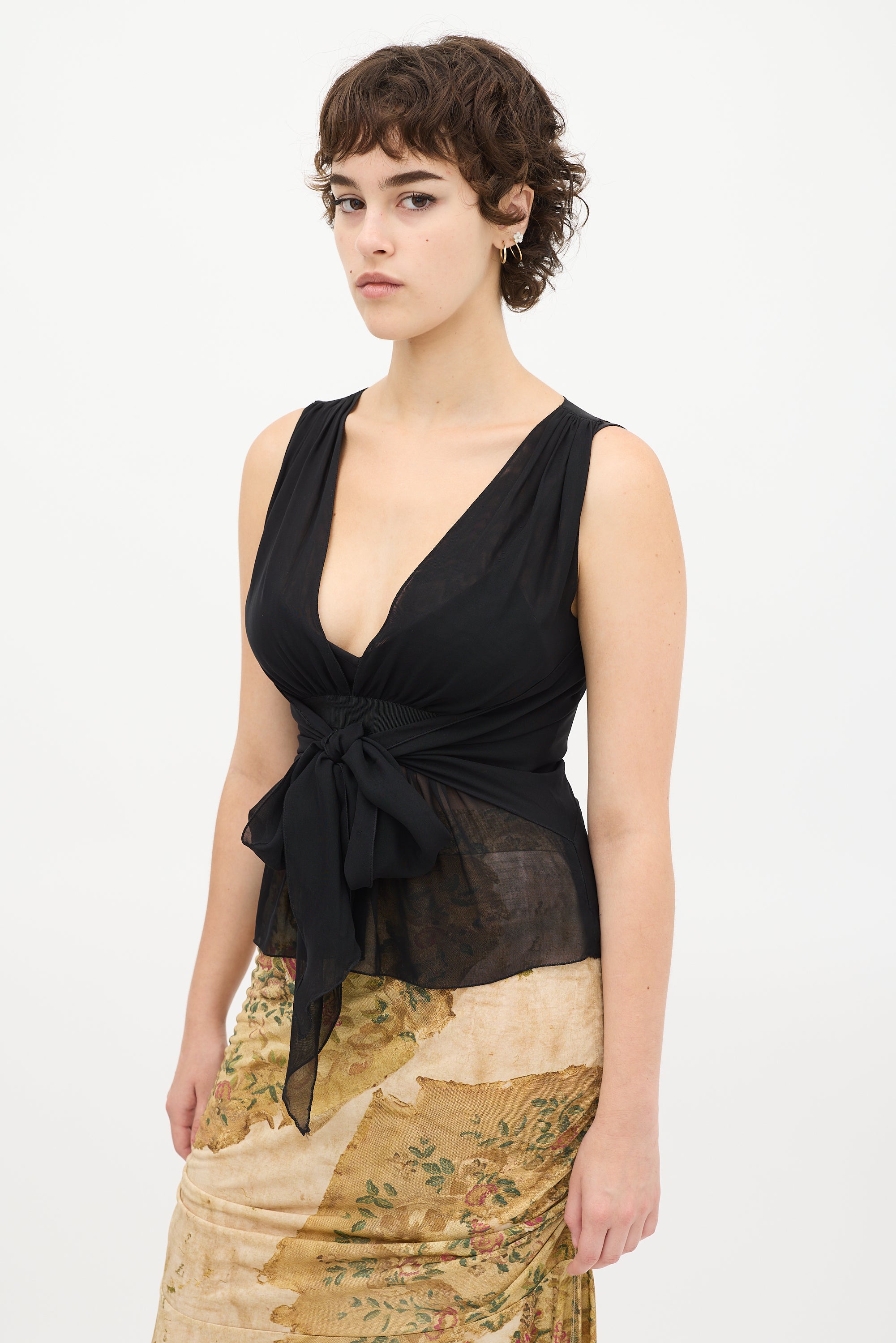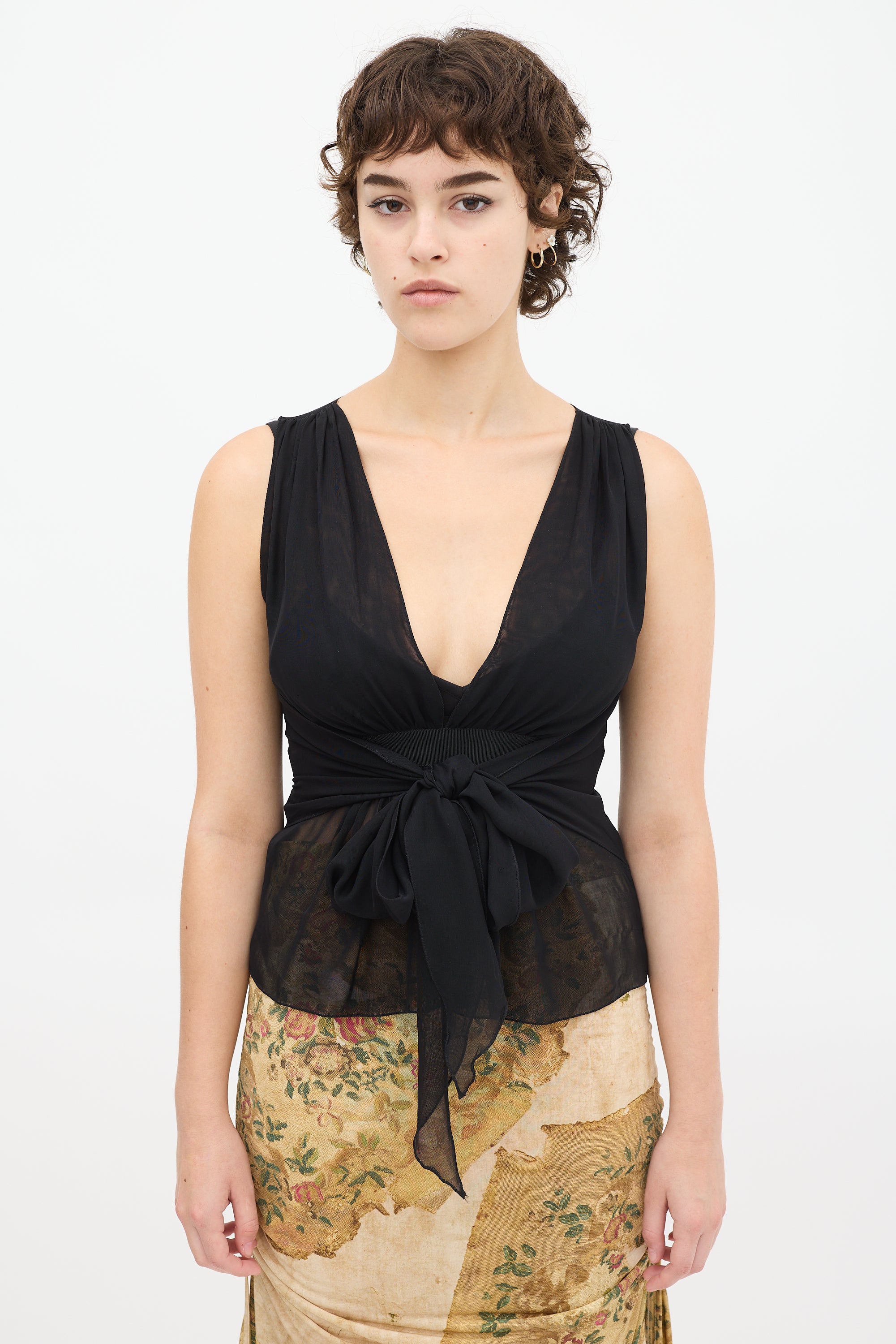 Pre-owned Prada black silk sheer sleeveless top featuring a plunging V-neckline, gathering at shoulders and waist, grosgrain trim at front waist, tie back design, and concealed side zip.