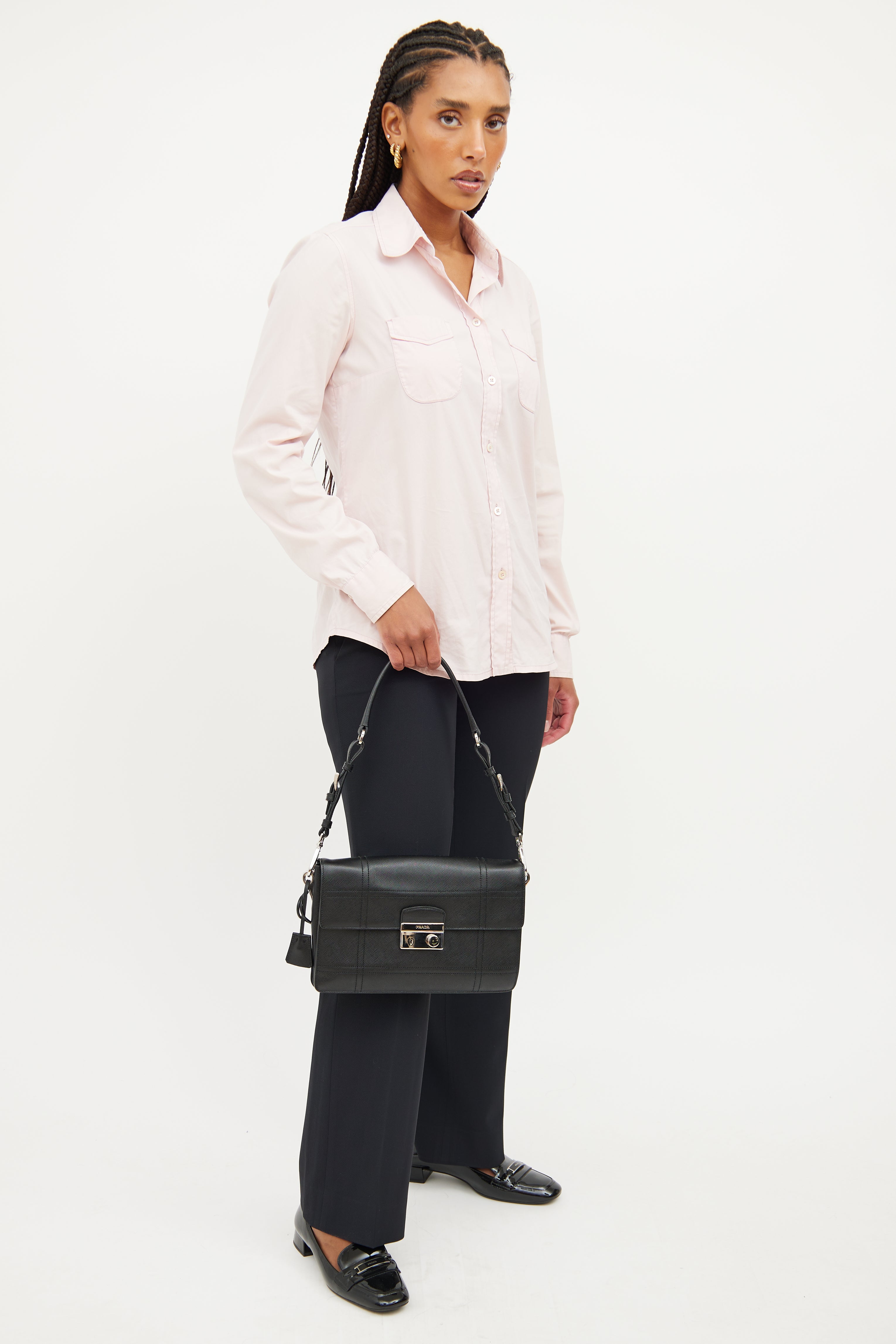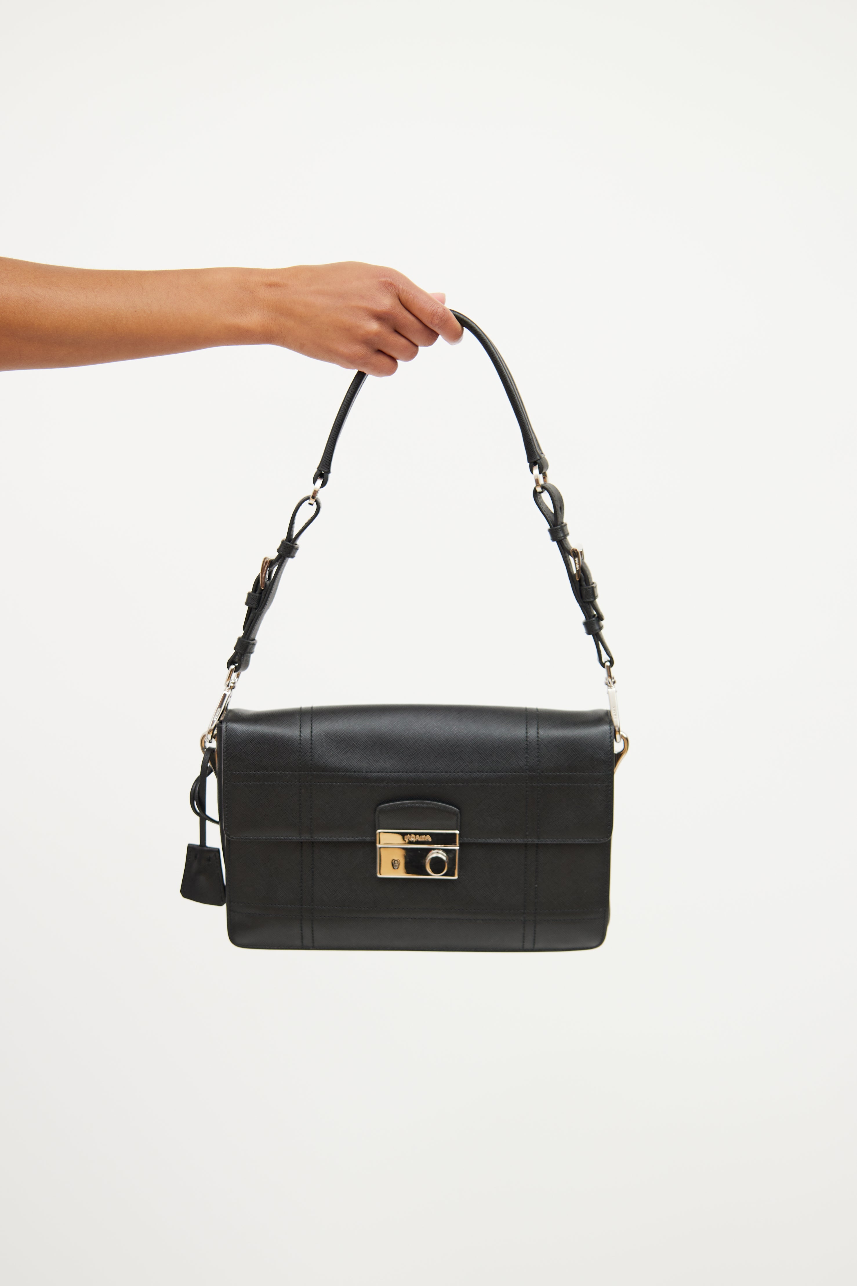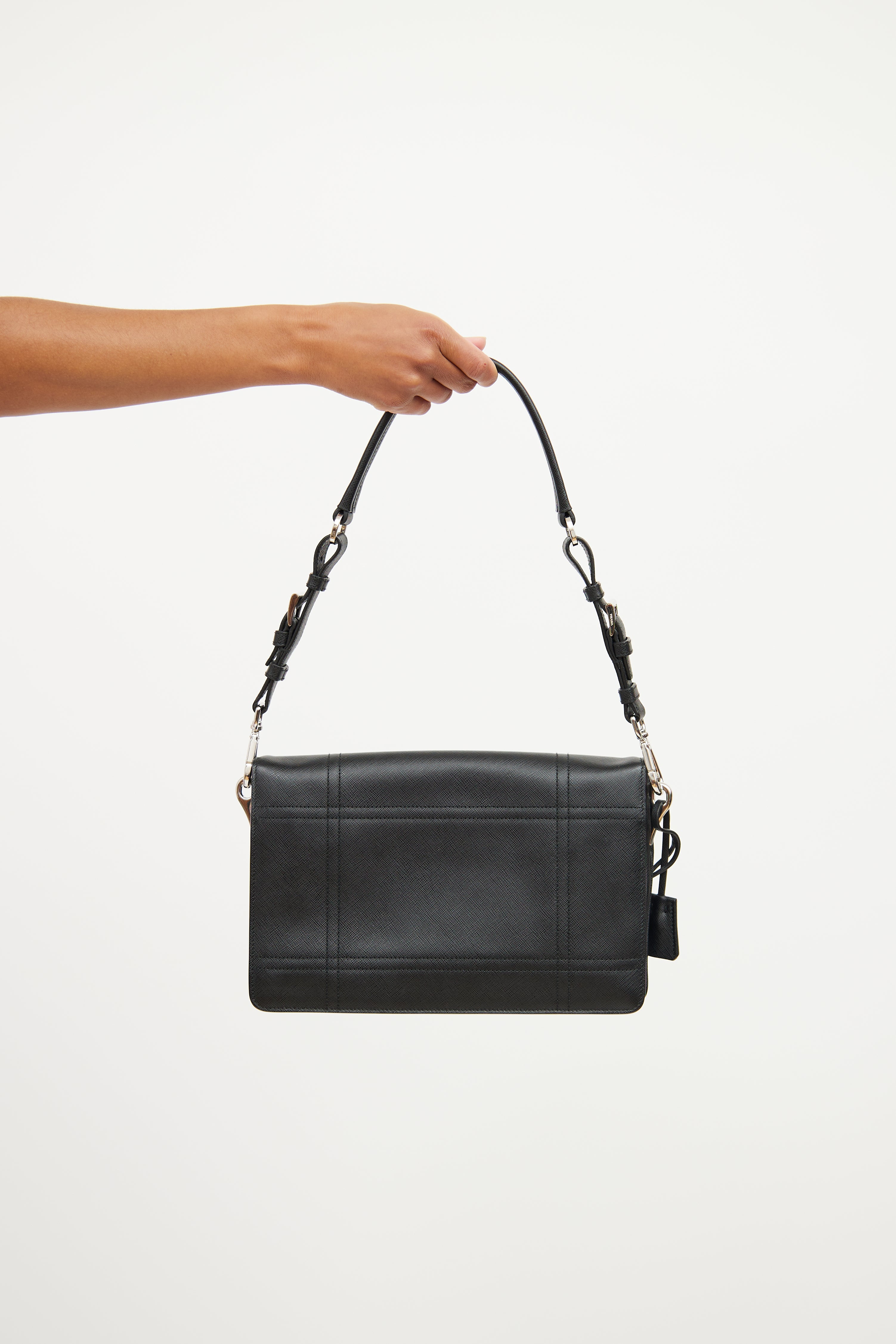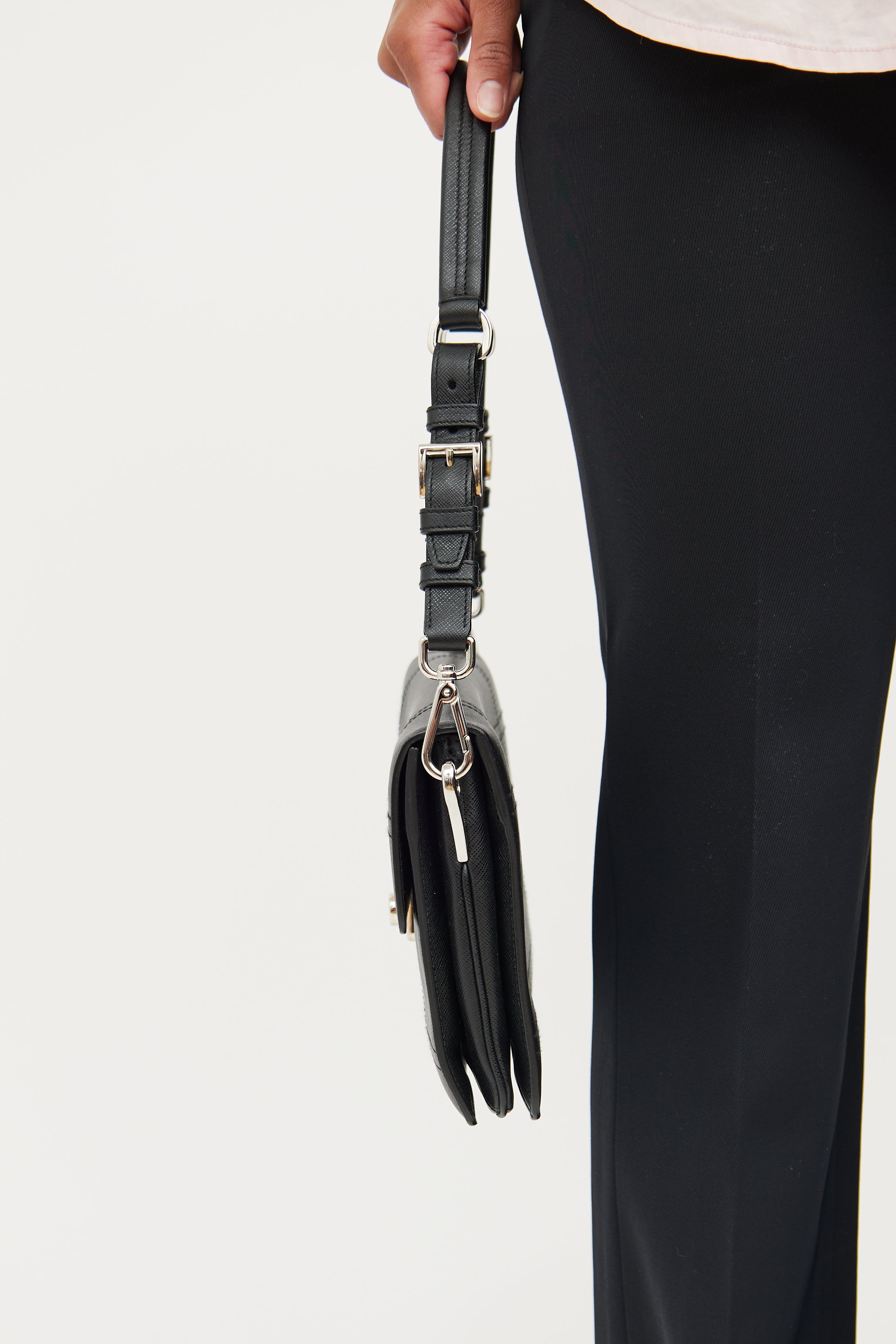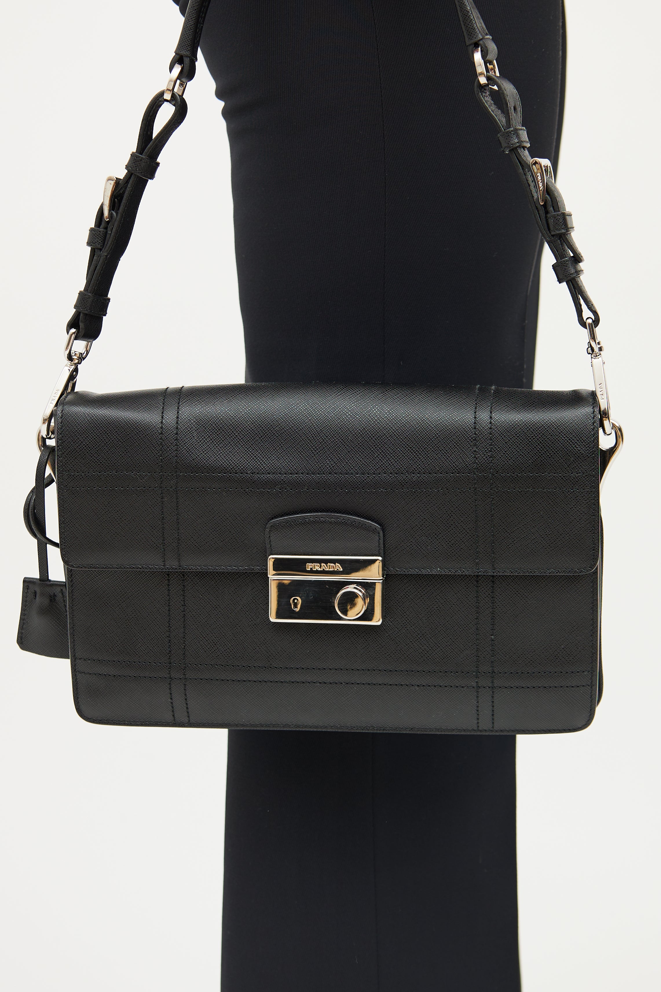 Pre-owned Prada black soft Saffiano sound bag featuring single adjustable flat shoulder strap, silver tone hardware, clochette, paneling and logo text stamped hardware lock closure on front flap. Grey nylon lined main compartment with centre divider, single slip pocket and single zip pocket.