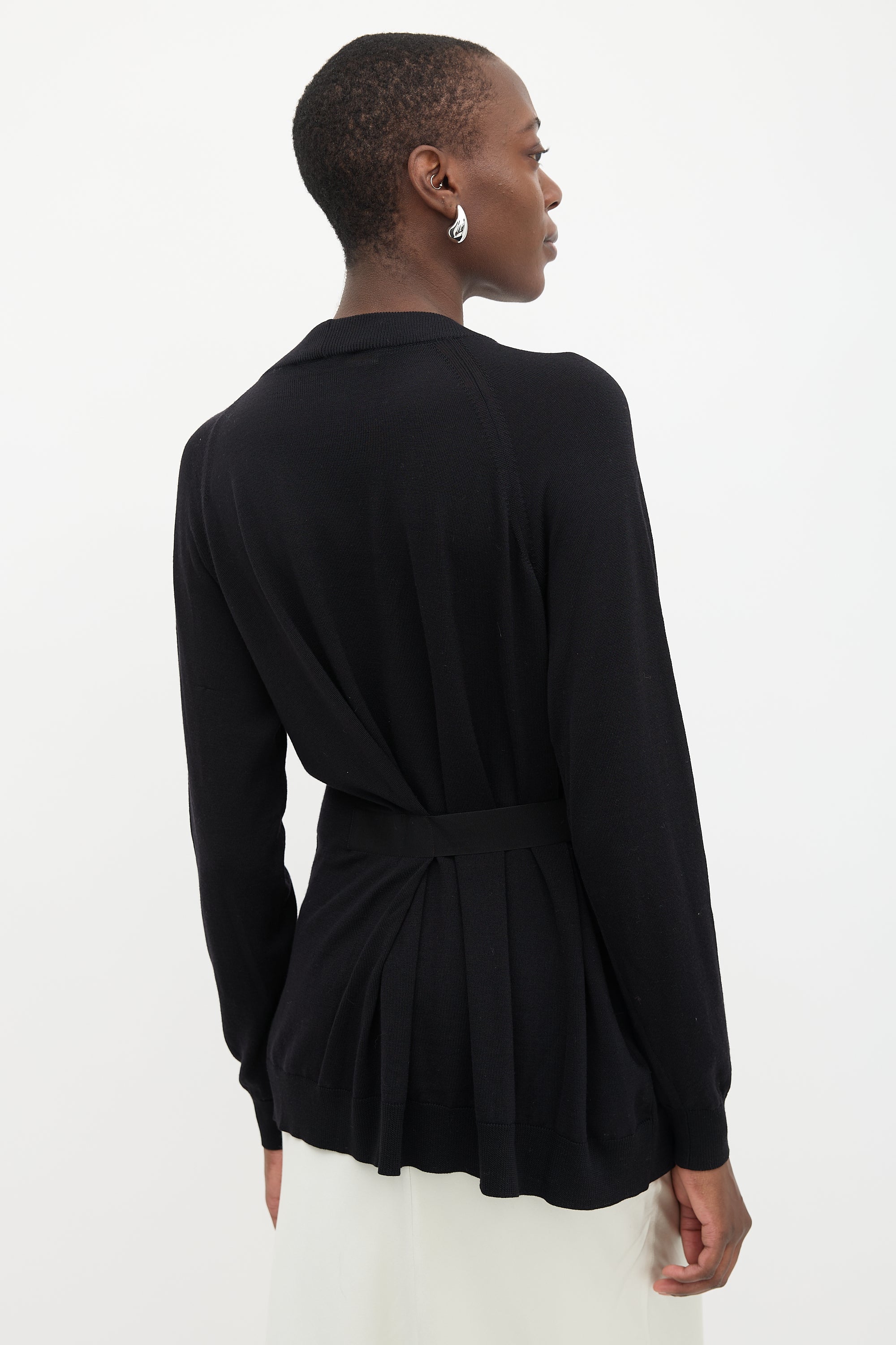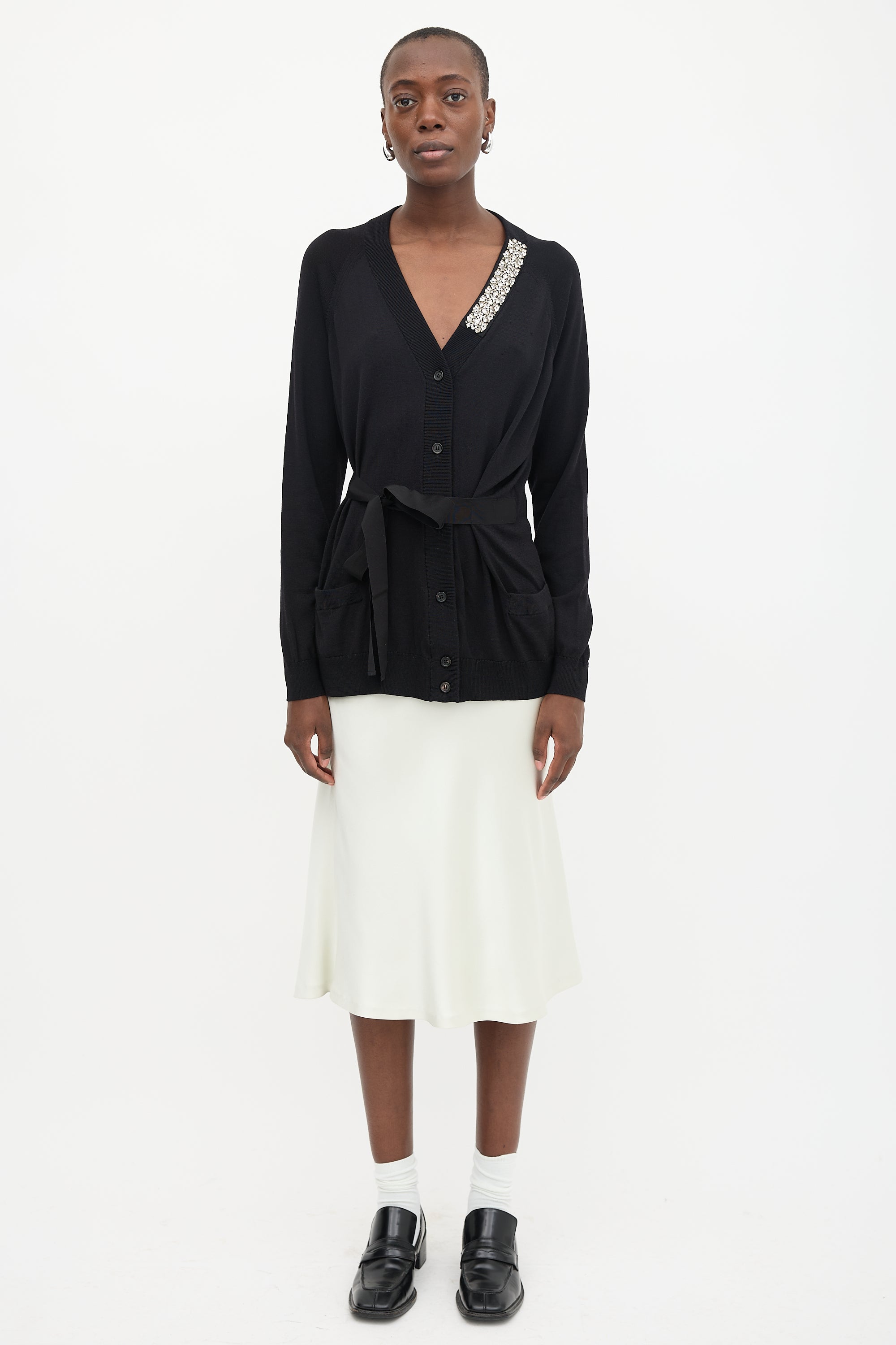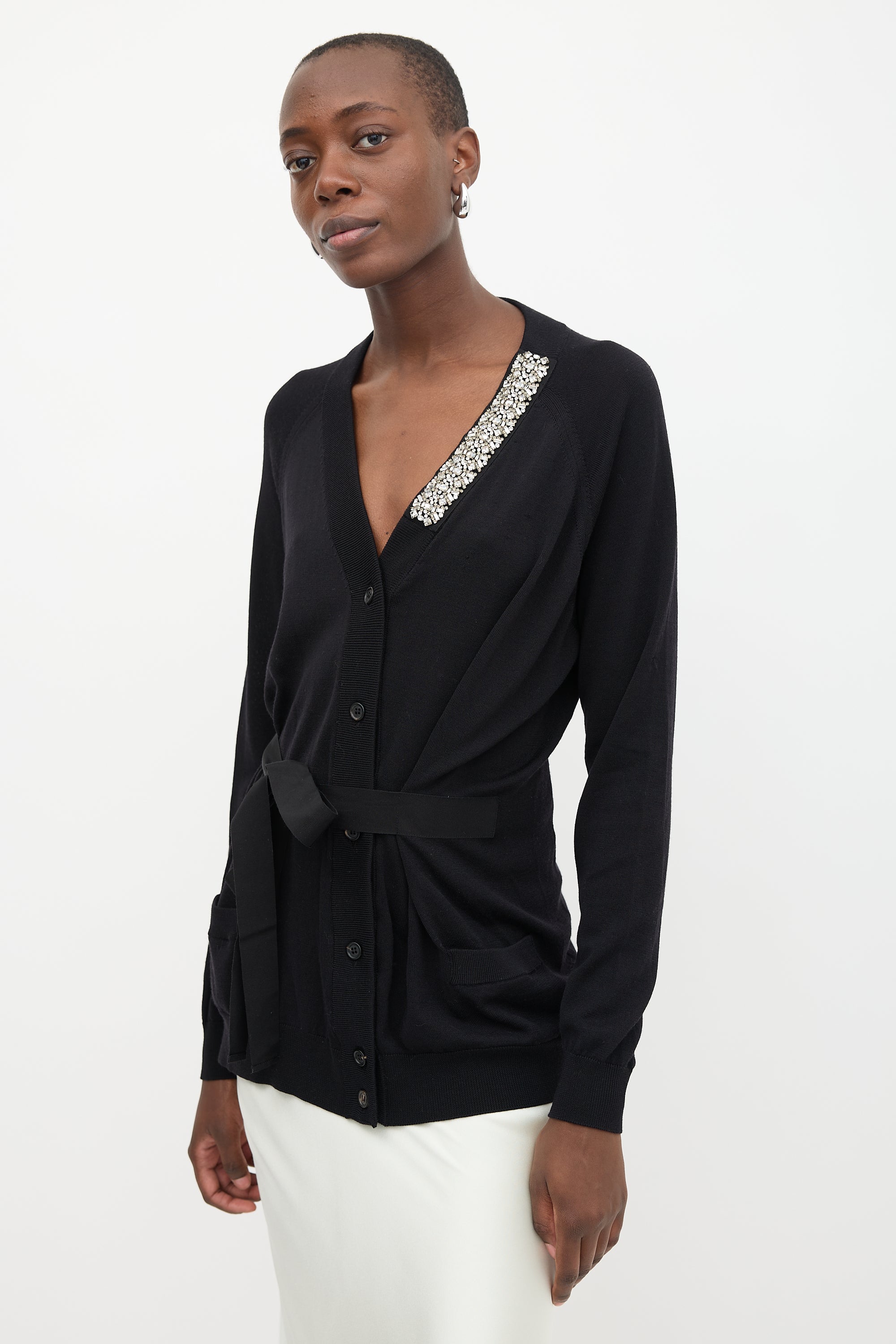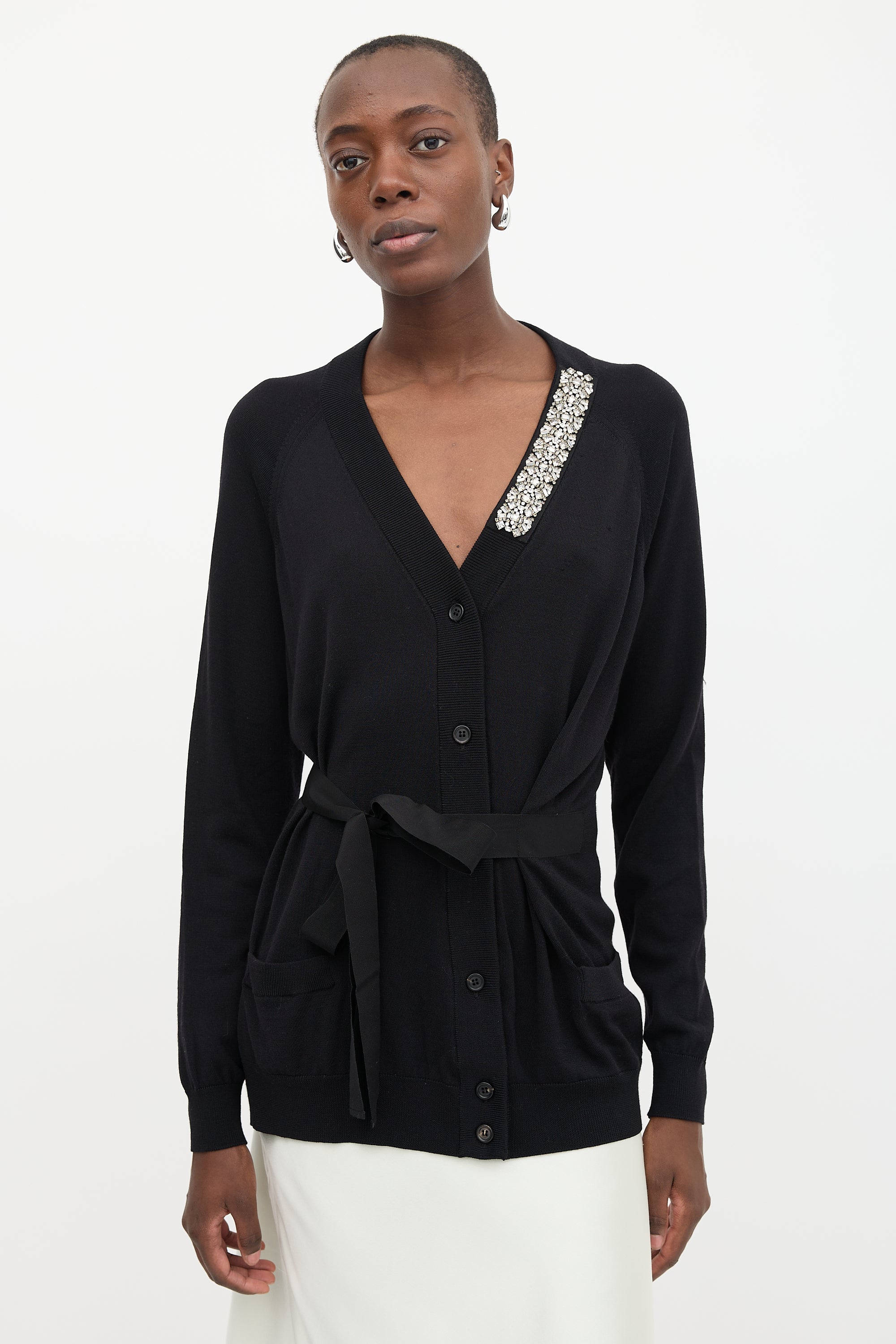 Pre-owned Prada FW 2004 black cardigan featuring Y-neckline, crystal embellished collar, button up front, two front pockets, grosgrain waist tie, and ribbed collar, placket, pocket edges, hem, and cuffs.