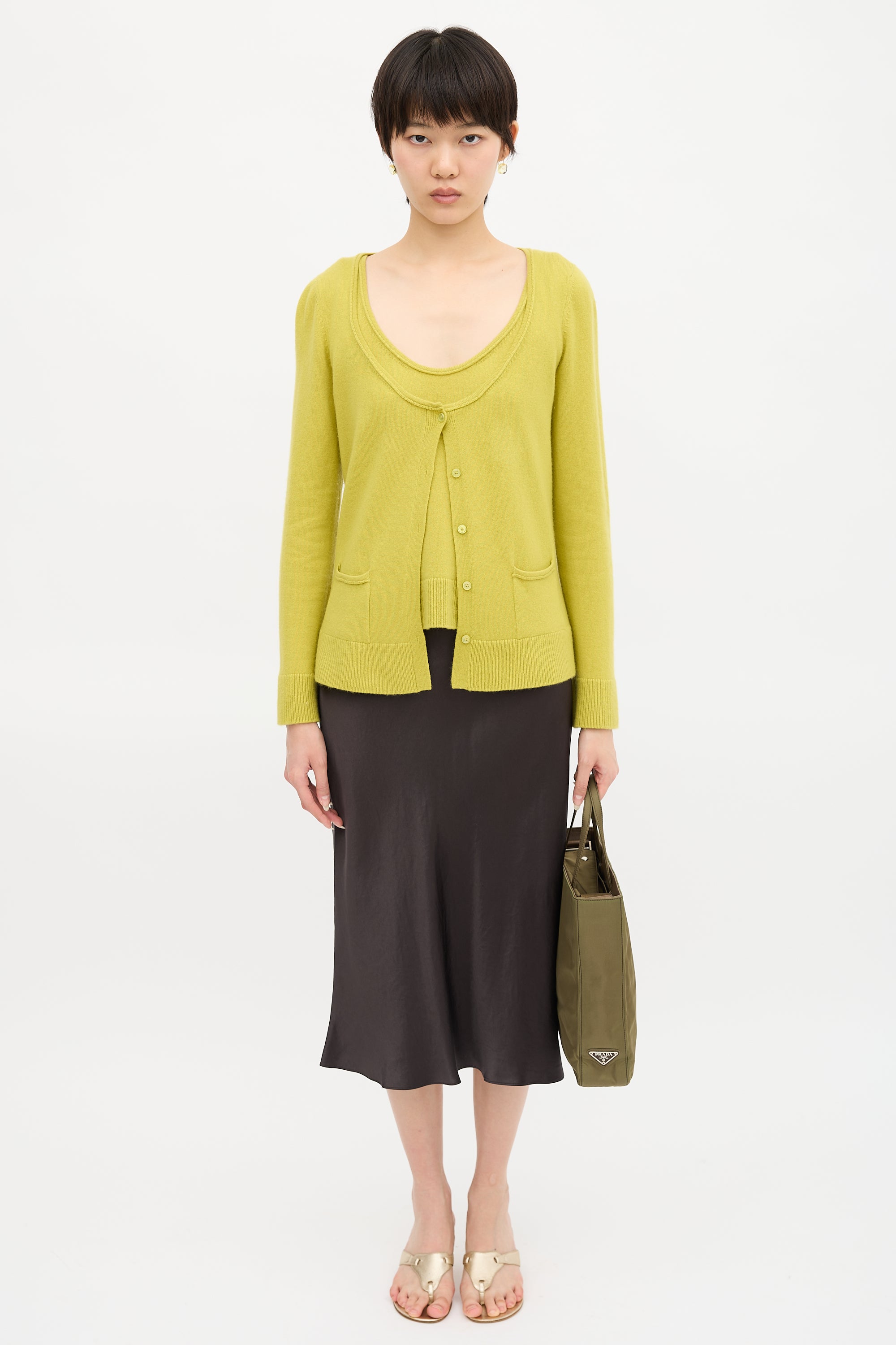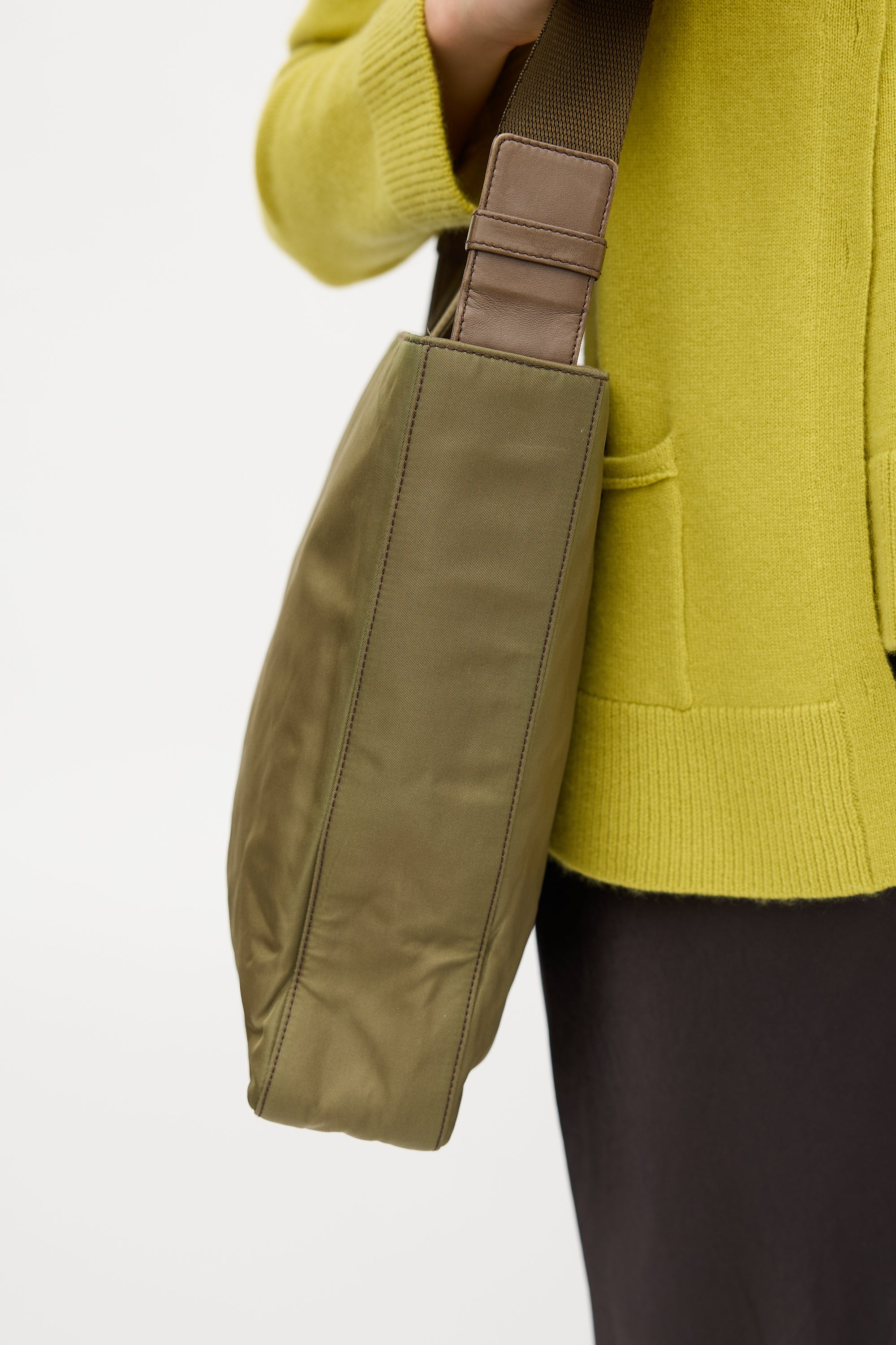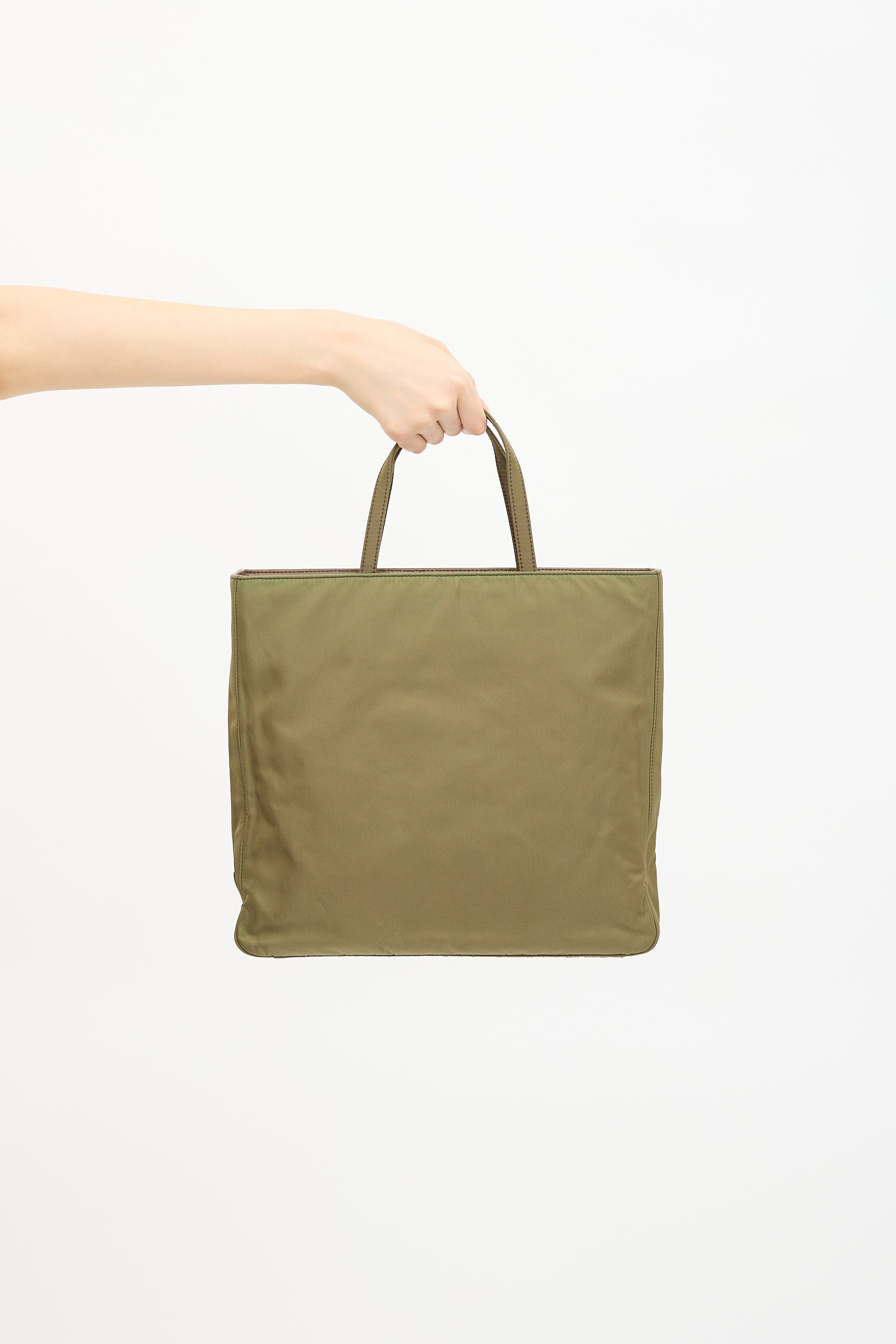 Pre-owned Prada green nylon Messenger bag featuring brown leather trim, dual retractable top handles, detachable canvas shoulder strap, signature triangle logo plaque at side, open top with interior flap, and three main compartments with optional pouch.