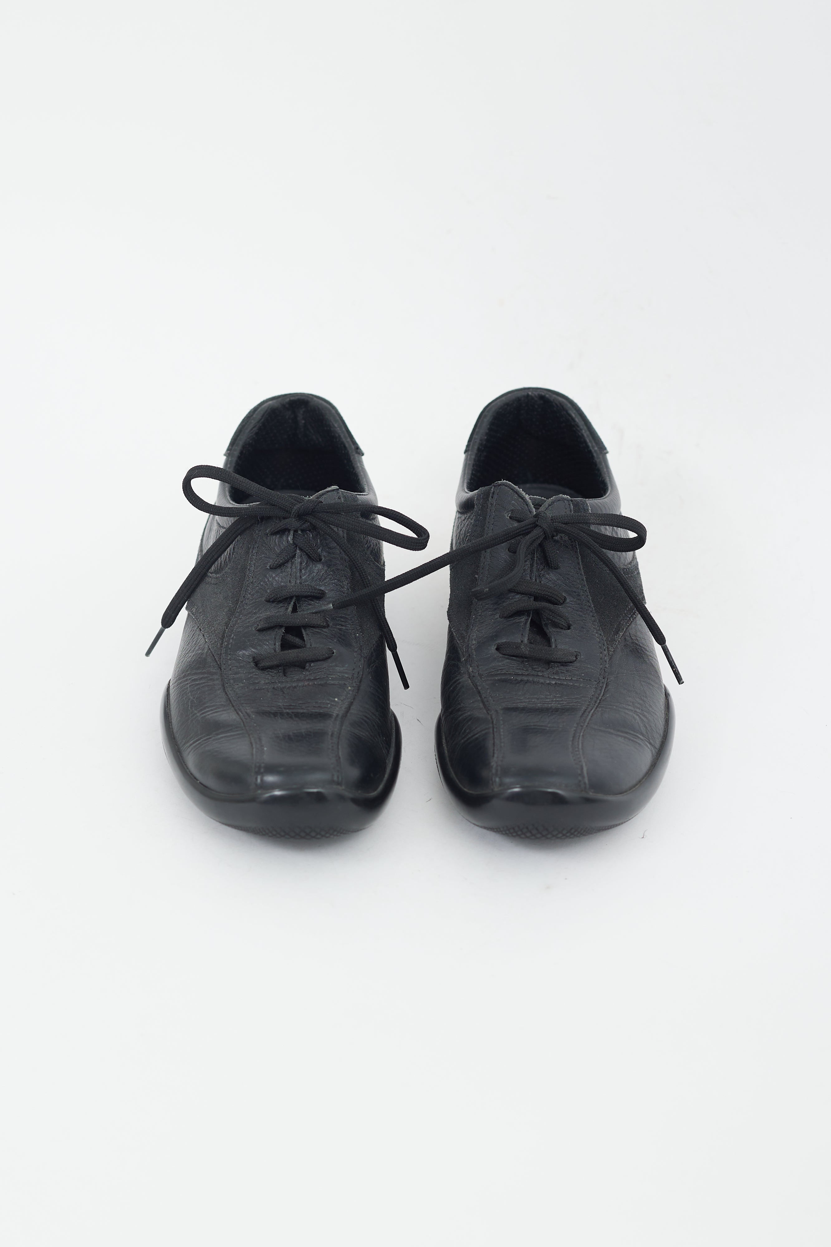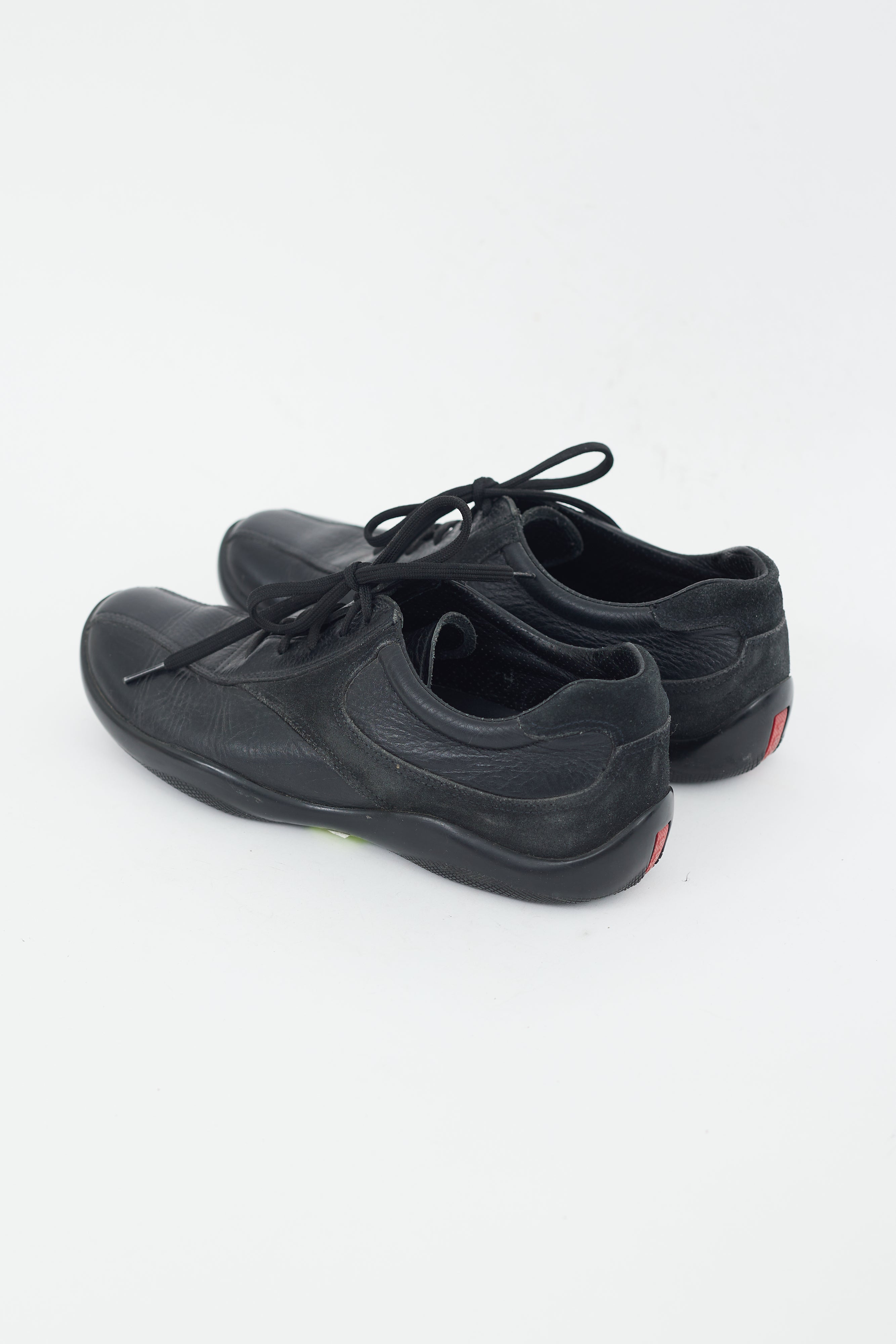 Pre-owned Prada Sport black sneakers featuring a rounded toe, leather upper, suede panelling at body and counter, lace up front, and shaped rubber sole with visible red embossed logo insert at counter.