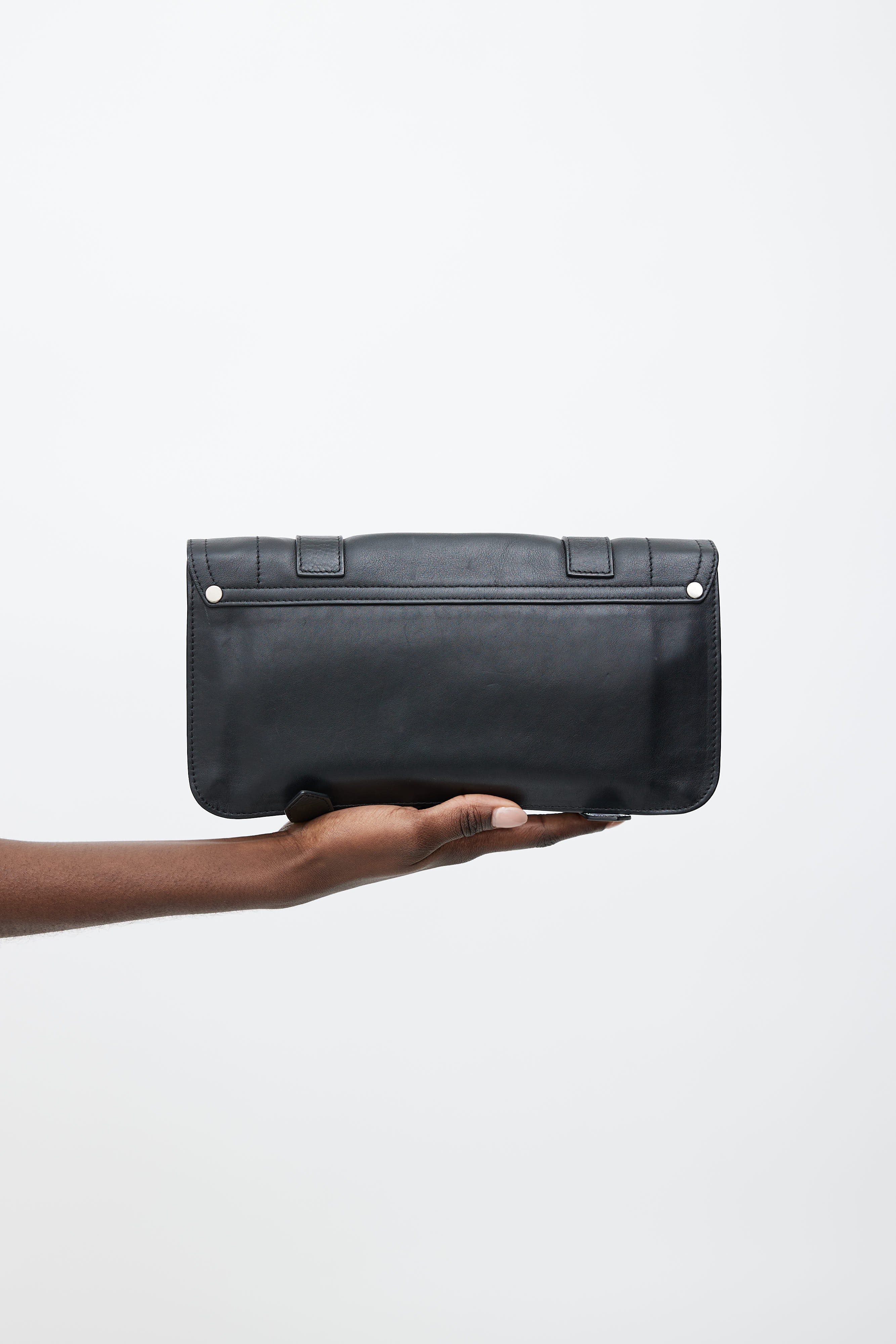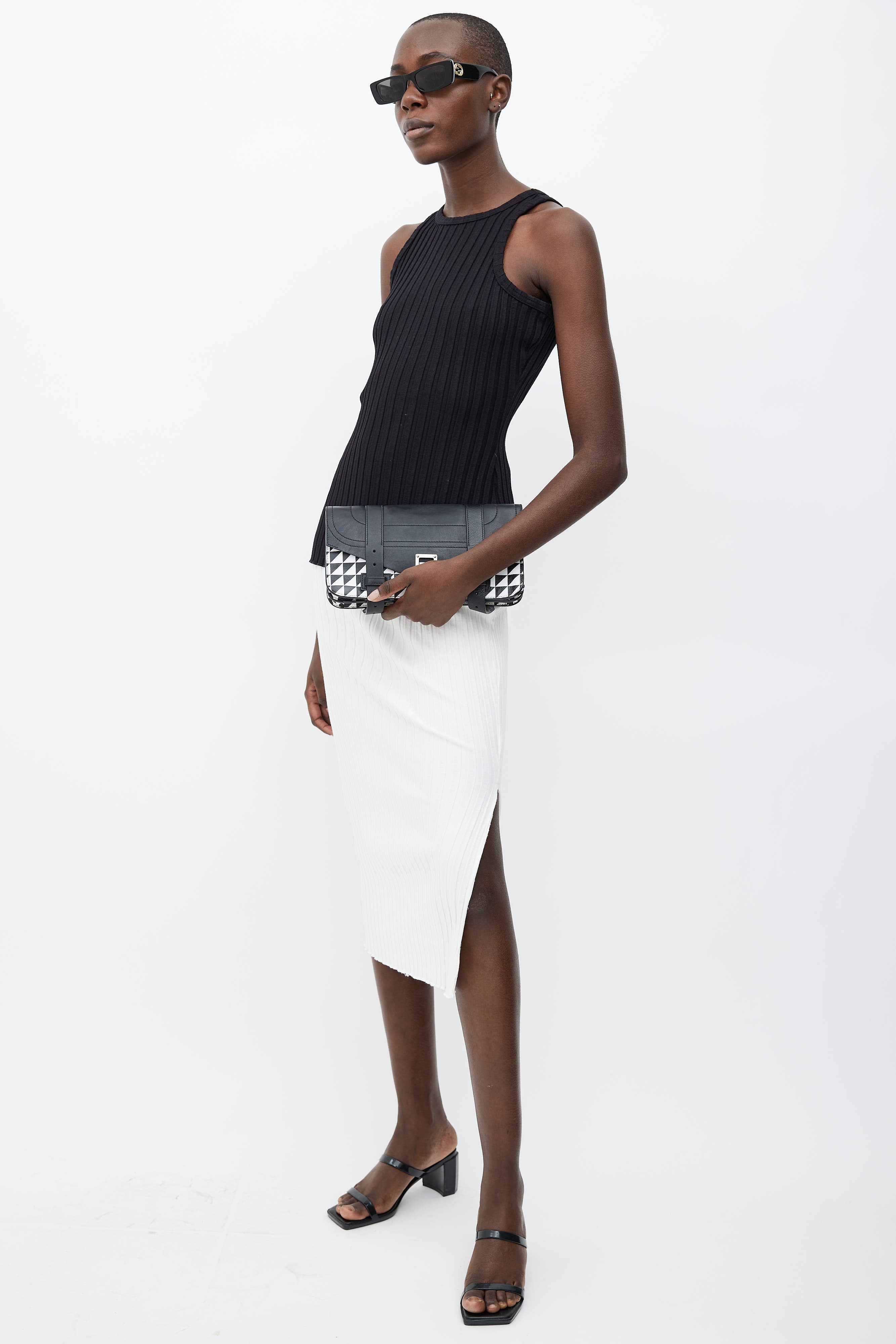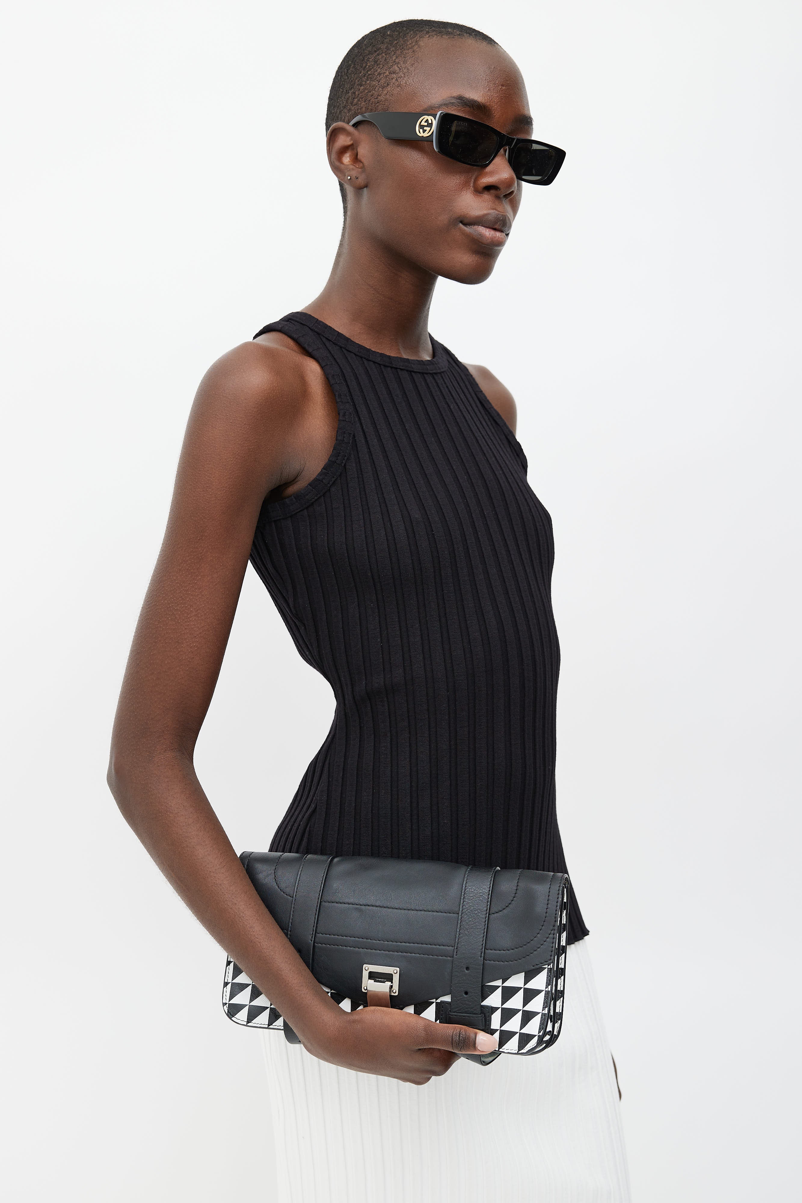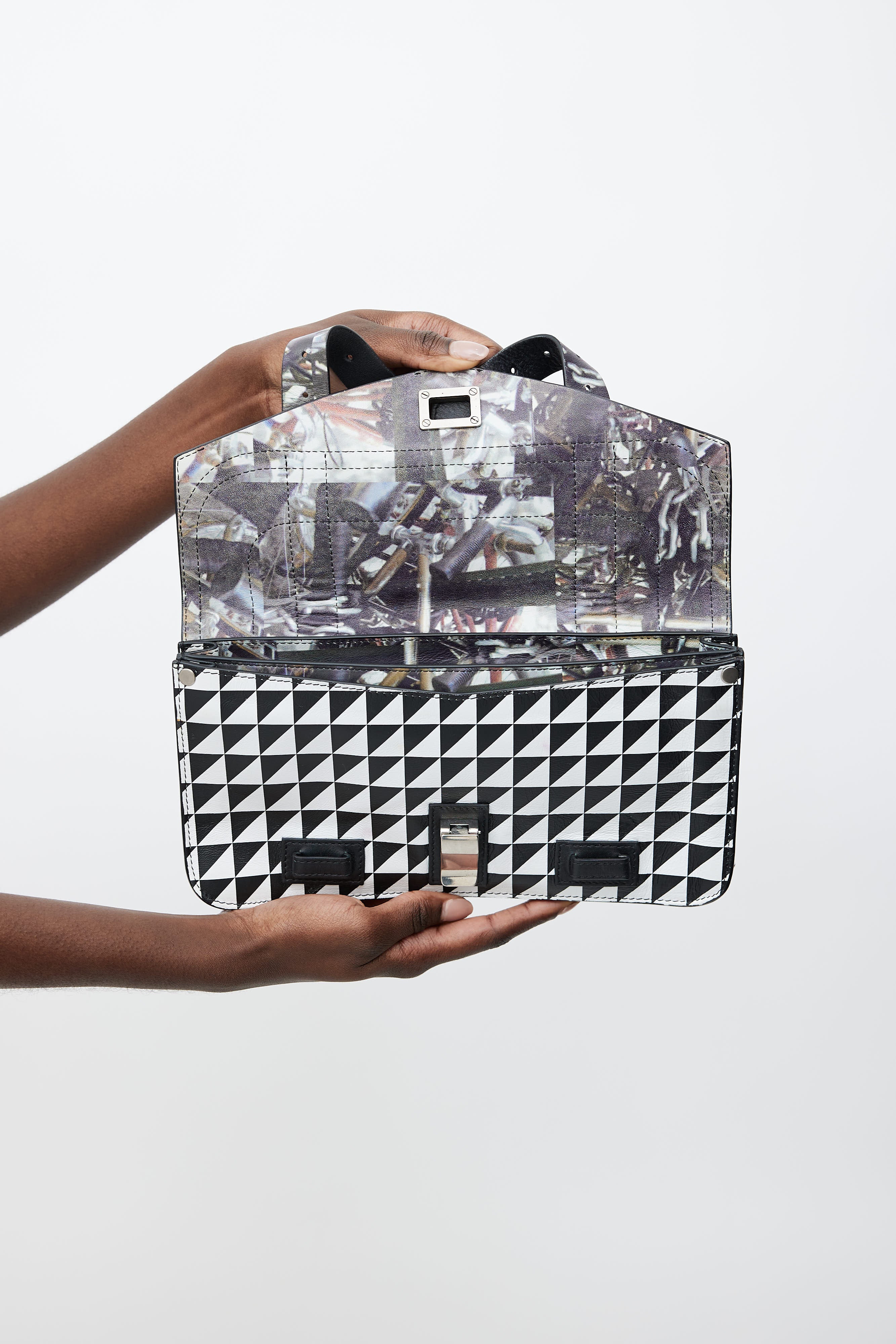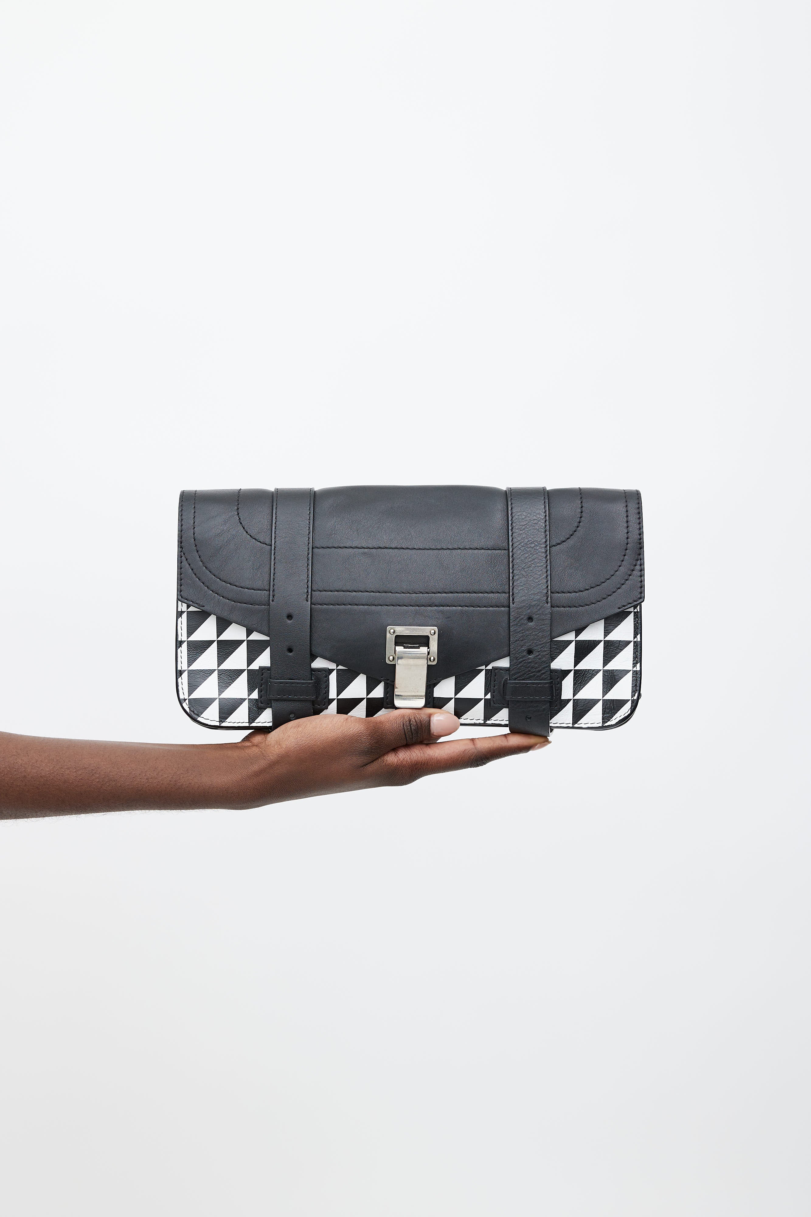 Pre-owned Proenza Schouler black PS1 clutch with a white geometric print, top flap with silver tone latch closure, belt straps detail at face, two main compartments with graphic print, and interior zip pocket. Comes with dust bag.