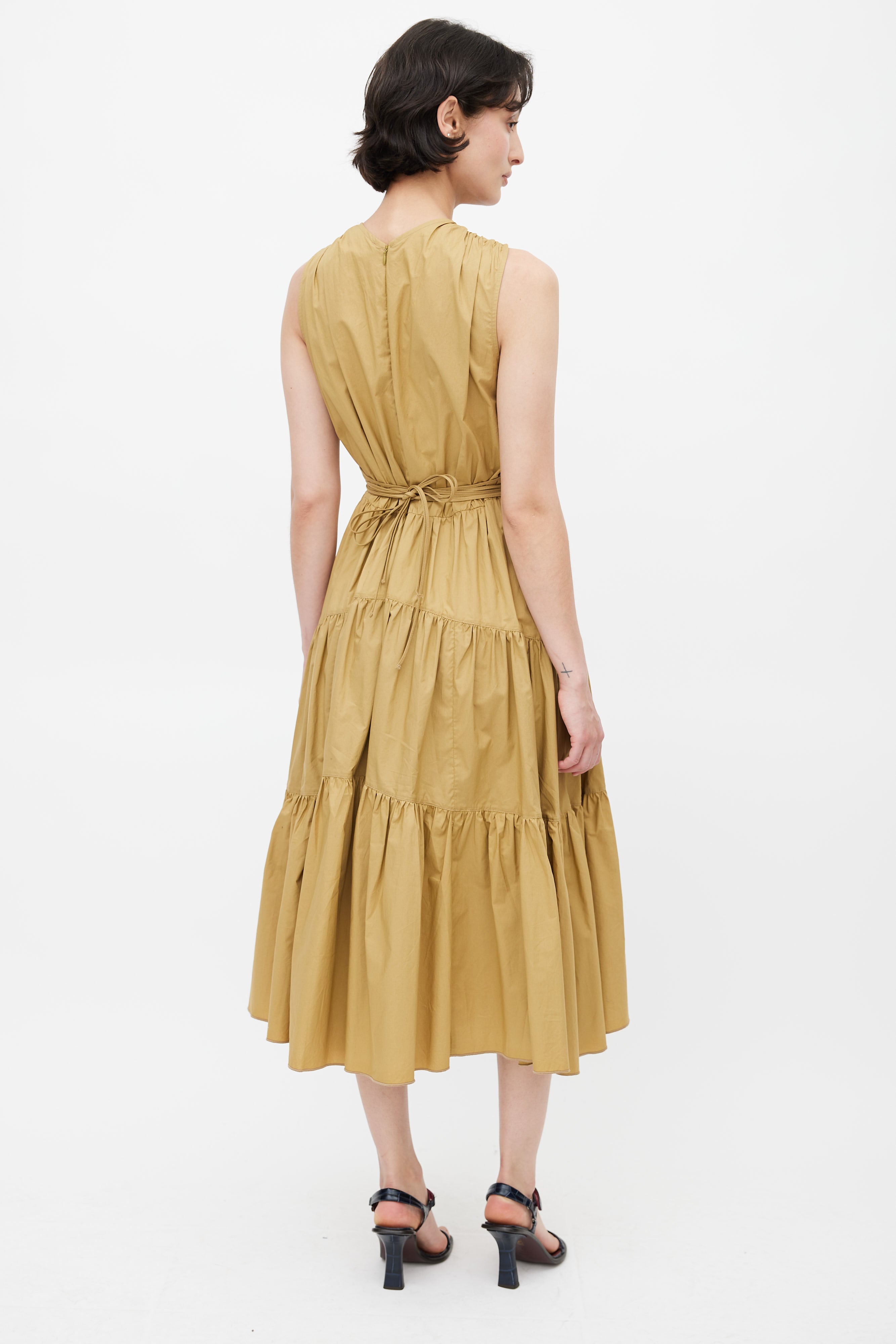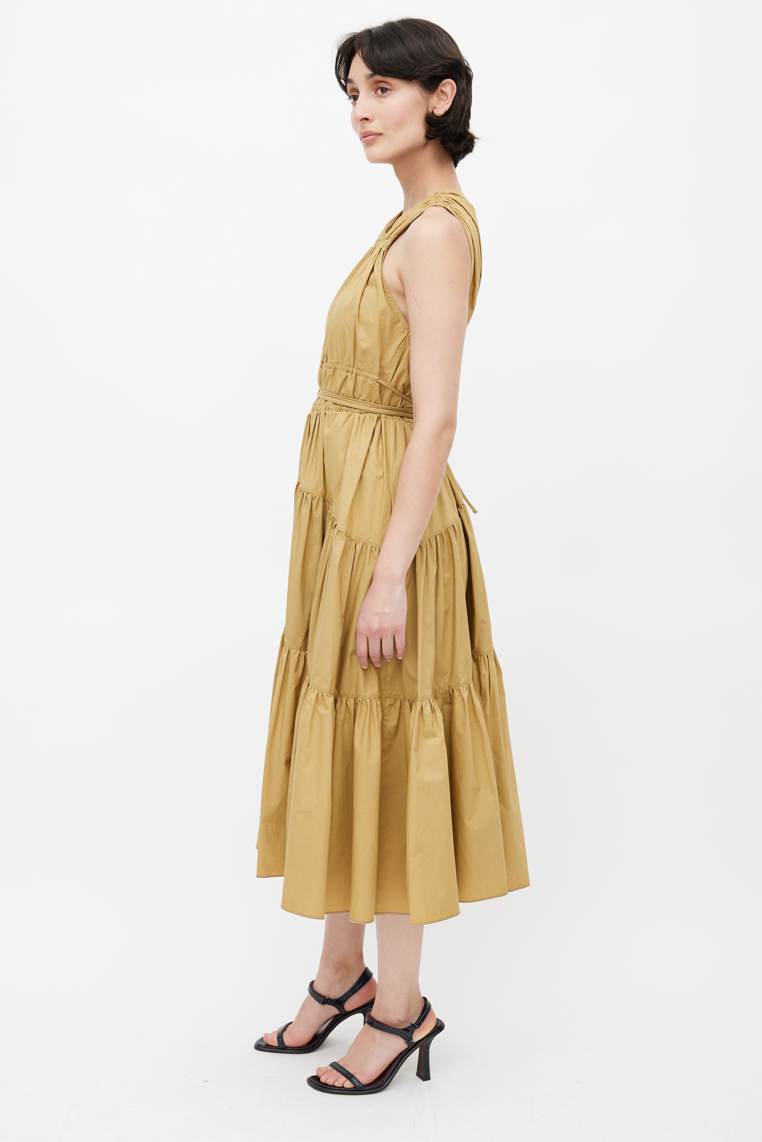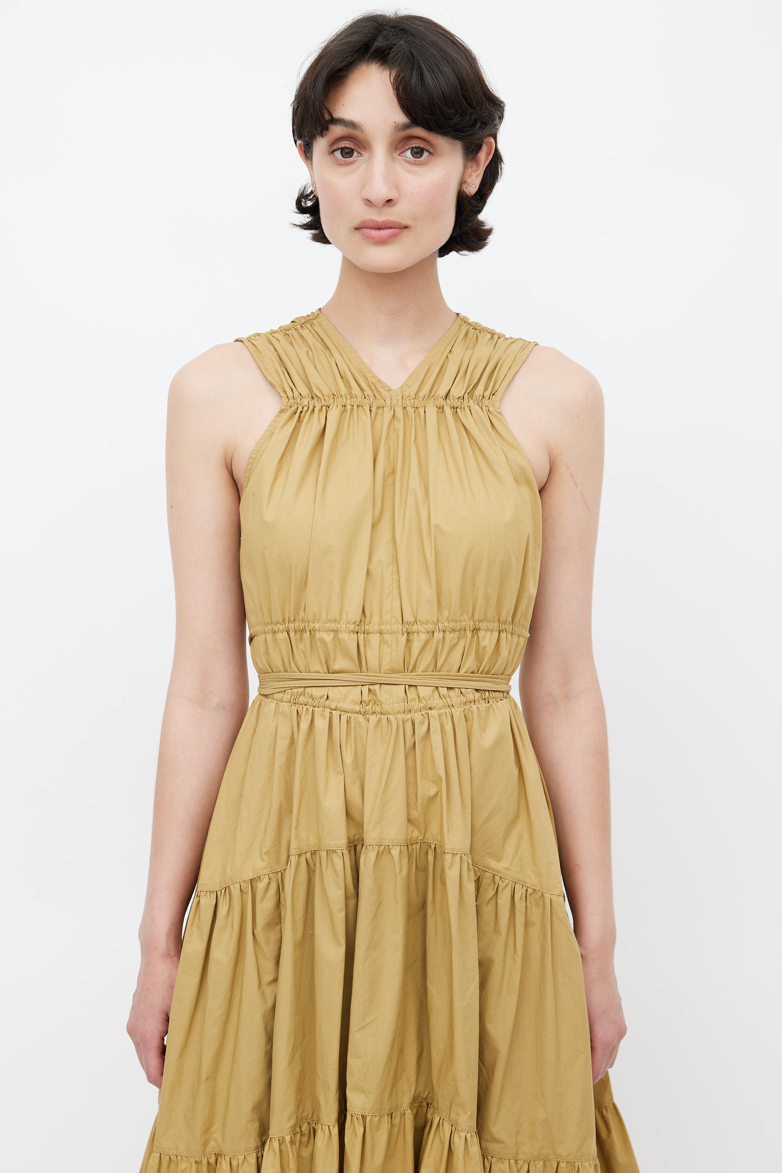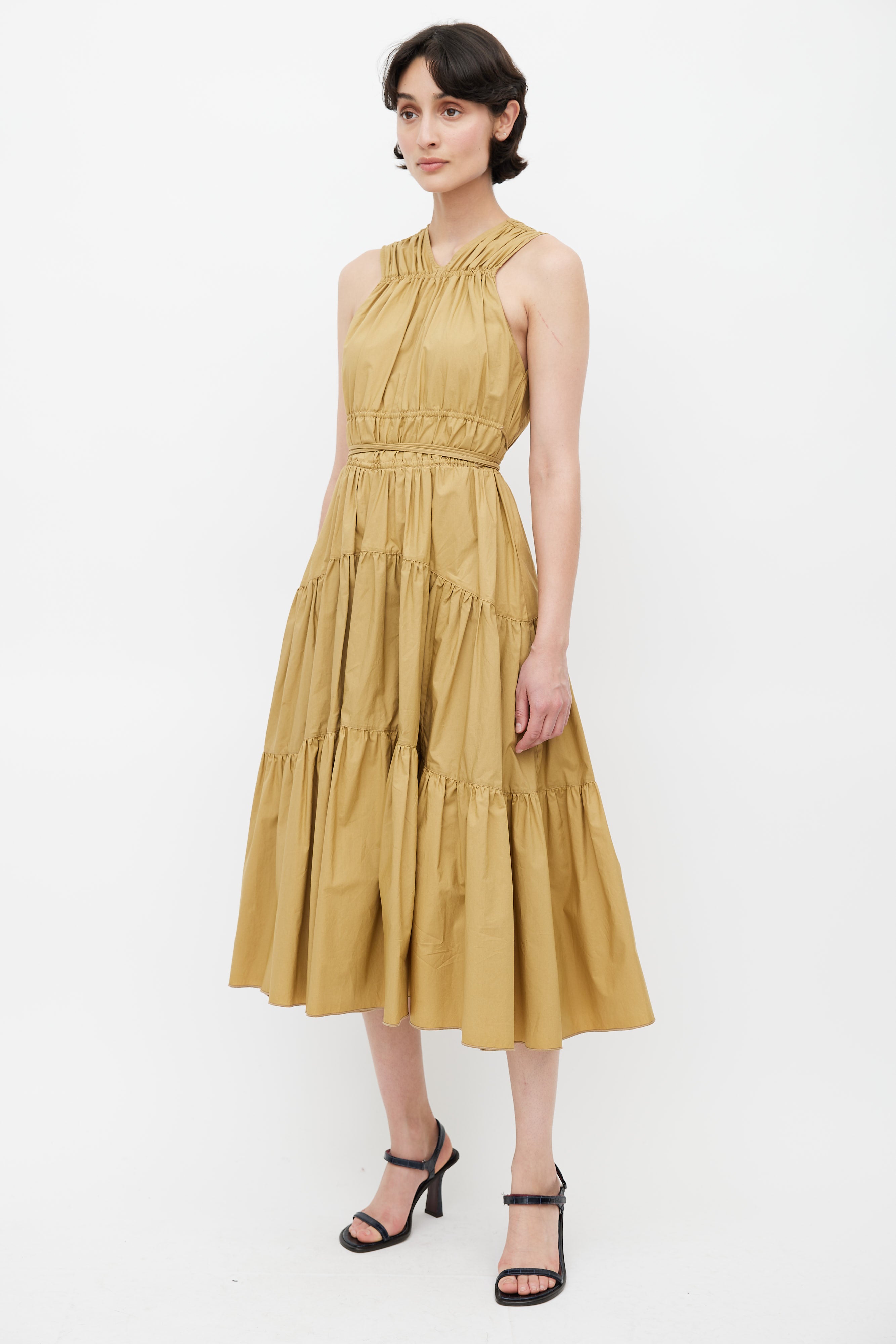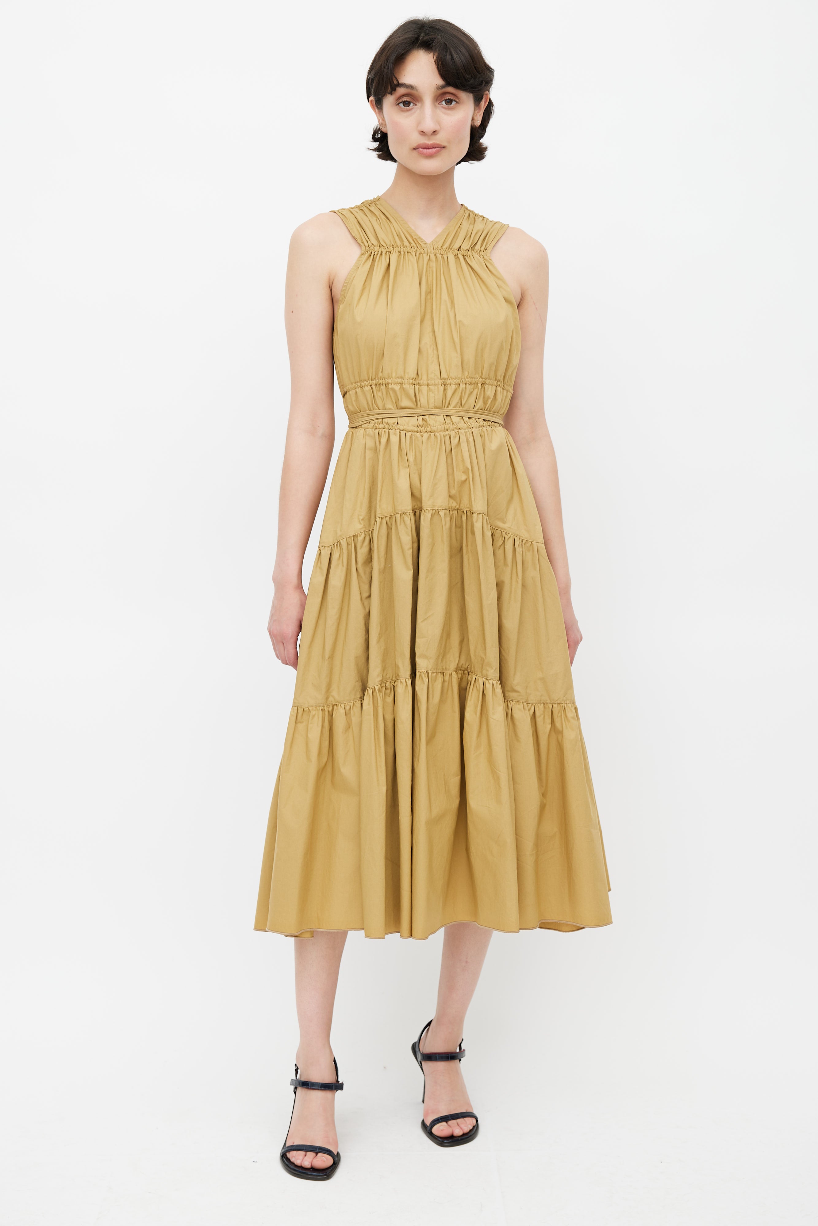 Pre-owned Proenza Schouler khaki brown midi dress featuring V-neckline, elasticized ruched detail at shoulder and bust, exaggerated drawstring at waist, two hip pockets, concealed zip closure at back, and ruffle skirt.