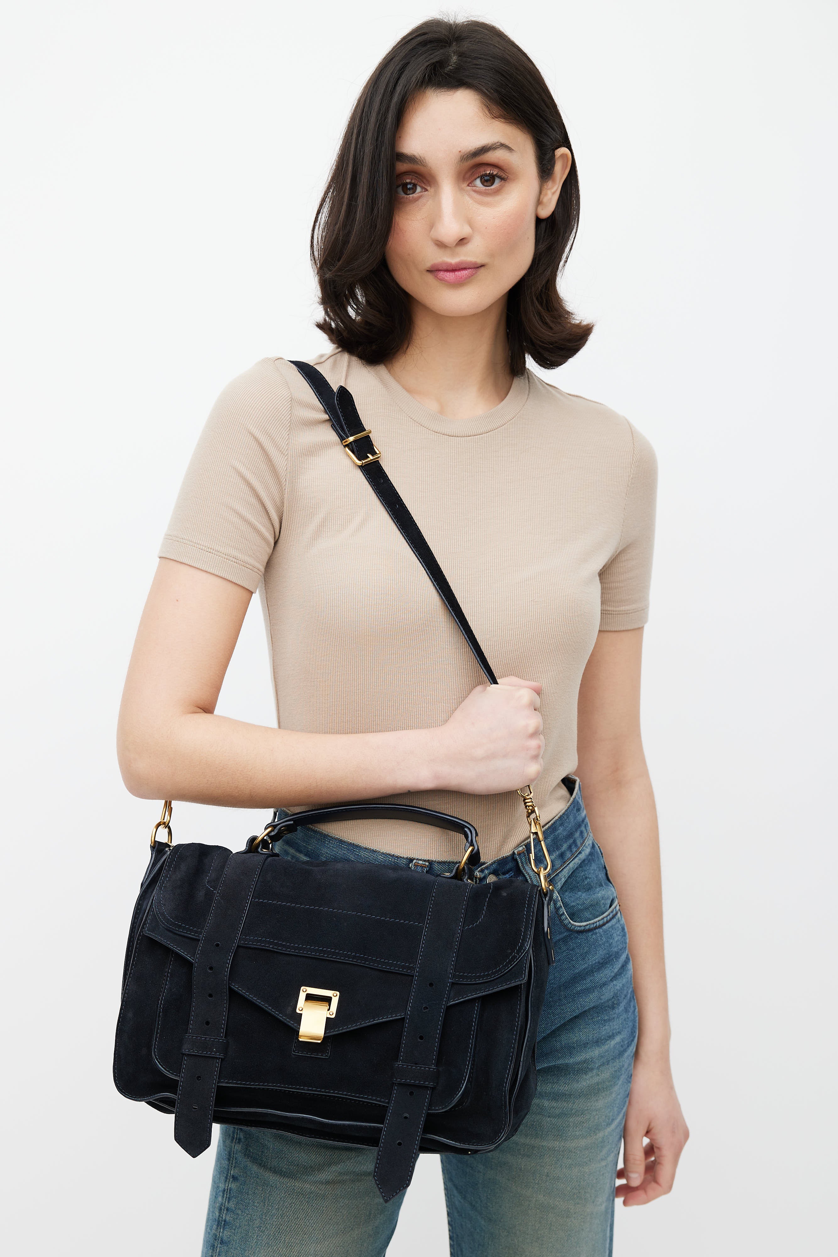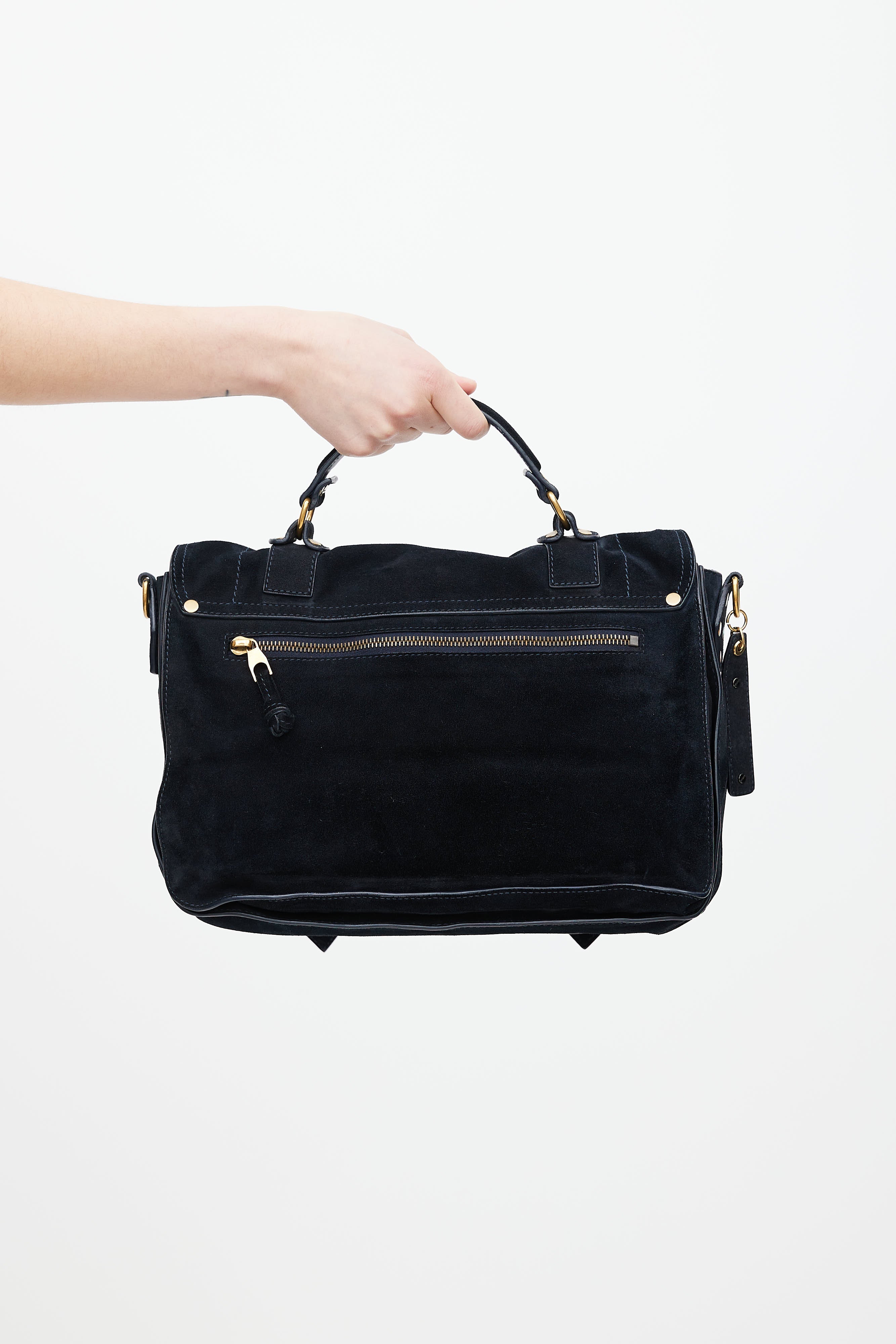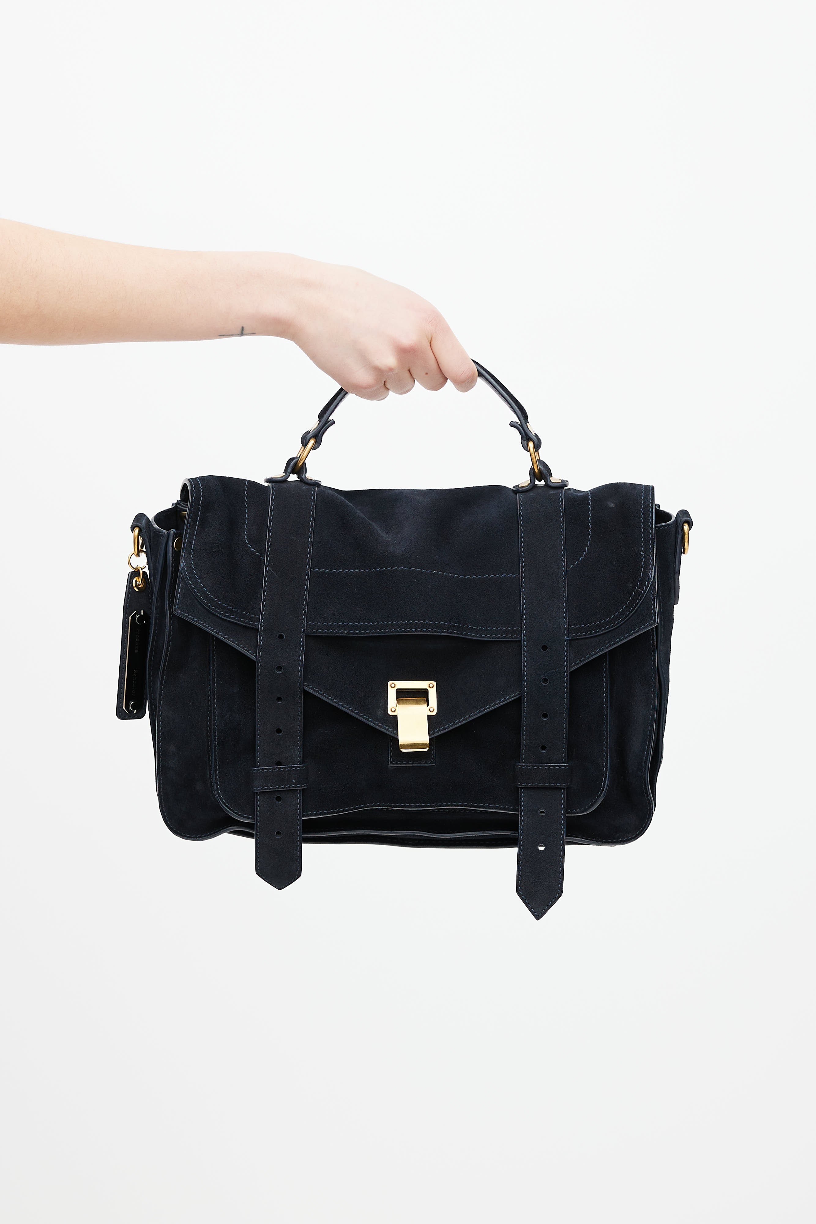 Pre-owned Proenza Schouler navy suede PS1 satchel bag featuring gold tone clasp closure, flat top handle, adjustable shoulder strap, one exterior zip pocket at back, one exterior zip and slip pocket under top flap, one main interior compartment with one zip pocket, and printed lining.