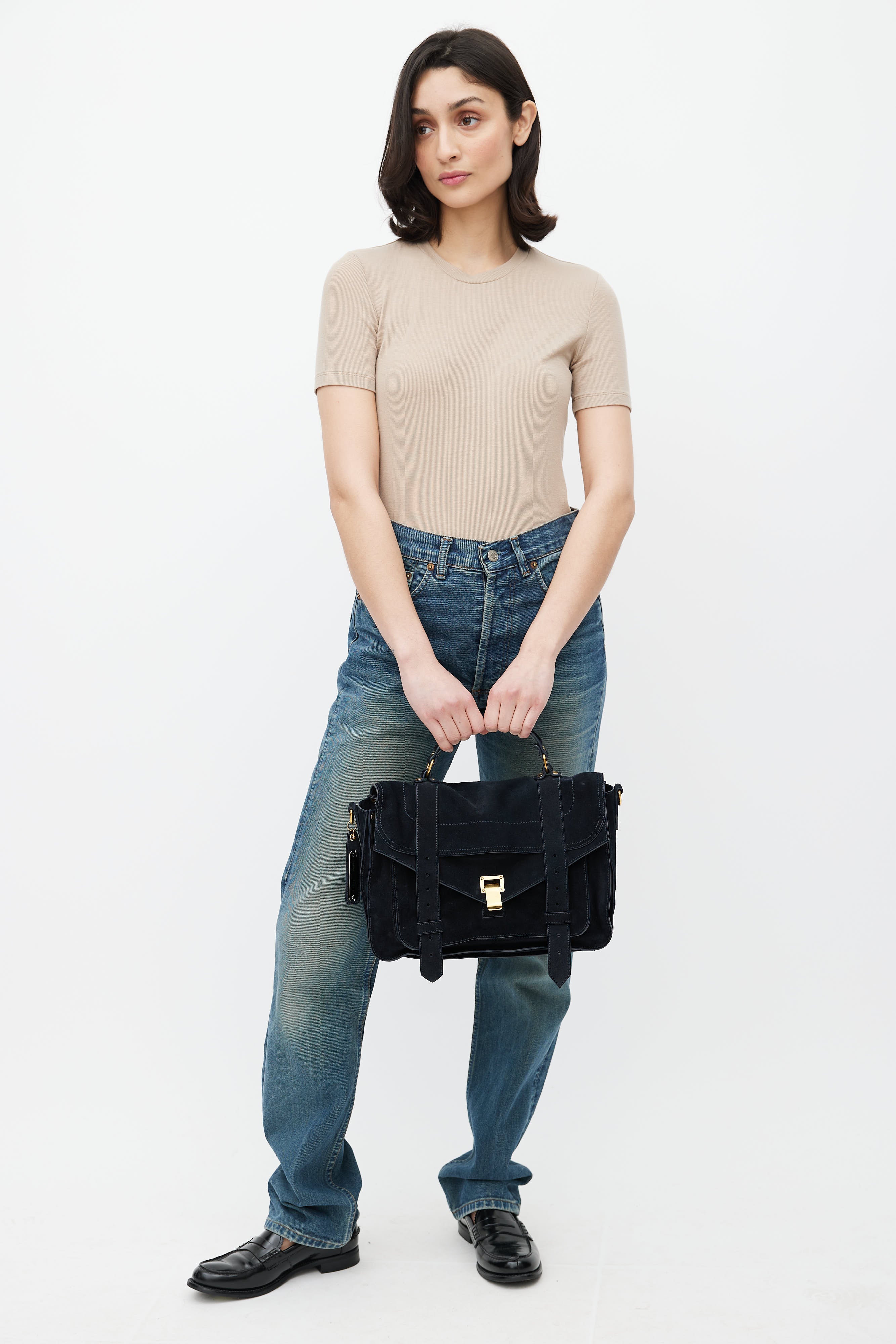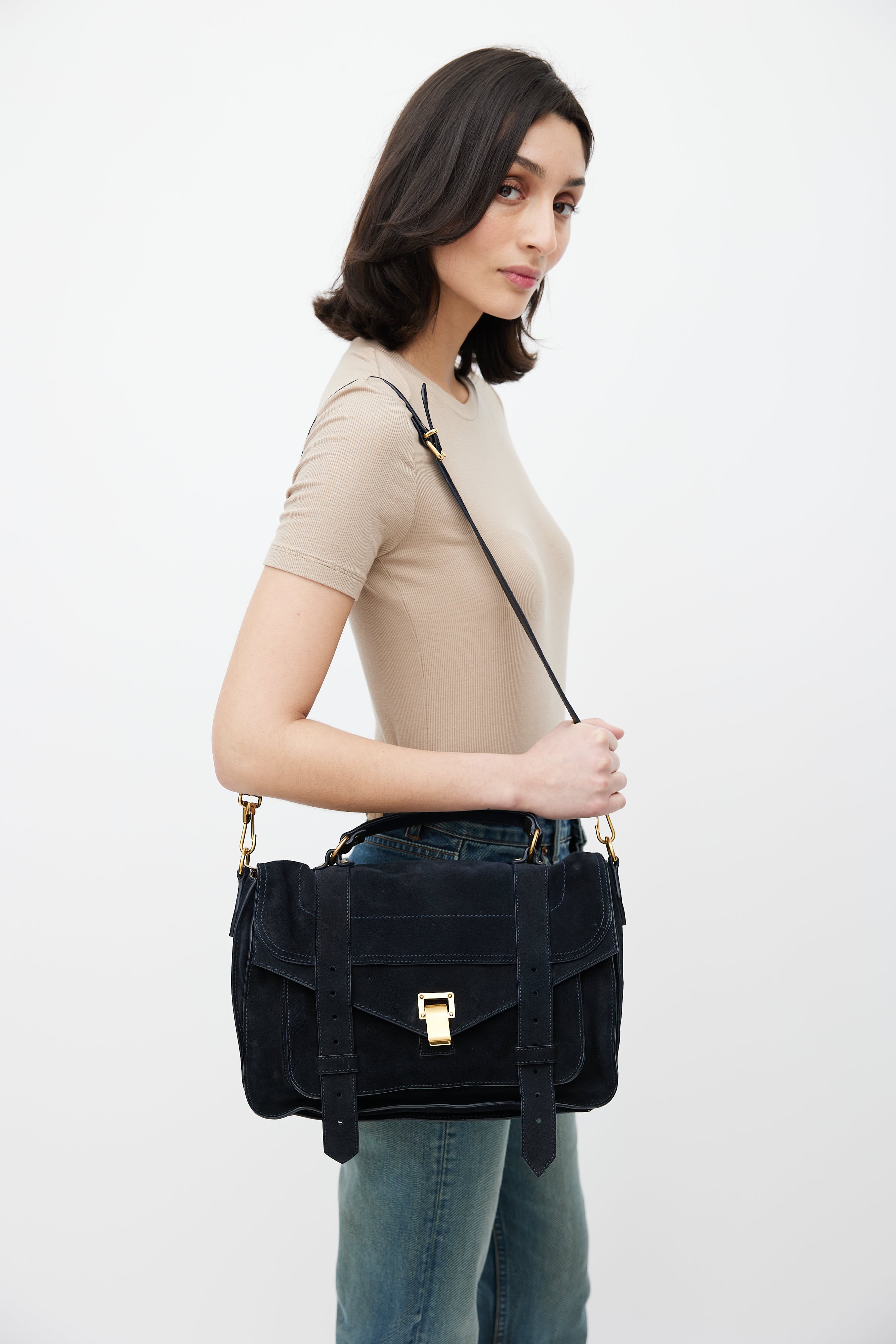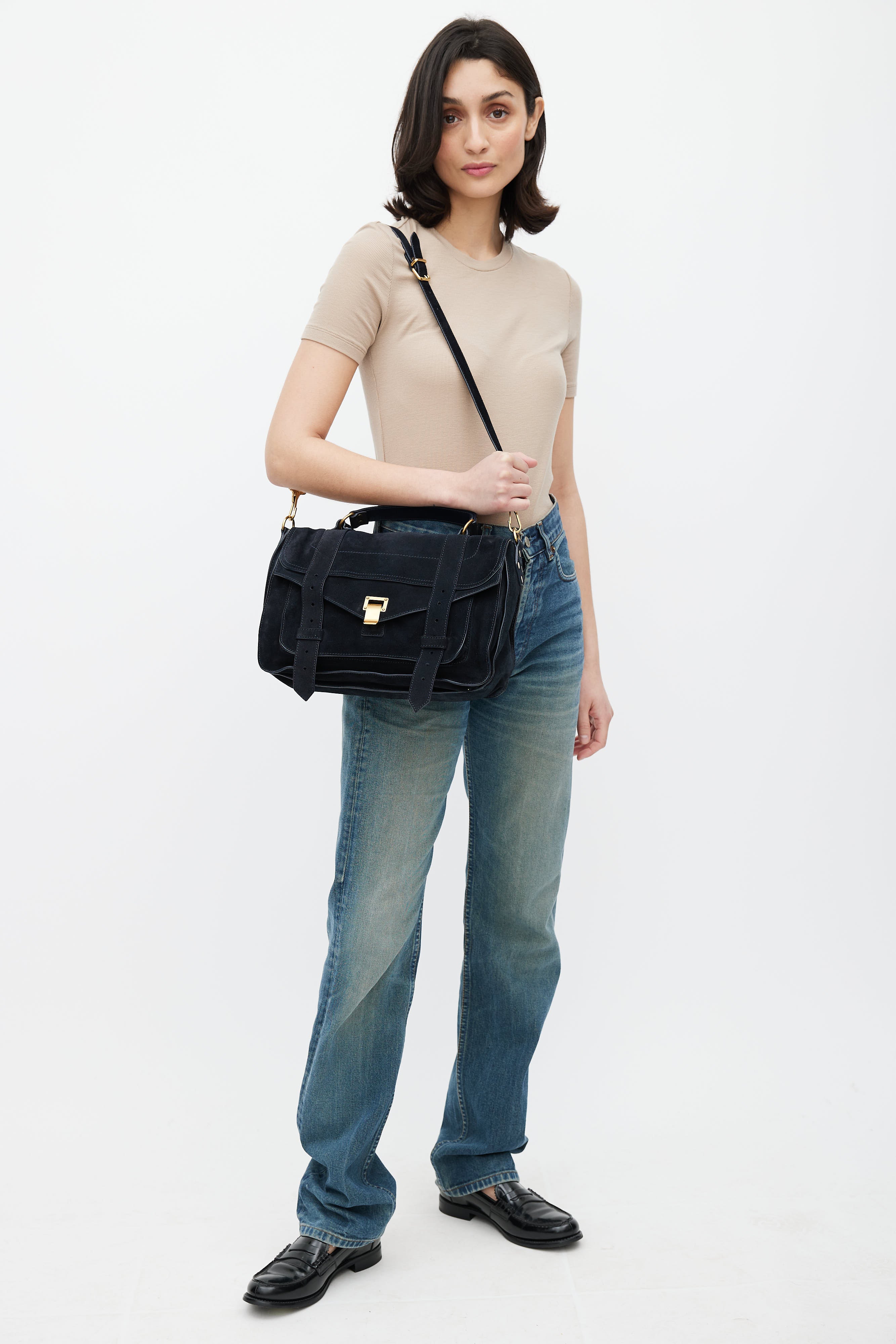 Pre-owned Proenza Schouler navy suede PS1 satchel bag featuring gold tone clasp closure, flat top handle, adjustable shoulder strap, one exterior zip pocket at back, one exterior zip and slip pocket under top flap, one main interior compartment with one zip pocket, and printed lining.