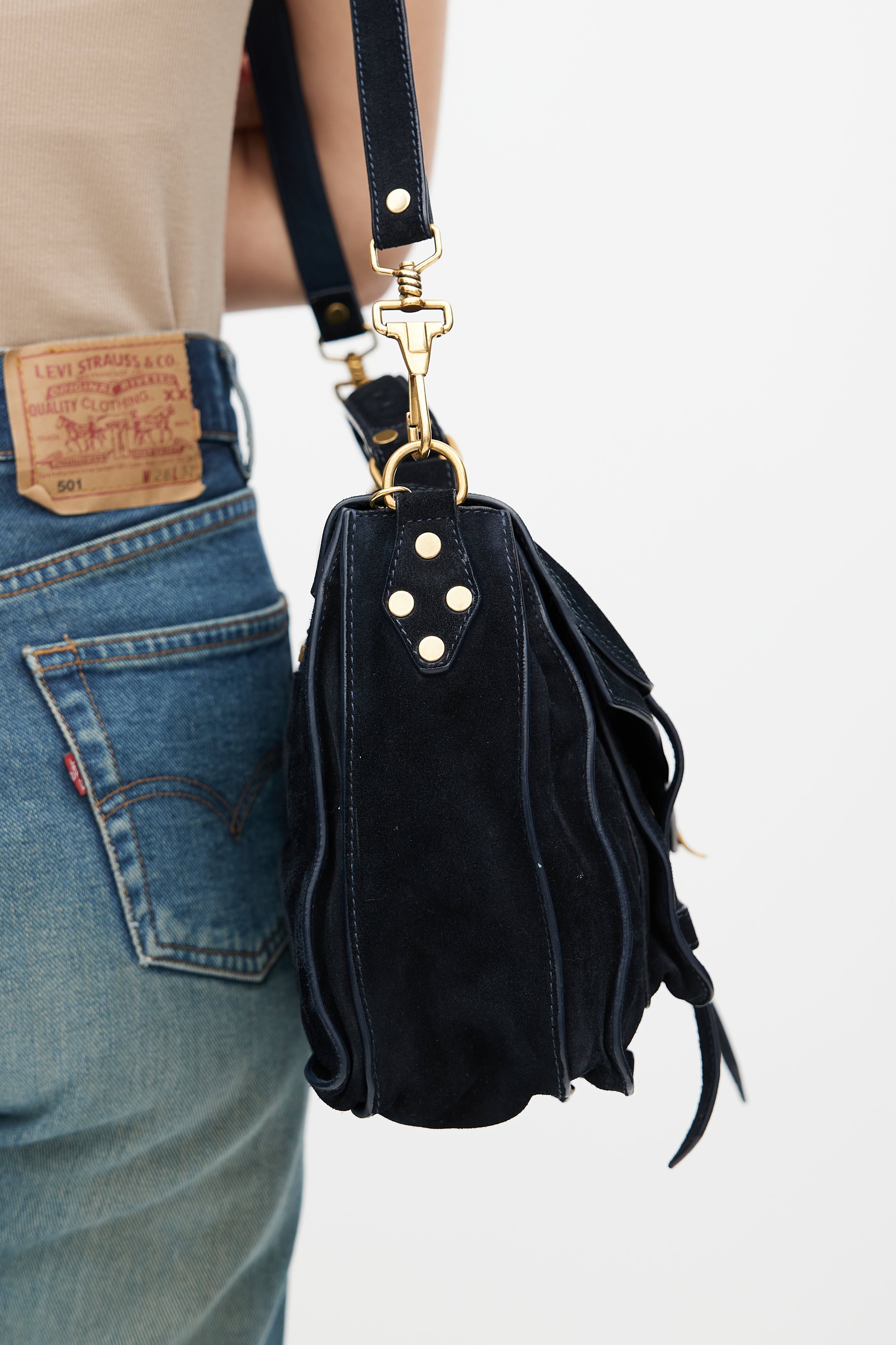 Minor hairline scratches and minor tarnishing at hardware. General wear to suede.