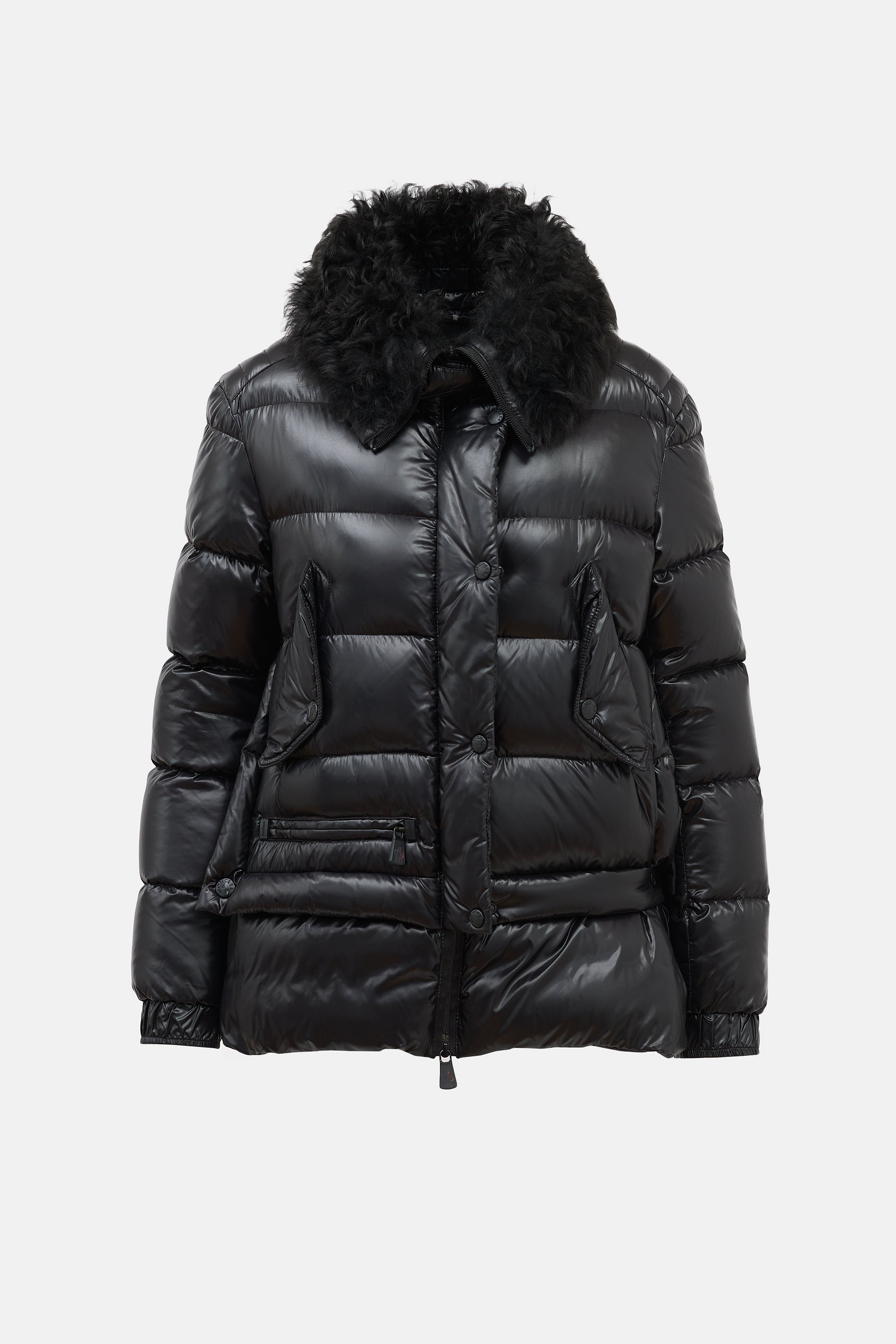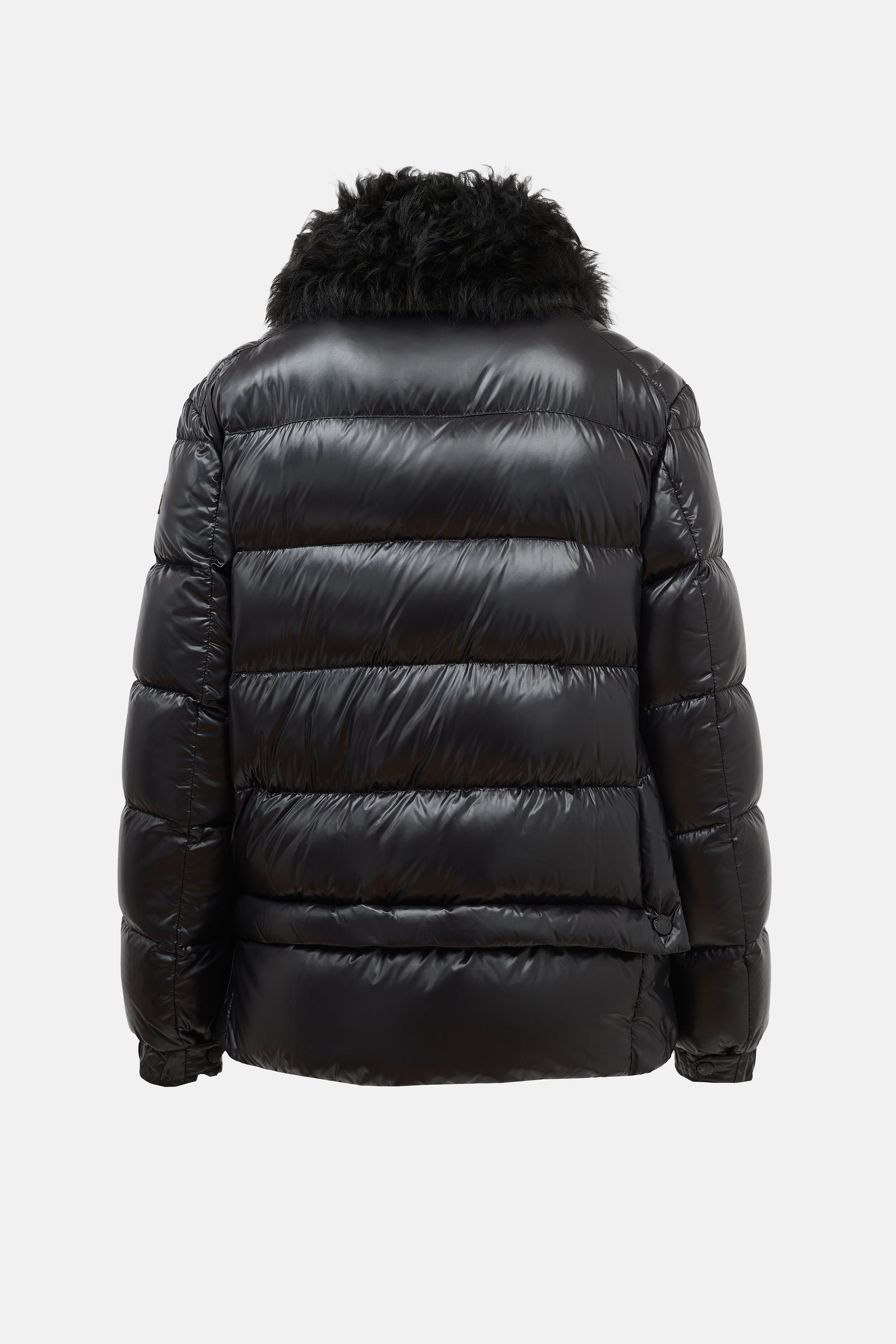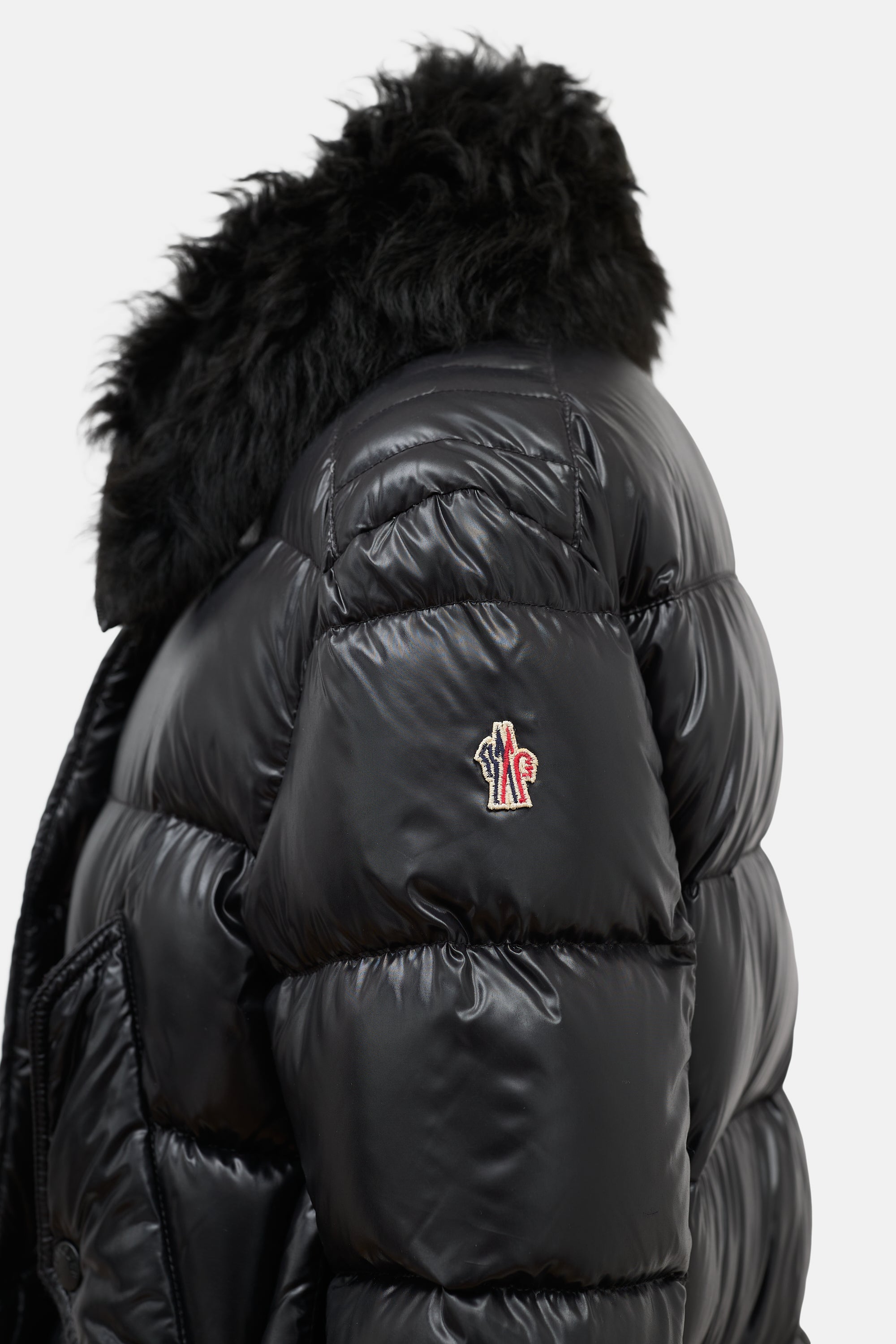 Pre-owned Moncler black down Saint Bermard puffer jacket featuring a wide fur collar, front zip, multicolour logo patch at left sleeve, zip pockets, and drawstring hem.