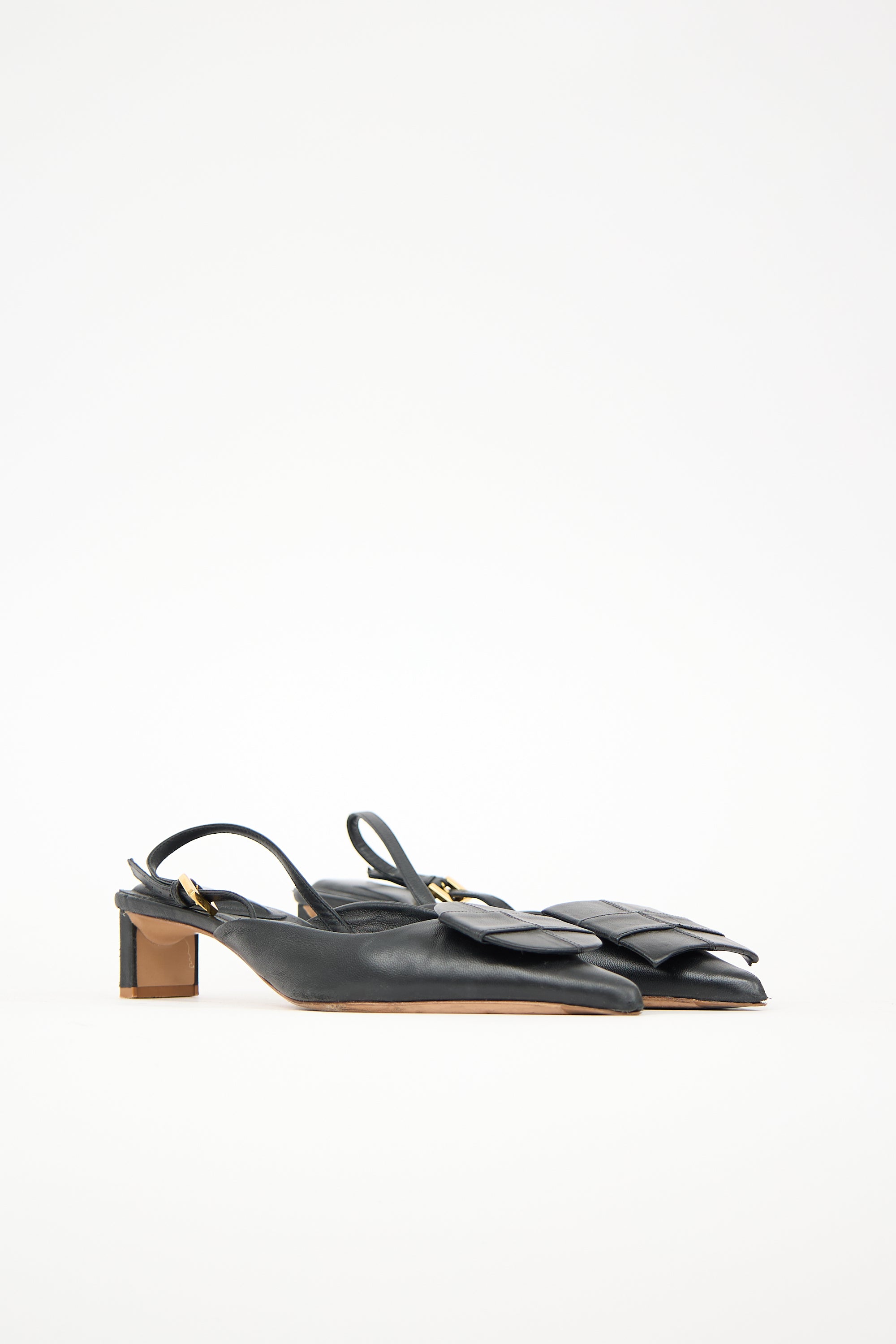Pre-owned Jacquemus black leather Duelo pumps featuring pointed toe, mismatched geometric applique at vamp, adjustable slingback strap, and covered flat kitten heel.
