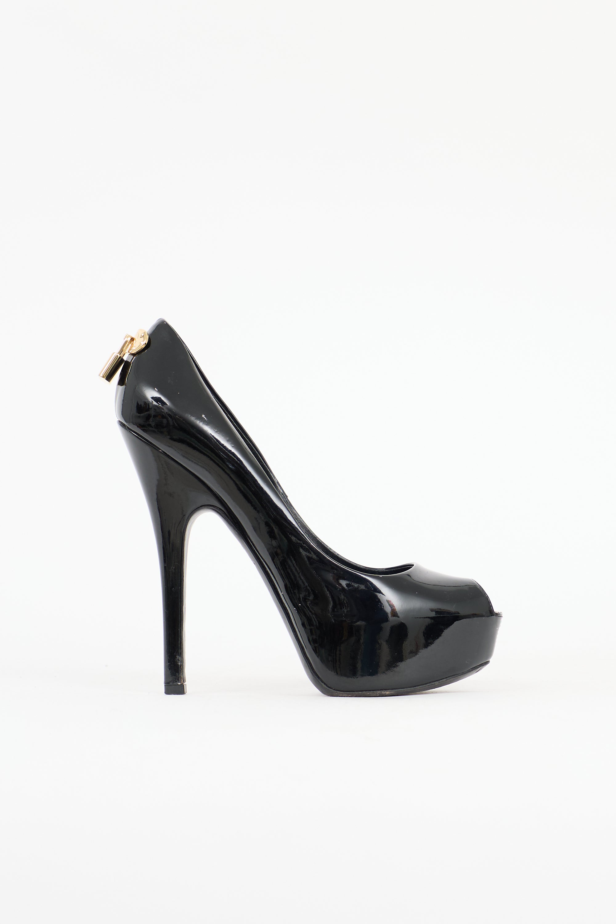 Pre-owned Louis Vuitton black leather Oh Really! pumps featuring an almond peep toe, slip on entry, gold tone monogram debossed padlock at counter, and a covered platform and stiletto heel.