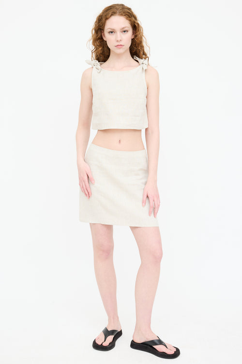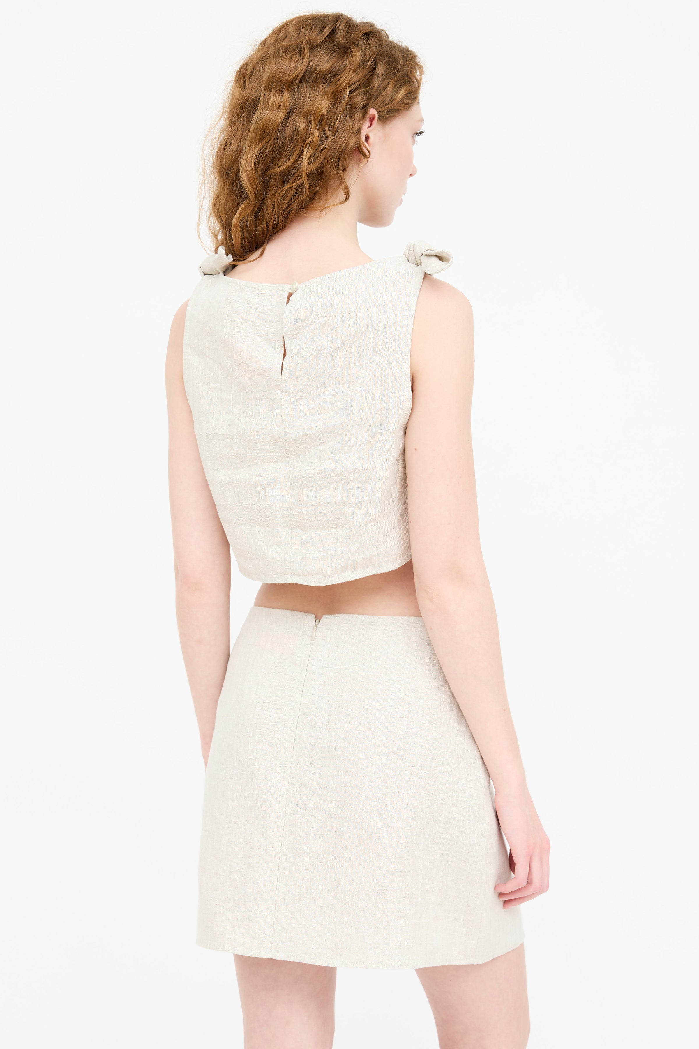 Pre-owned Reformation beige linen top featuring a round neckline with tie detail at shoulders, darted bust, cropped fit, and button closure at back. Matching skirt features minimal styling, and zip closure at side.