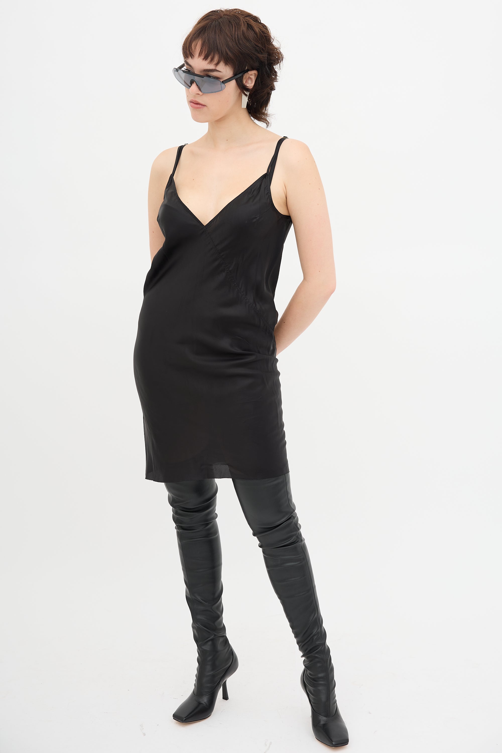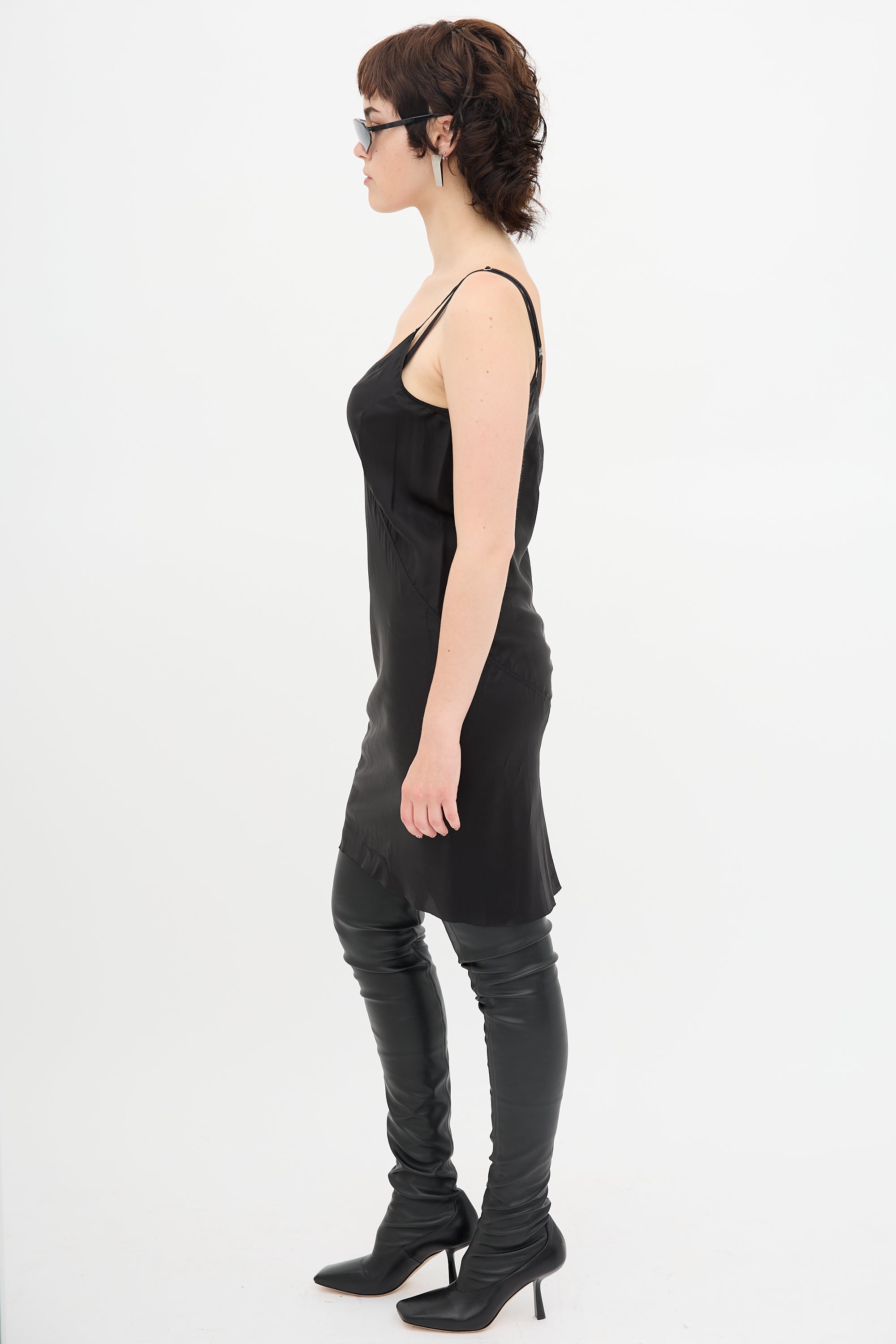 Pre-owned Rick Owens Spring 2021 black slip dress featuring V-neckline, spaghetti straps, and raw hem.