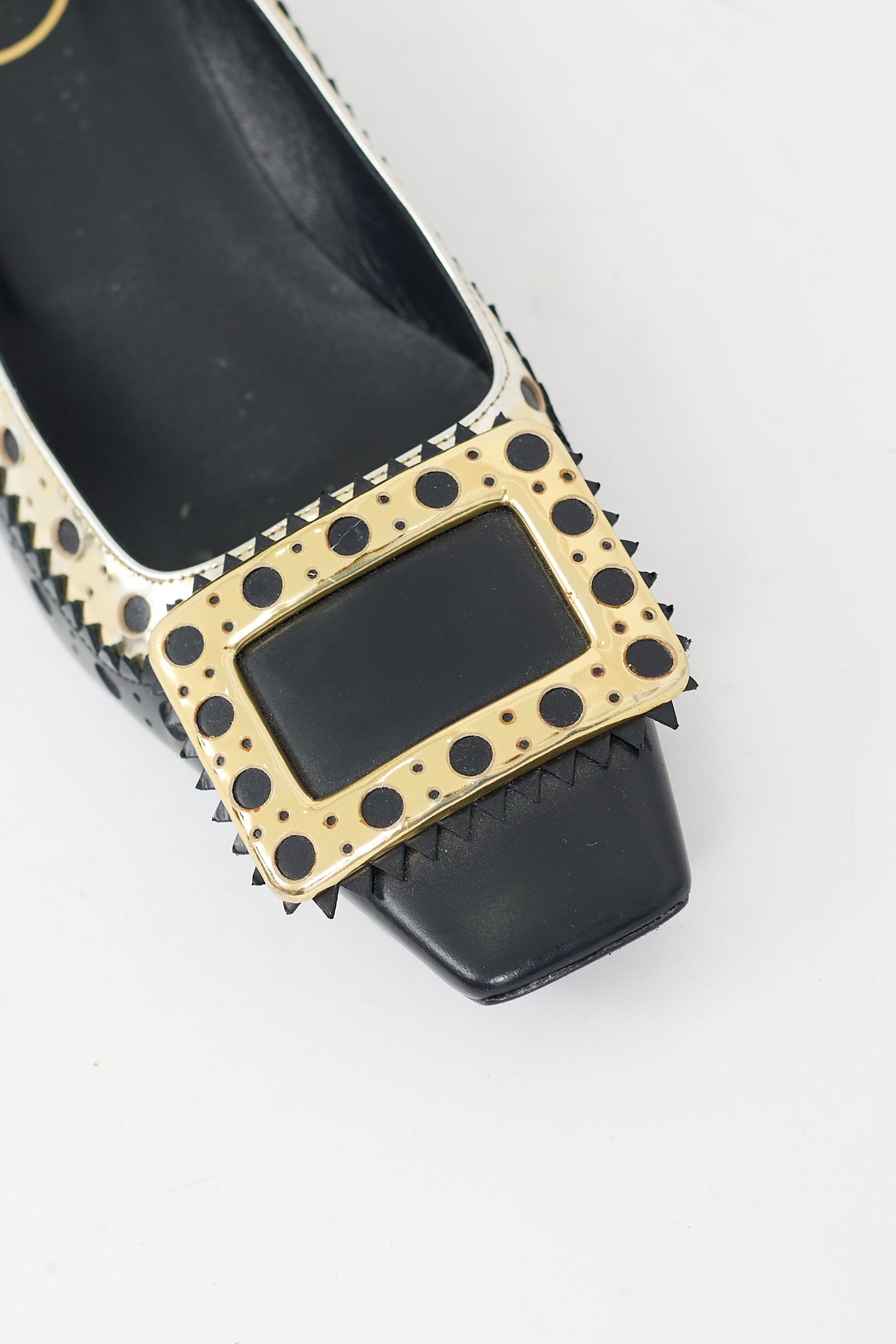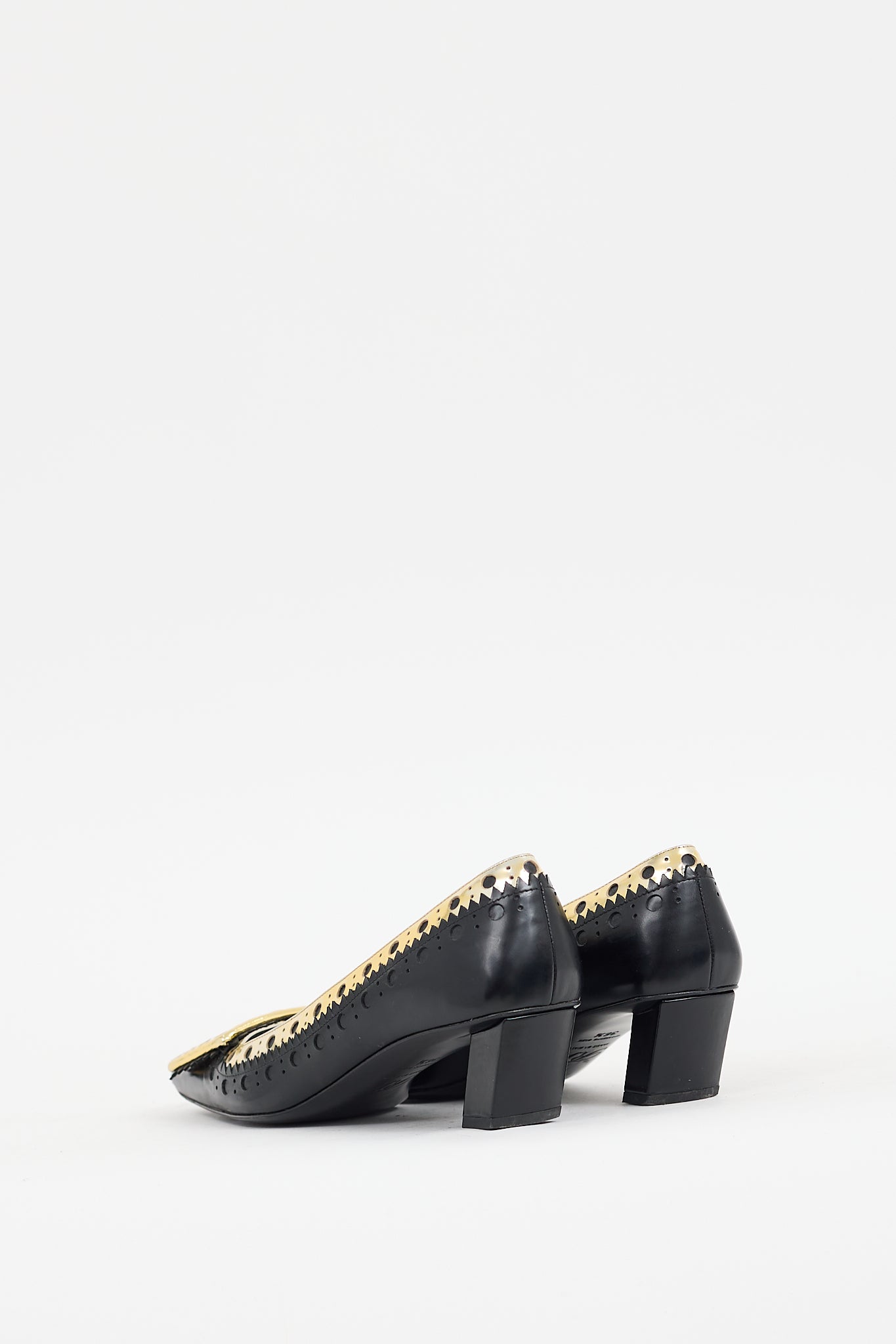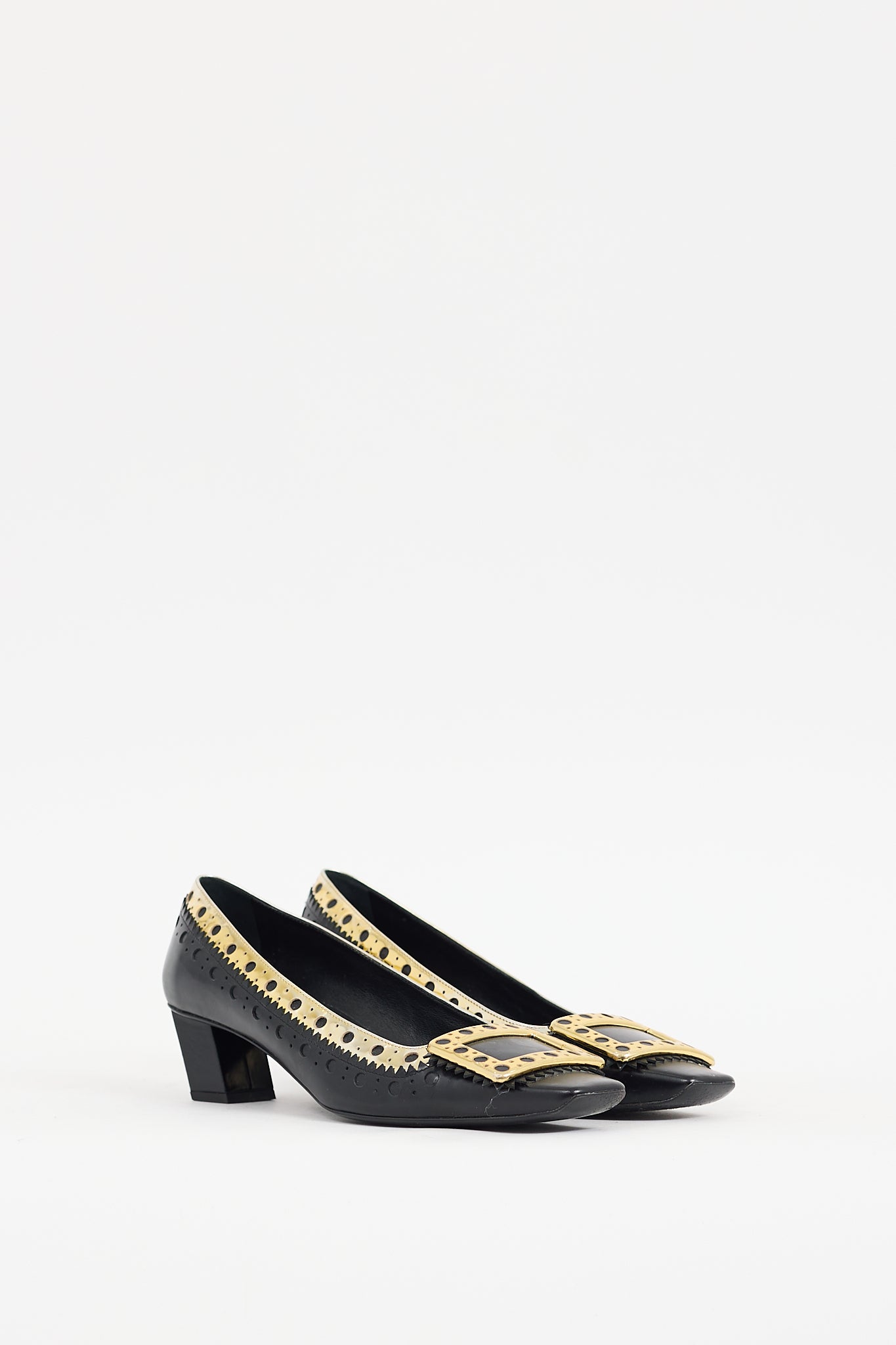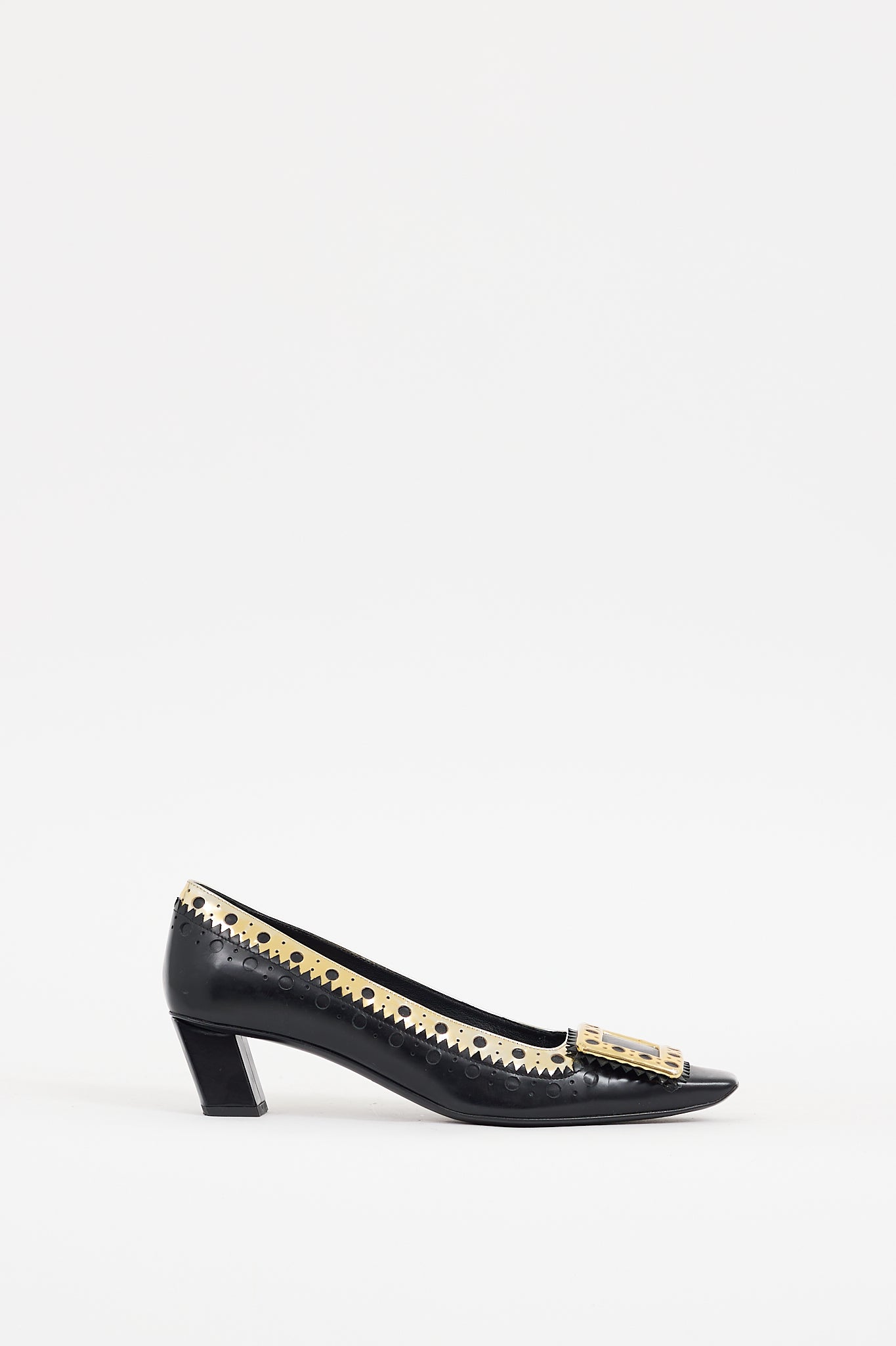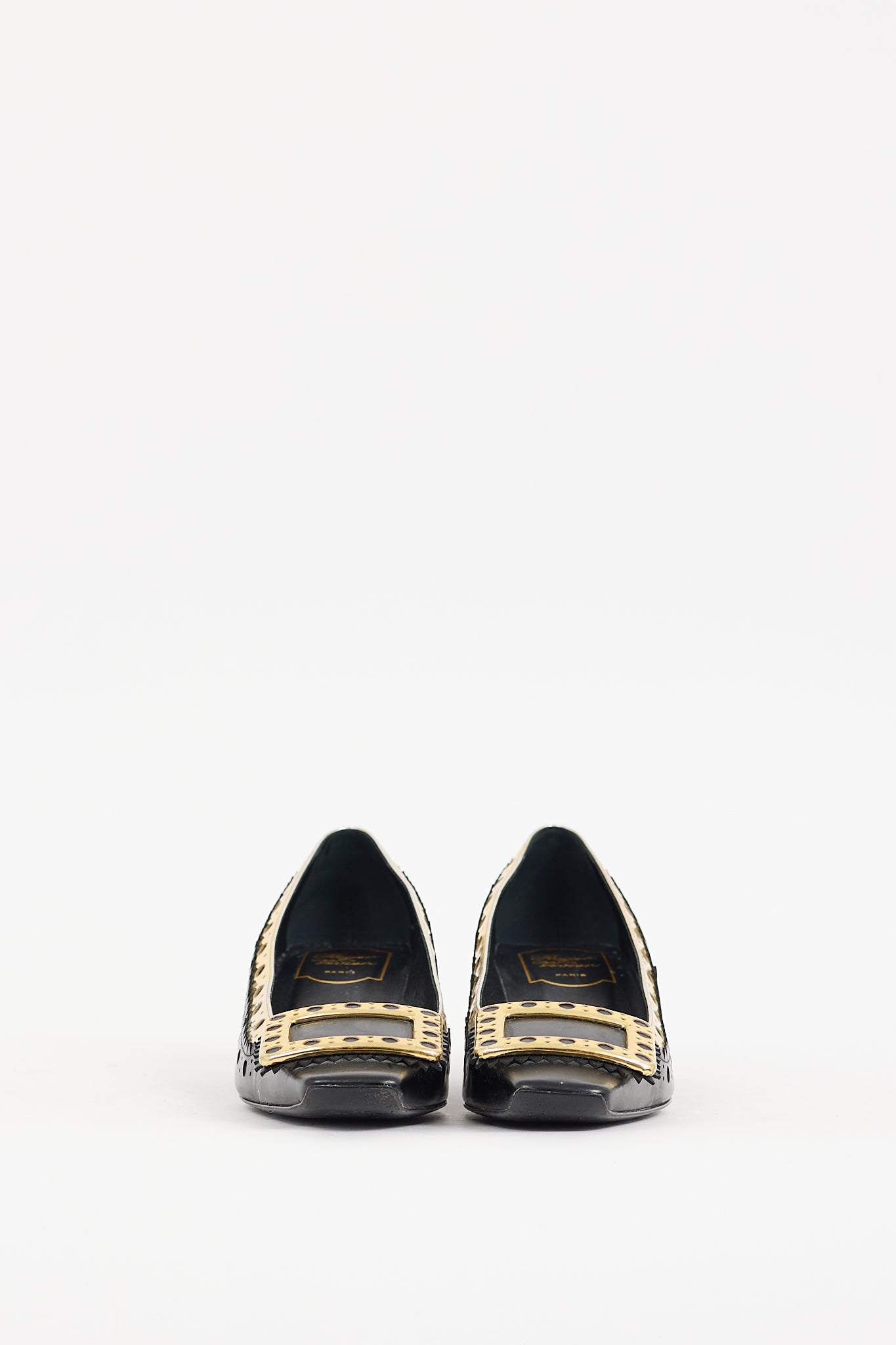 Pre-owned Roger Vivier black and gold Belle Vivier pumps featuring elongated square toe, gold tone buckle at toe with dot detail, laser cut dot detailing throughout, slip on entry, and covered block heel.