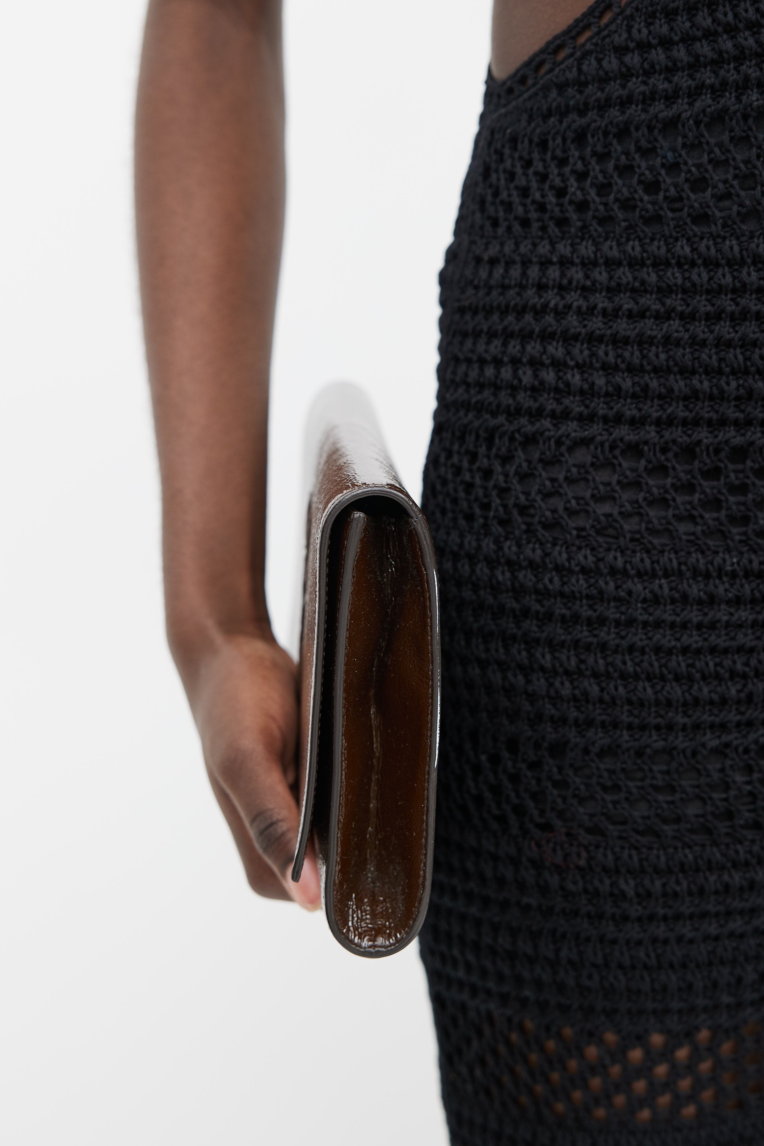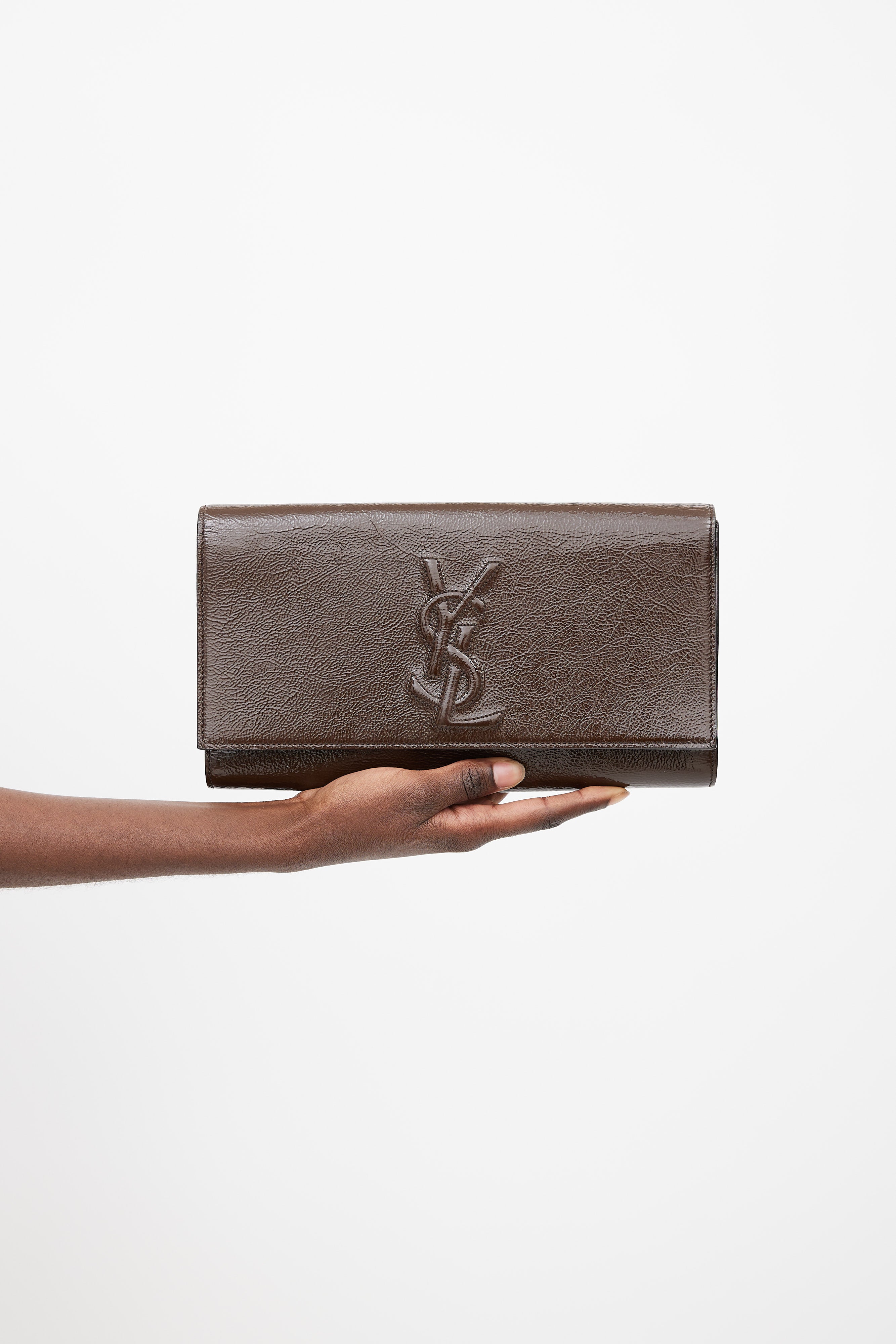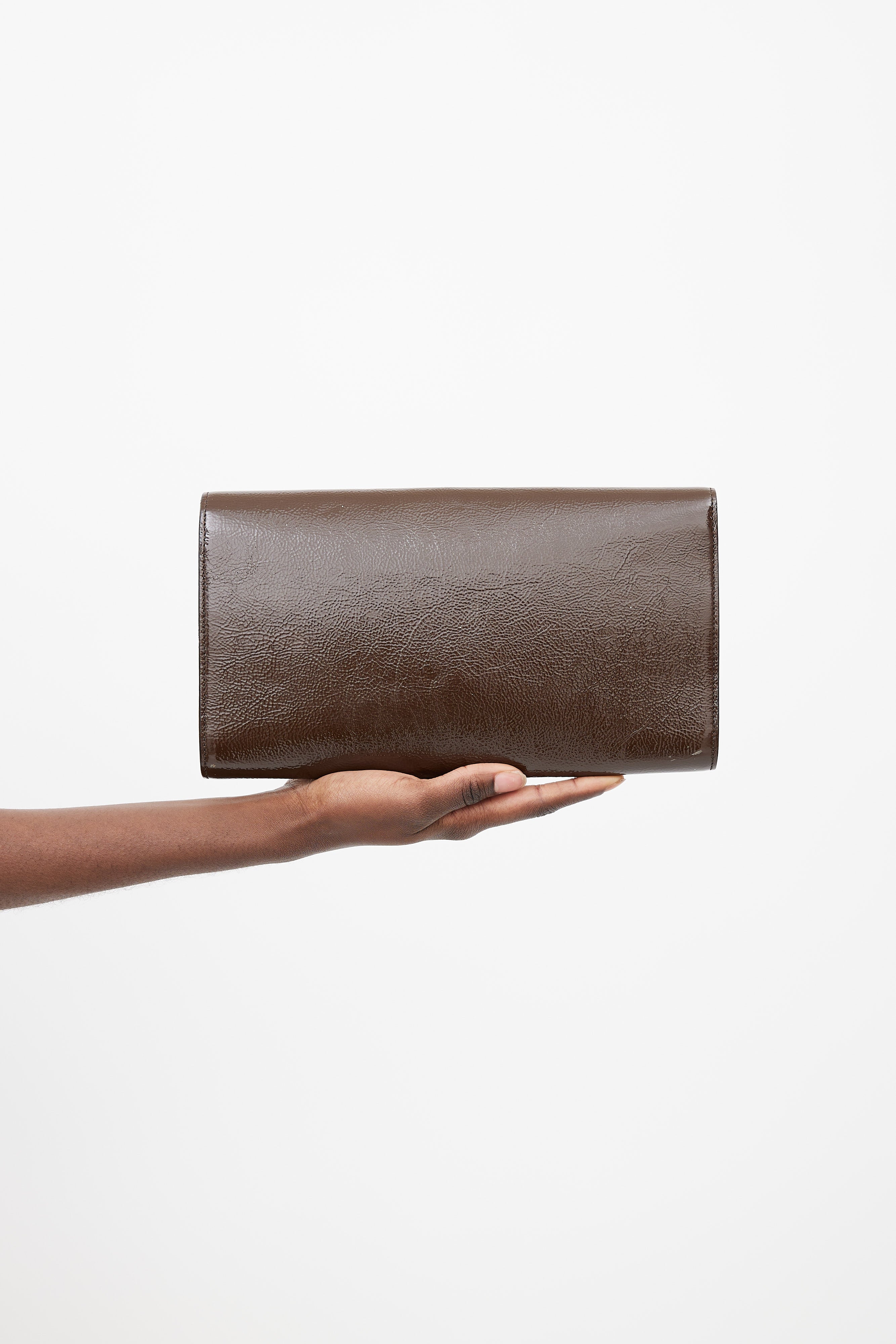 Pre-owned Saint Laurent brown Belle De Jour patent clutch featuring a top flap with tonal Cassandre logo, one main compartment with one slip pocket, and a magnetic closure. Comes with original dust bag.