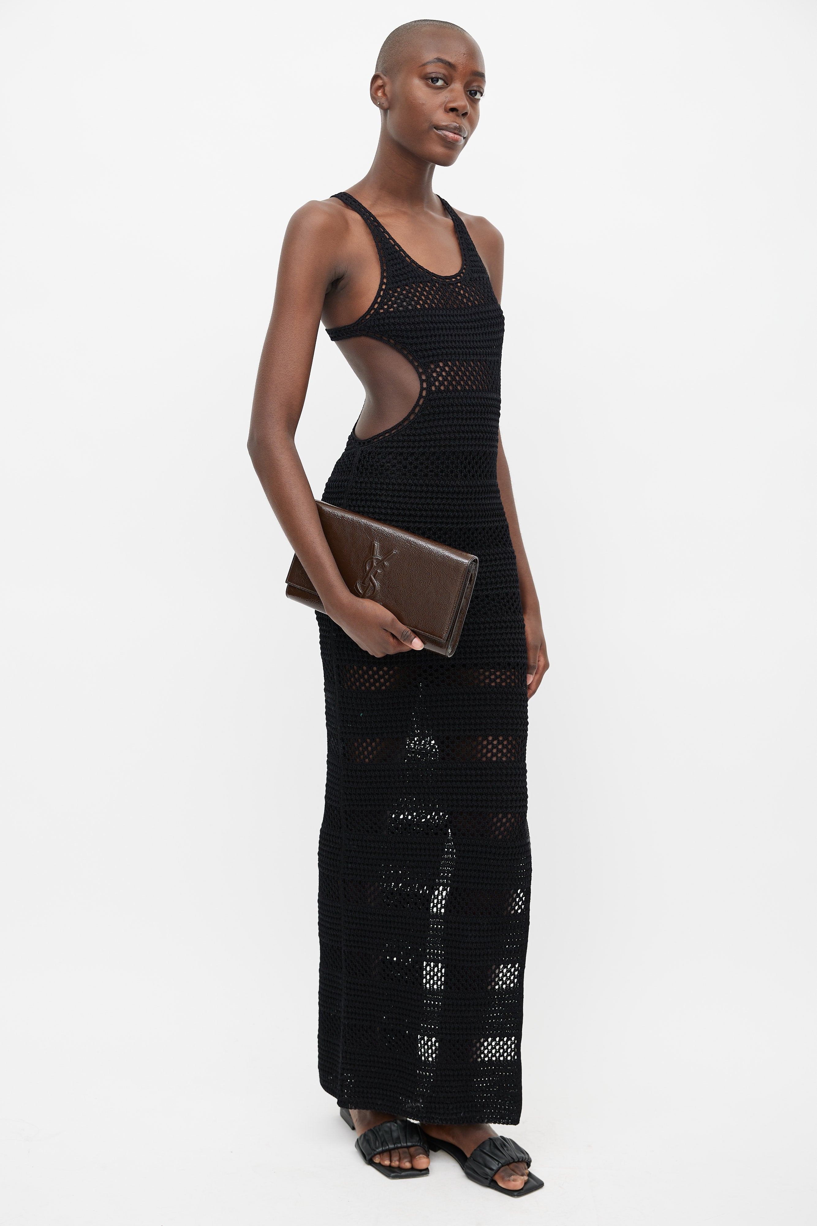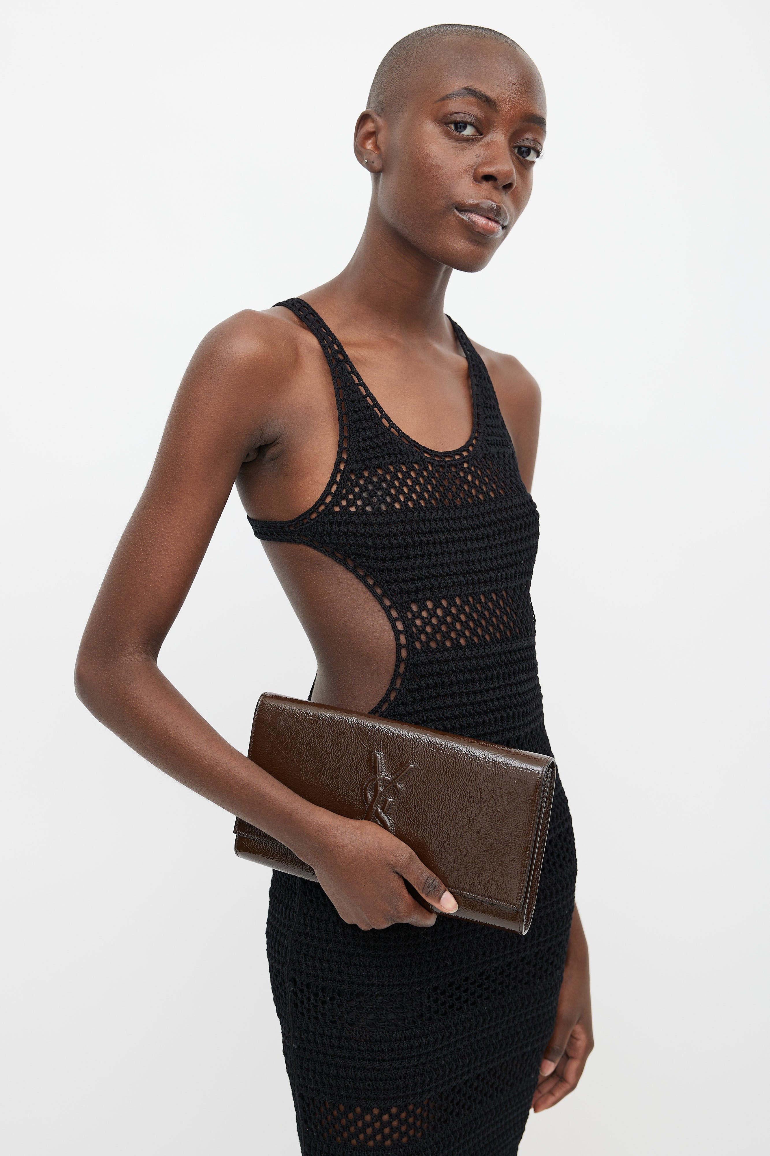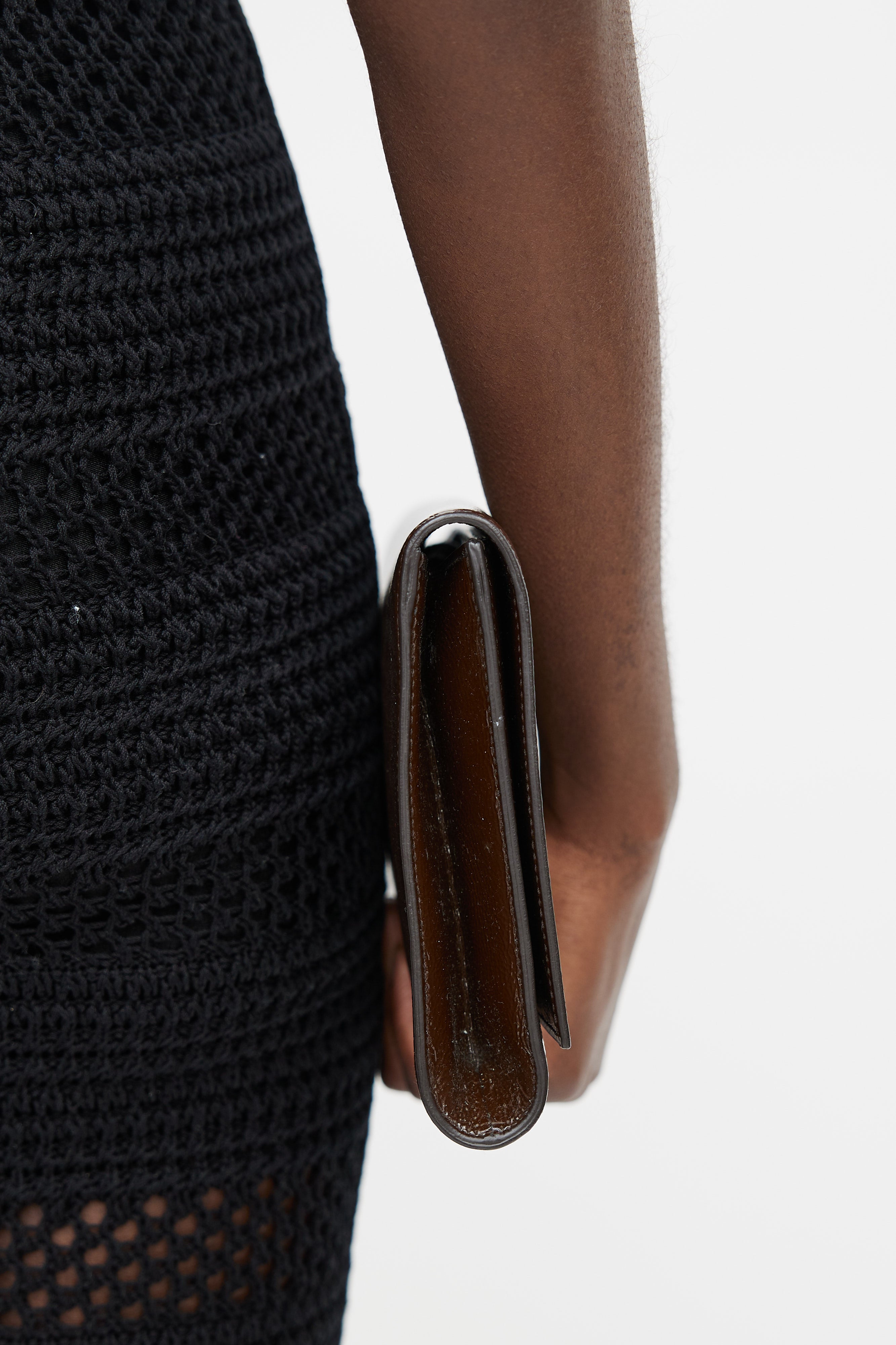 Pre-owned Saint Laurent brown Belle De Jour patent clutch featuring a top flap with tonal Cassandre logo, one main compartment with one slip pocket, and a magnetic closure. Comes with original dust bag.