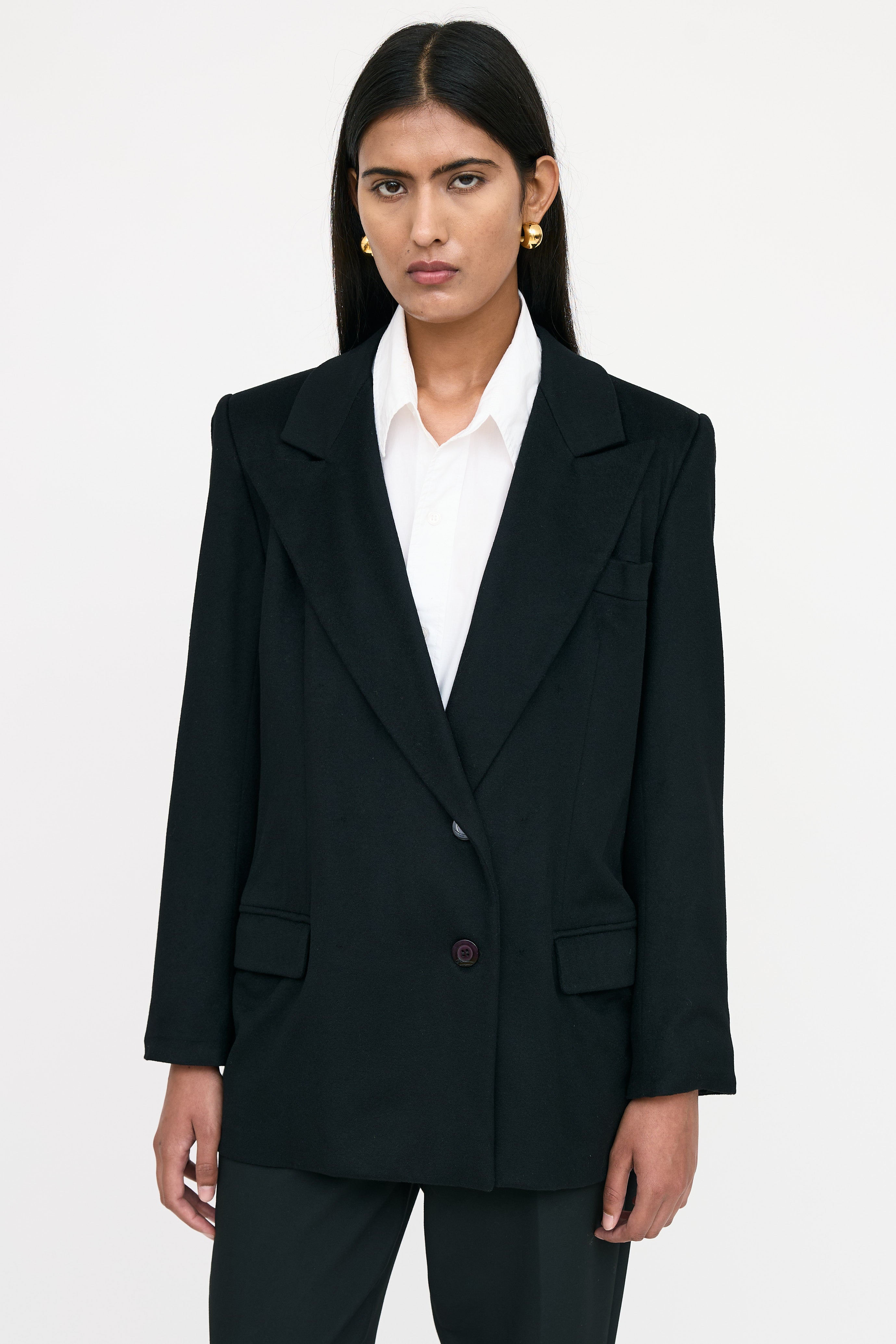 Pre-owned Saint Laurent black cashmere long sleeve blazer featuring peaked lapel collar, button front, welt pocket at chest, and flap pockets at front. Lined.