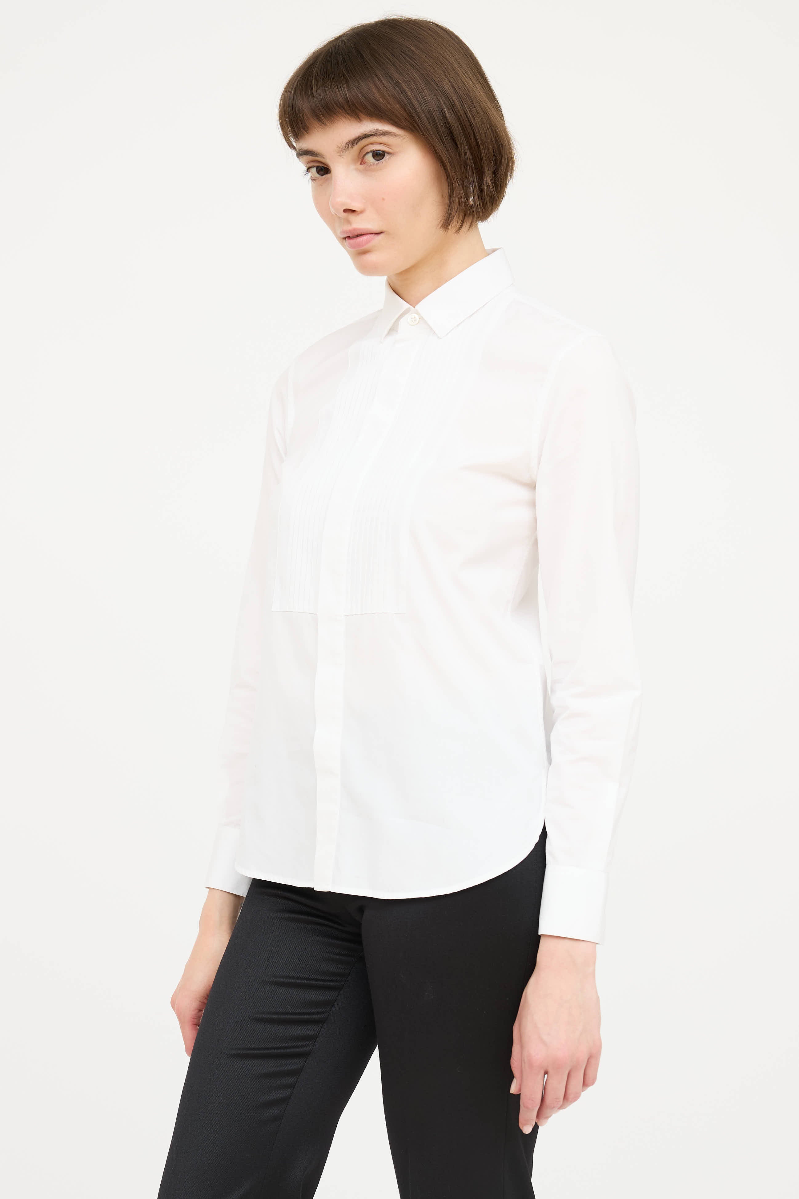 Pre-owned Saint Laurent white tuxedo shirt featuring a pointed collar, long sleeves with buttoned cuffs, pleated chest, and button up closure.
