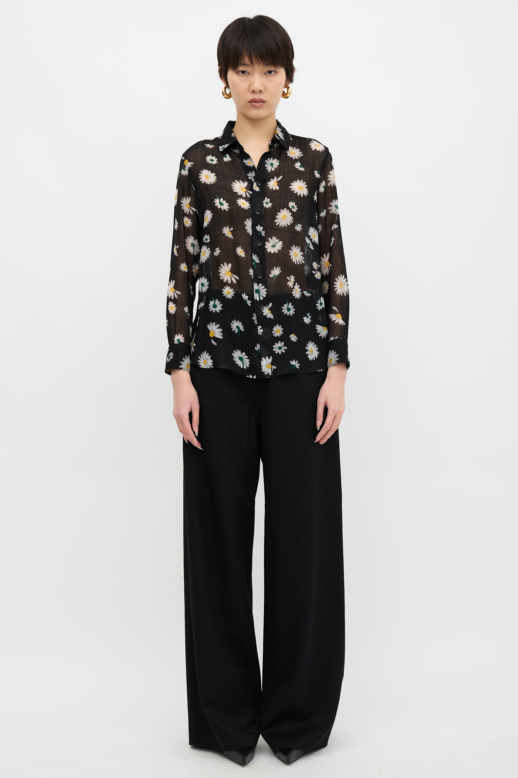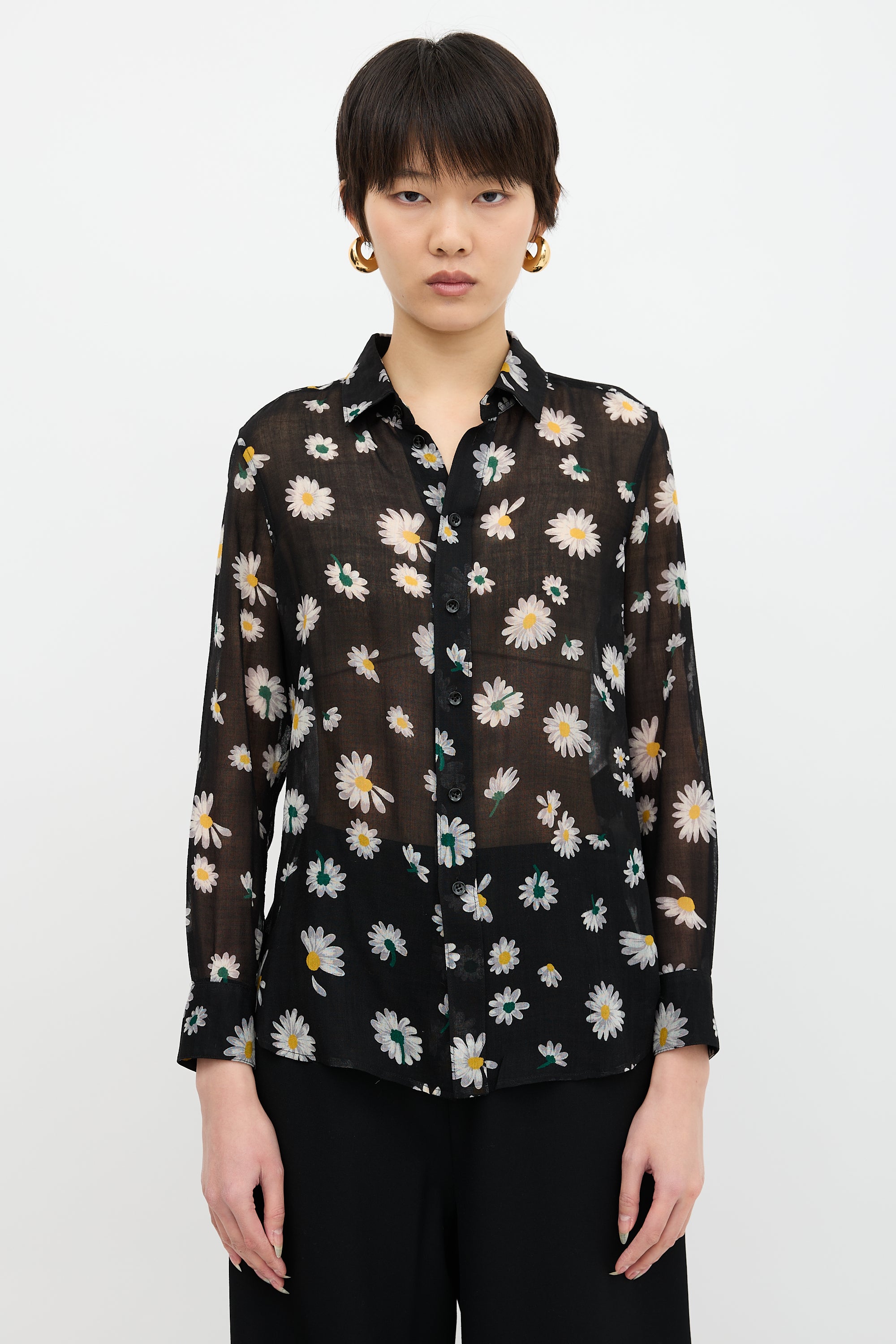 Pre-owned Saint Laurent black wool sheer shirt featuring a multicolour Daisy floral print, spread collar, and button front.