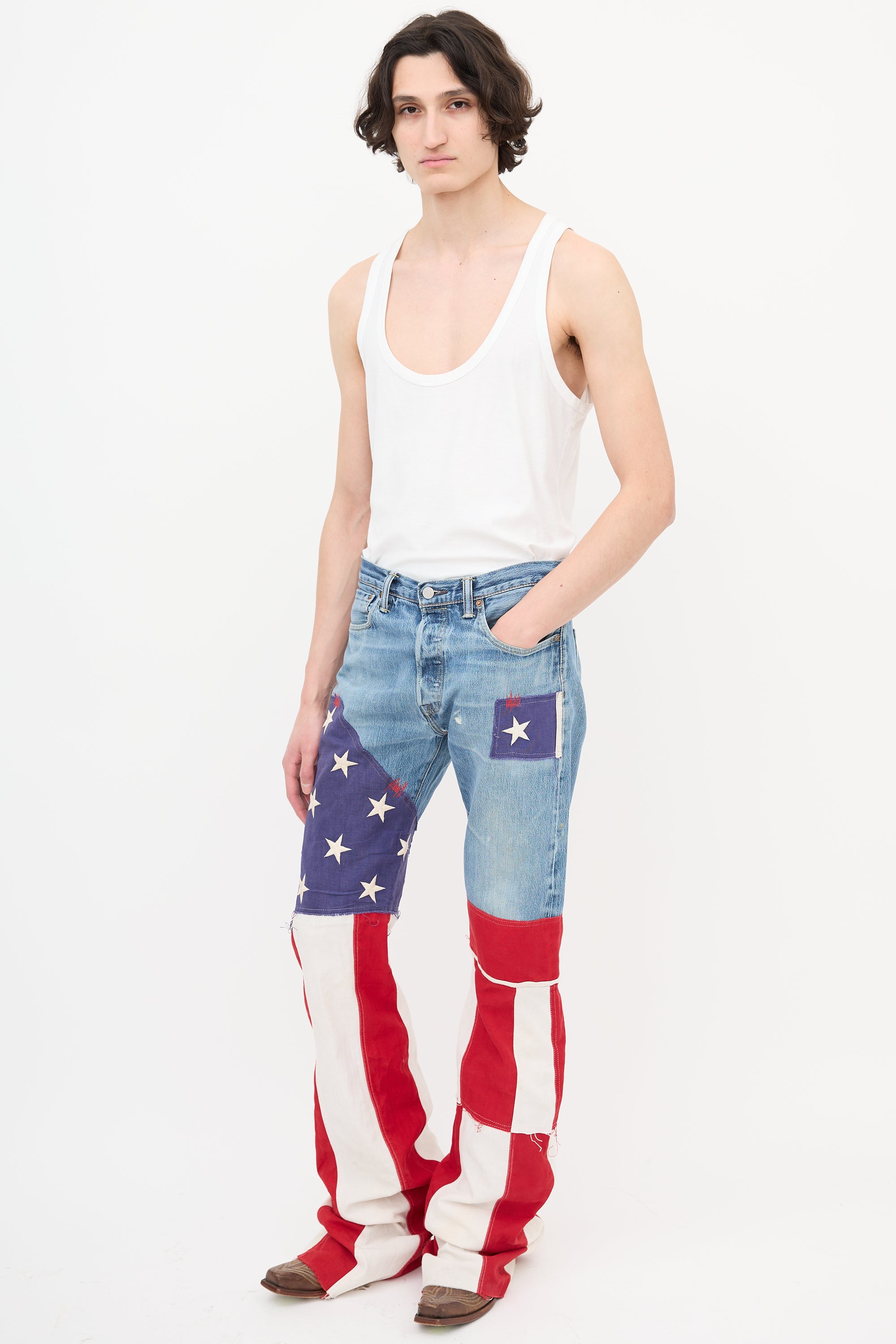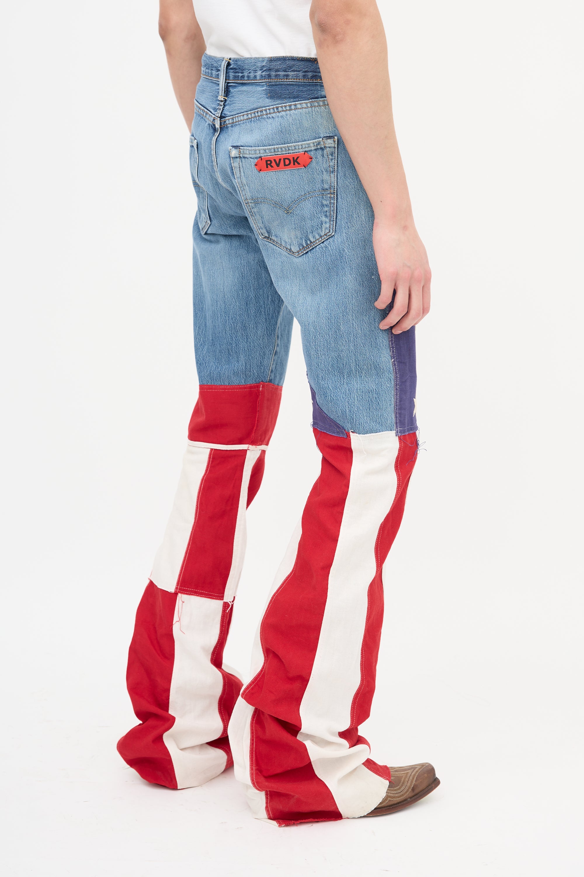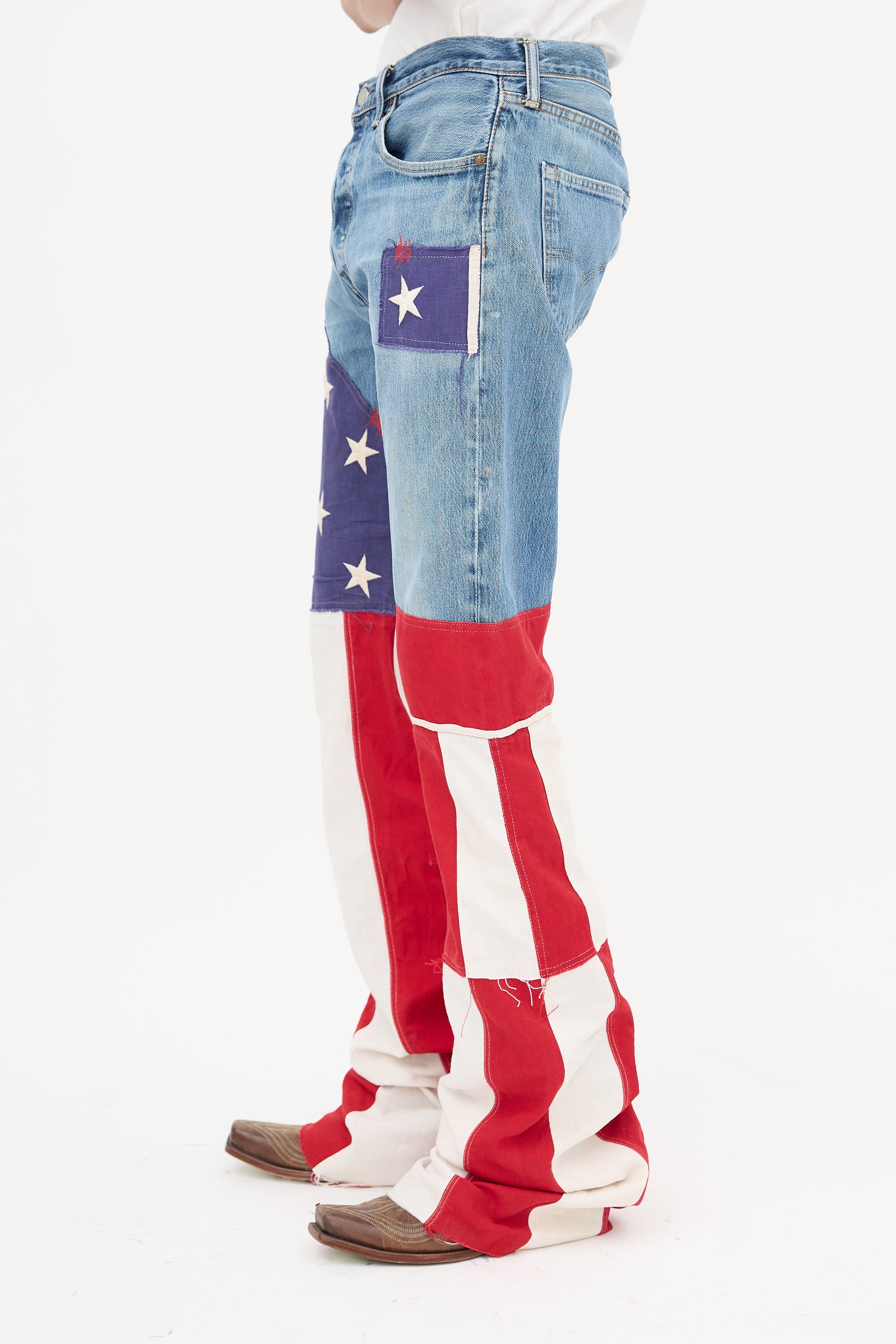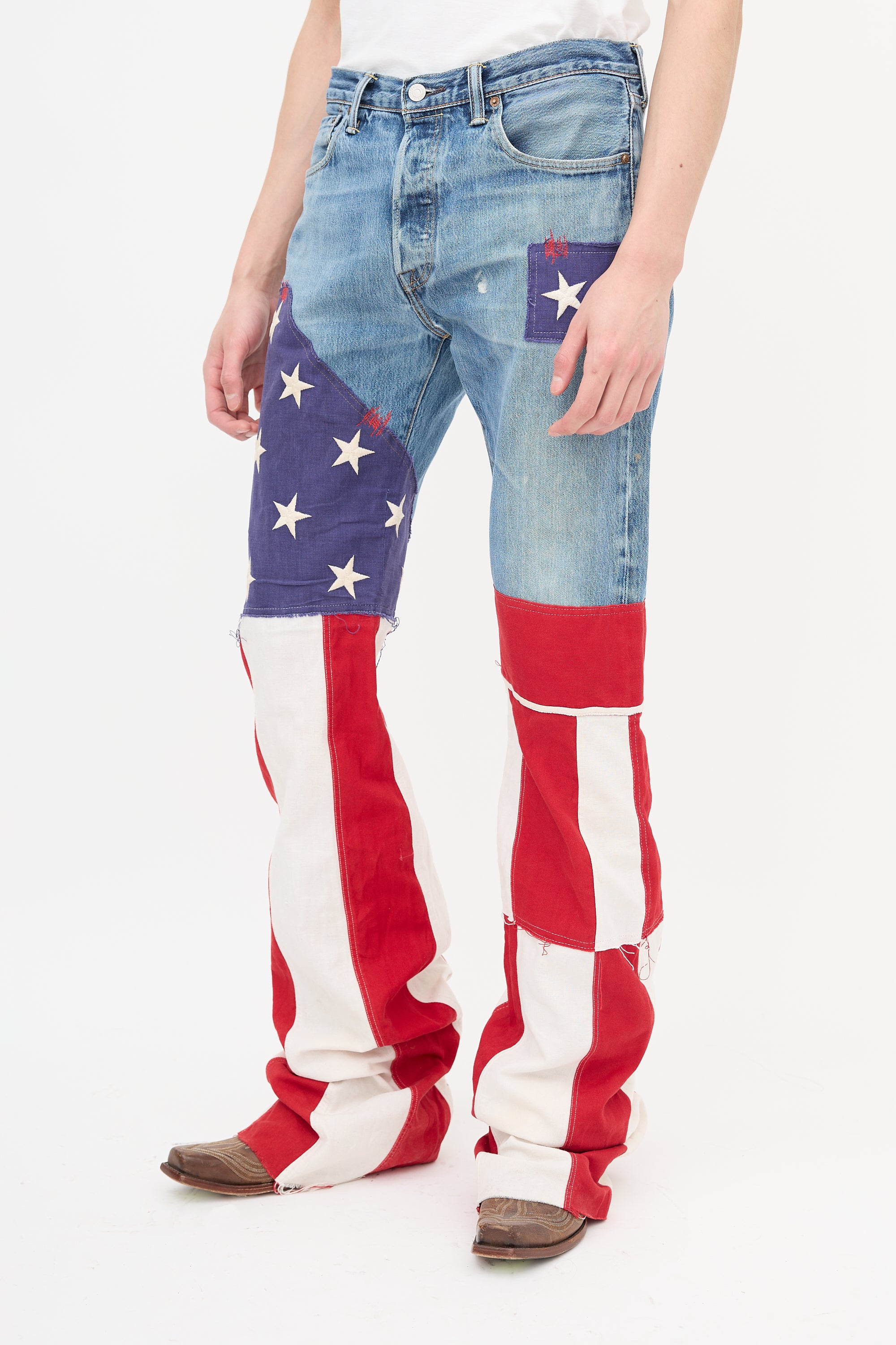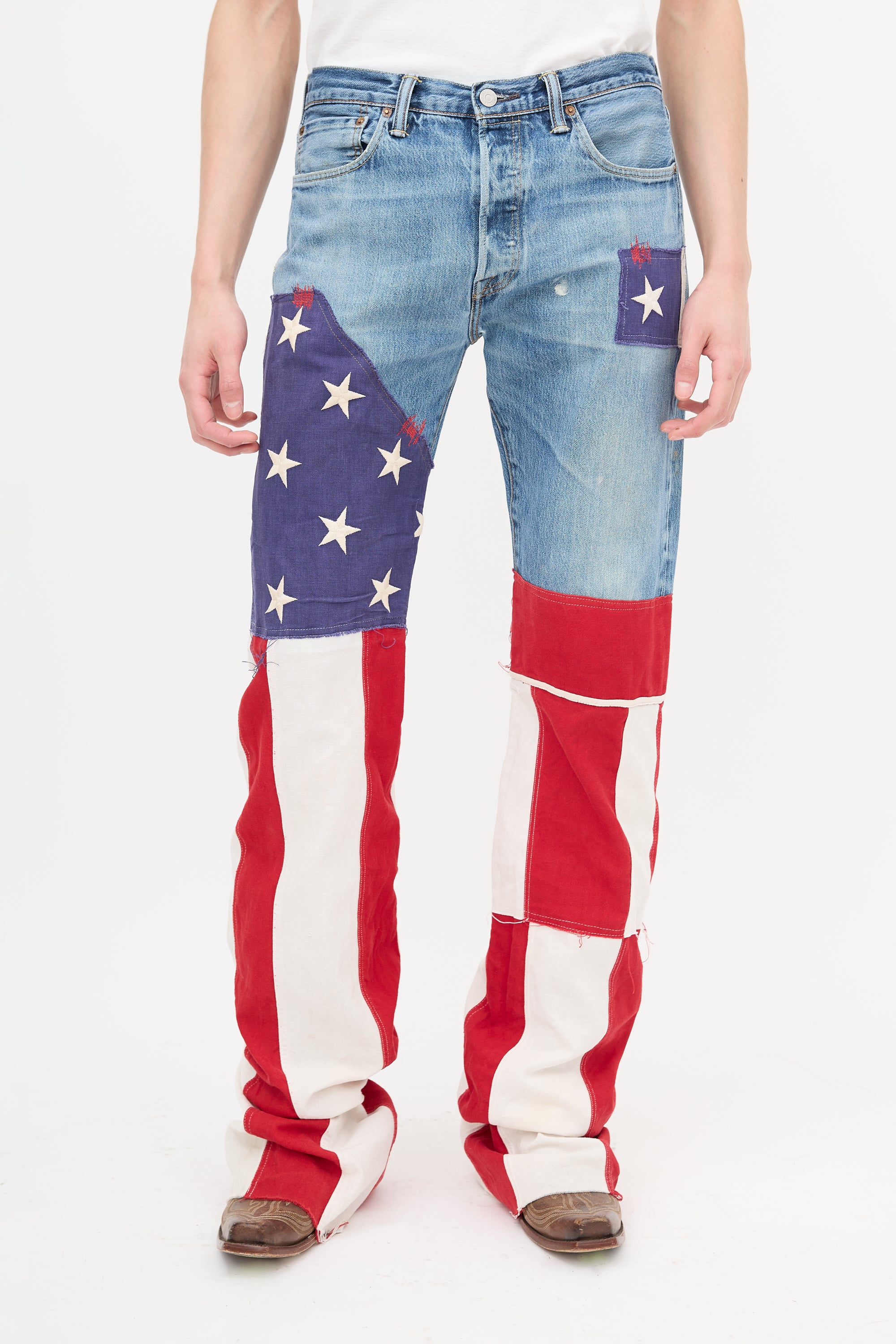Pre-owned Ronald Van Der Kemp x Levi's medium wash jeans featuring five pocket styling, button fly, belt loops, red logo patch at back pocket, intentional distressing throughout, and stars and stripes patterned panels at leg.