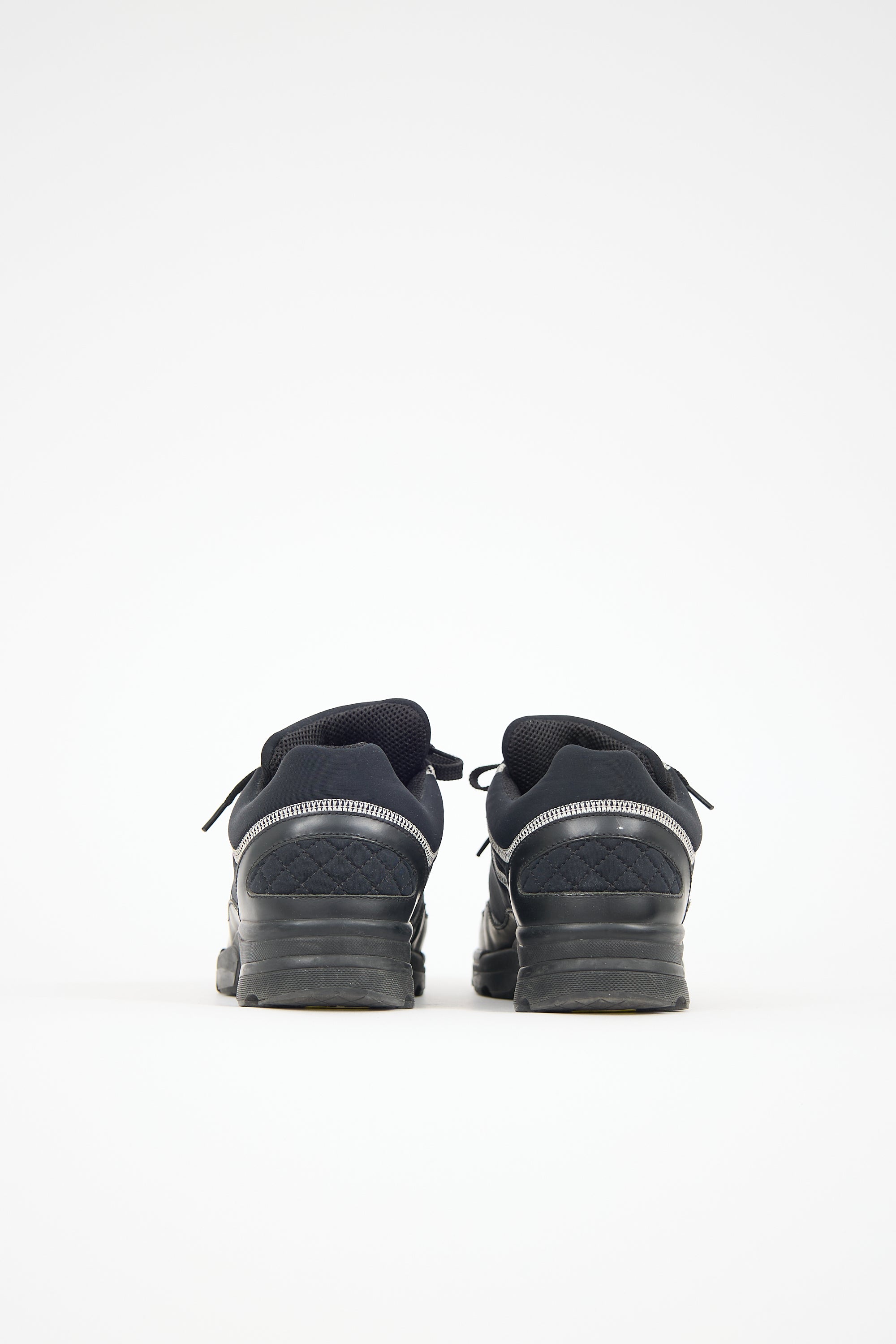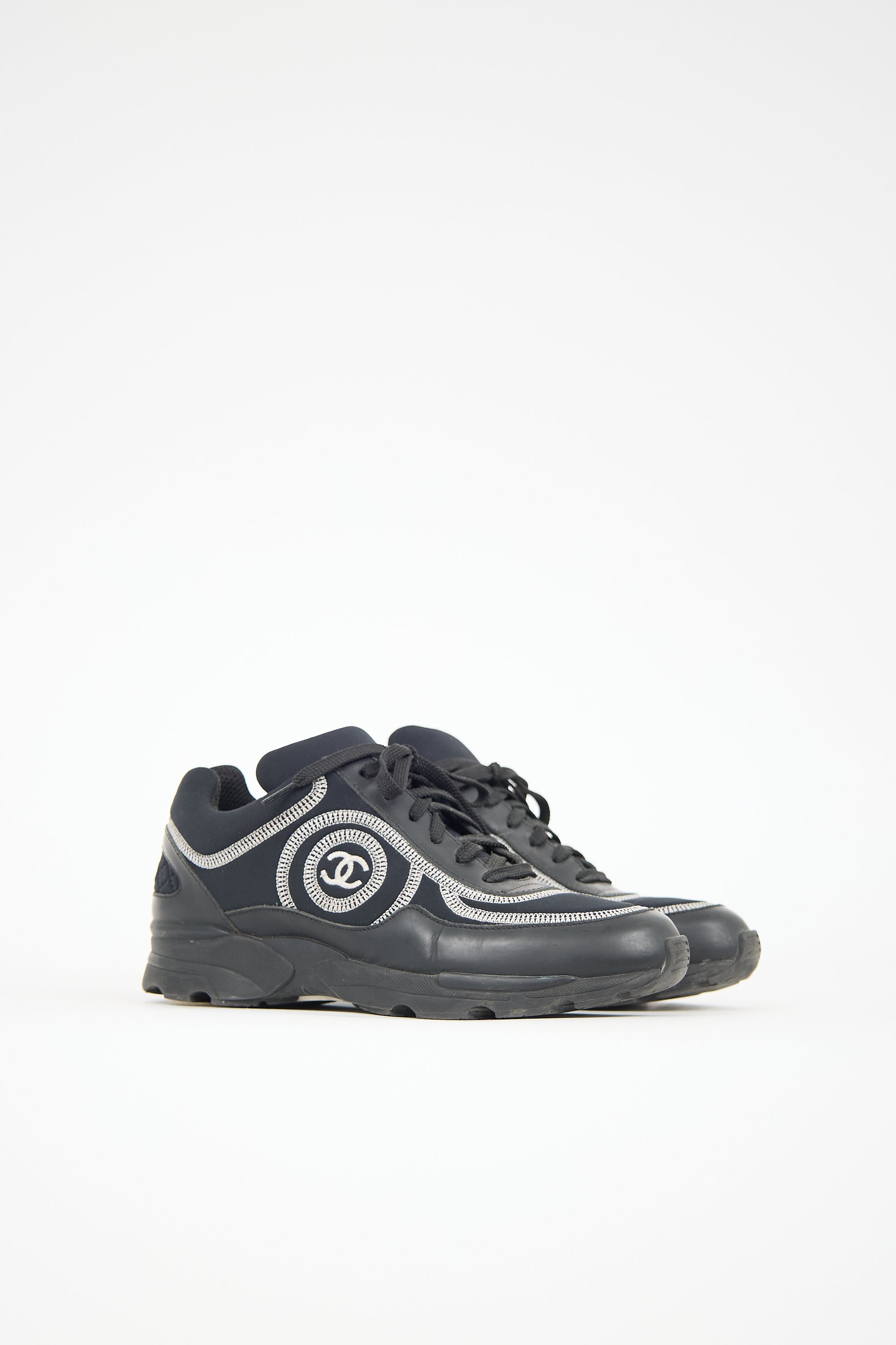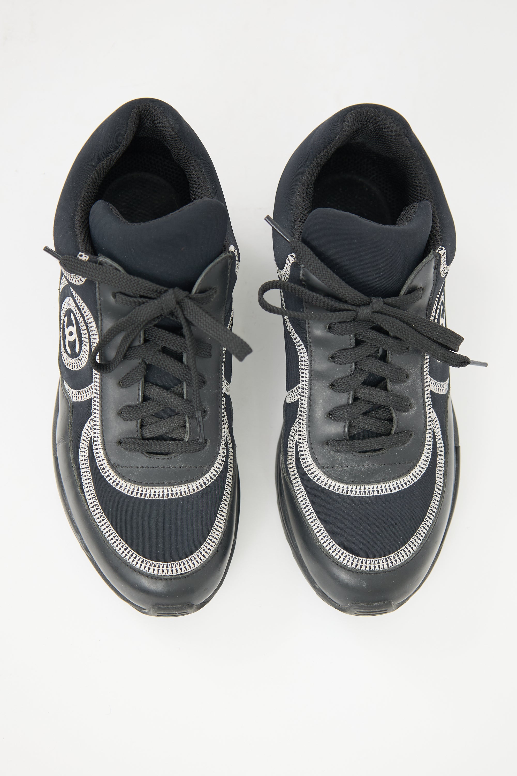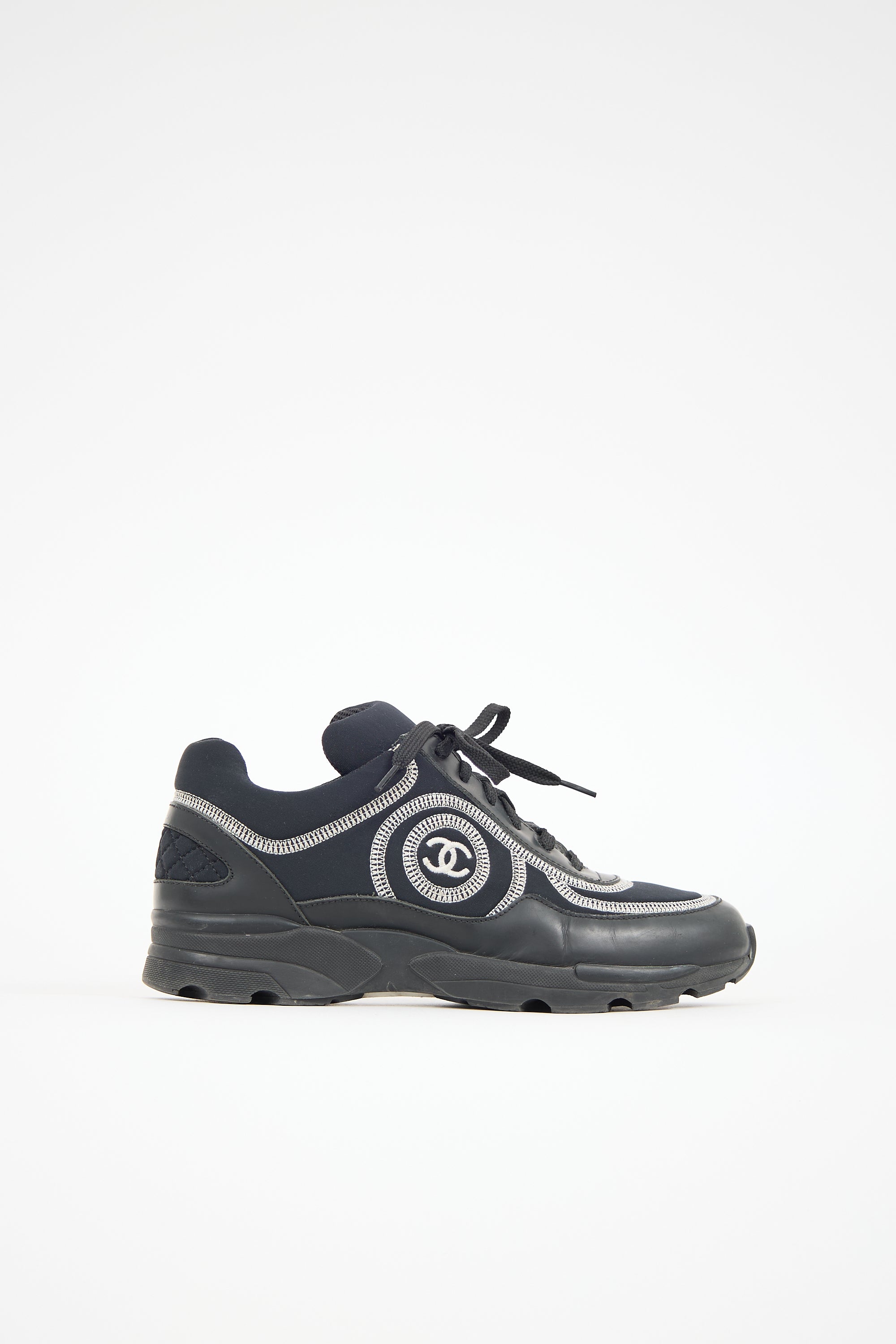 Pre-owned Chanel black leather and neoprene sneakers featuring a rounded toe, contrast stitching throughout, lace up front, stitched interlocking CC logo at side, and treaded rubber sole.