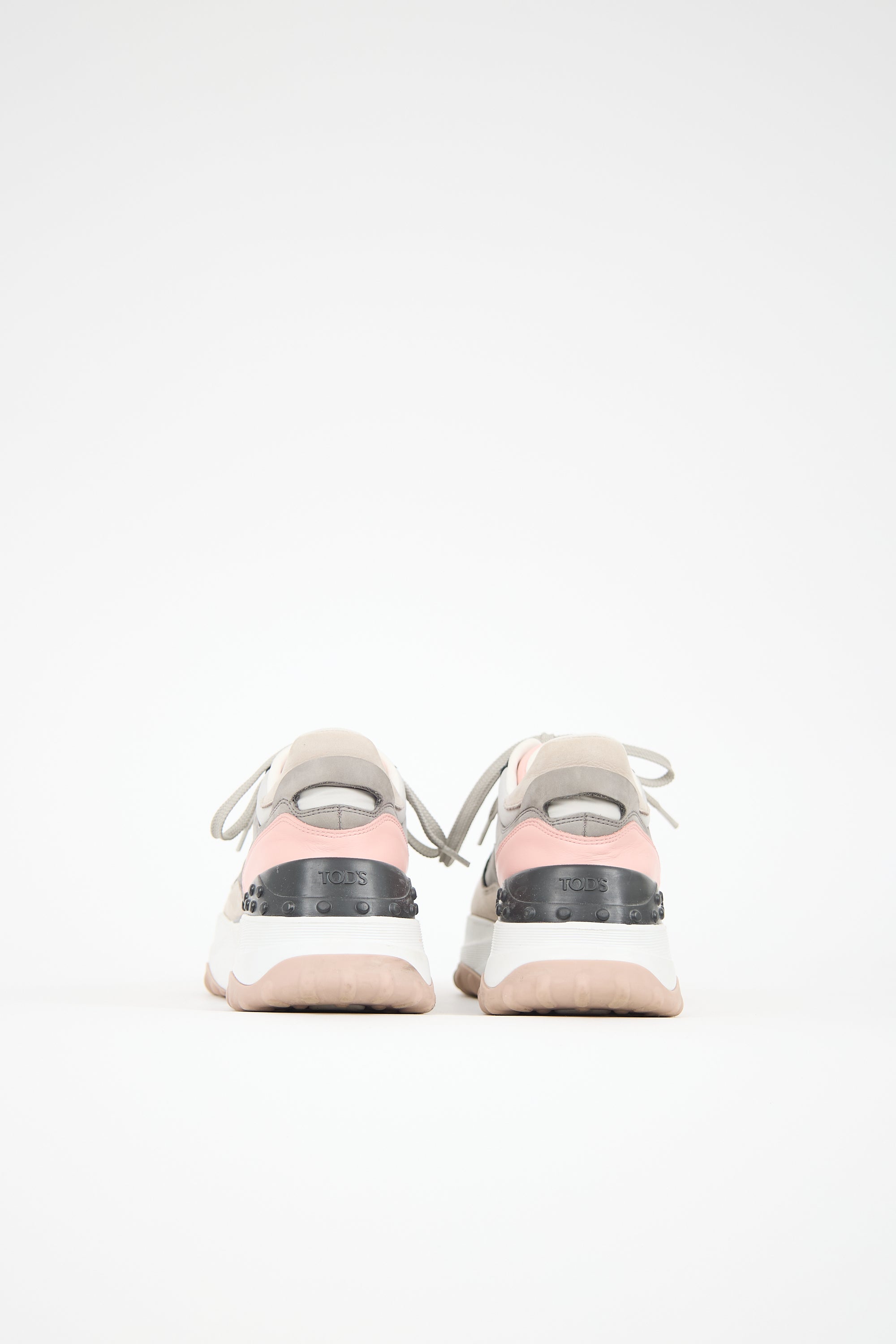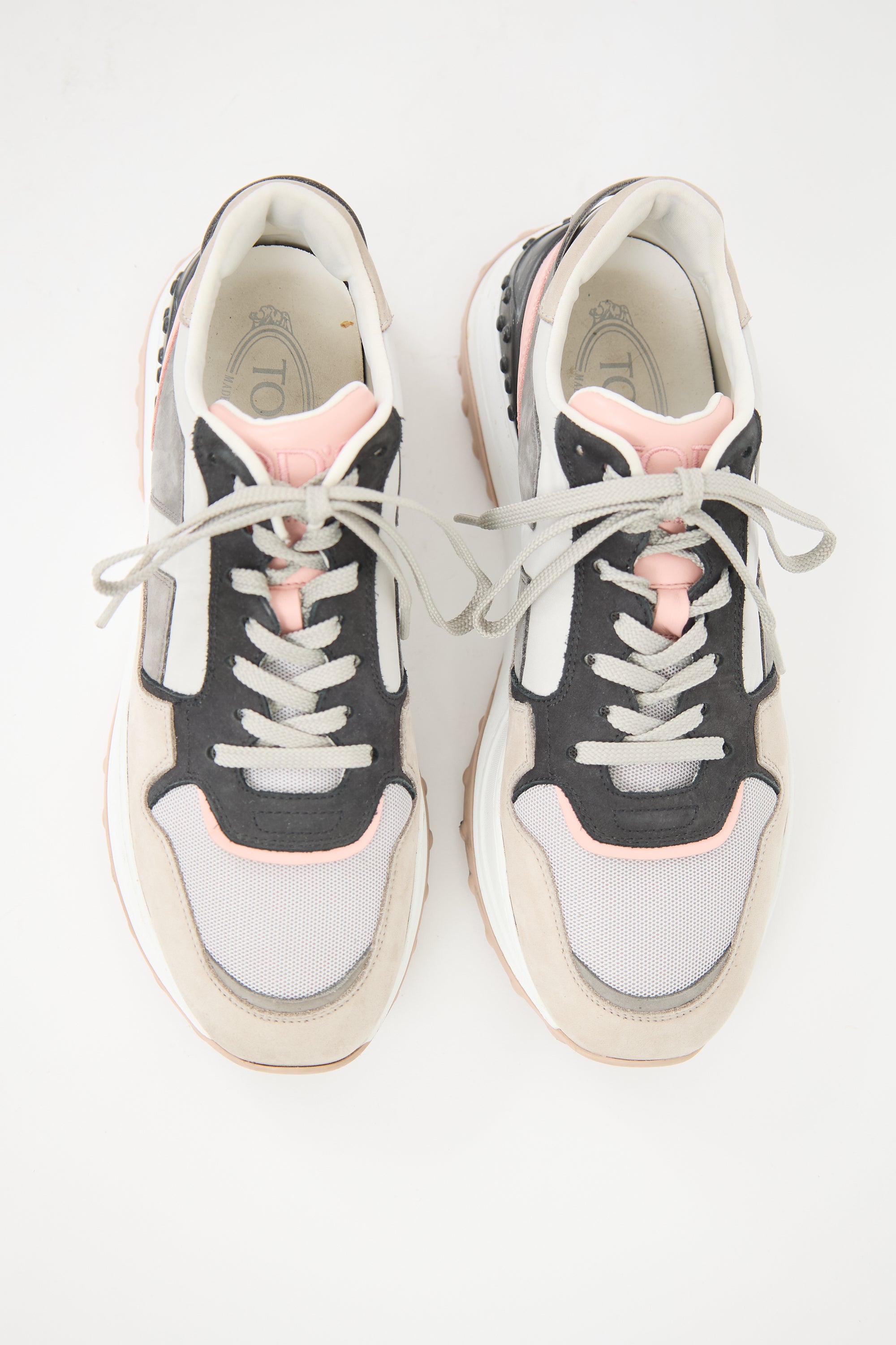 Pre-owned Tod's grey and pink suede Sporty 45 sneakers featuring a rounded mesh toe, lace up front, embroidered logo at tongue, textured platform midsole. and rubber sole.
