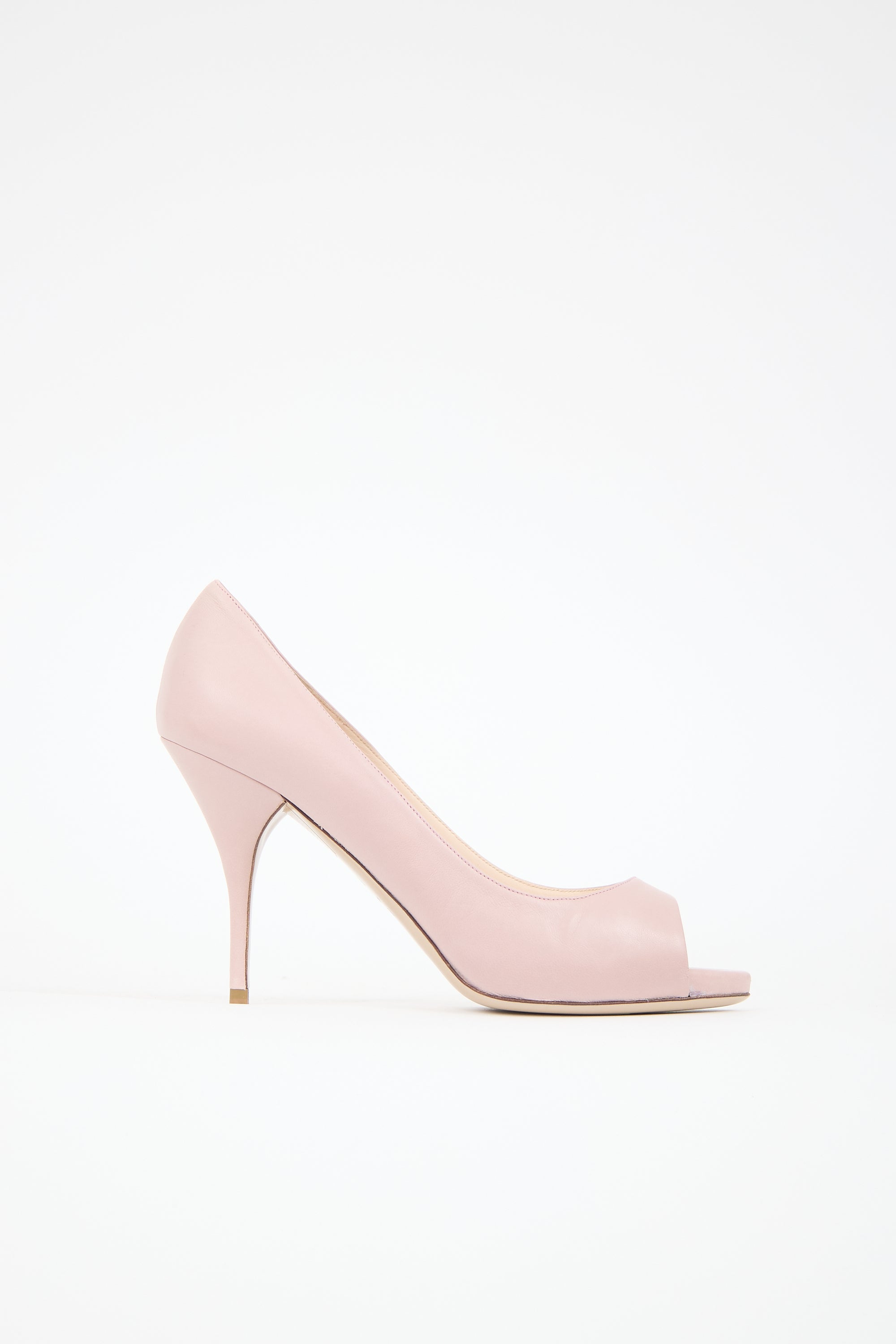 Pre-owned Valentino pink leather heels featuring an almond peep toe, slip on entry, and covered continental heel. Comes with original box.