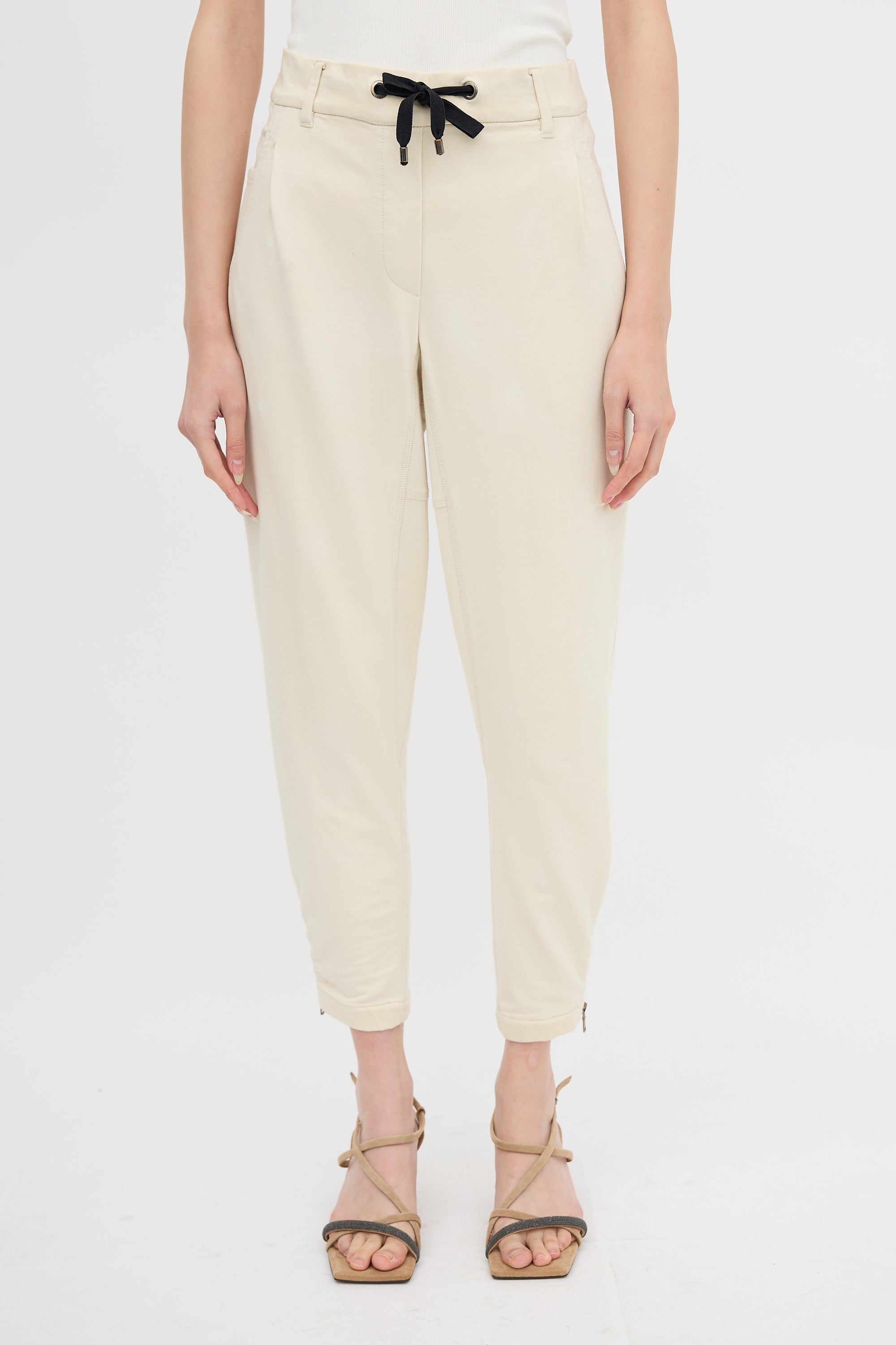 Pre-owned Brunello Cucinelli beige trousers featuring drawstring waist, tapered leg, zipped sides, five pocket styling, and decorative placket. Clipped to fit model.