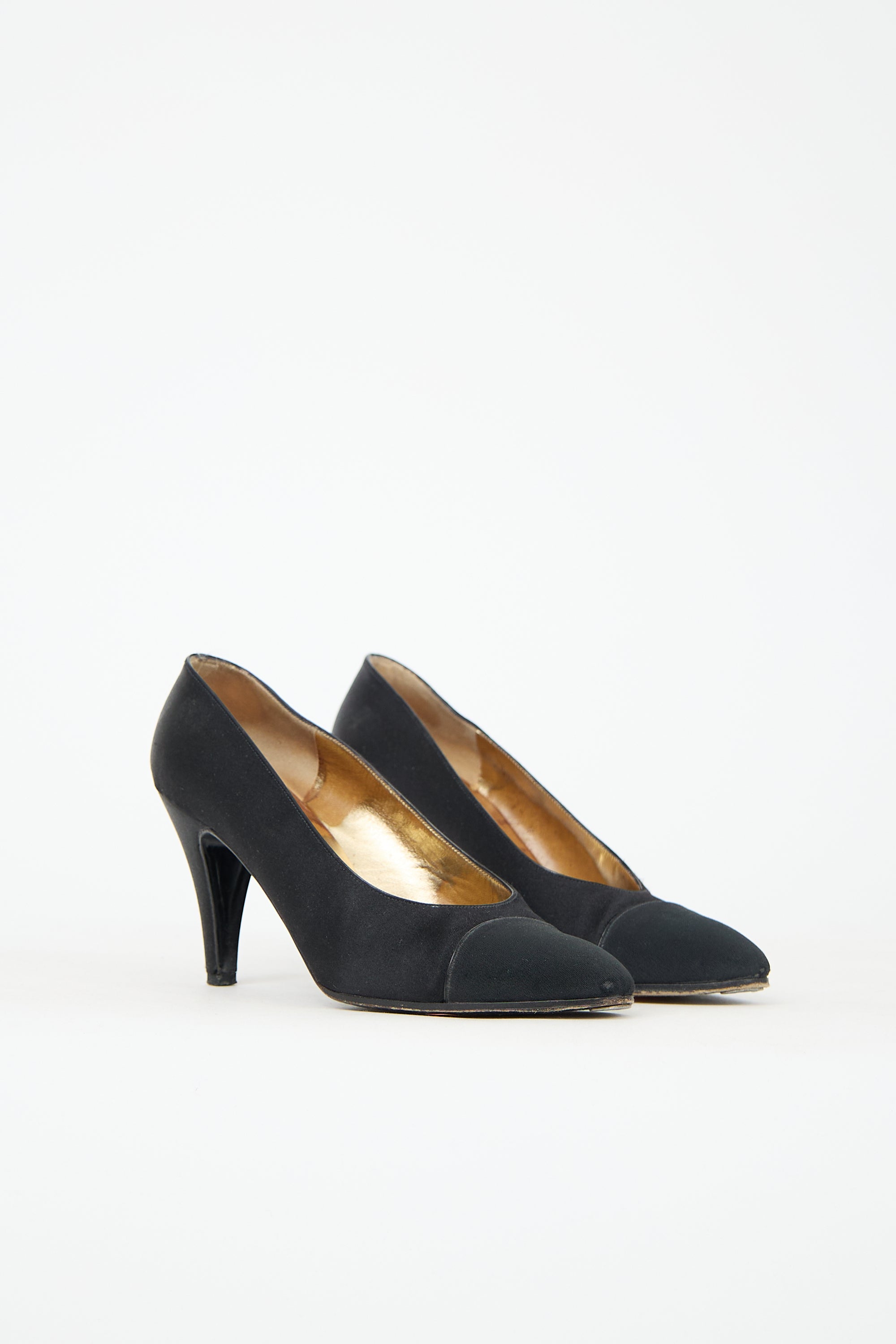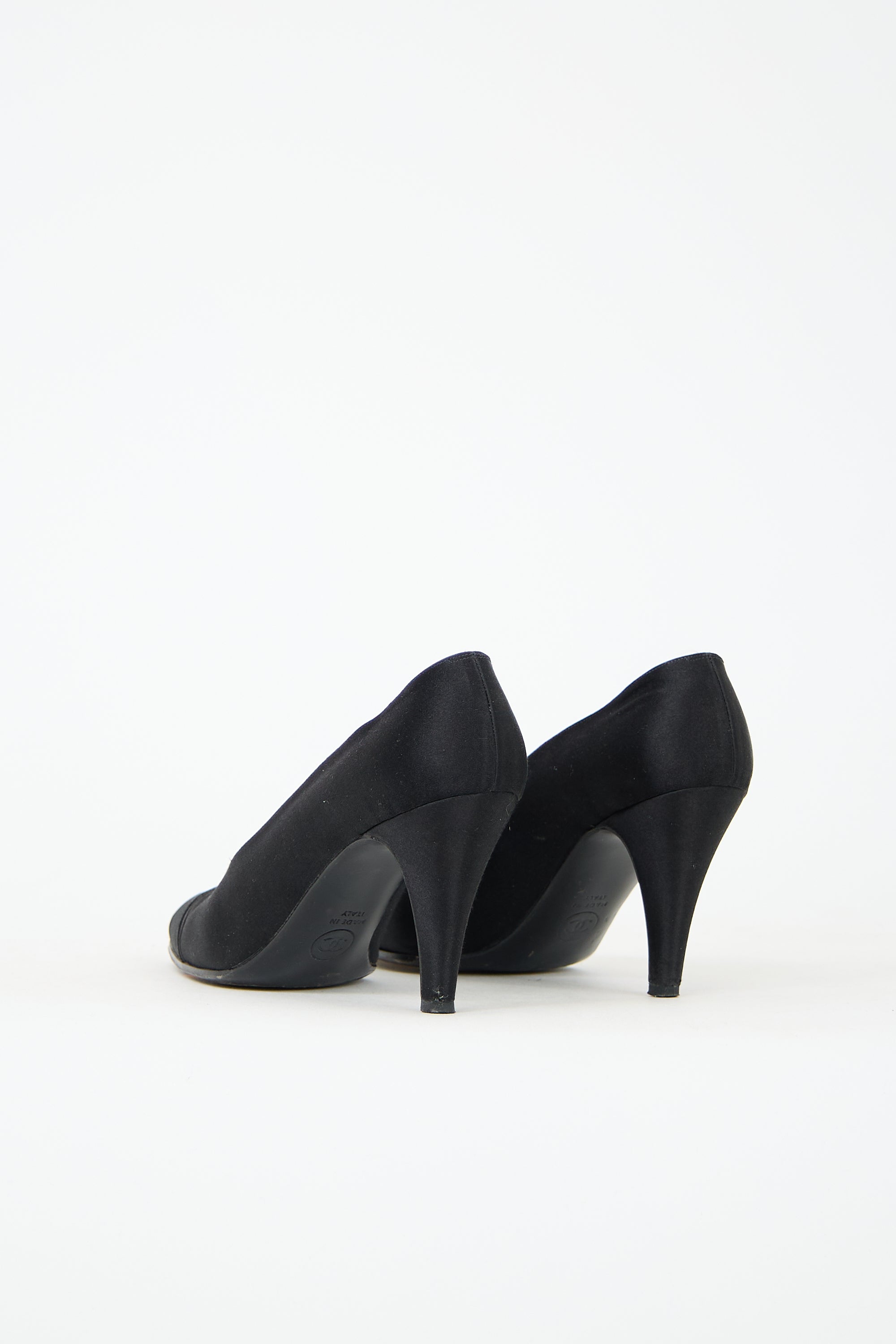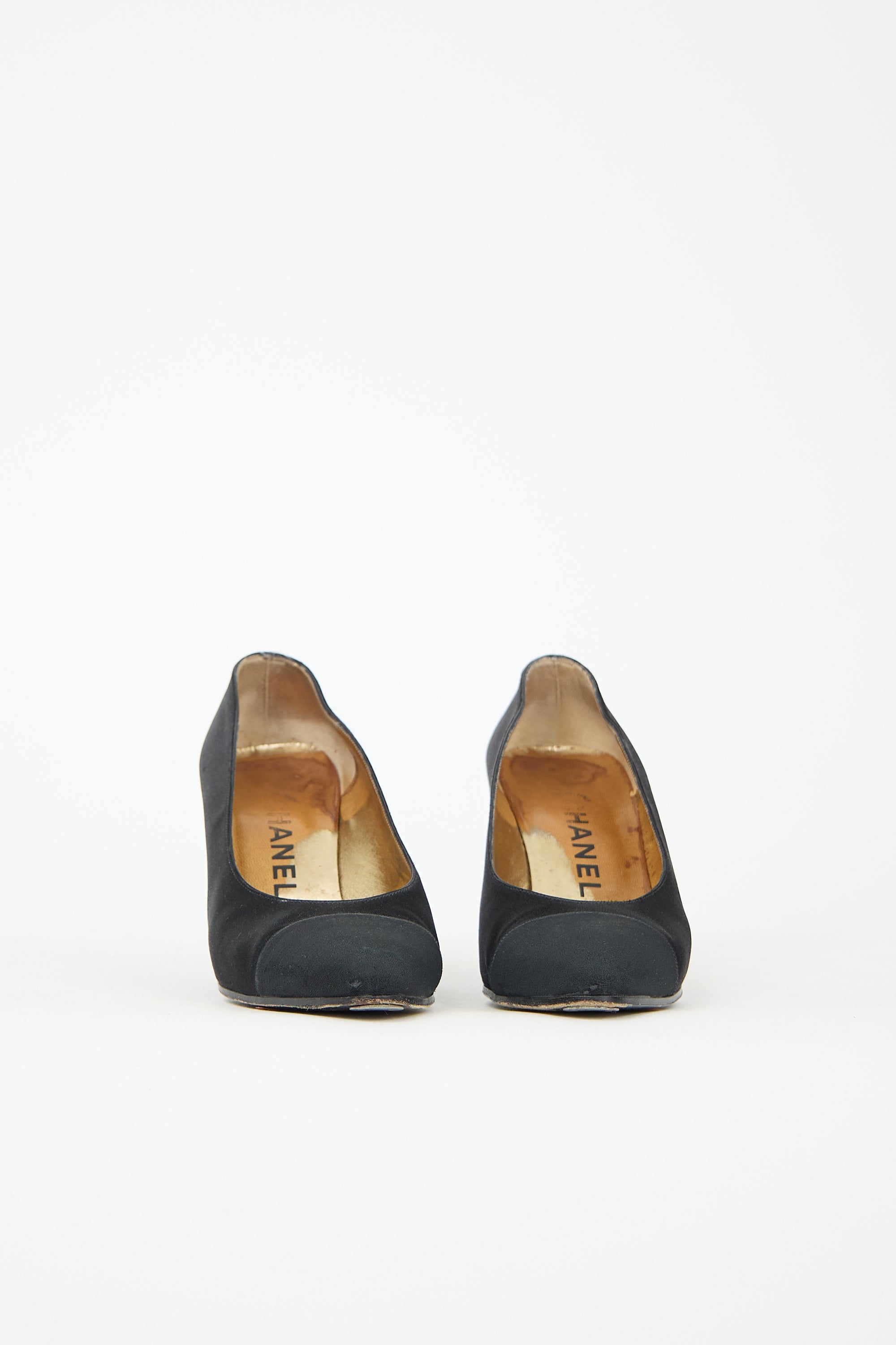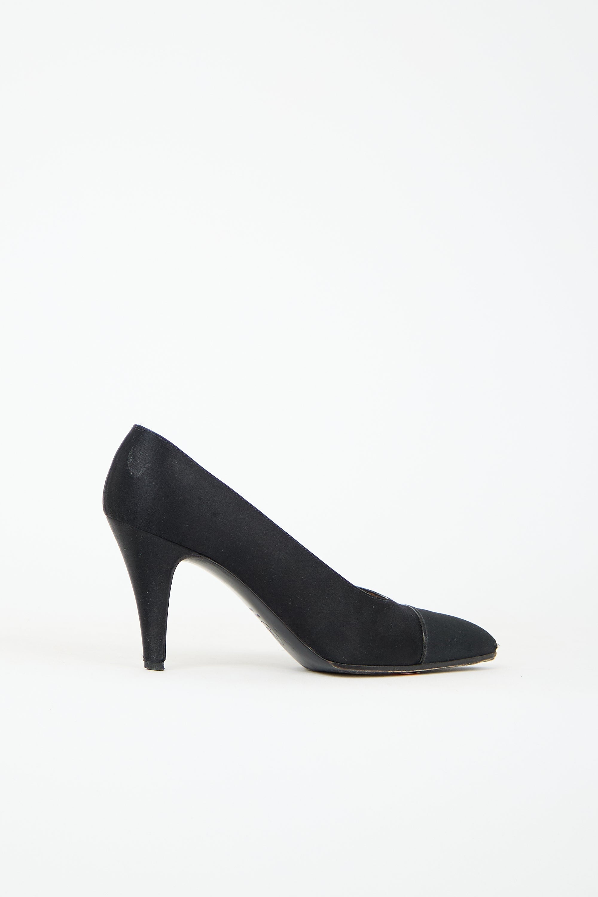 Pre-owned Chanel black satin pumps featuring an almond toe with cap, slip on entry, and covered heel. Includes original box.