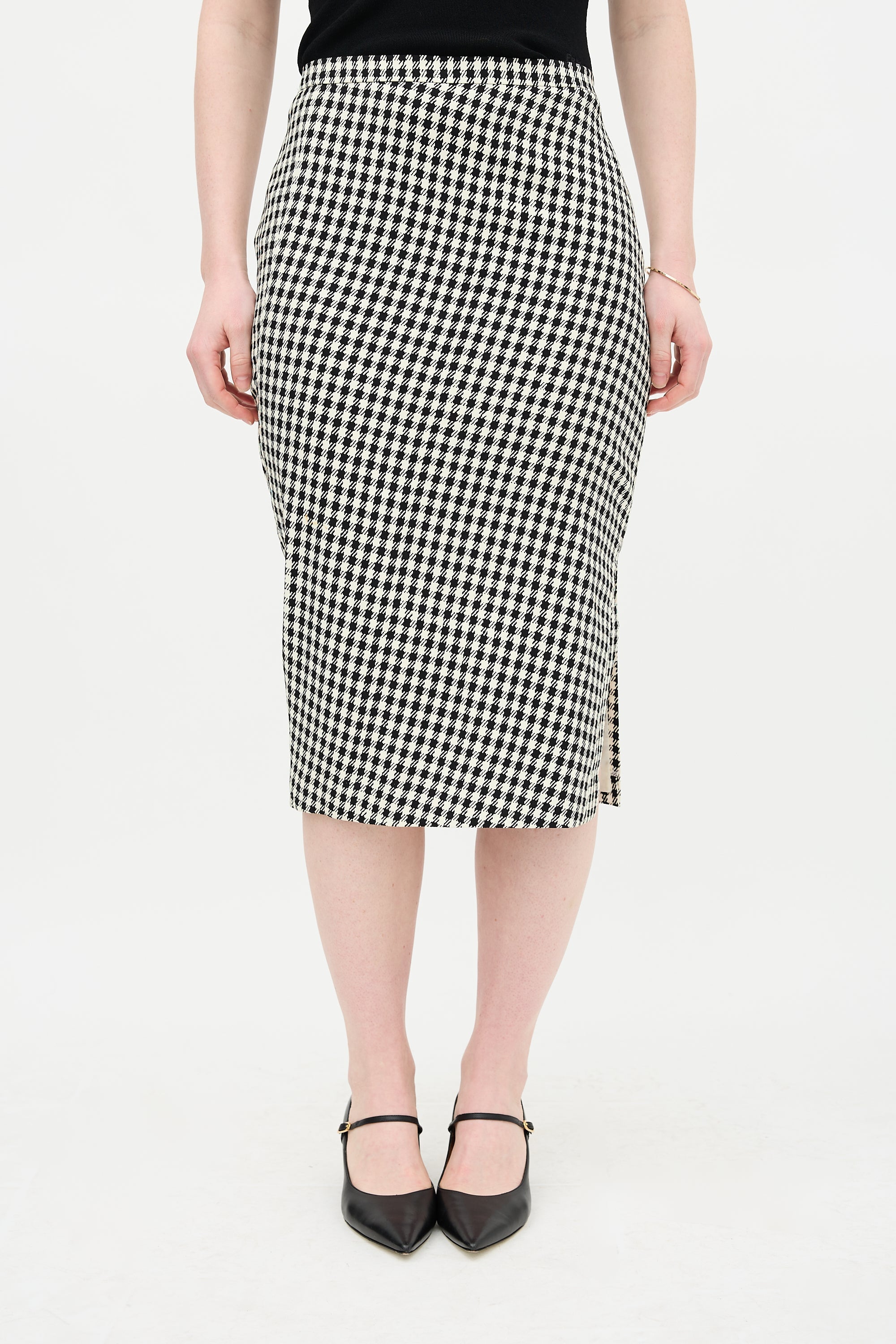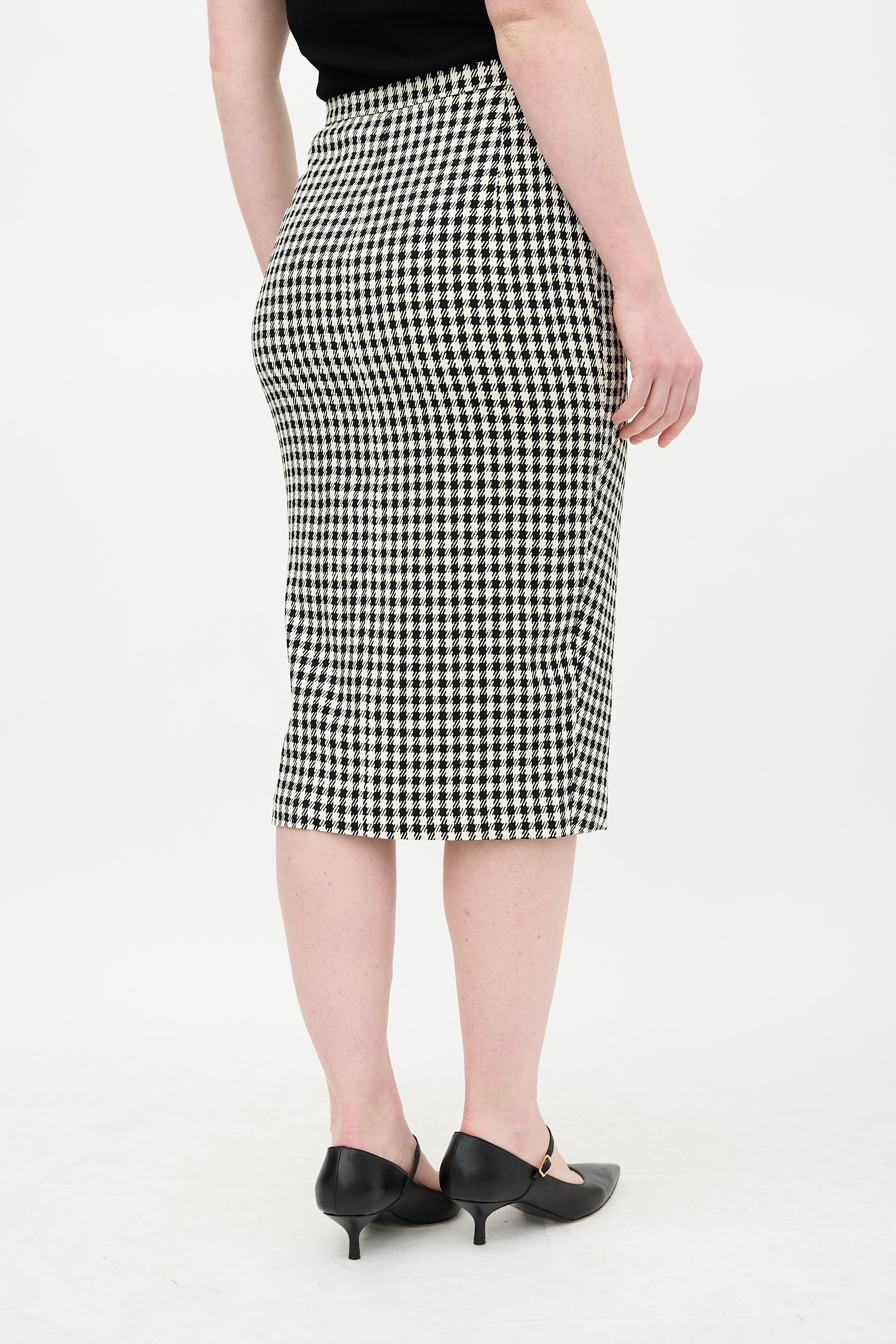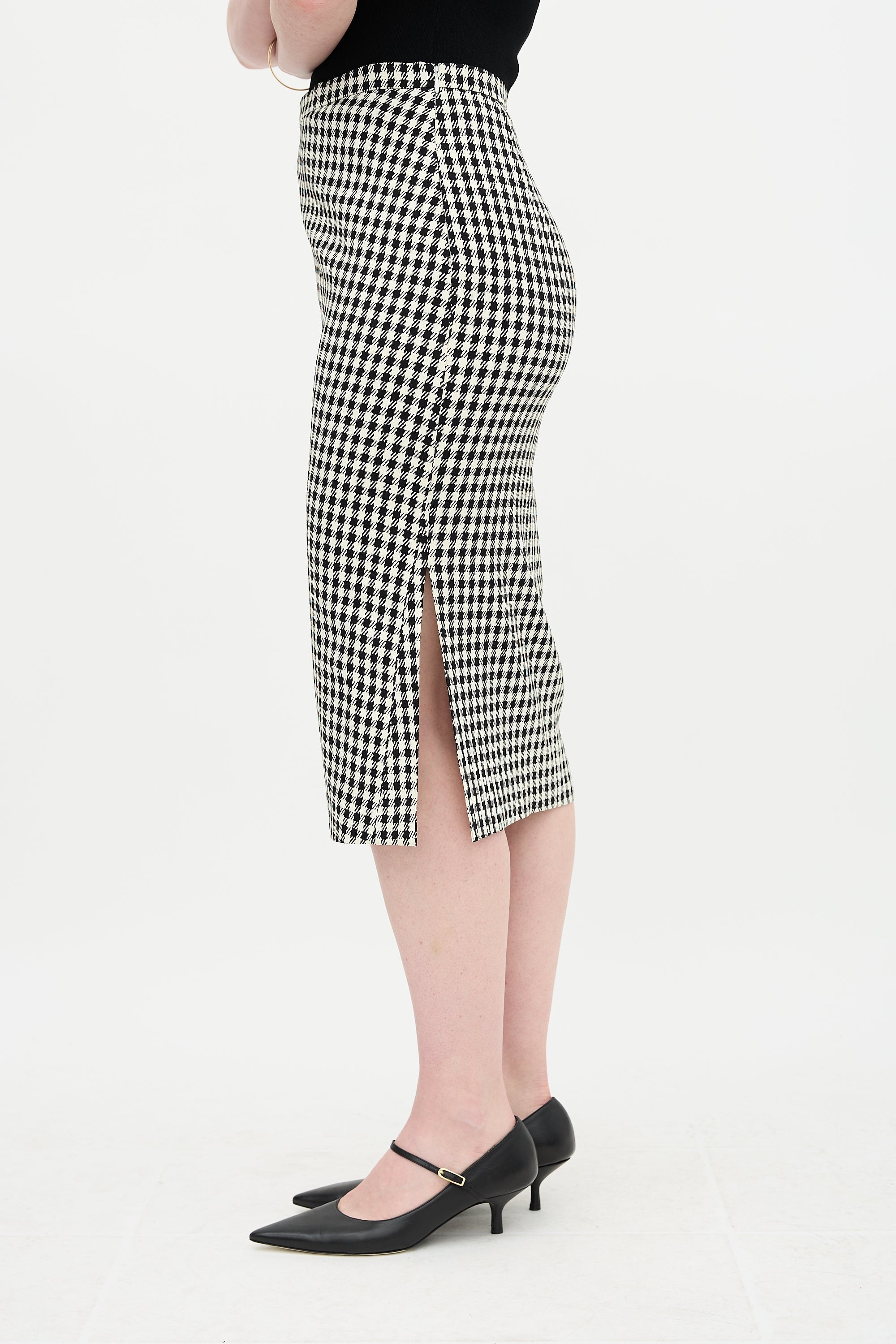 Pre-owned Altuzarra black and white midi skirt featuring houndstooth pattern, high waist, concealed side zip, and left side vent. Lined.