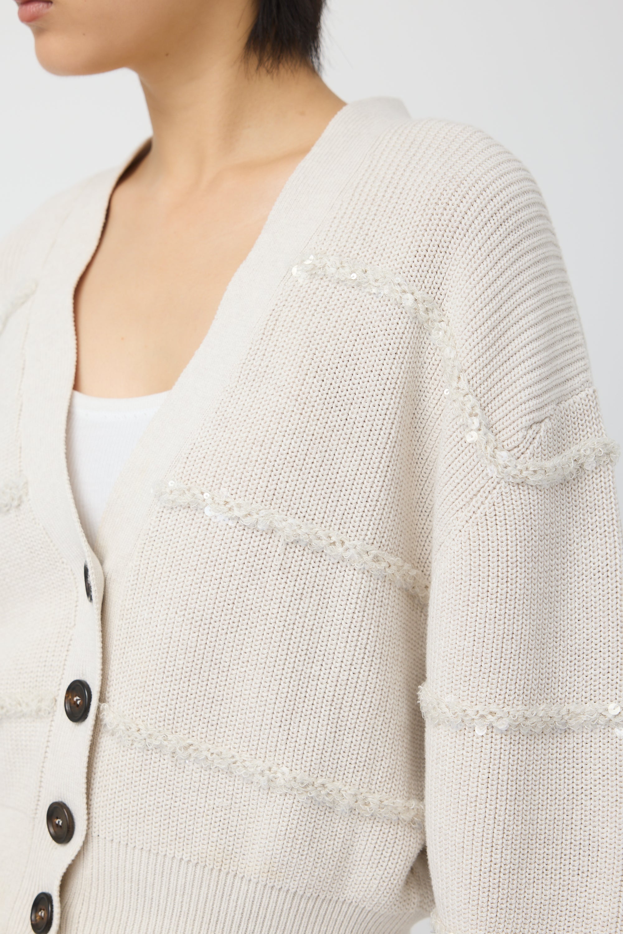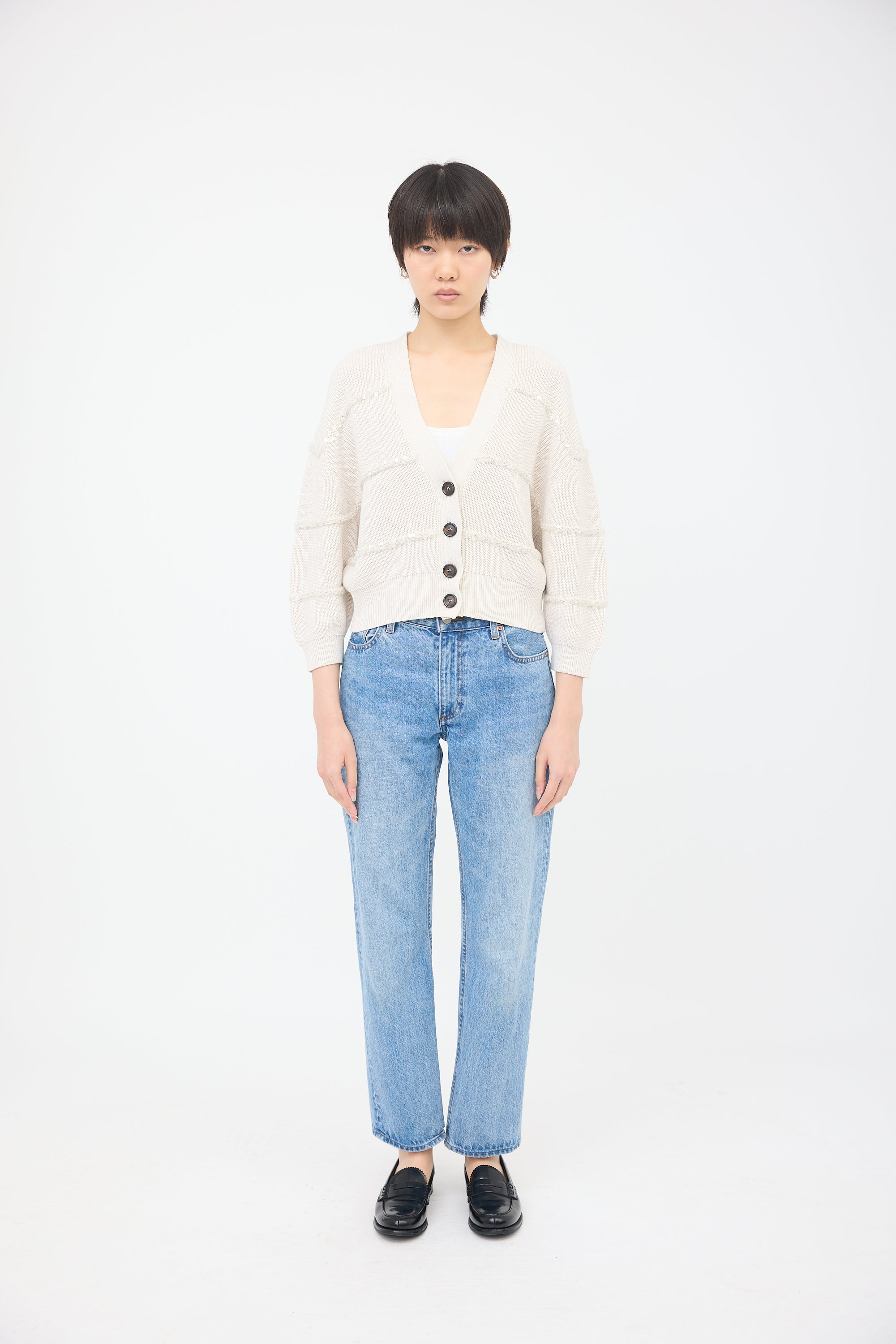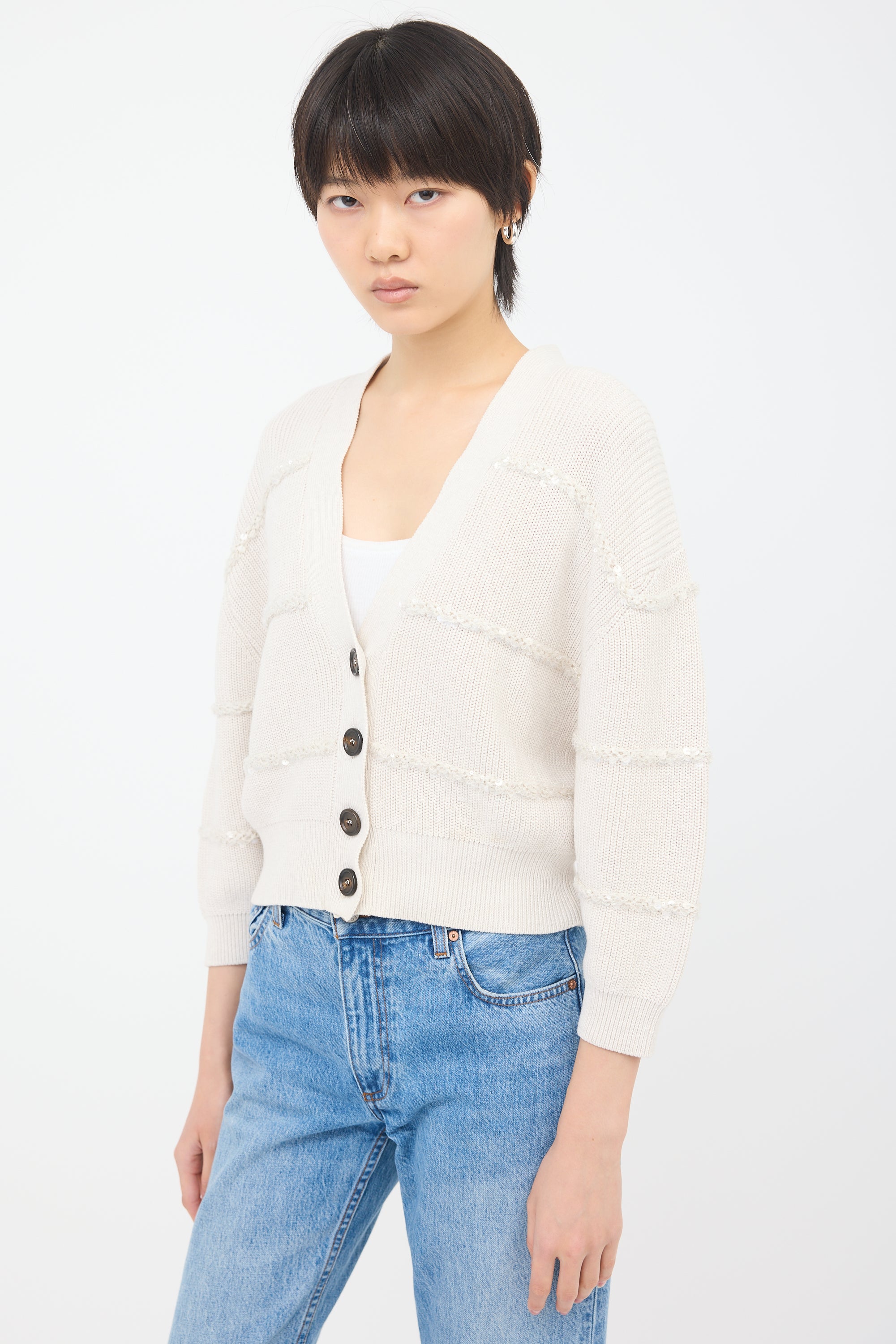 Pre-owned Brunello Cucinelli cream cropped cardigan featuring transparent sequin and braided embellishments throughout, dropped shoulders, half length sleeves, and button front.