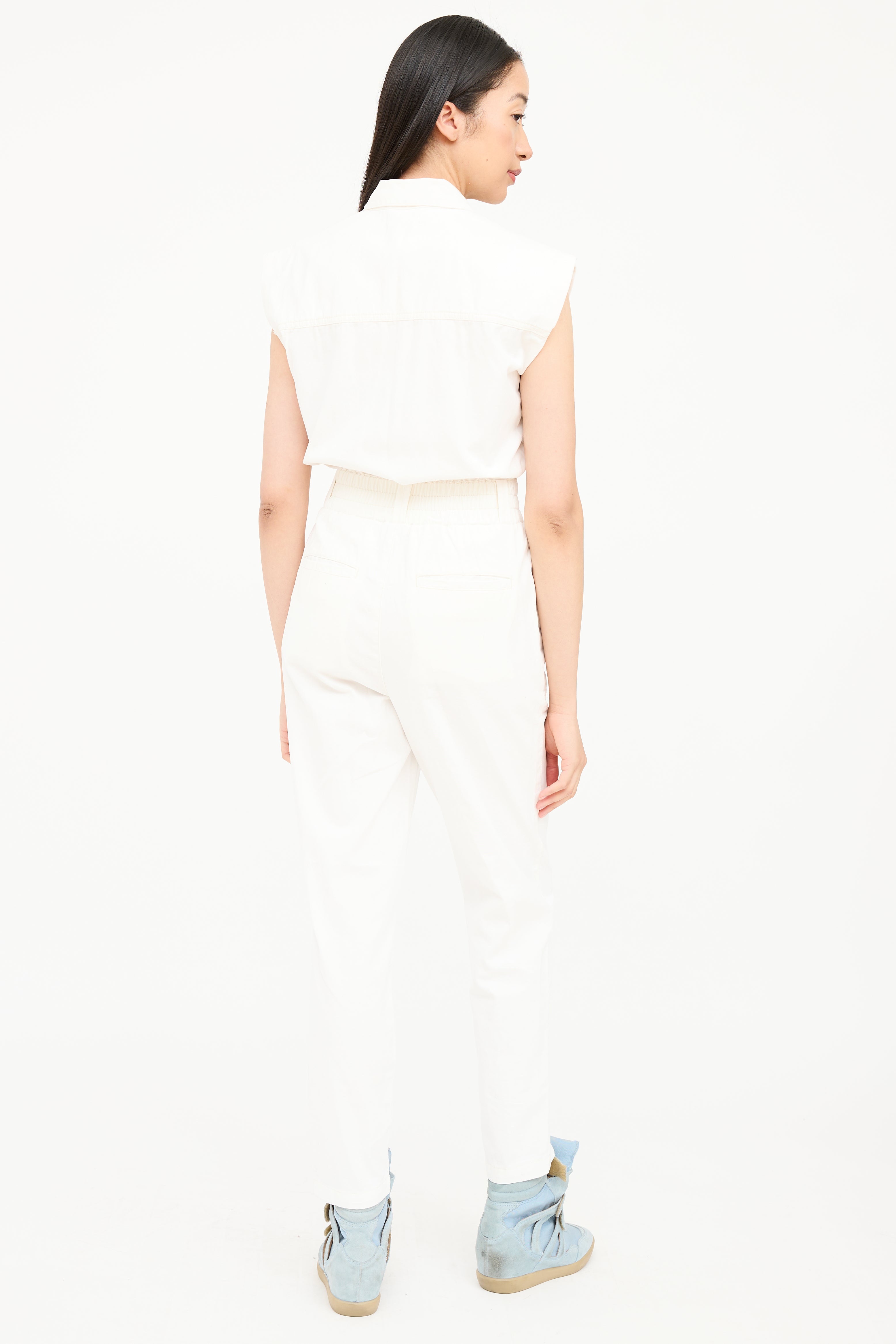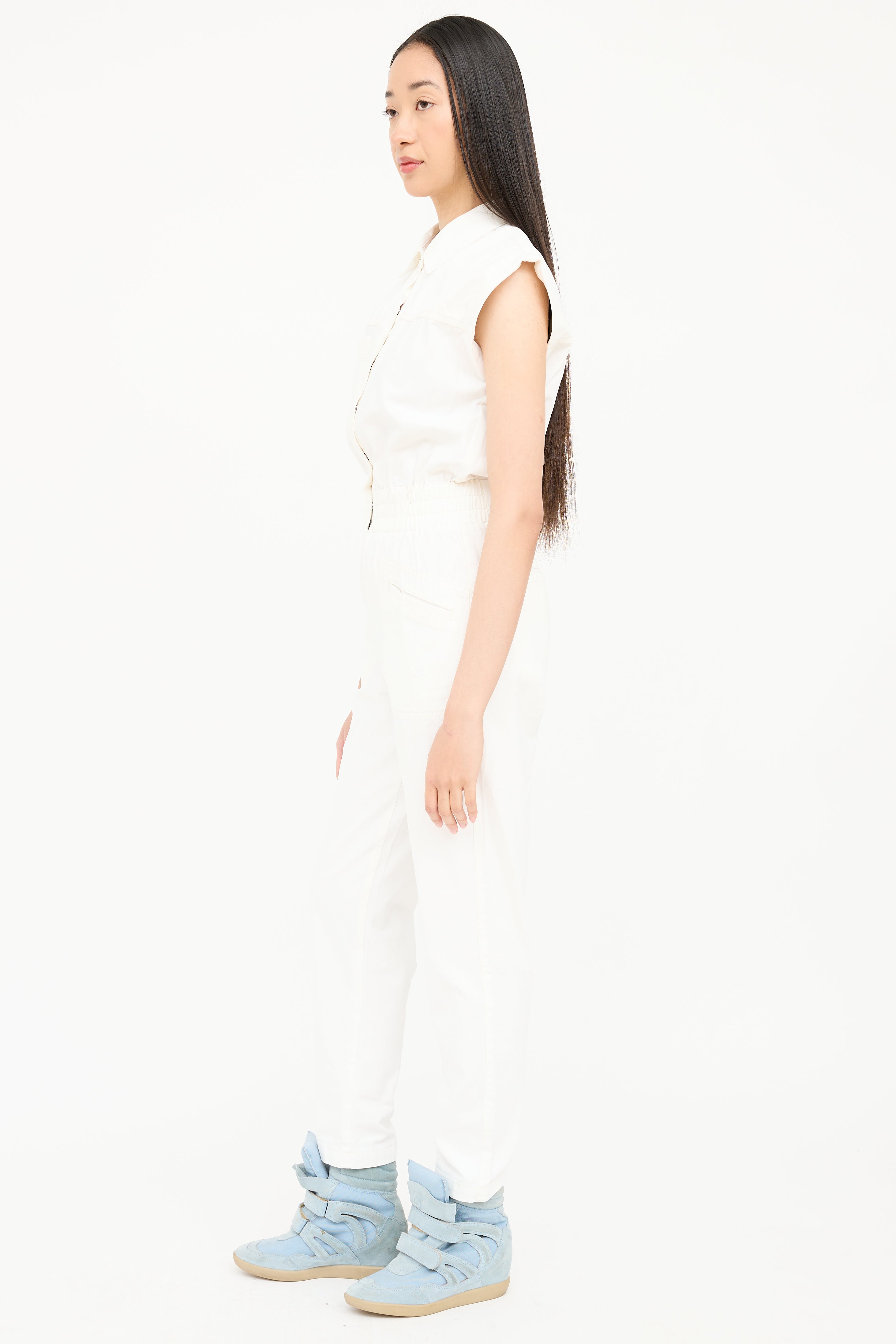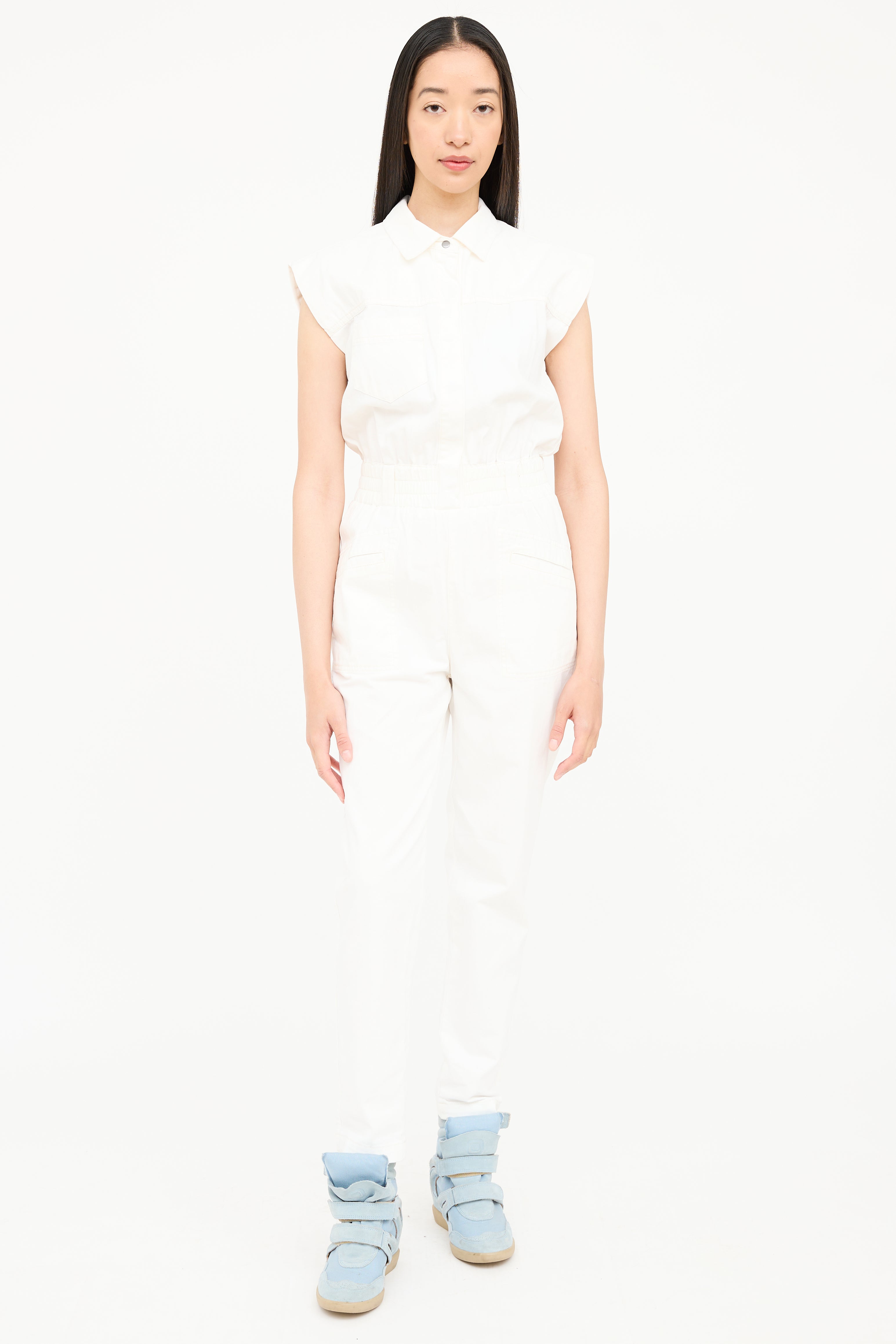 Pistola white sleeveless jumpsuit featuring a pointed collar, one patch pocket at chest, cinched waist, two slip pockets at hip, tapered leg, and snap button closure at front.