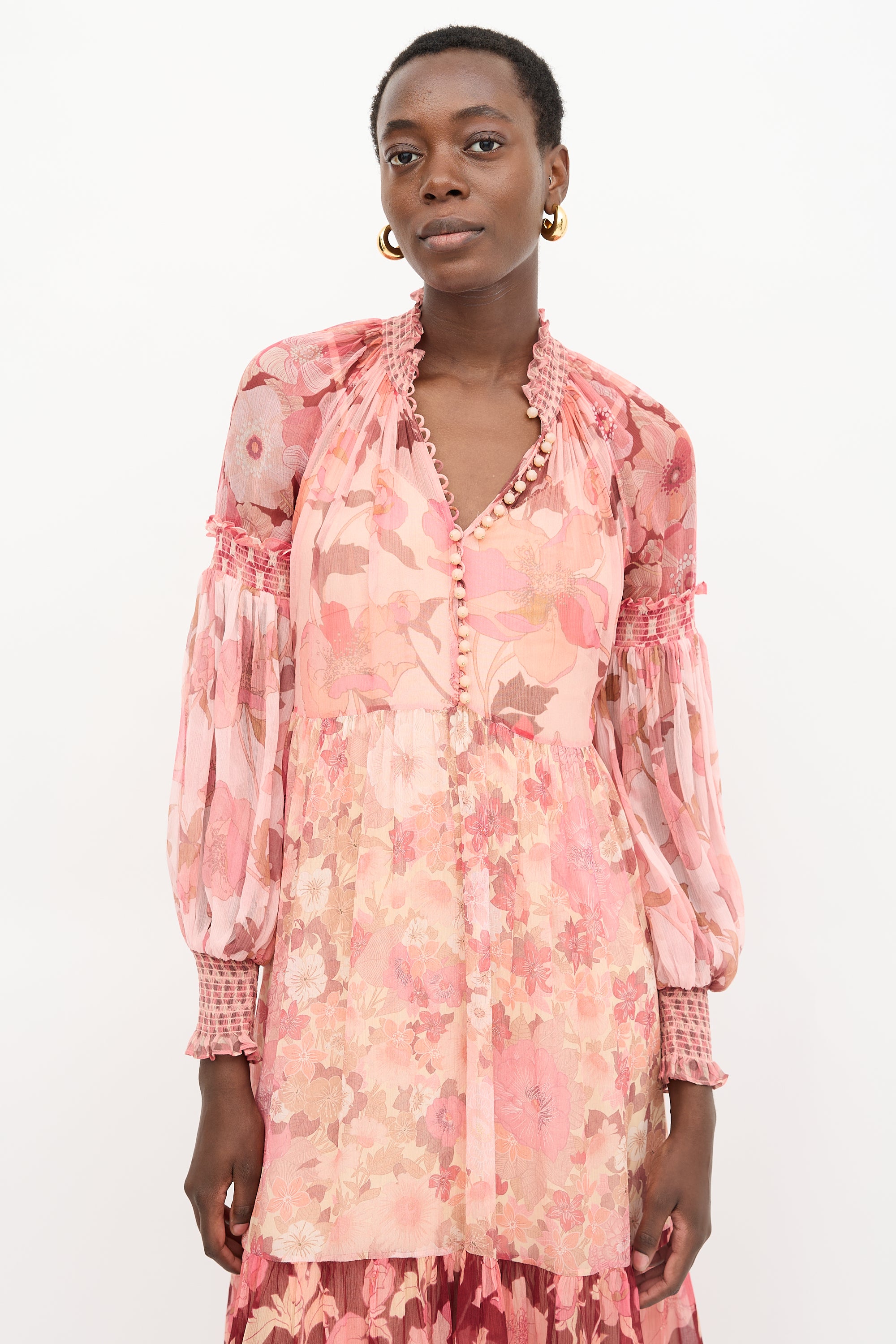 Pre-owned Zimmermann pink and burgundy silk sheer Concert Spliced dress featuring tonal floral print, smocked collar, shoulders, and cuffs, lantern sleeves, half button front, drop shoulders, and ruffle trim. Unlined. Comes with slip.