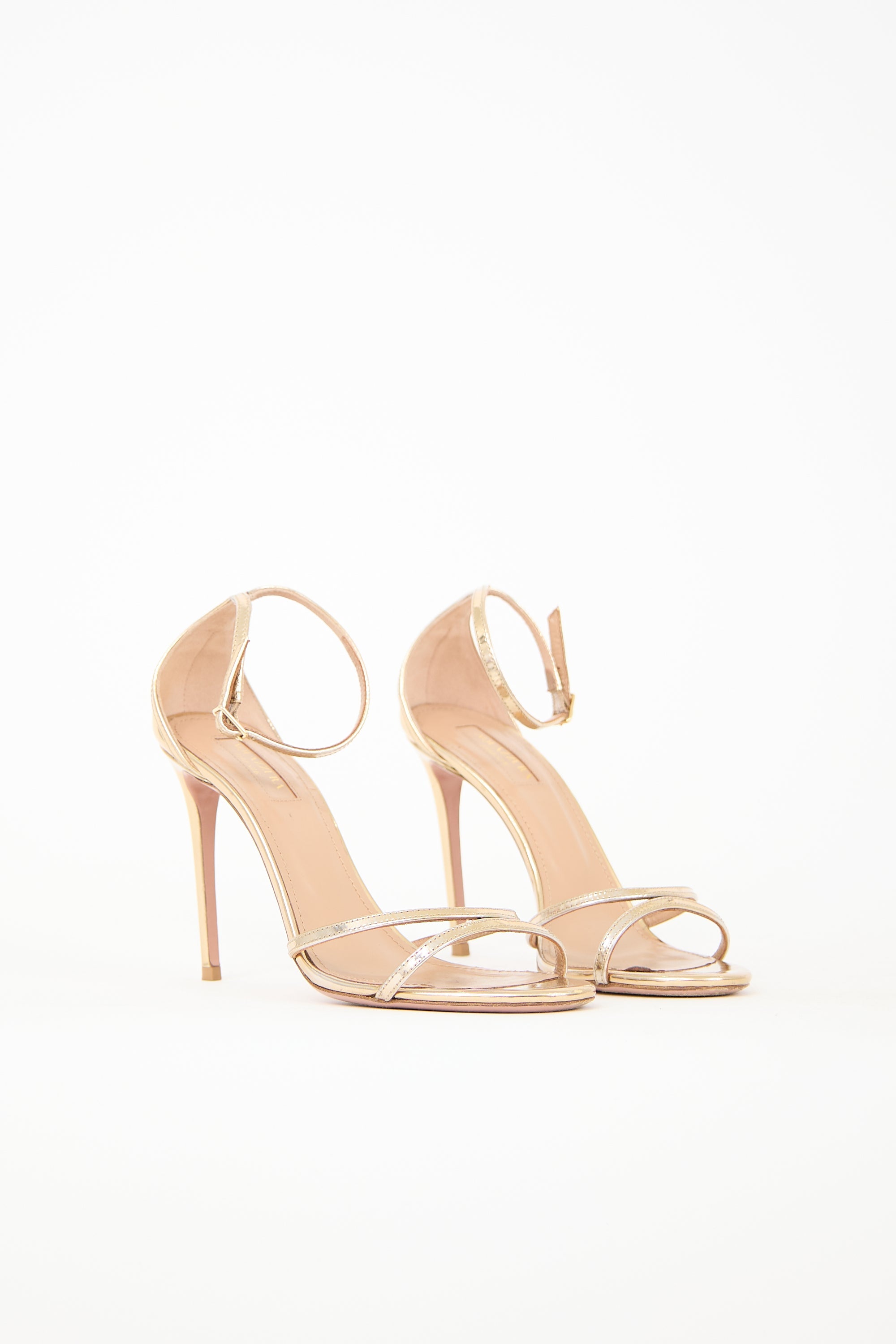 Pre-owned Aquazzura gold leather Purist sandals featuring a rounded toe, straps across vamp, covered counter with adjustable ankle strap, and a covered stiletto heel.