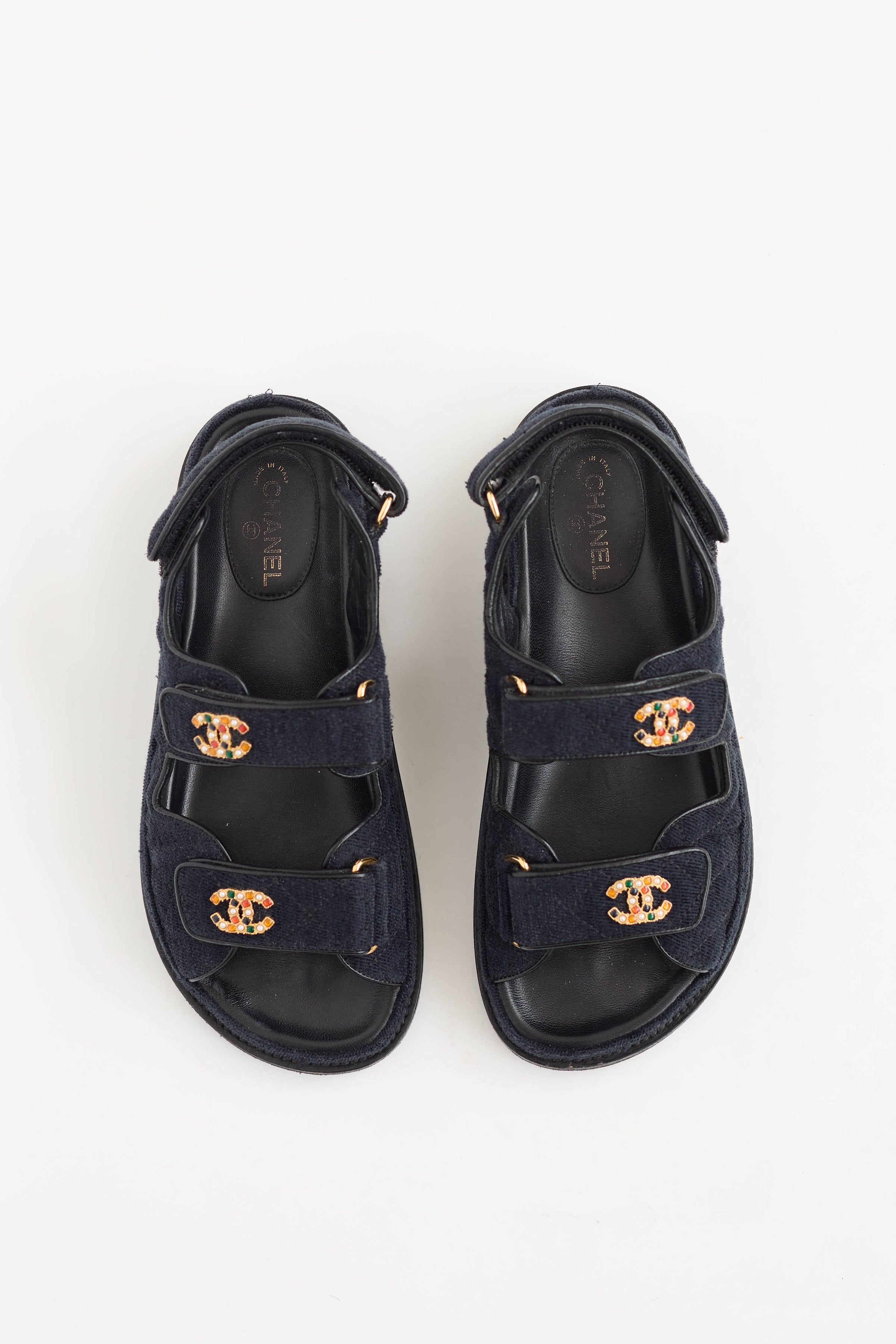 Pre-owned Chanel 21A quilted denim Dad CC sandals featuring a rounded toe, velcro straps at vamp, gold tone and gem CC logo hardware, and velcro slingback strap. c