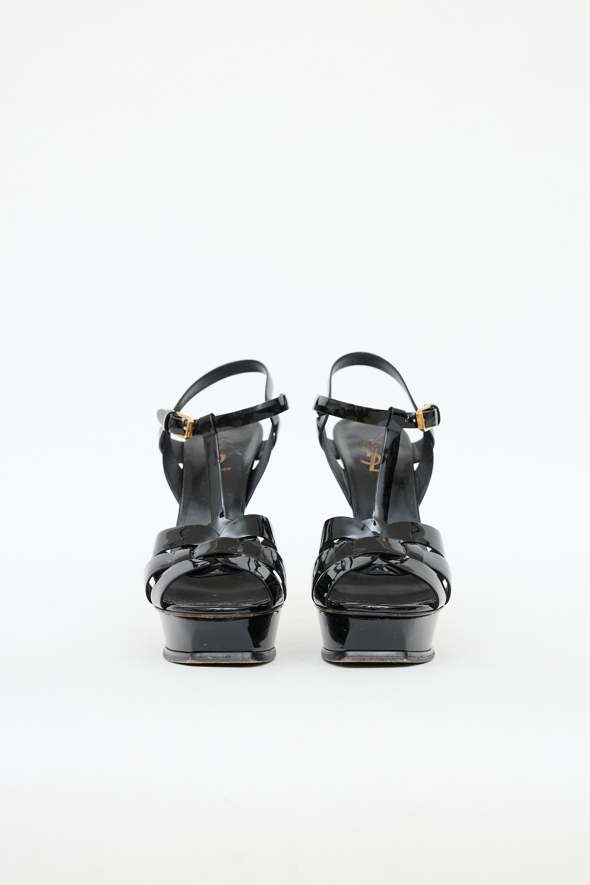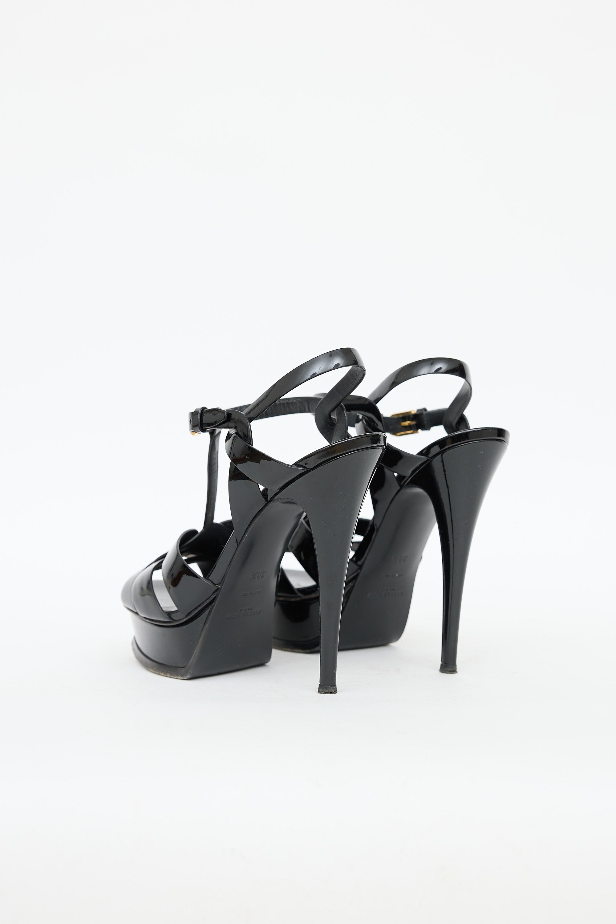Pre-owned Saint Laurent black patent leather Tribute sandals featuring an open toe, multiple criss cross straps over vamp, cut out detailing on sides, T-strap with adjoining ankle strap and pin buckle closure, tonal platform and stiletto heel, gold-tone hardware and leather outsole.