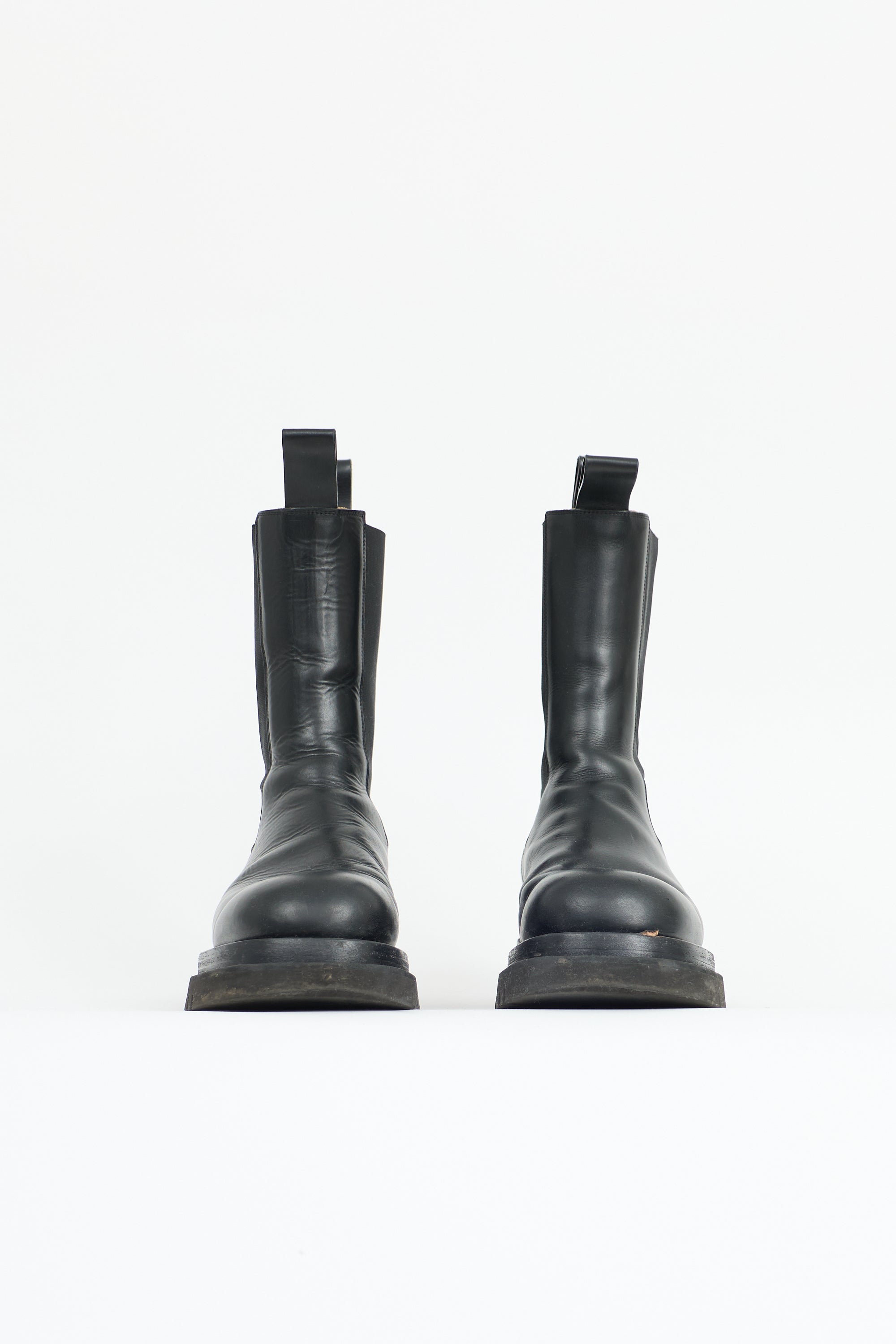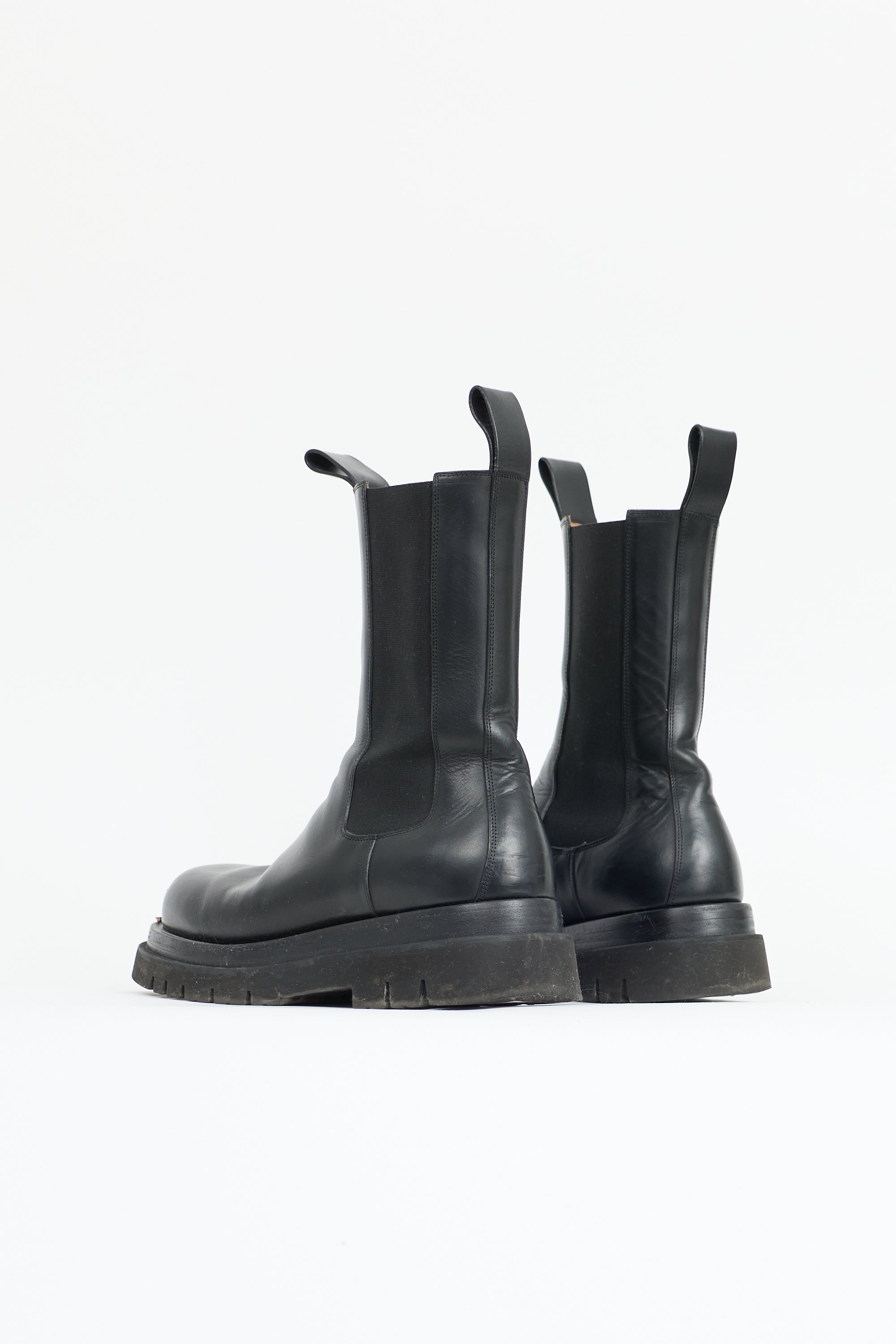 Pre-owned Bottega Veneta black leather Lug Chelsea boots featuring a rounded toe, elasticized gore at sides, pull tabs at collar, and threaded lug sole. Comes with original dust bags.