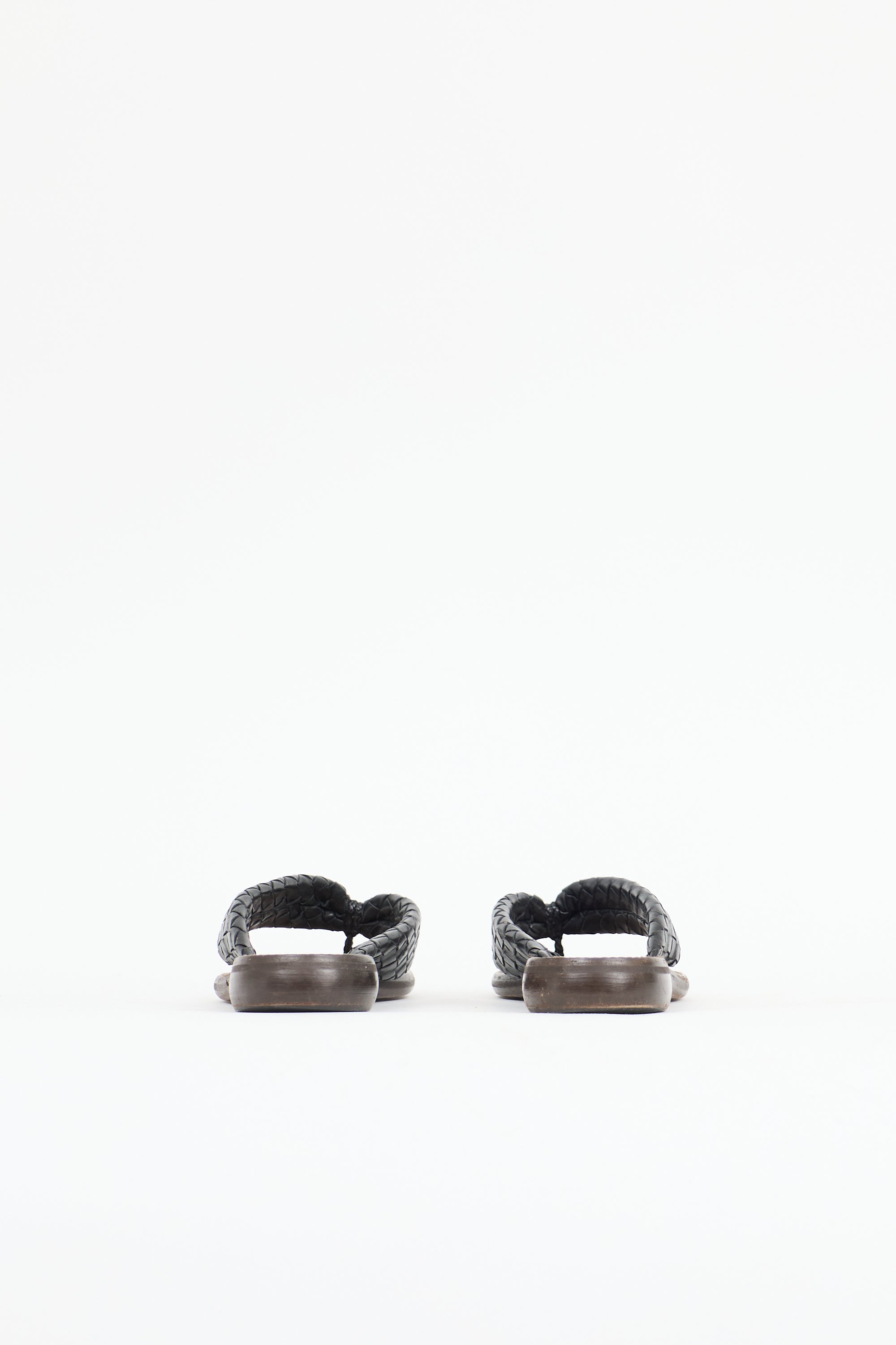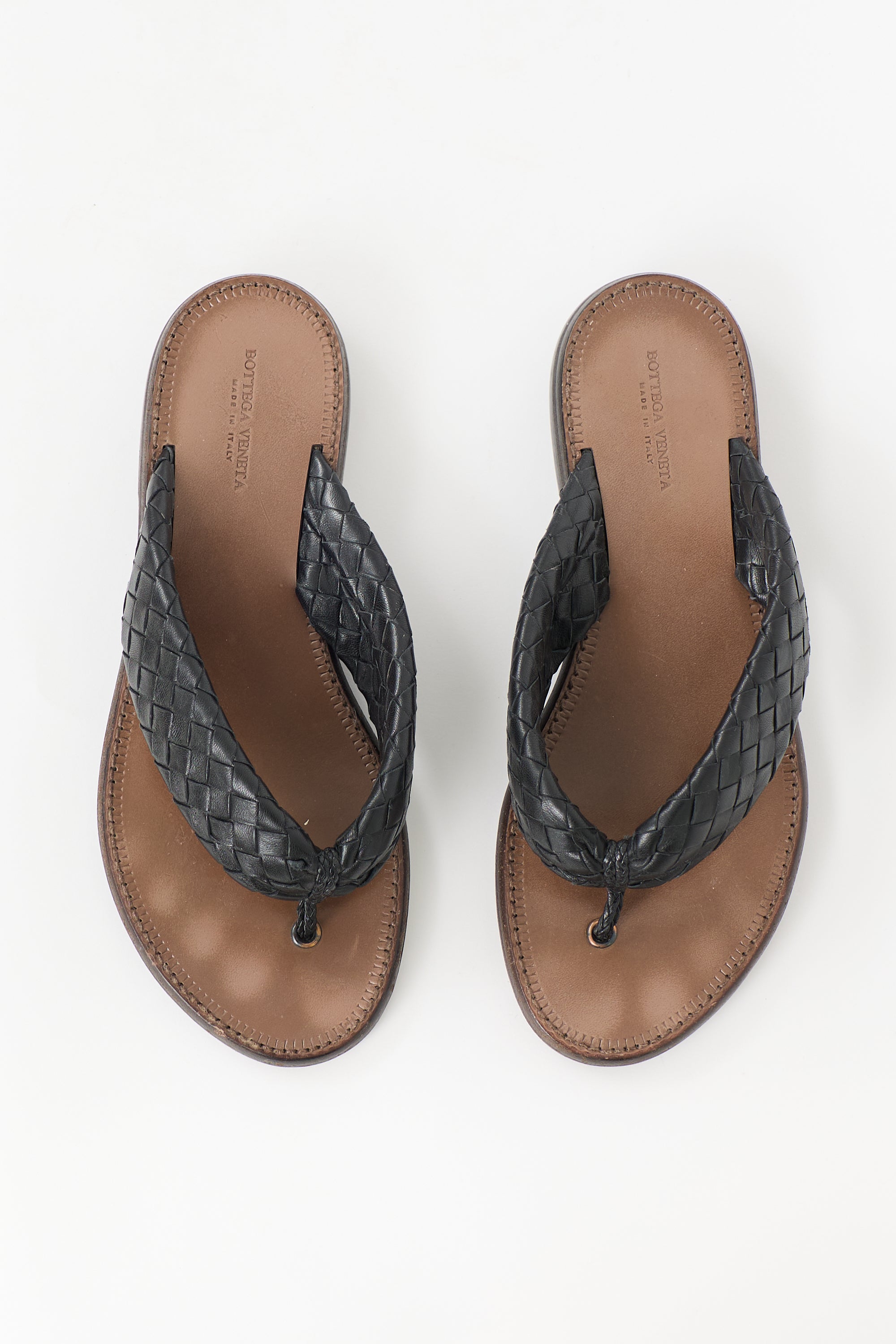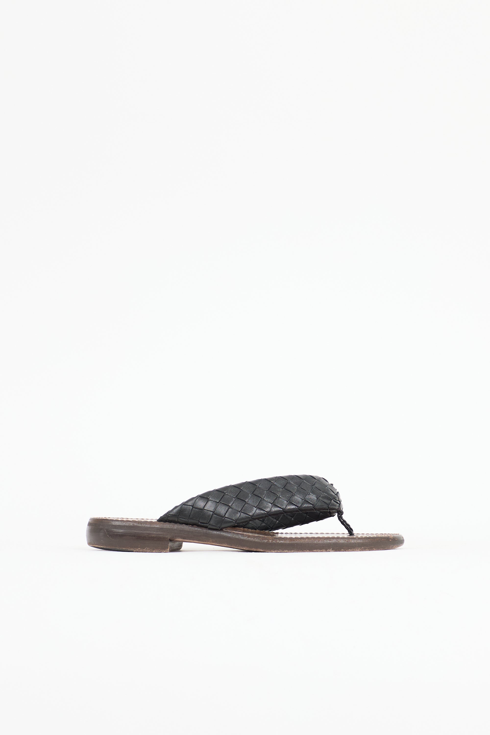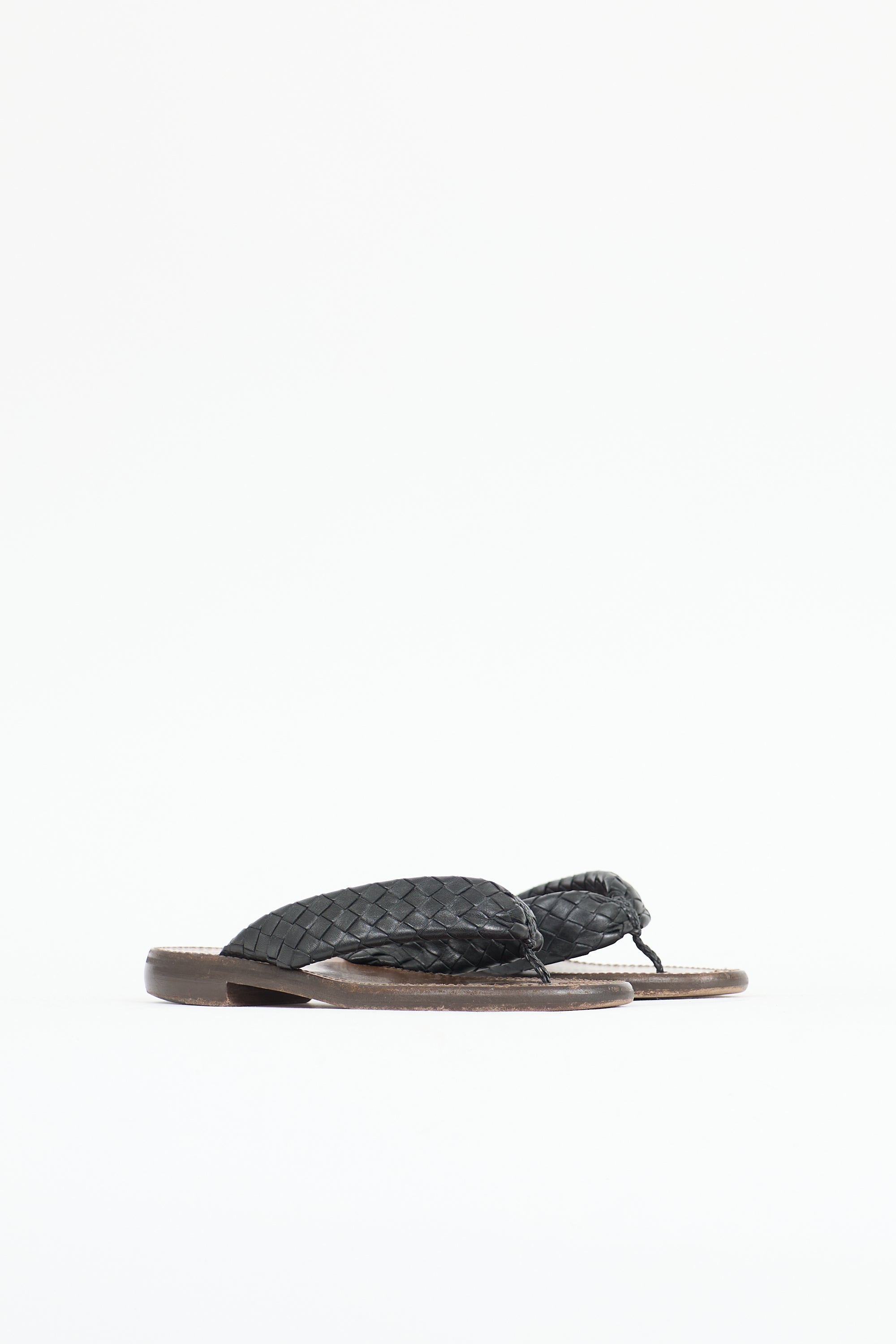Pre-owned Bottega Veneta leather slides featuring an open rounded toe, black Intrecciato woven thong strap, and slip on entry.