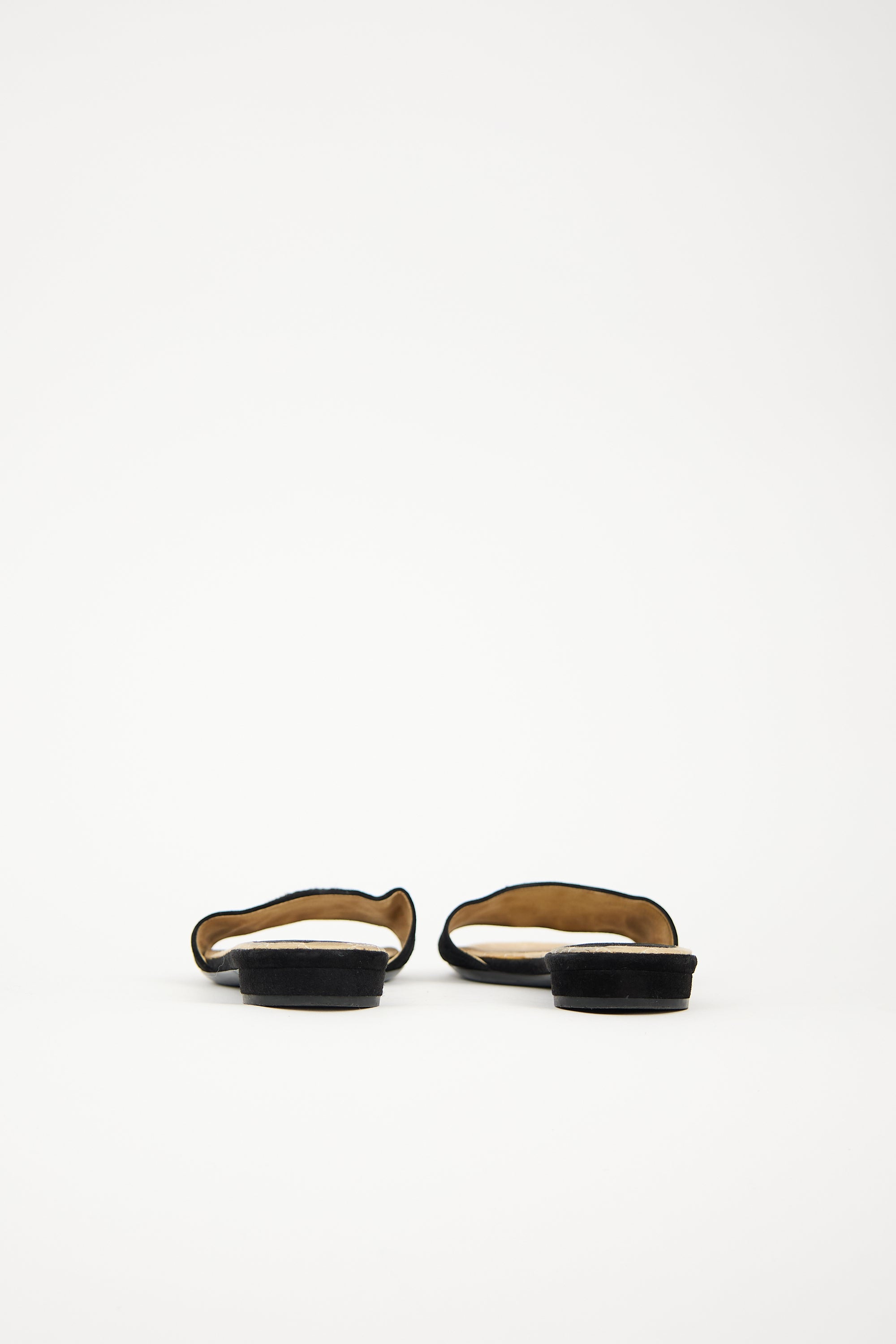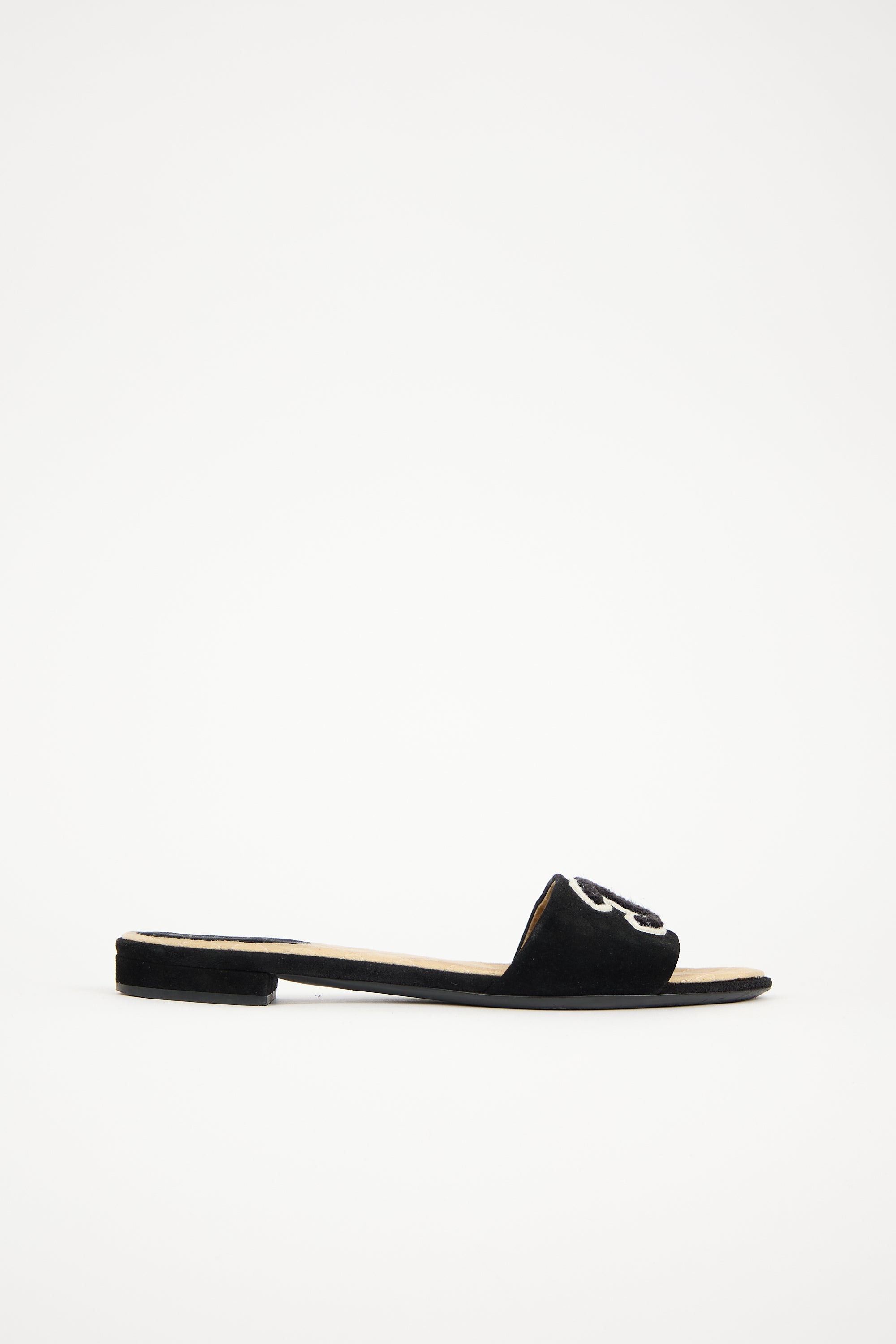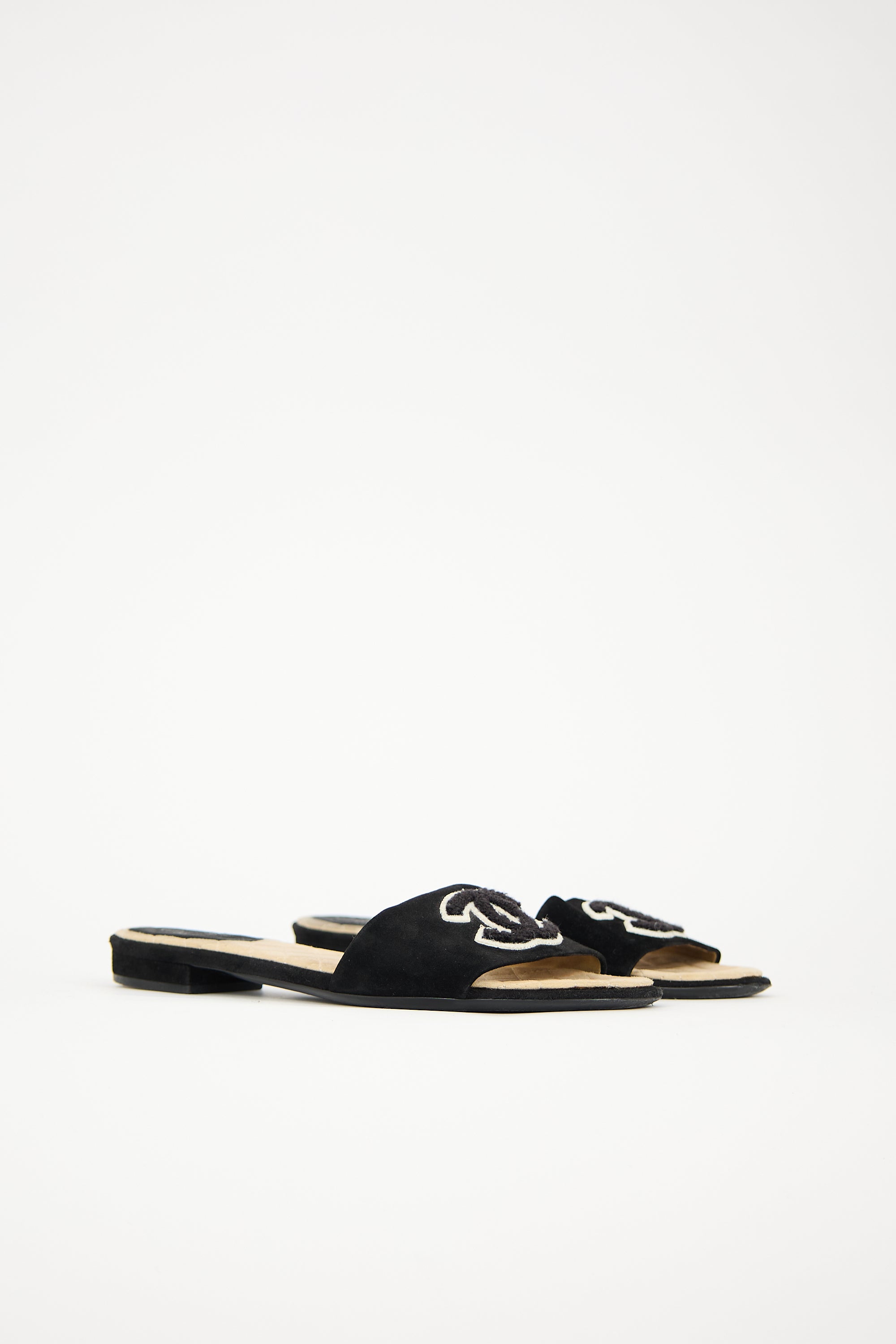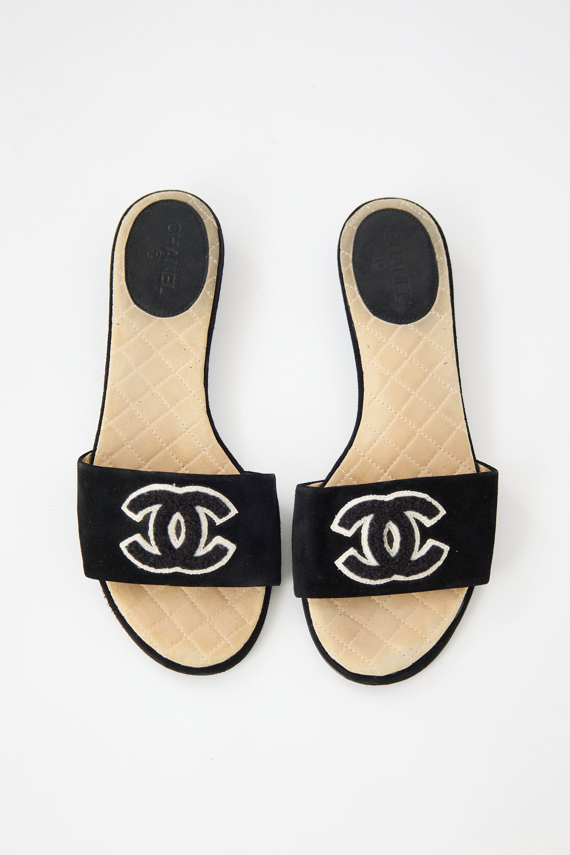 Pre-owned Chanel black slides featuring rounded toe, terry interlocking CC patch at vamp, and beige quilted suede footbed. Comes with original dust bag.