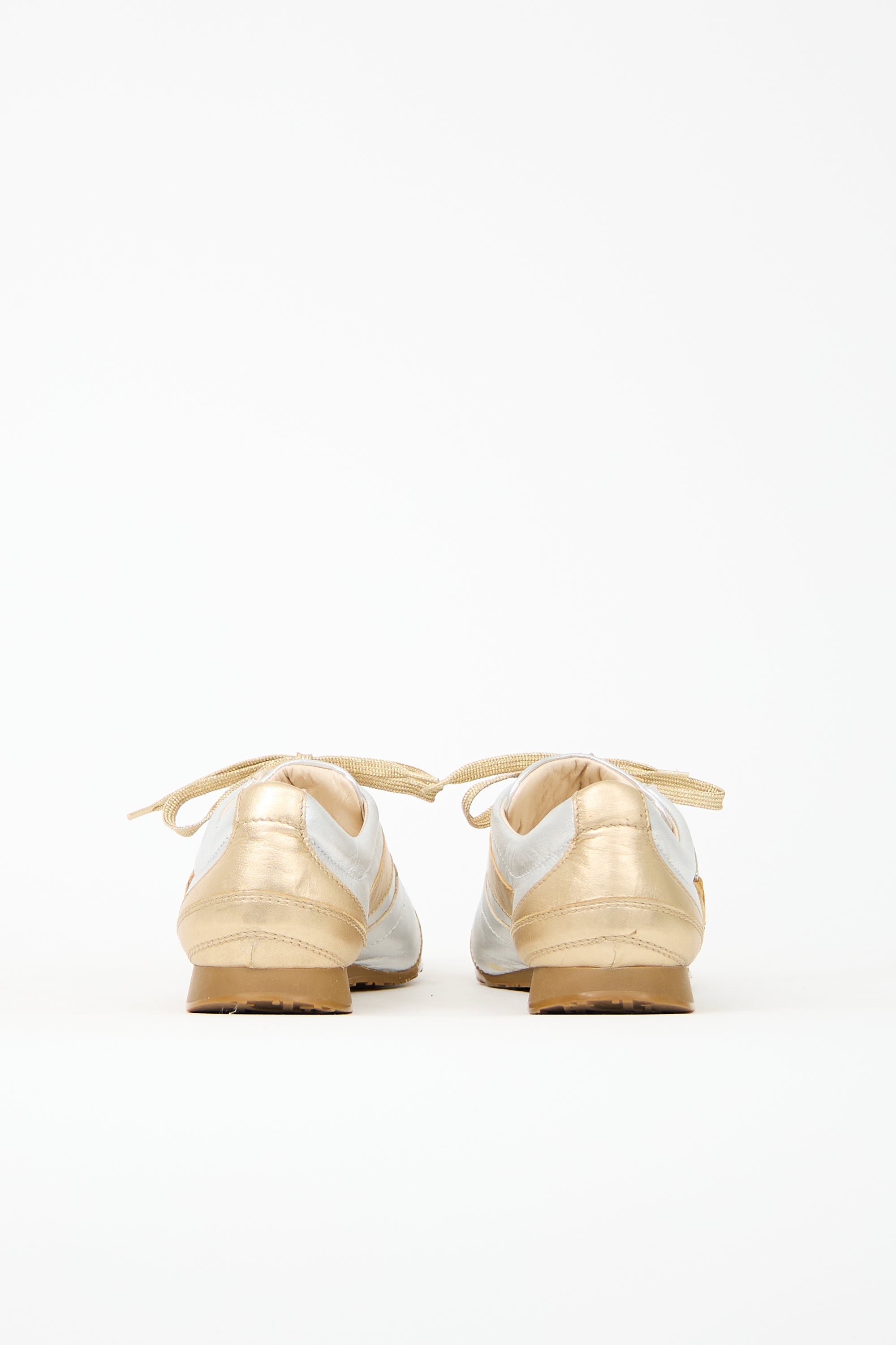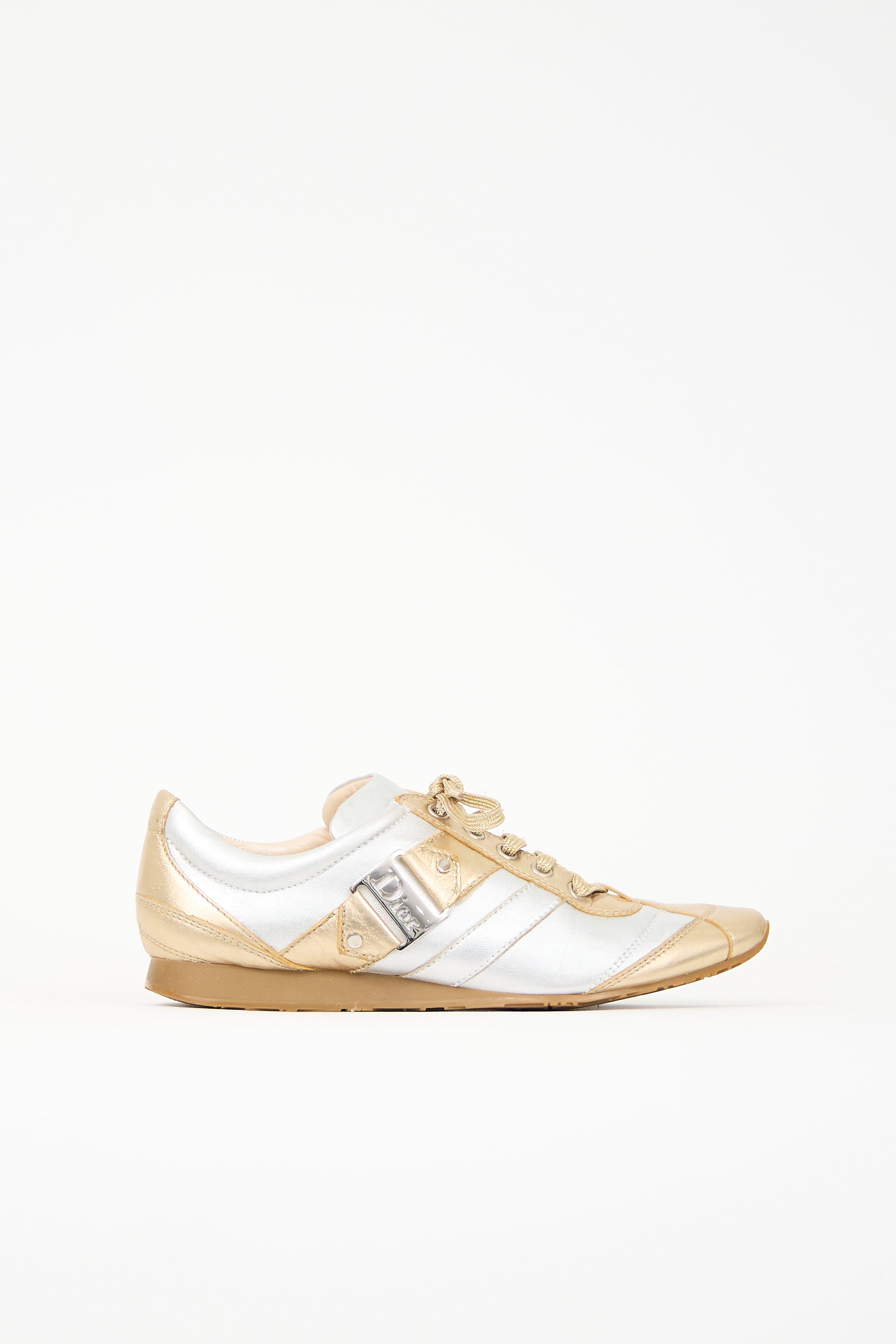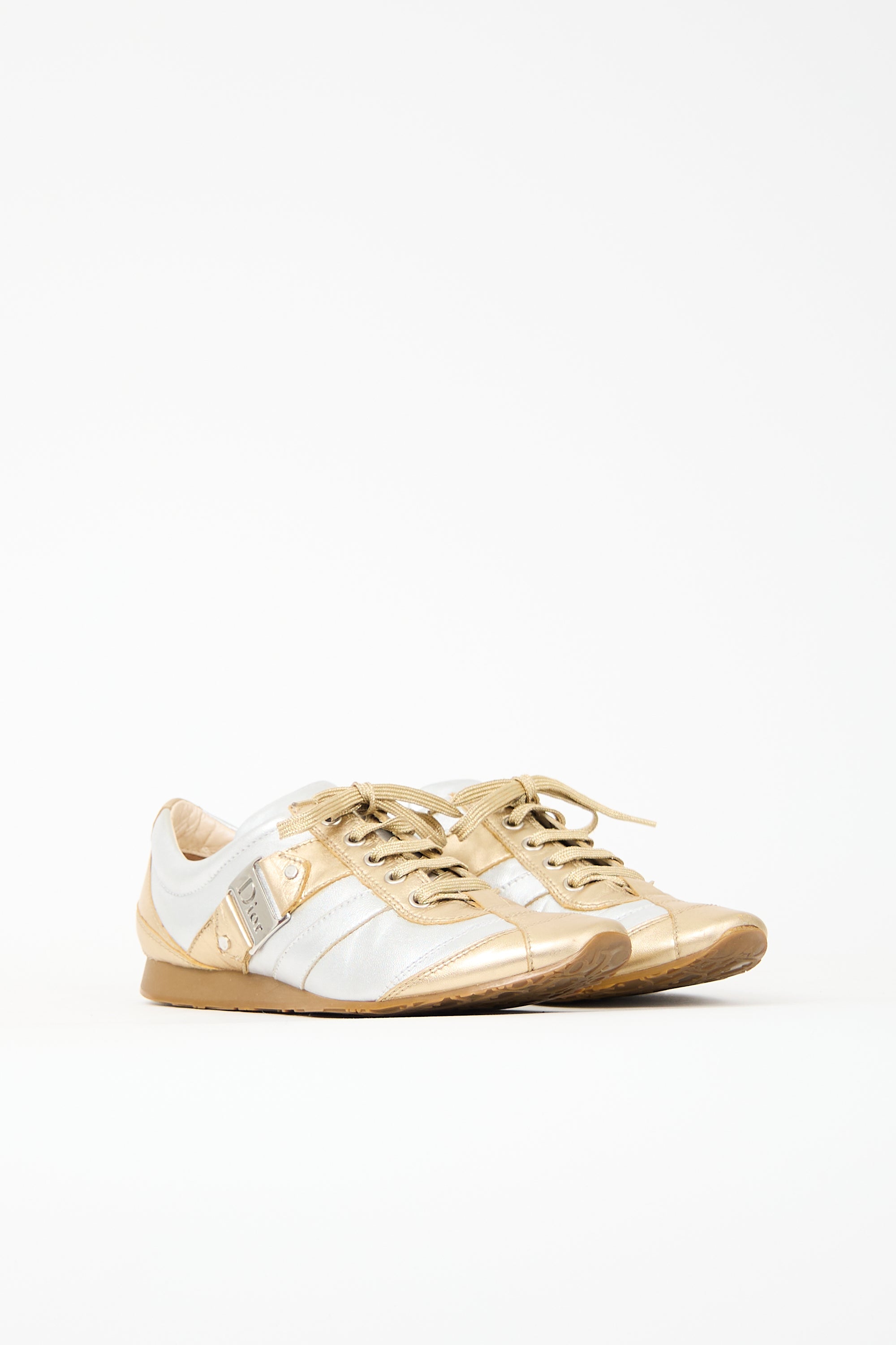 Pre-owned Christian Dior silver and gold sneakers featuring an almond toe, metallic leather upper, lace up front, silver tone cutout logo tab at side, and rubber gum sole.