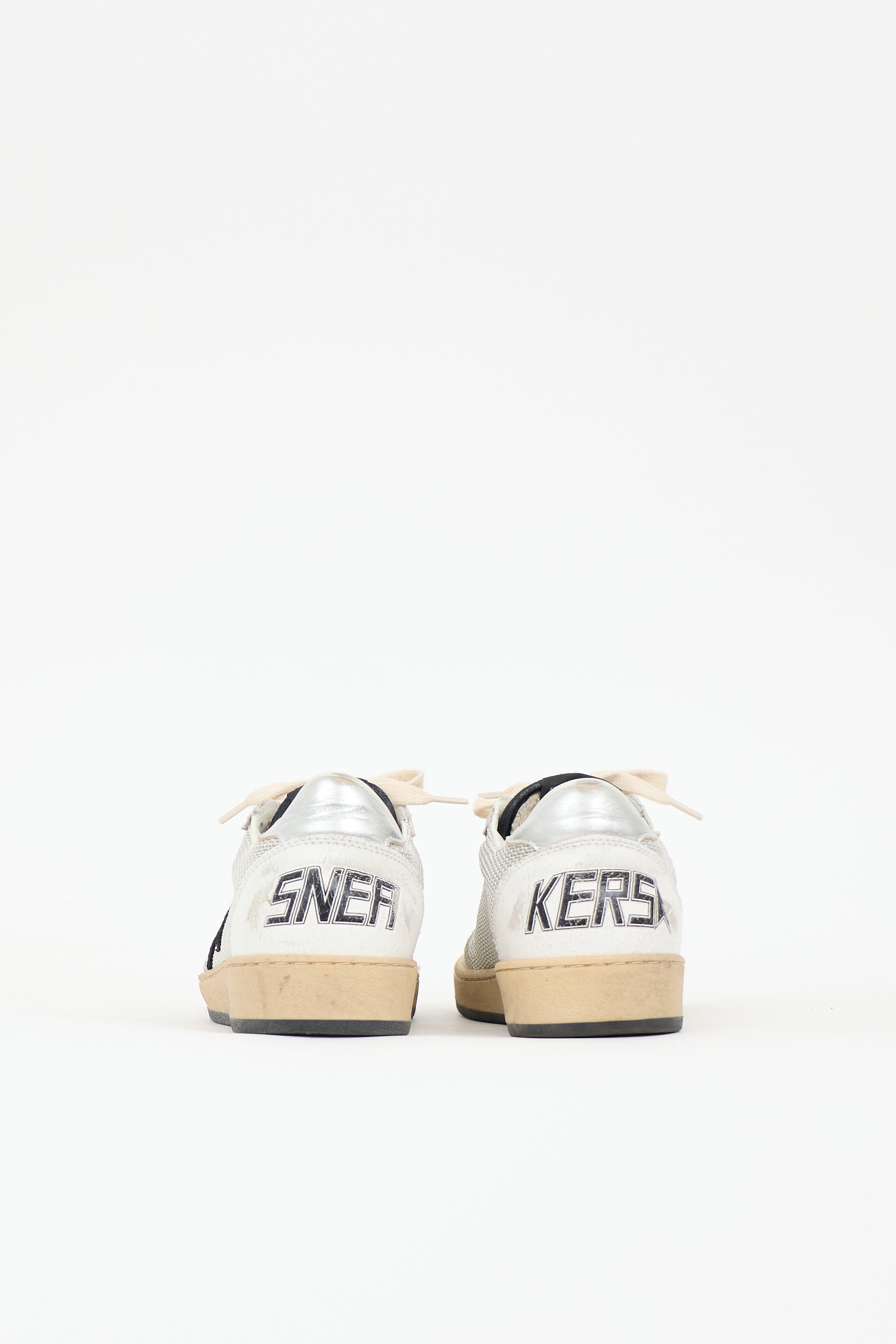 Pre-owned Golden Goose white and silver tone Ball Star sneakers featuring rounded toe, mesh, leather, and suede panelled upper, perforated toe box, lace up instep, label at tongue, star logo patch at outer side, printed logo at counter, layered rubber sole, and distressed effect.