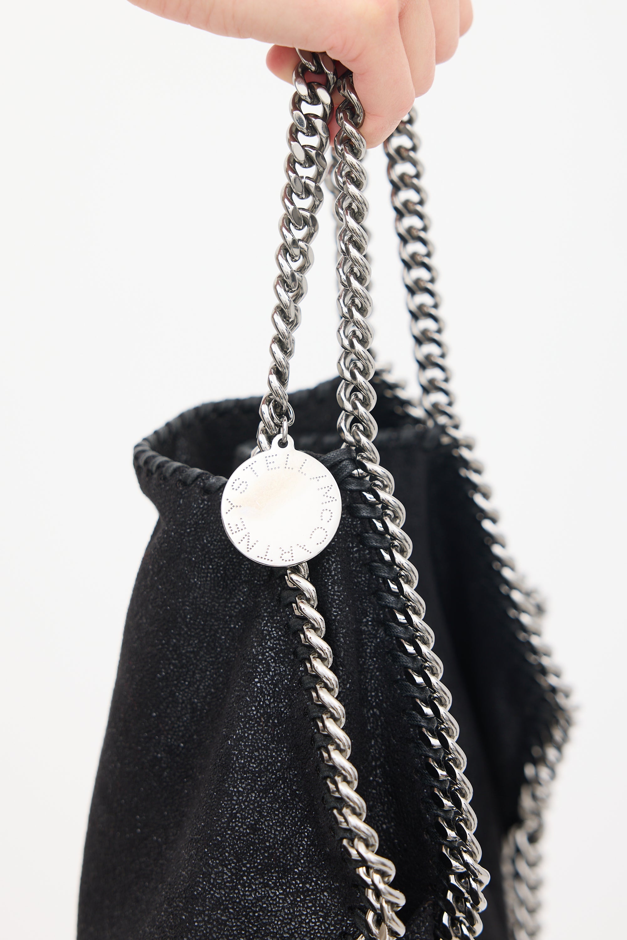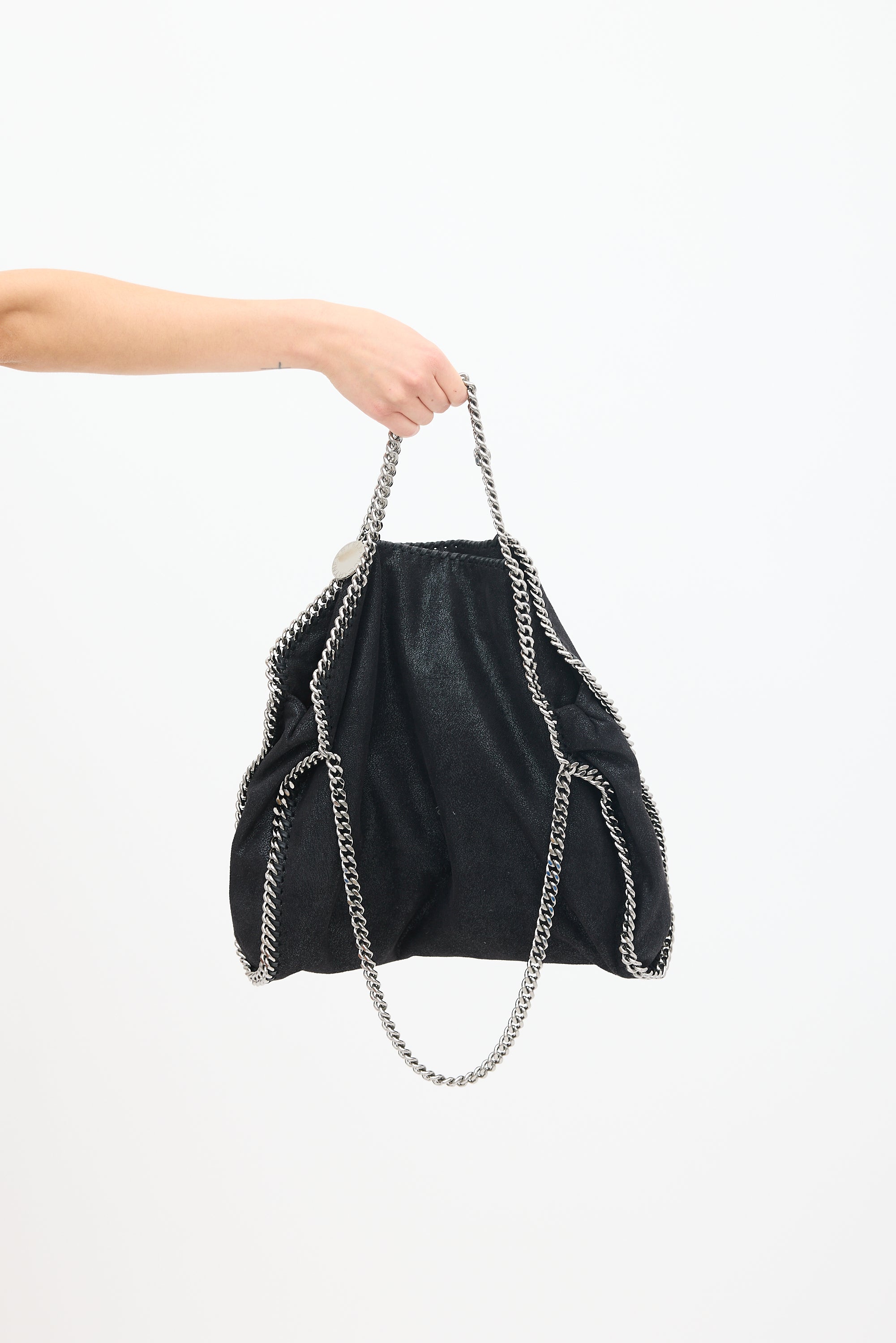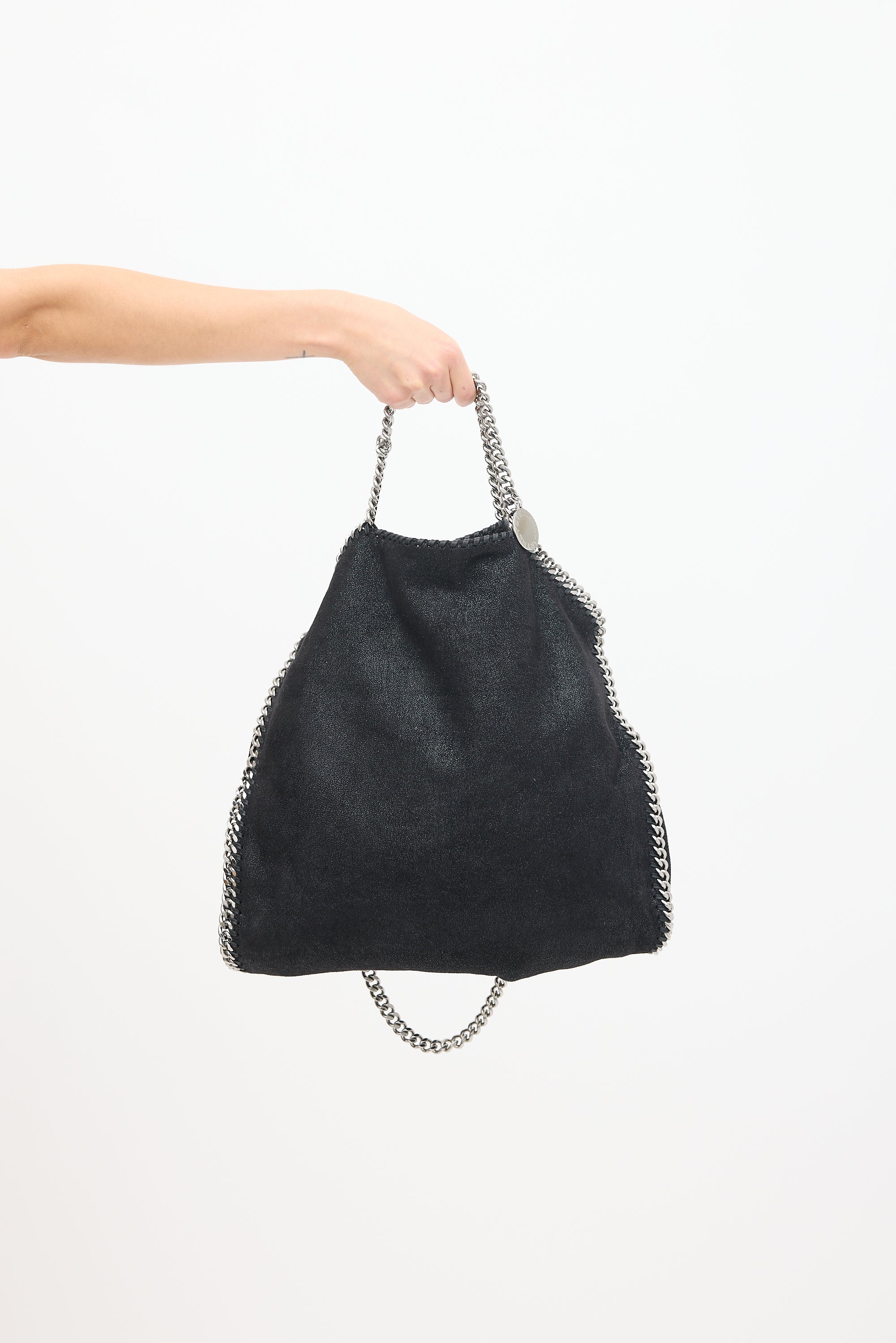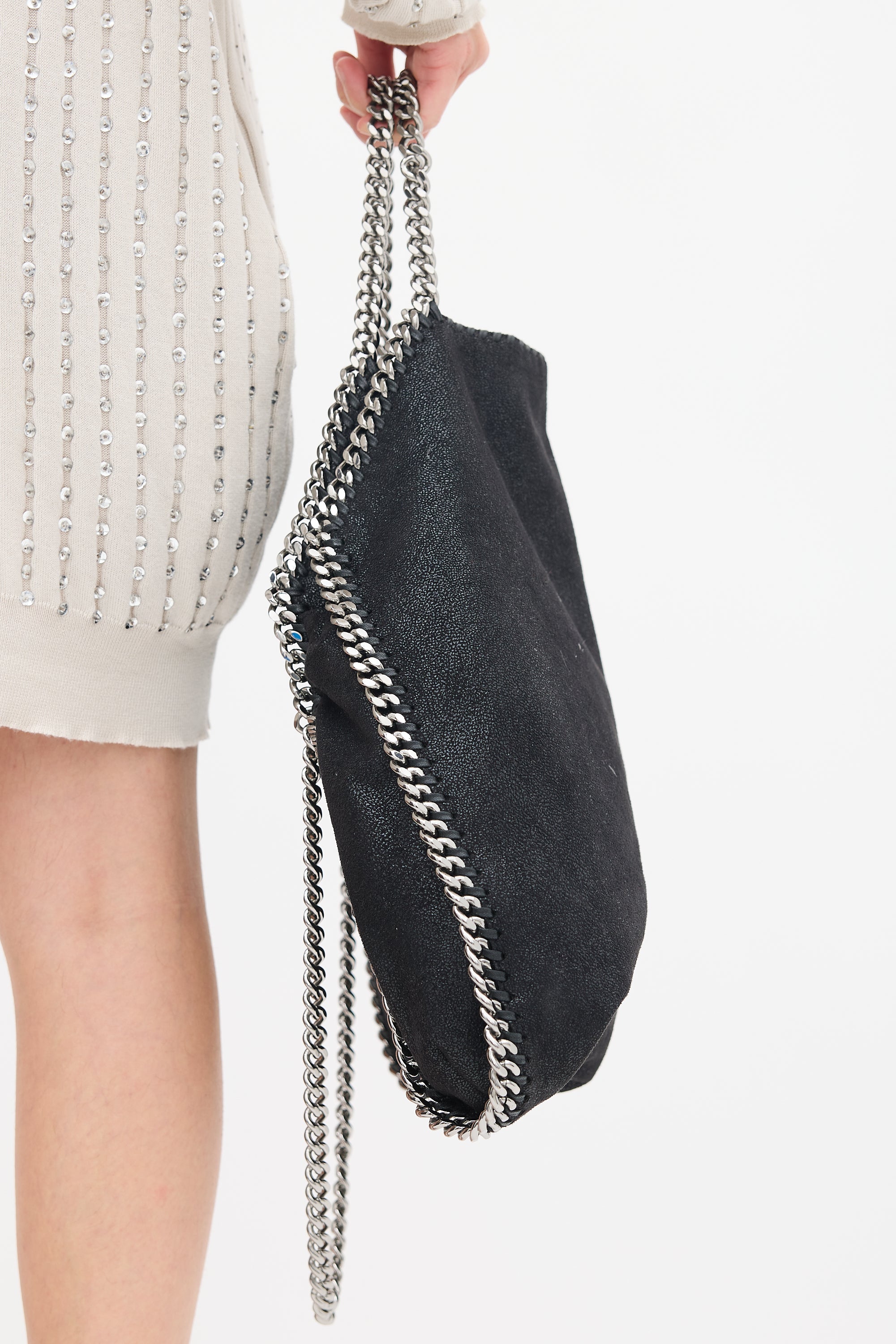 Pre-owned Stella McCartney large Falabella tote bag in black vegan shaggy deer leather featuring silver tone hardware, braided chain trim throughout edges, two fixed chain link handles with logo charm, one fixed chain link strap, magnetic top closure, and one lined main compartment with single zip pocket.