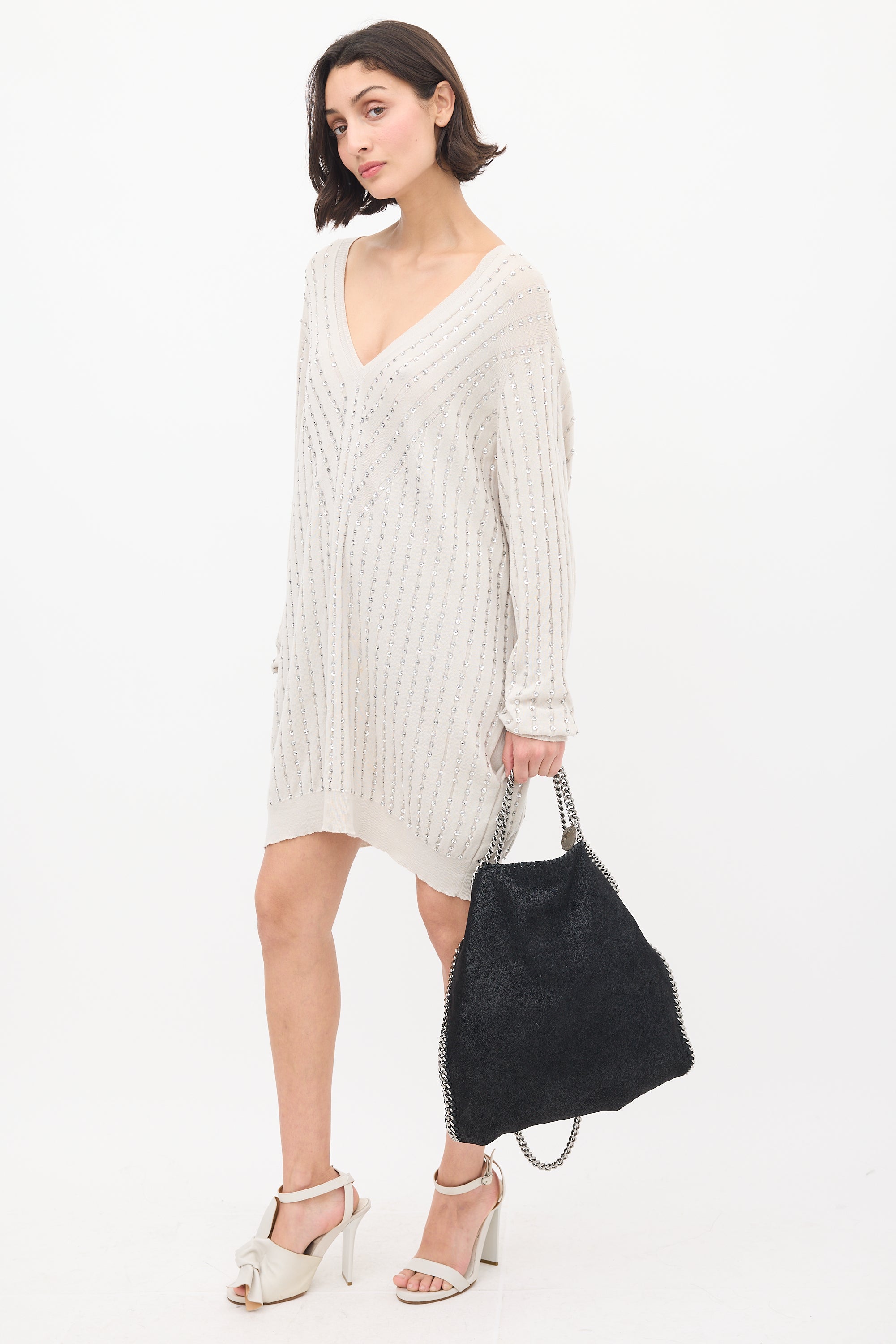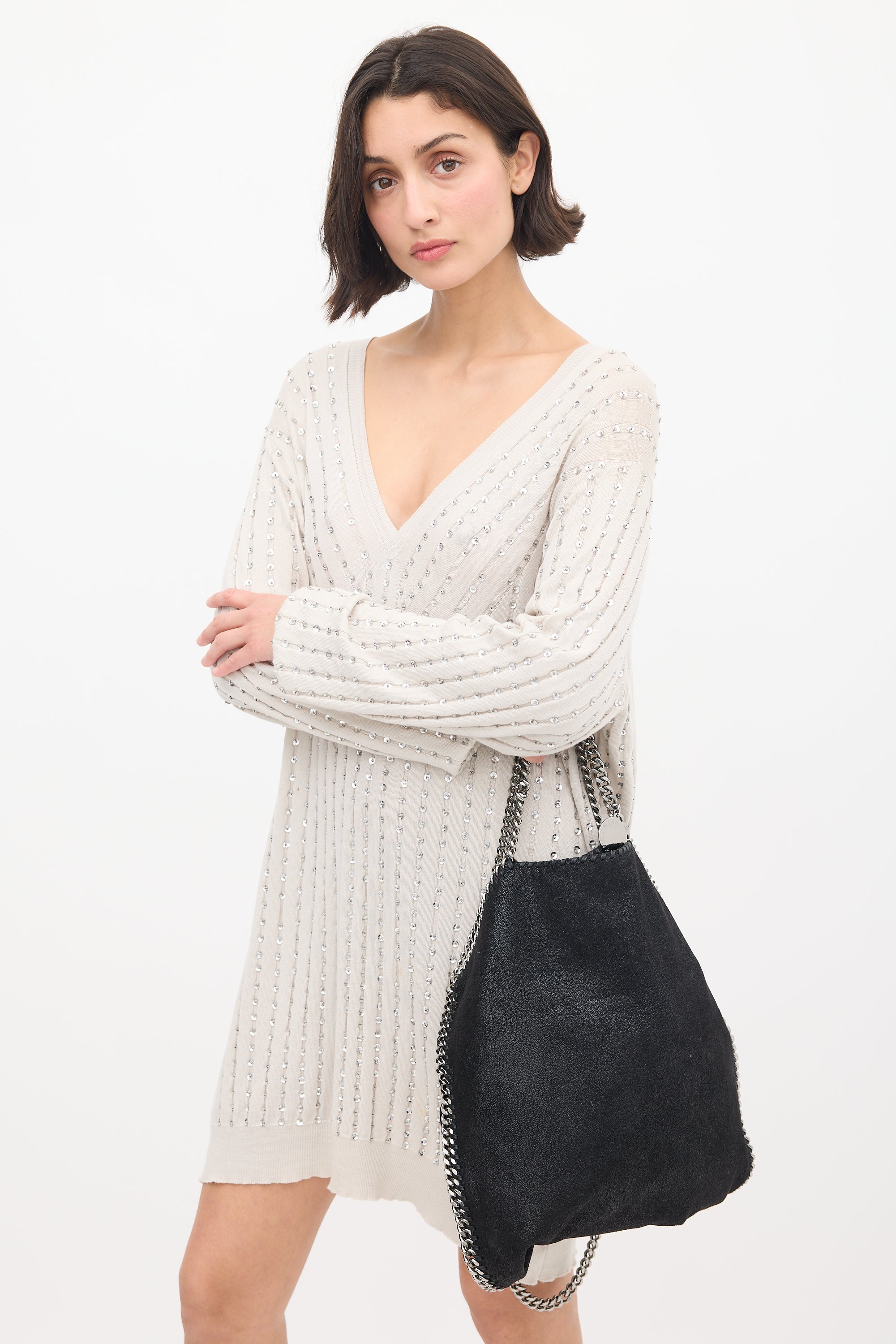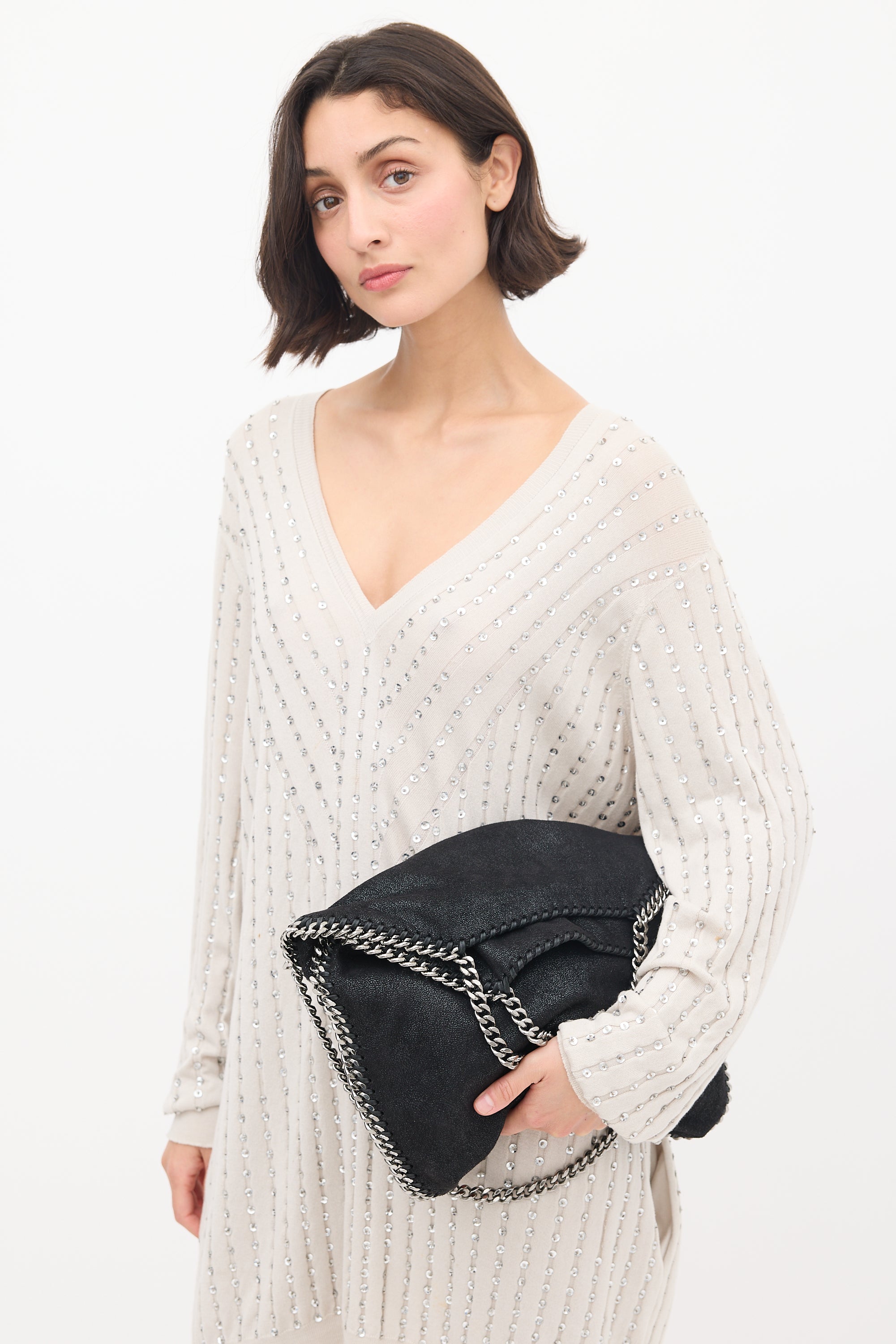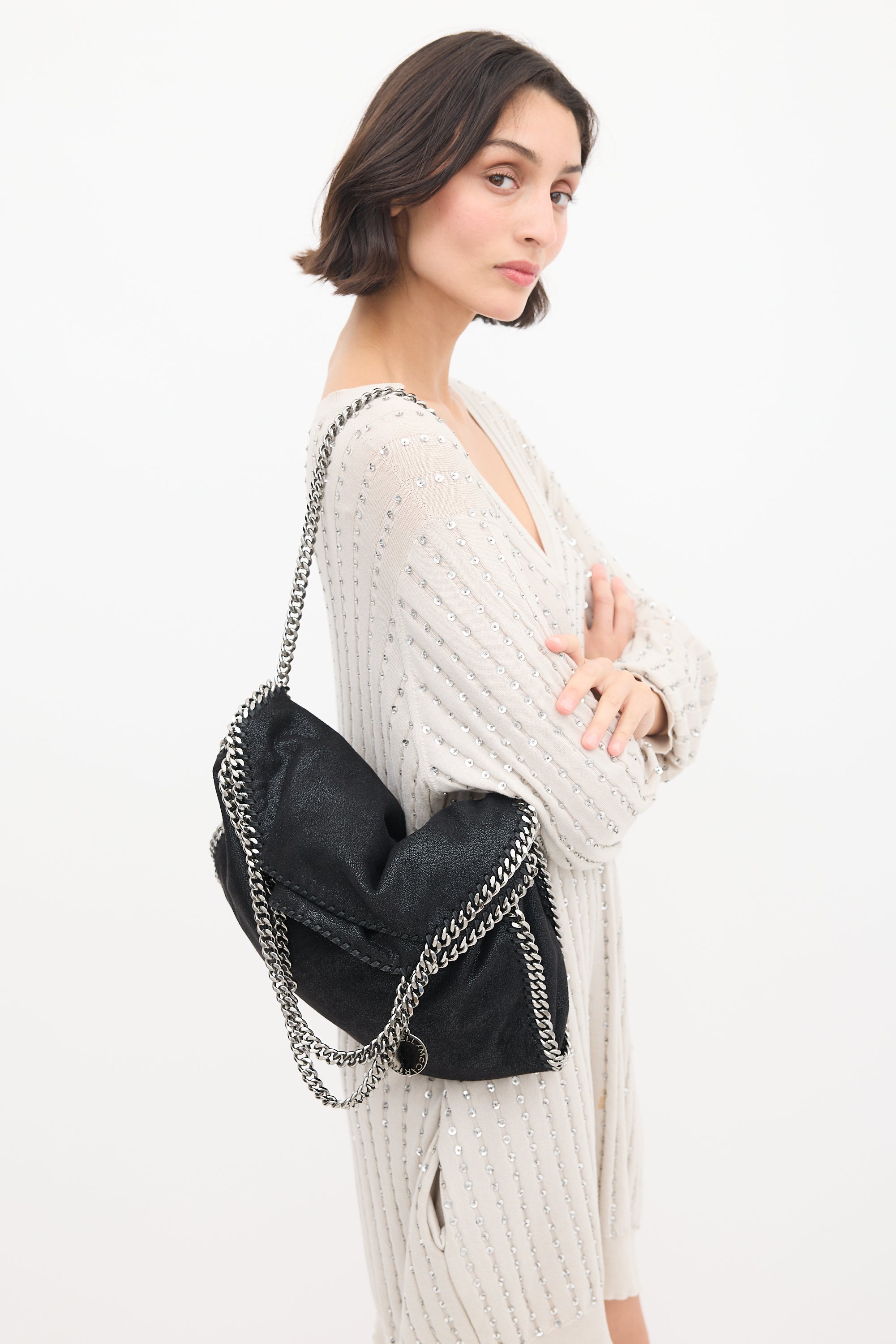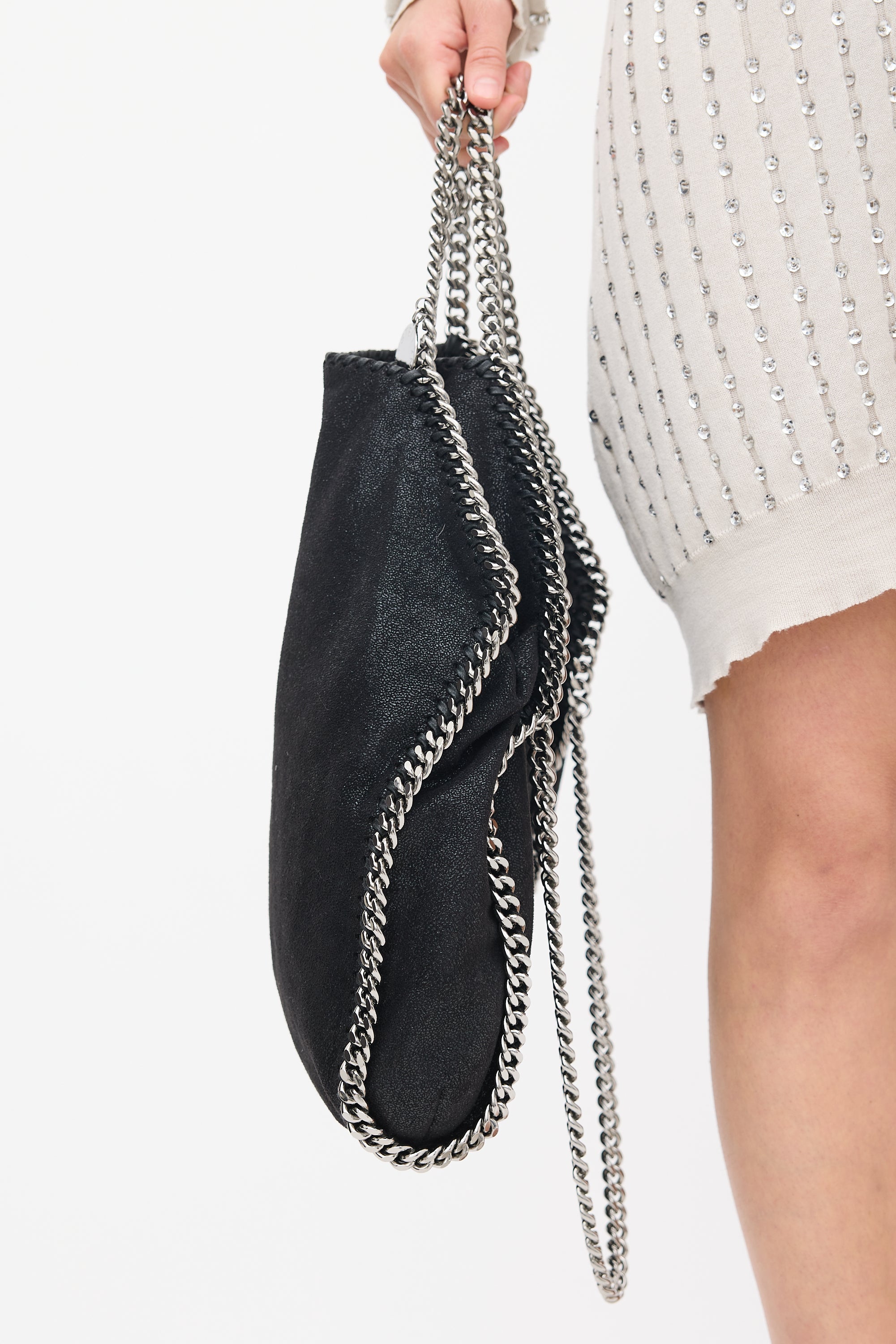 Pre-owned Stella McCartney large Falabella tote bag in black vegan shaggy deer leather featuring silver tone hardware, braided chain trim throughout edges, two fixed chain link handles with logo charm, one fixed chain link strap, magnetic top closure, and one lined main compartment with single zip pocket.