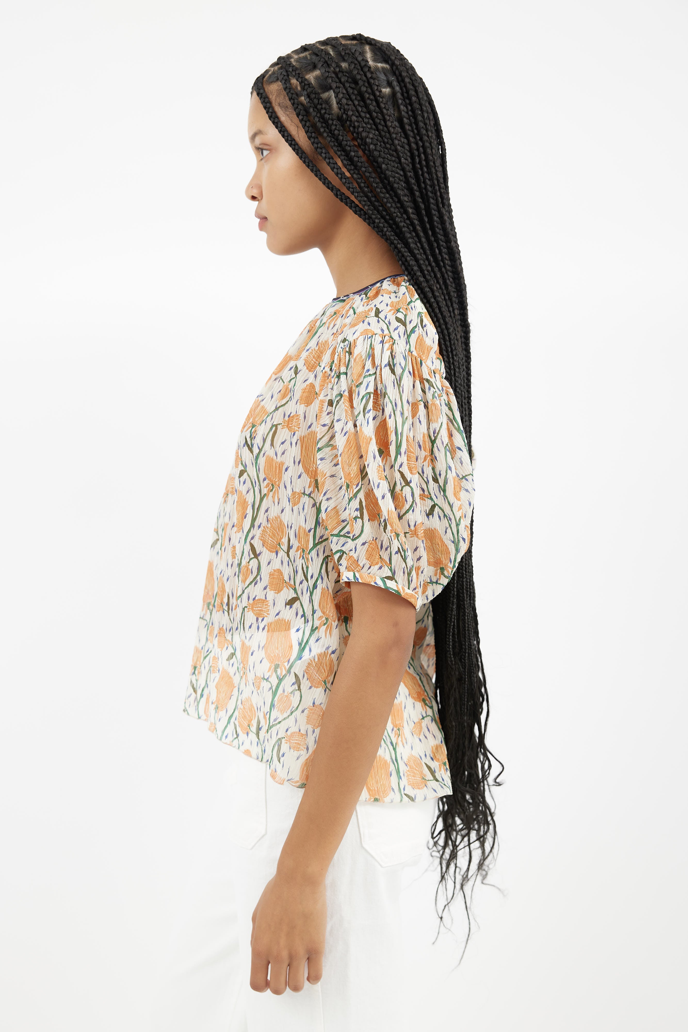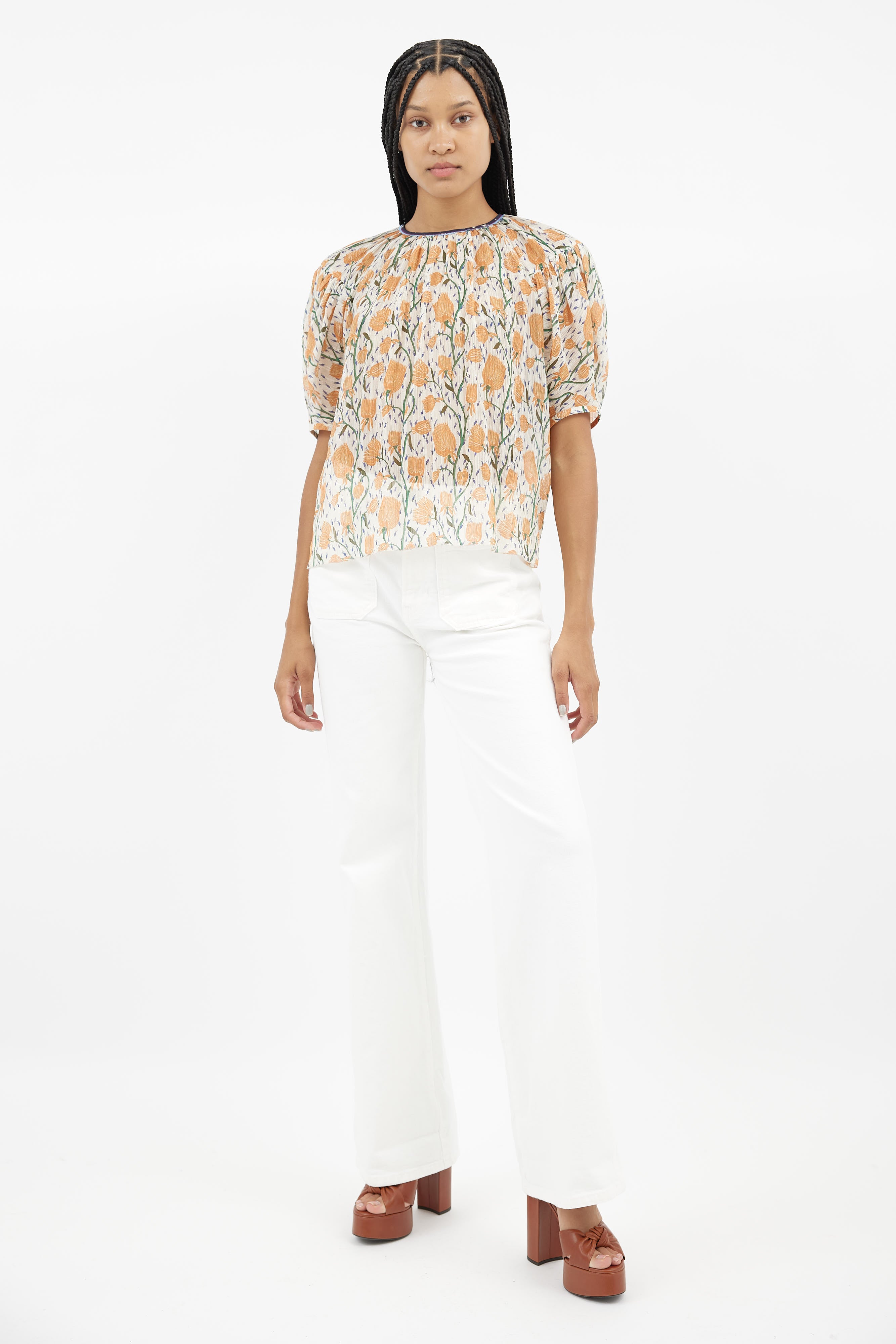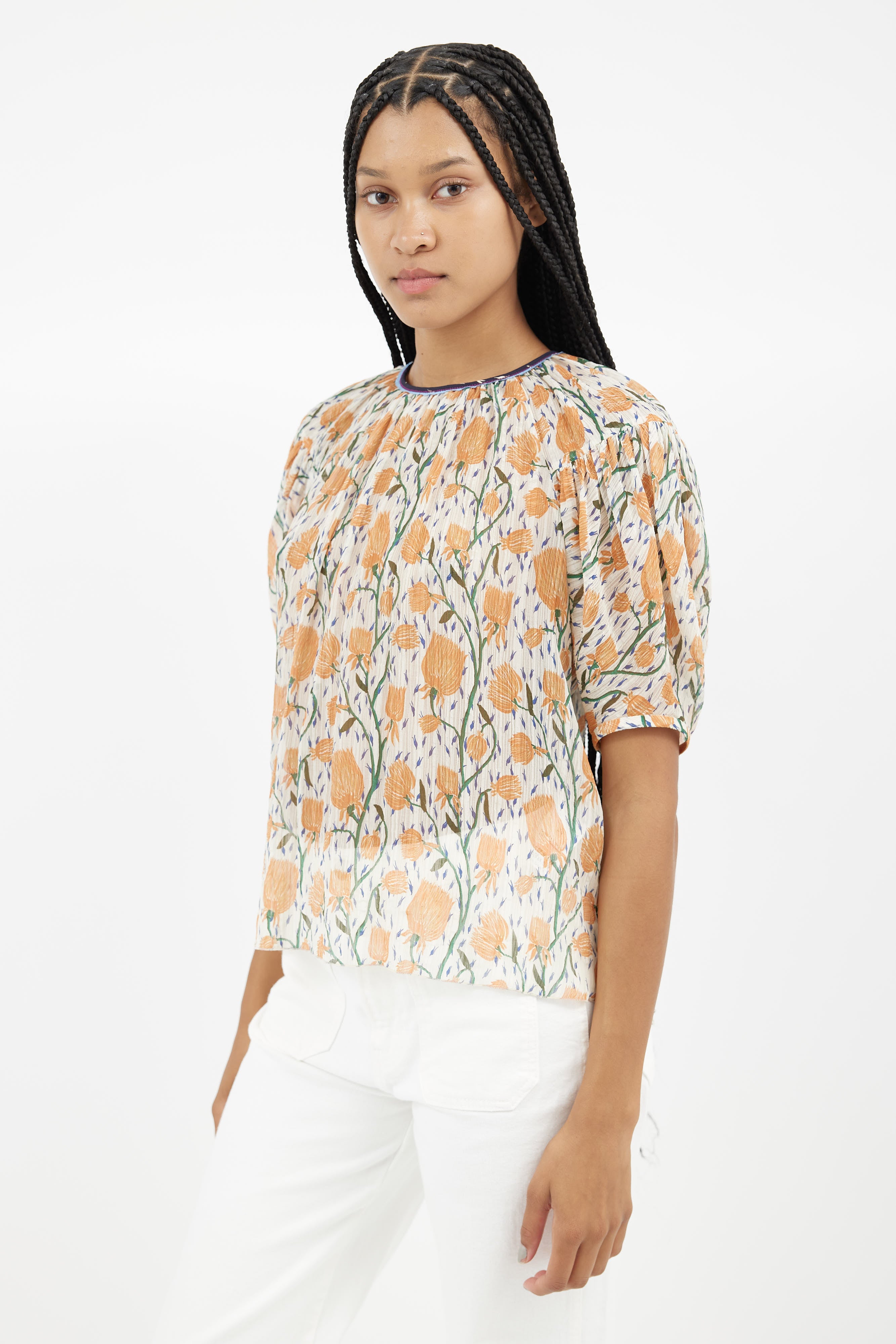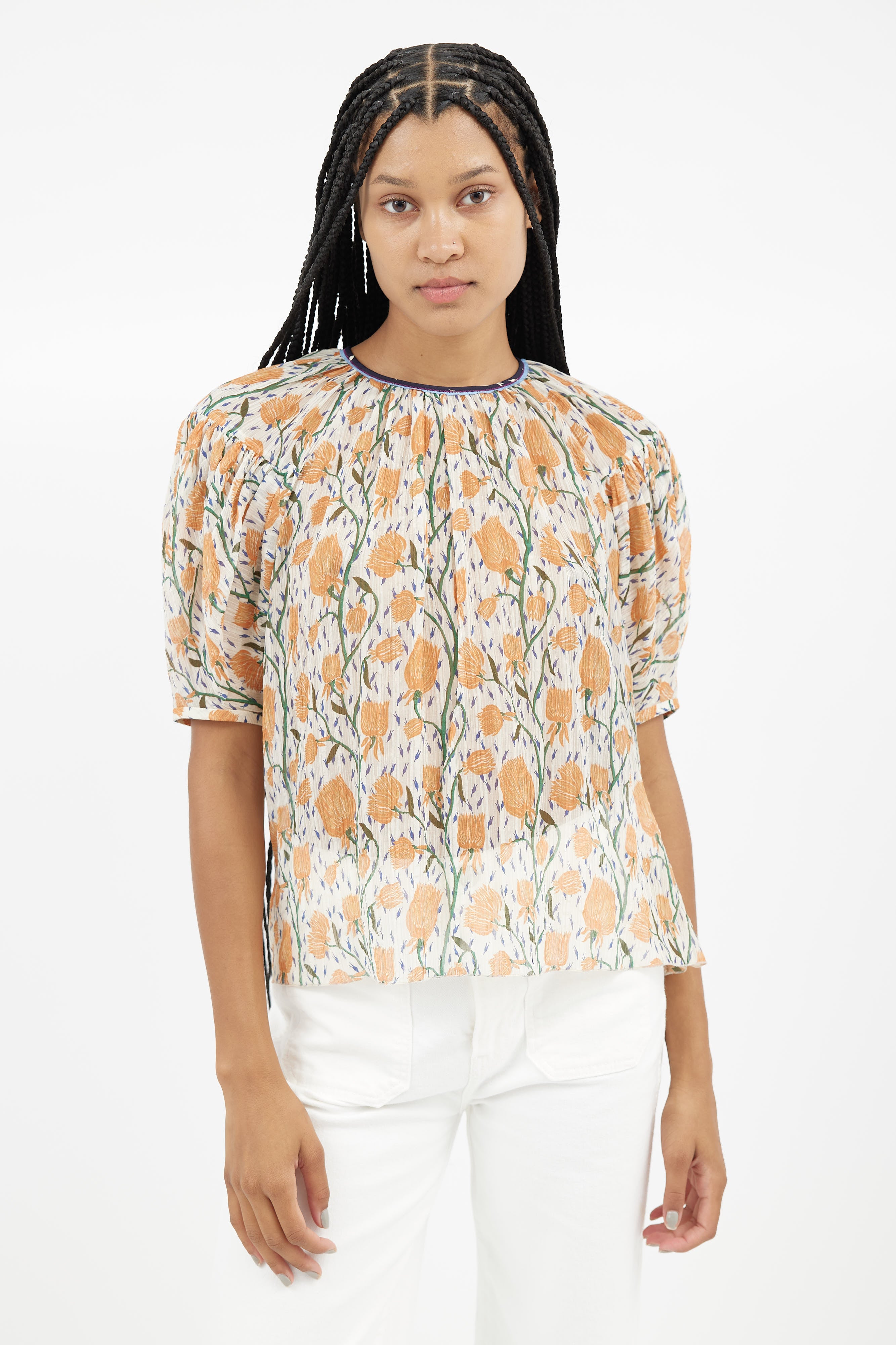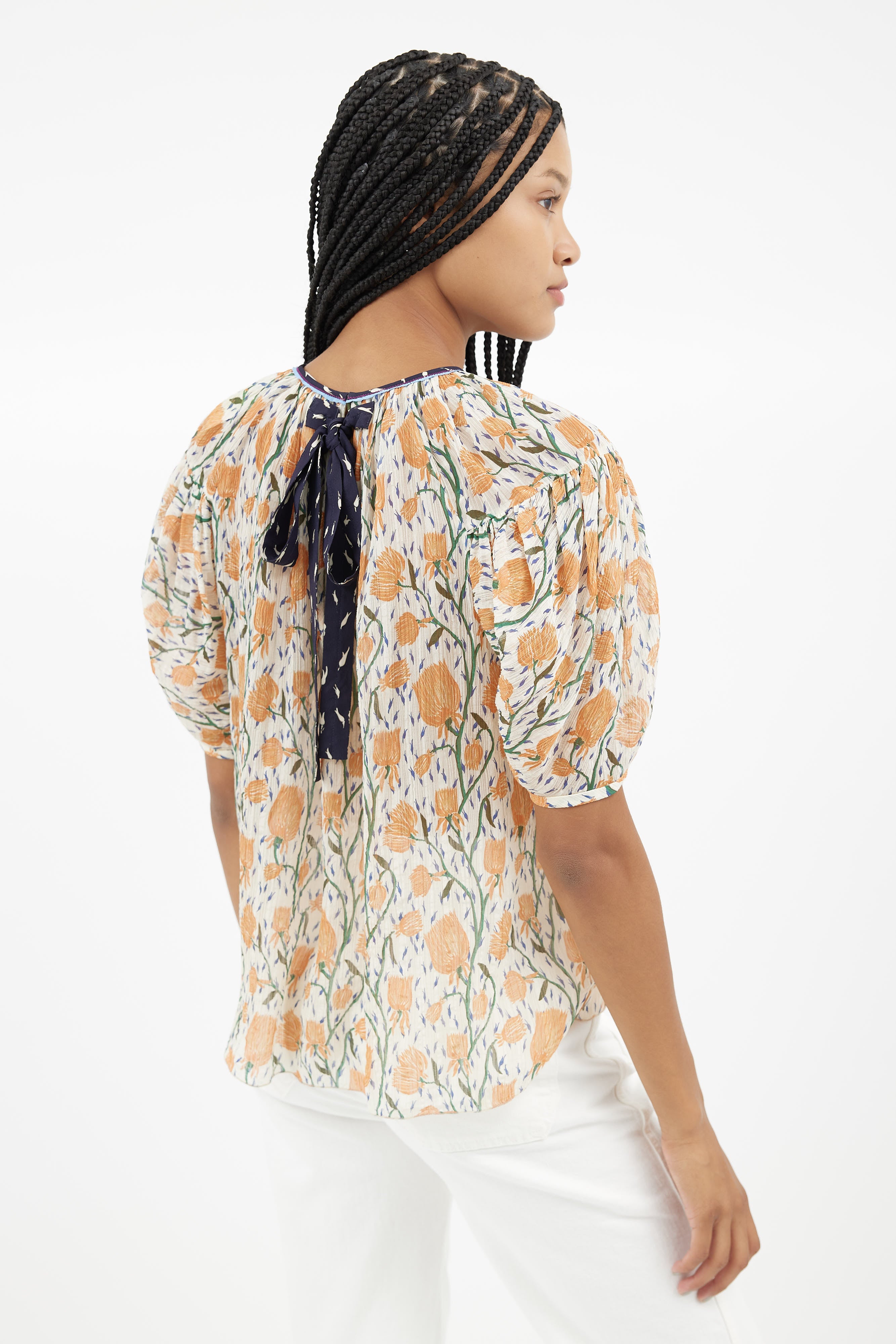 Pre-owned Chloé cream blouse featuring orange floral print, round neckline, puff sleeves, keyhole back, and black and white printed tie and trim.