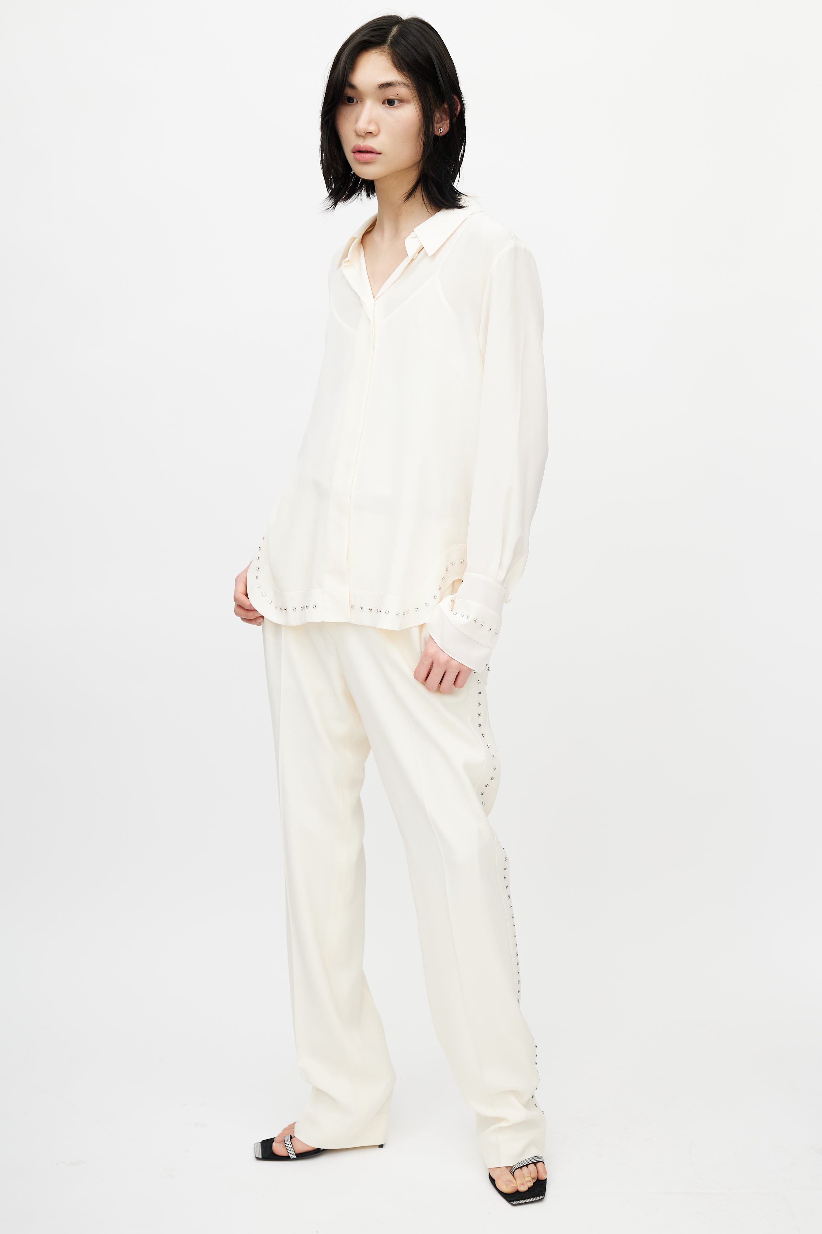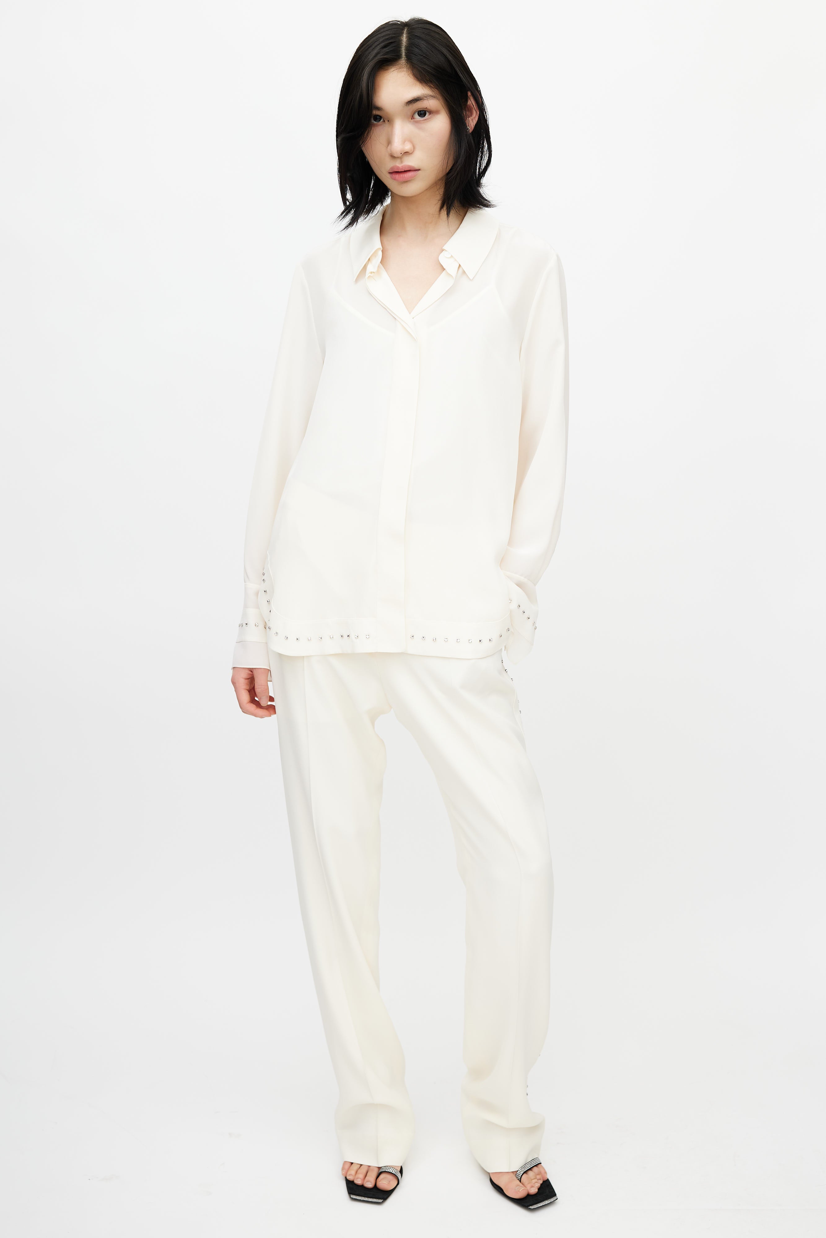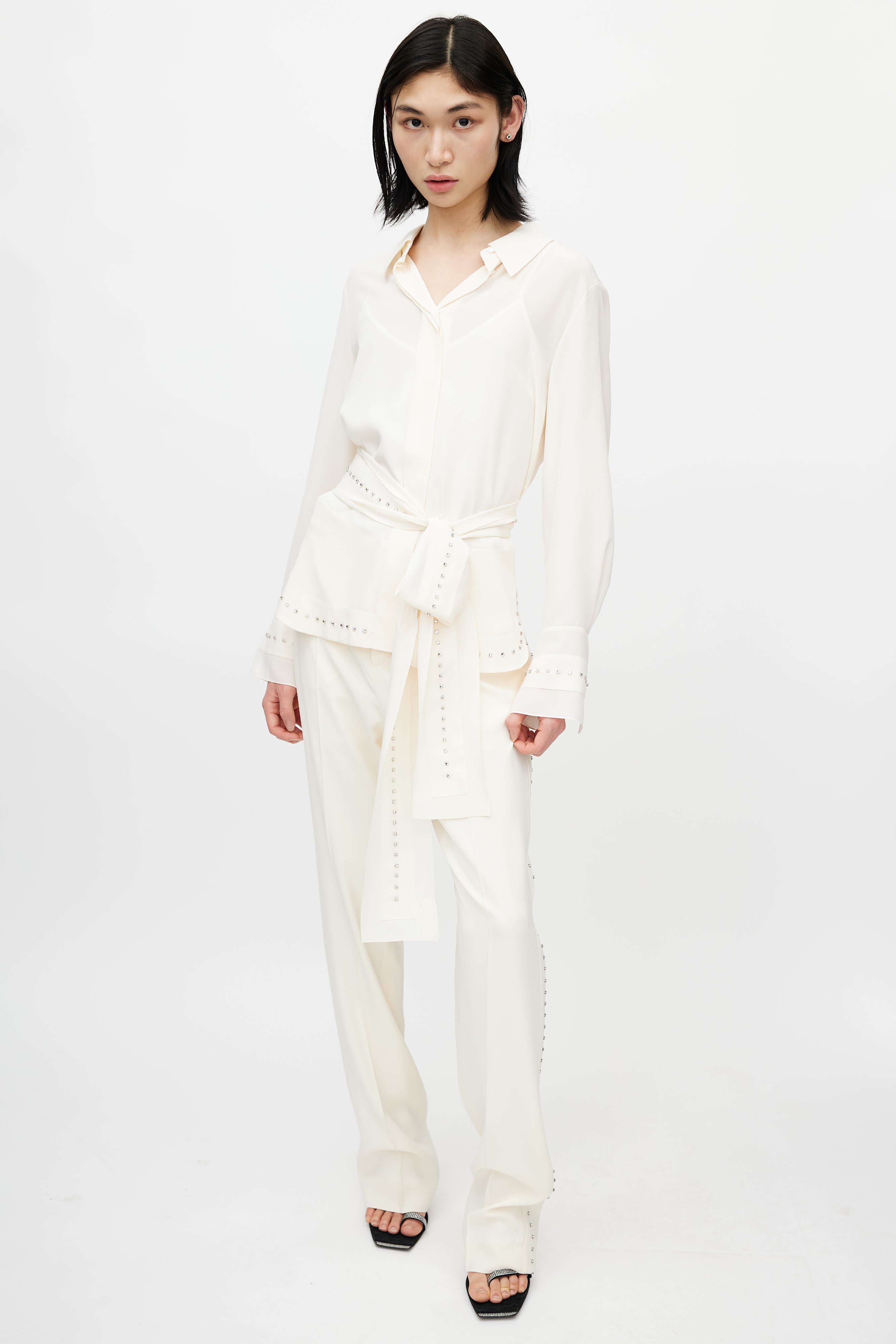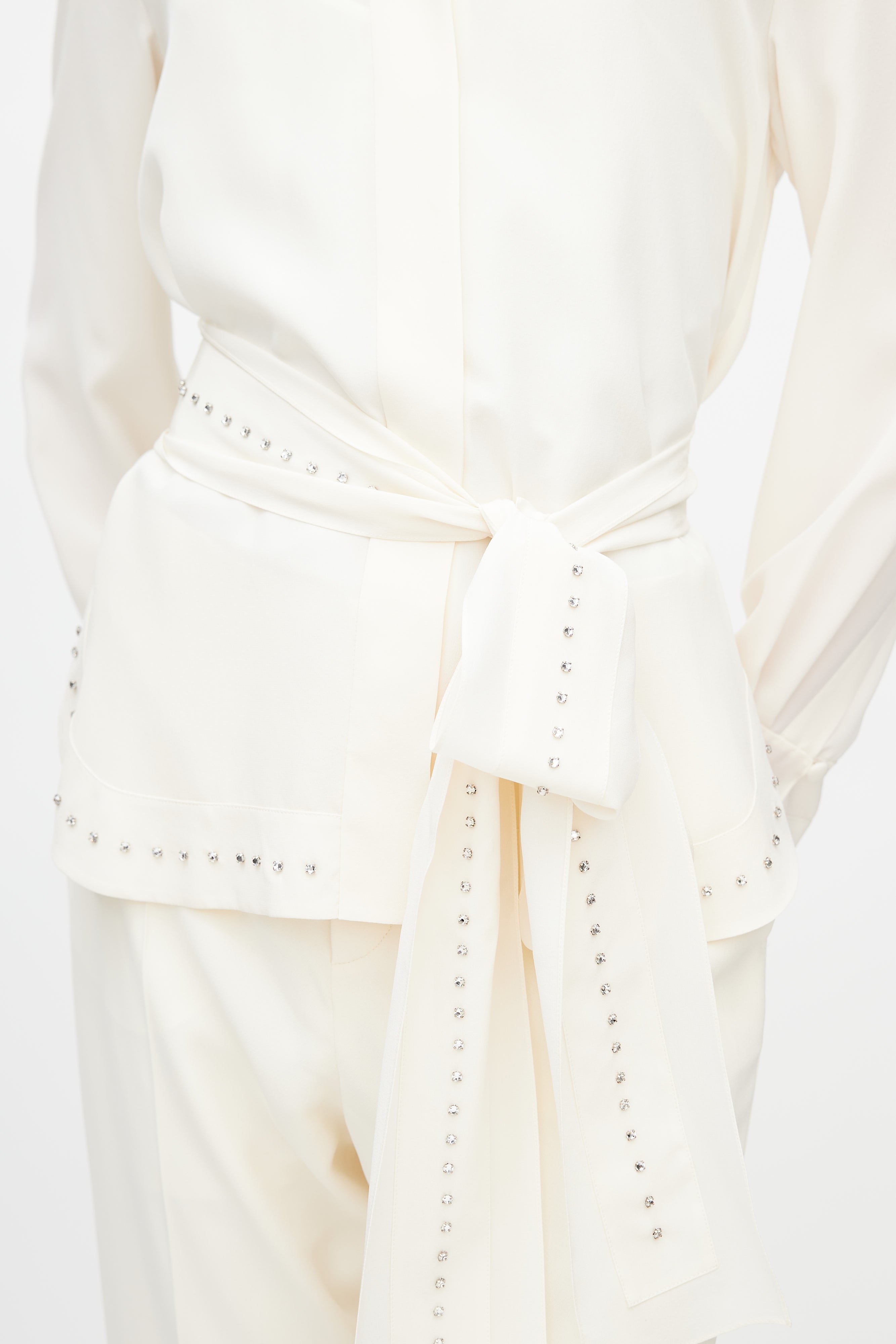 Pre-owned Chloé cream silk shirt featuring a pointed collar, long sleeves with buttoned cuffs, button up front, removable embellished belt, and rhinestone trim at hem. Matching trousers feature rhinestone trim at sides, two slash pockets at hip, two welt pockets at back, straight leg, and zip fly with hook and eye closure.