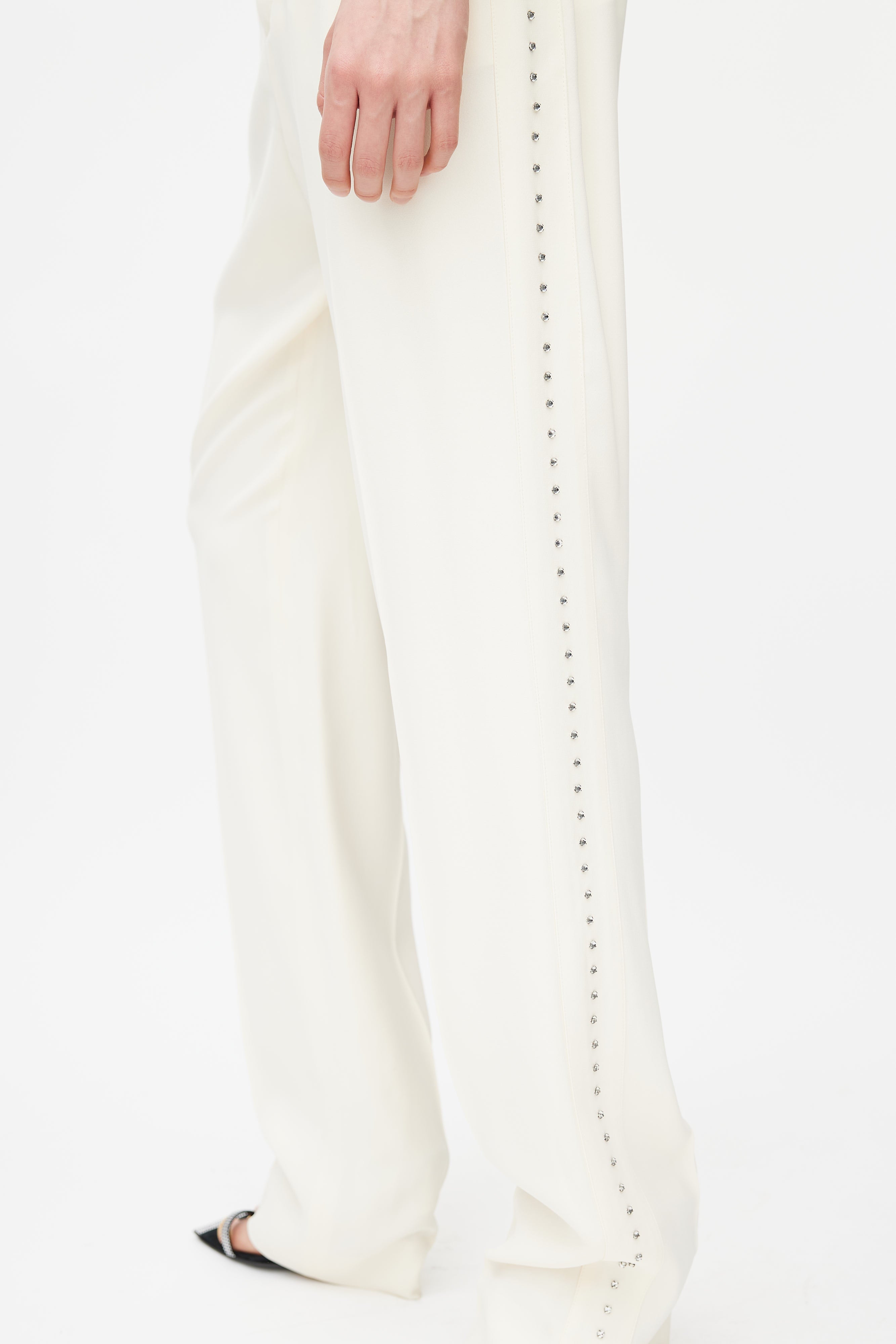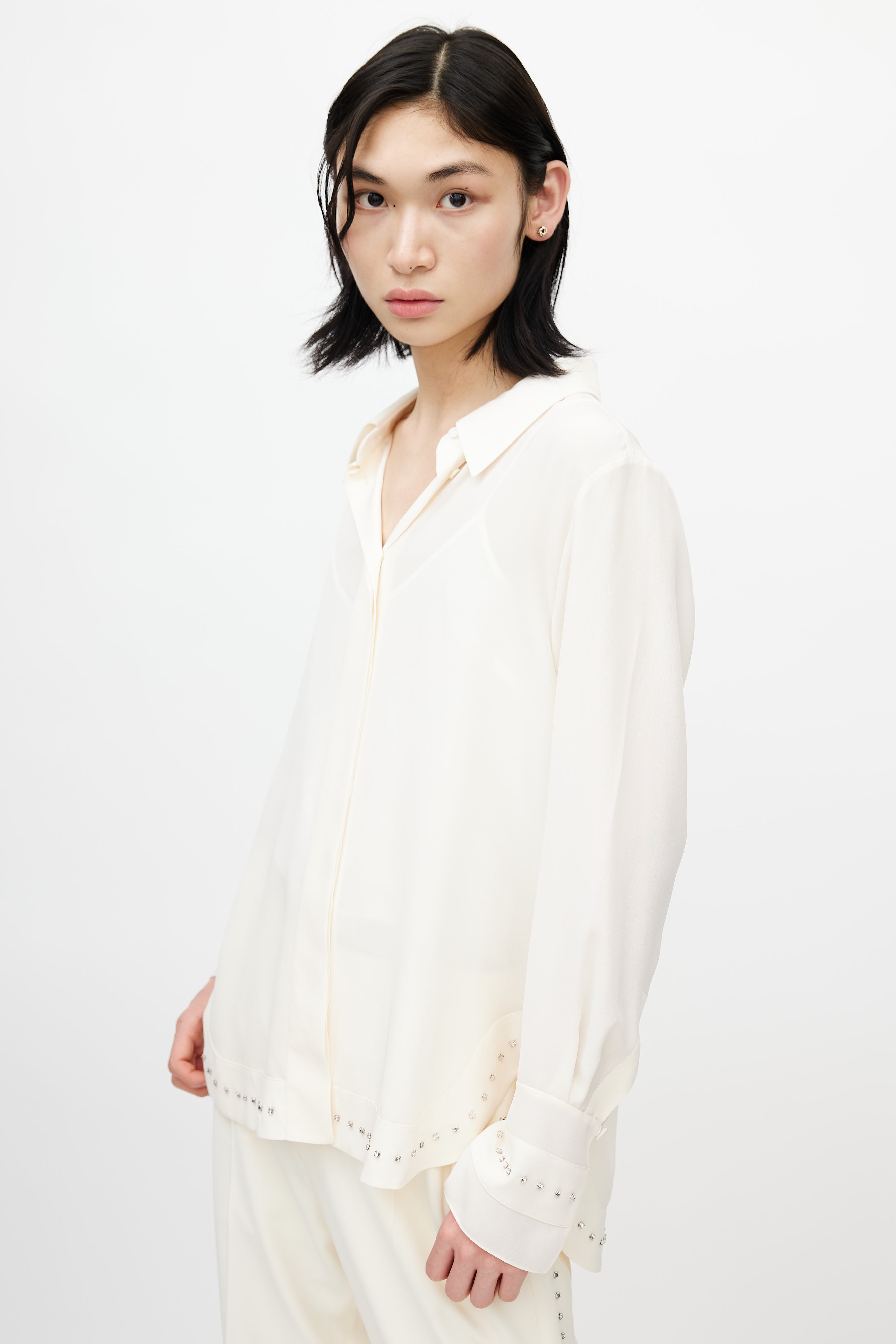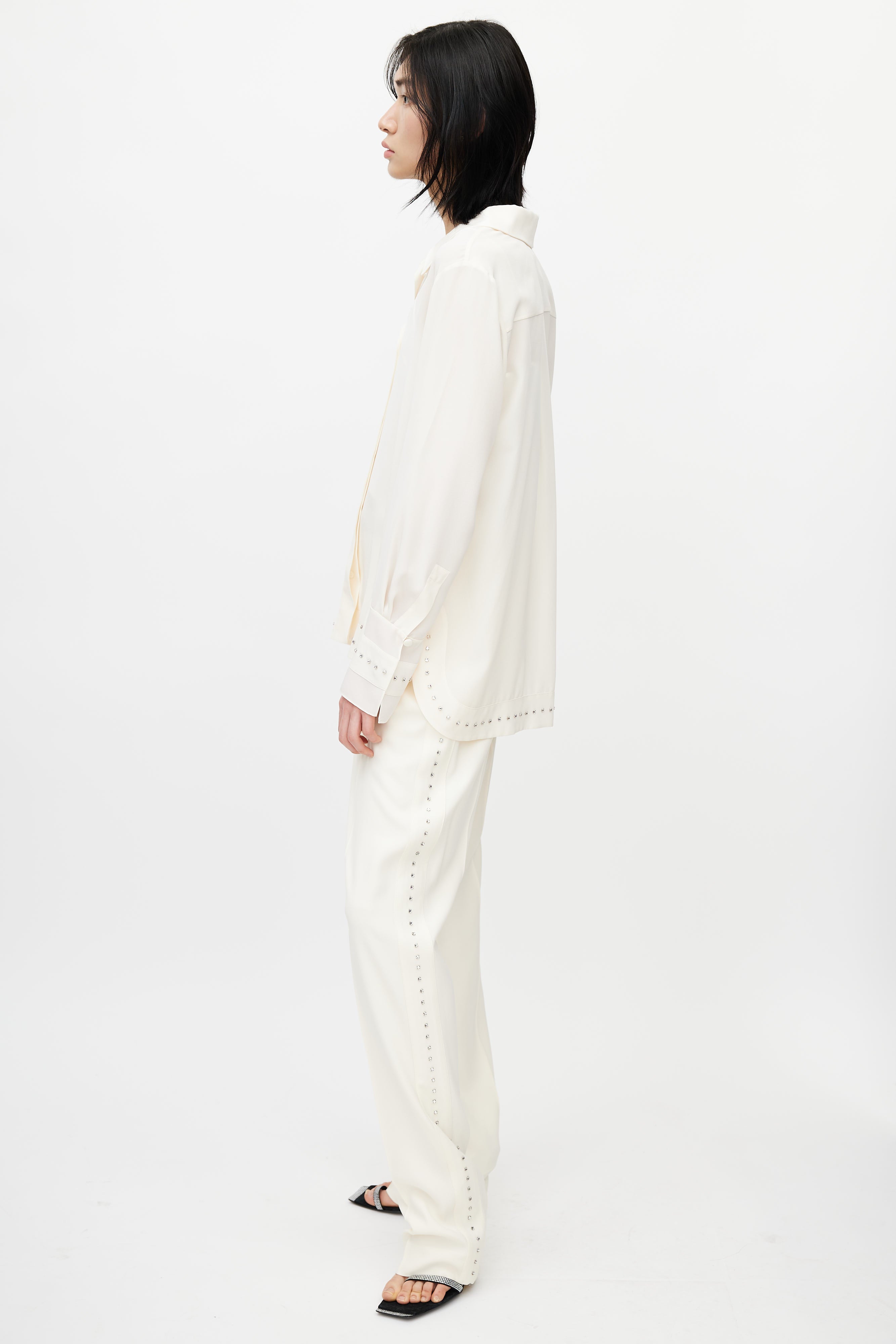 Pre-owned Chloé cream silk shirt featuring a pointed collar, long sleeves with buttoned cuffs, button up front, removable embellished belt, and rhinestone trim at hem. Matching trousers feature rhinestone trim at sides, two slash pockets at hip, two welt pockets at back, straight leg, and zip fly with hook and eye closure.